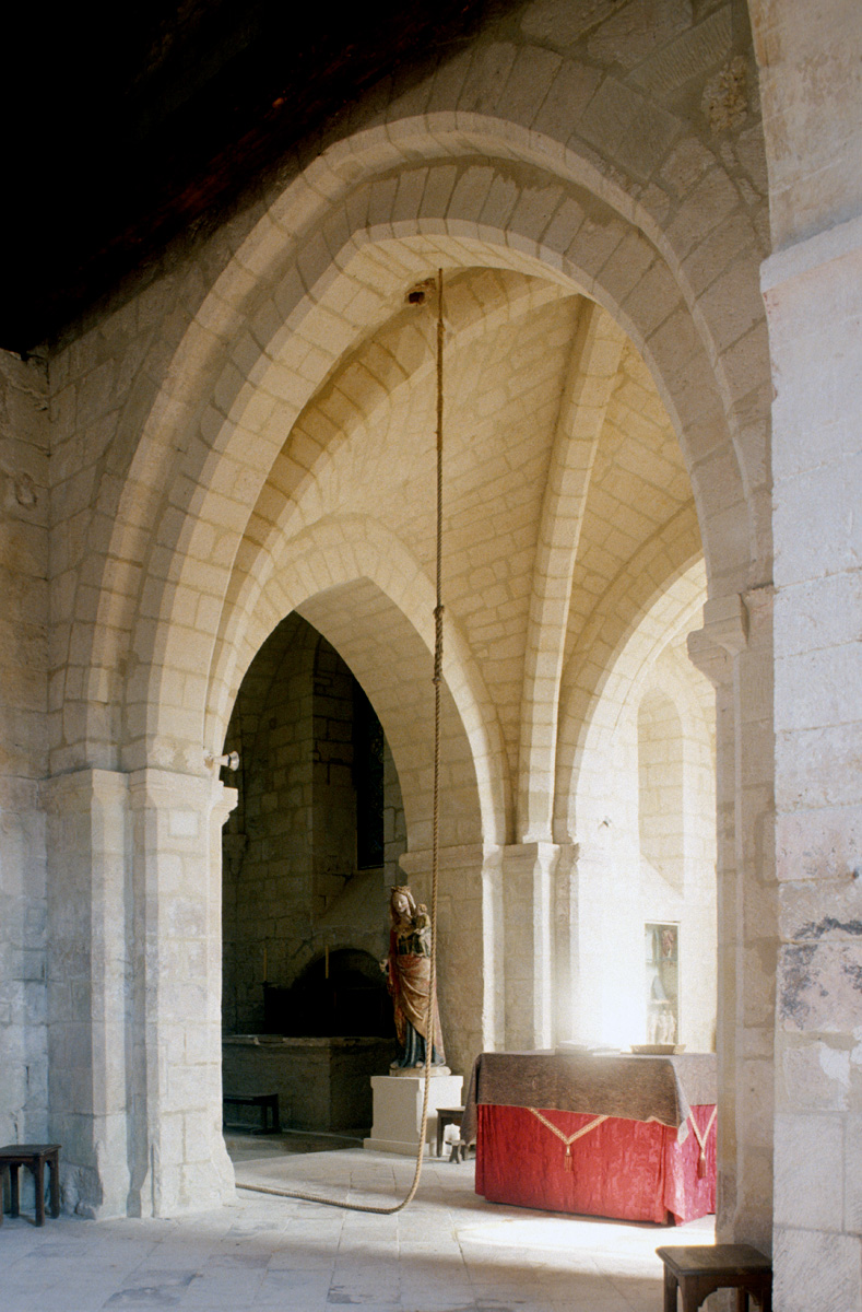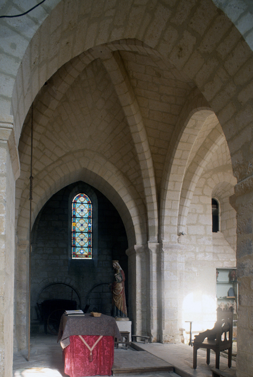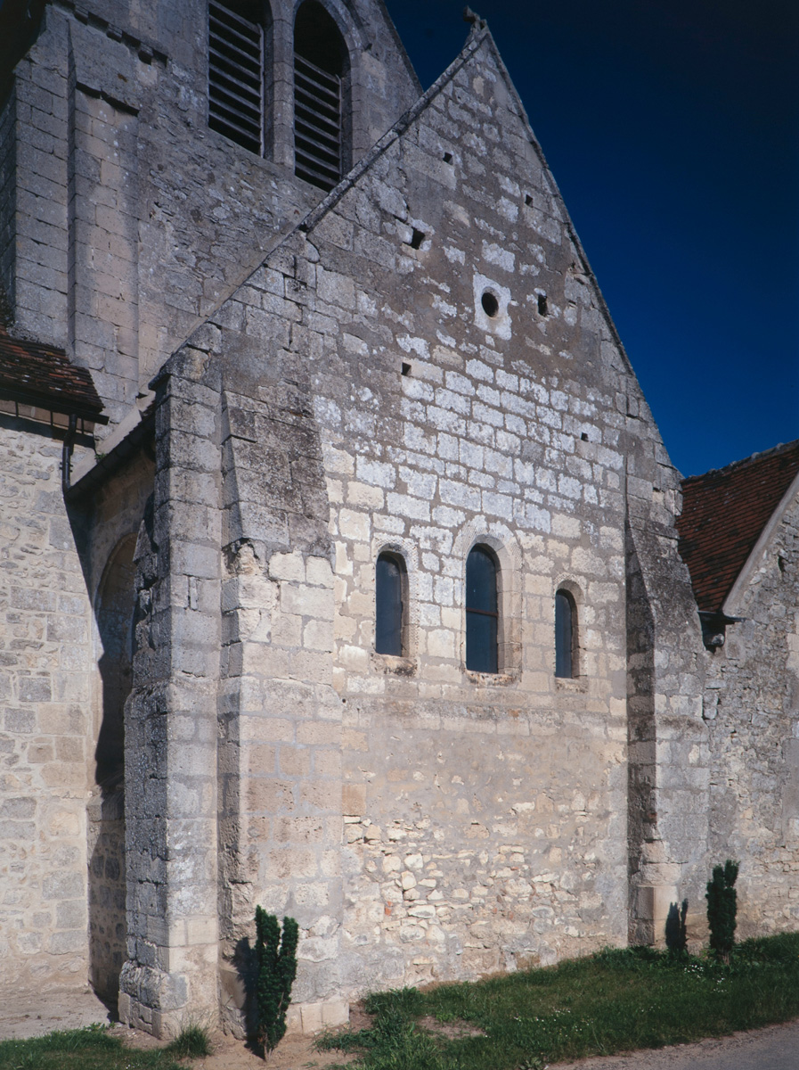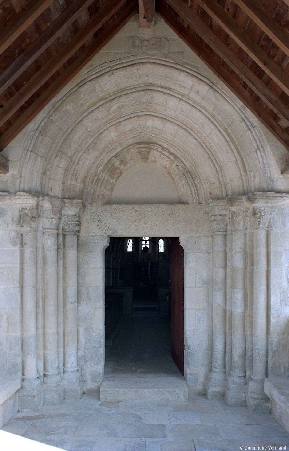 Entre-temps – vers 1160 – la nef avait été dotée de bas-côtés et d’une nouvelle façade. La liaison avec les bas-côtés s’effectue par des arcades brisées, agrandies au 13ème siècle en ce qui concerne la dernière travée. Le petit portail à gâble a ses piédroits garnis de trois rangées de colonnettes. Un porche le masque en partie depuis le 16ème siècle, époque à laquelle les bas-côtés furent reconstruits et une jolie tourelle d’escalier bâtie à l’angle du croisillon sud.