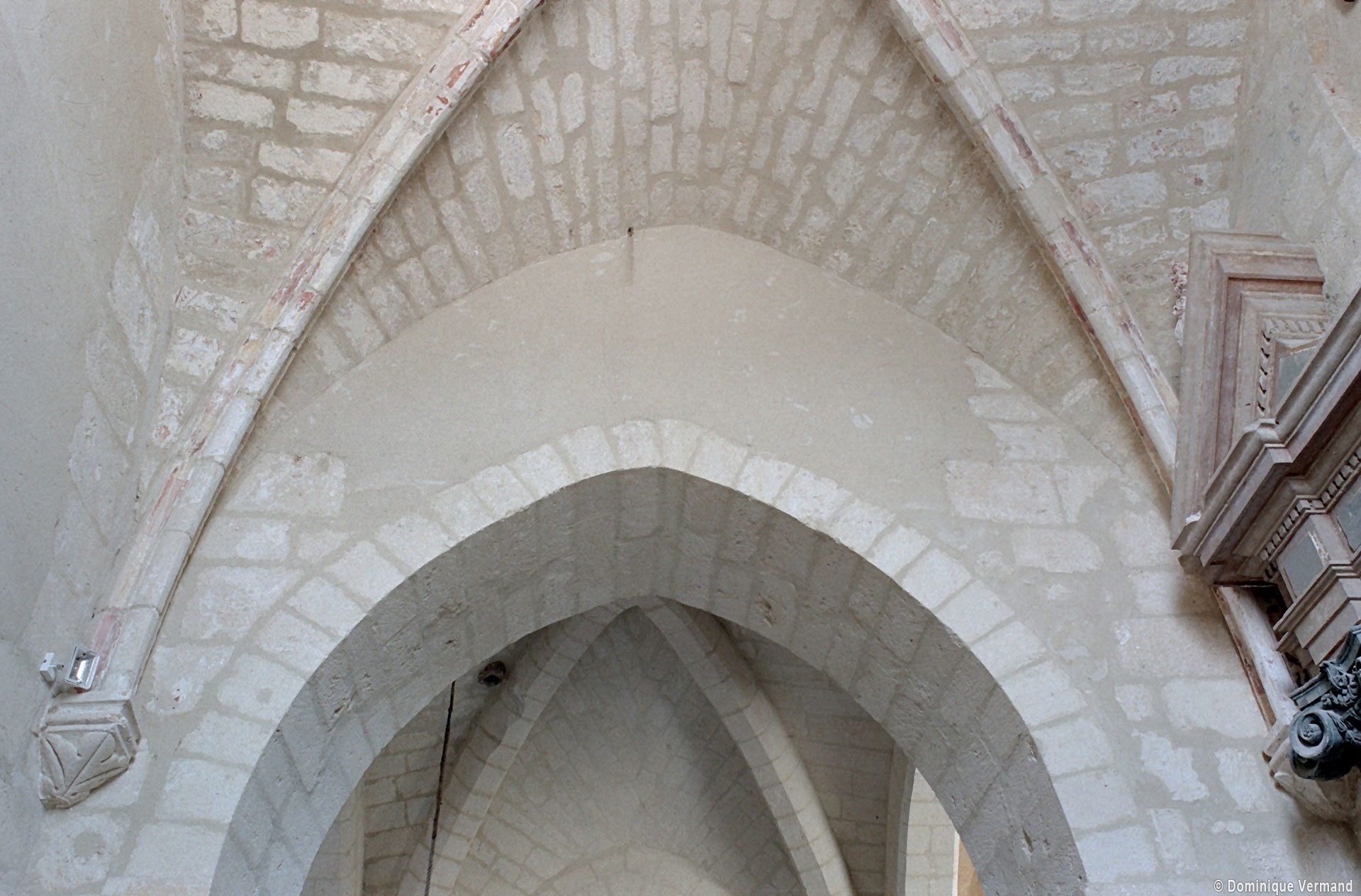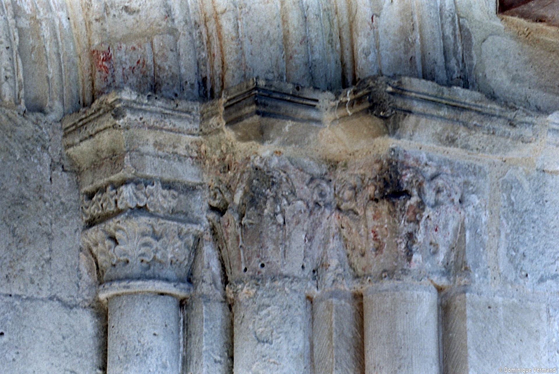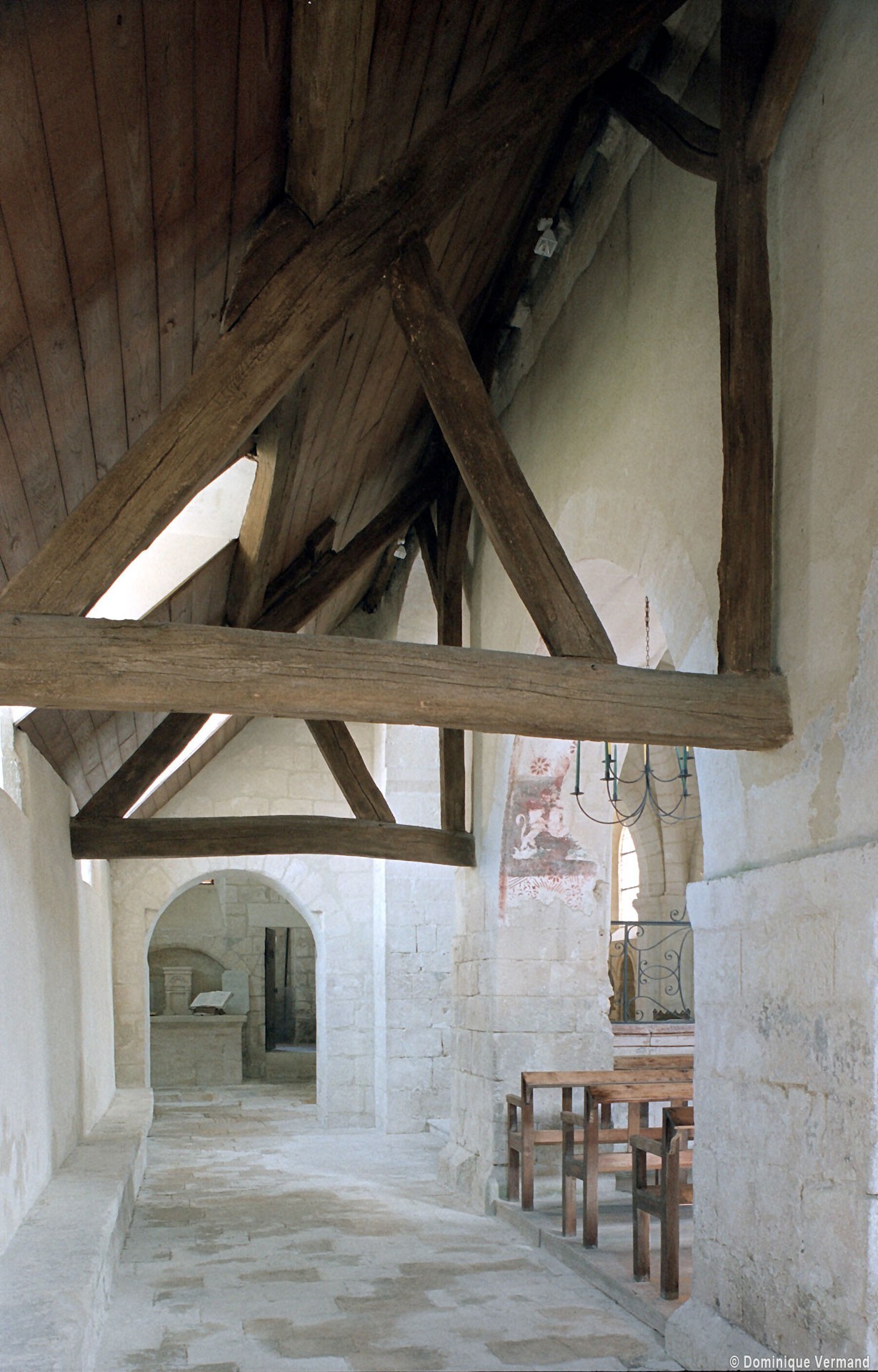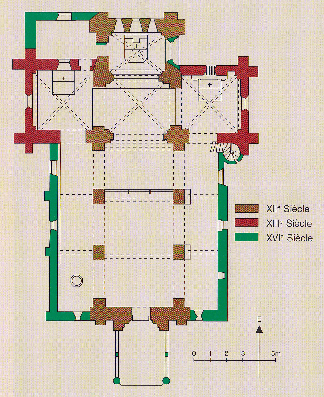 Entre-temps – vers 1160 – la nef avait été dotée de bas-côtés et d’une nouvelle façade. La liaison avec les bas-côtés s’effectue par des arcades brisées, agrandies au 13ème siècle en ce qui concerne la dernière travée. Le petit portail à gâble a ses piédroits garnis de trois rangées de colonnettes. Un porche le masque en partie depuis le 16ème siècle, époque à laquelle les bas-côtés furent reconstruits et une jolie tourelle d’escalier bâtie à l’angle du croisillon sud.