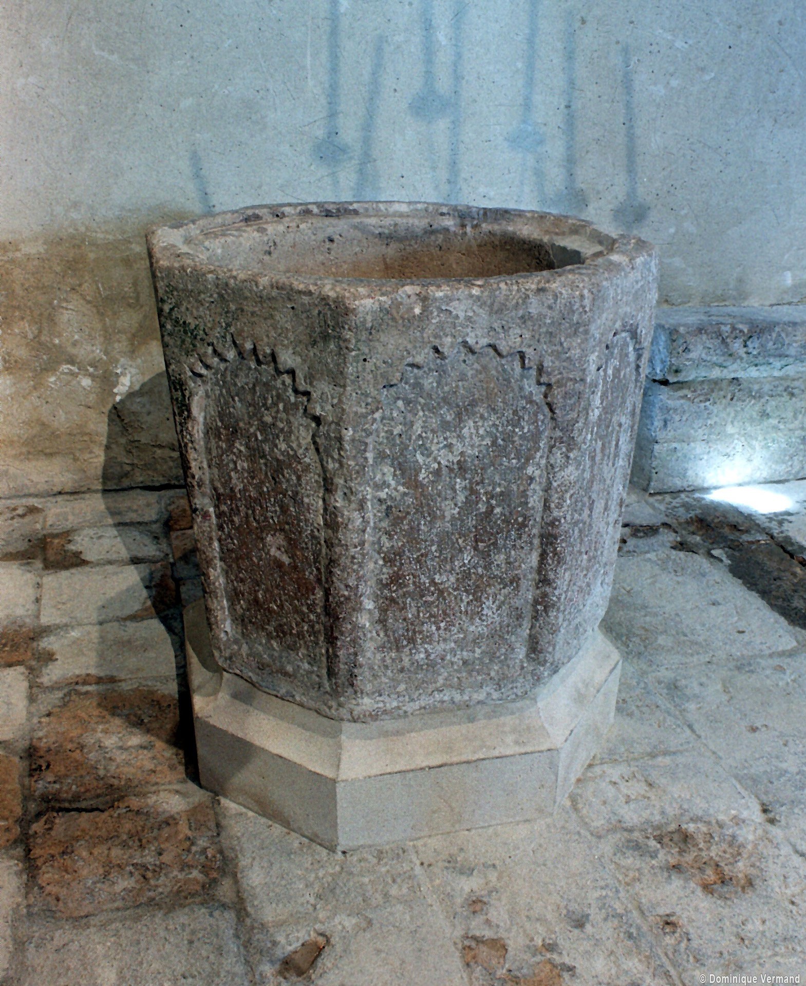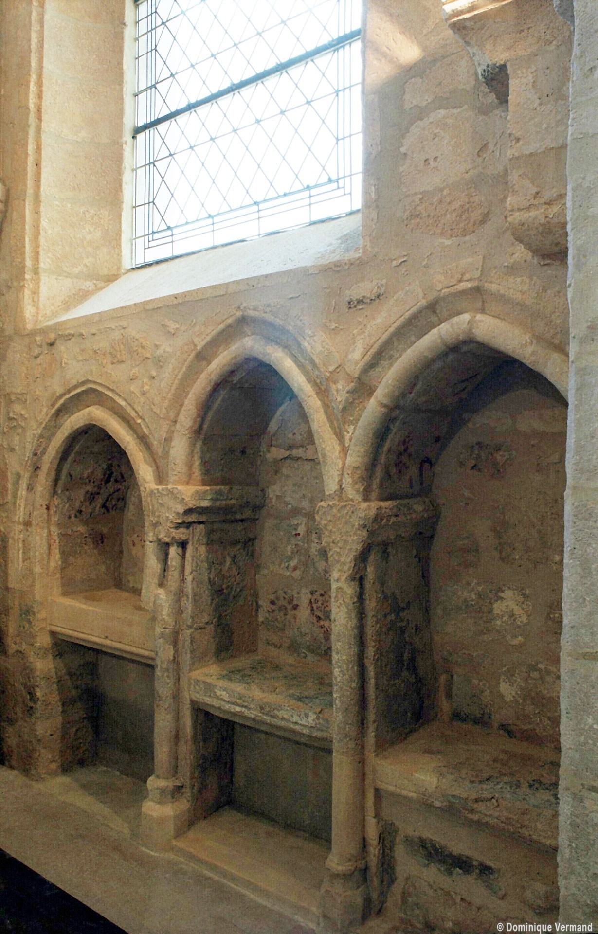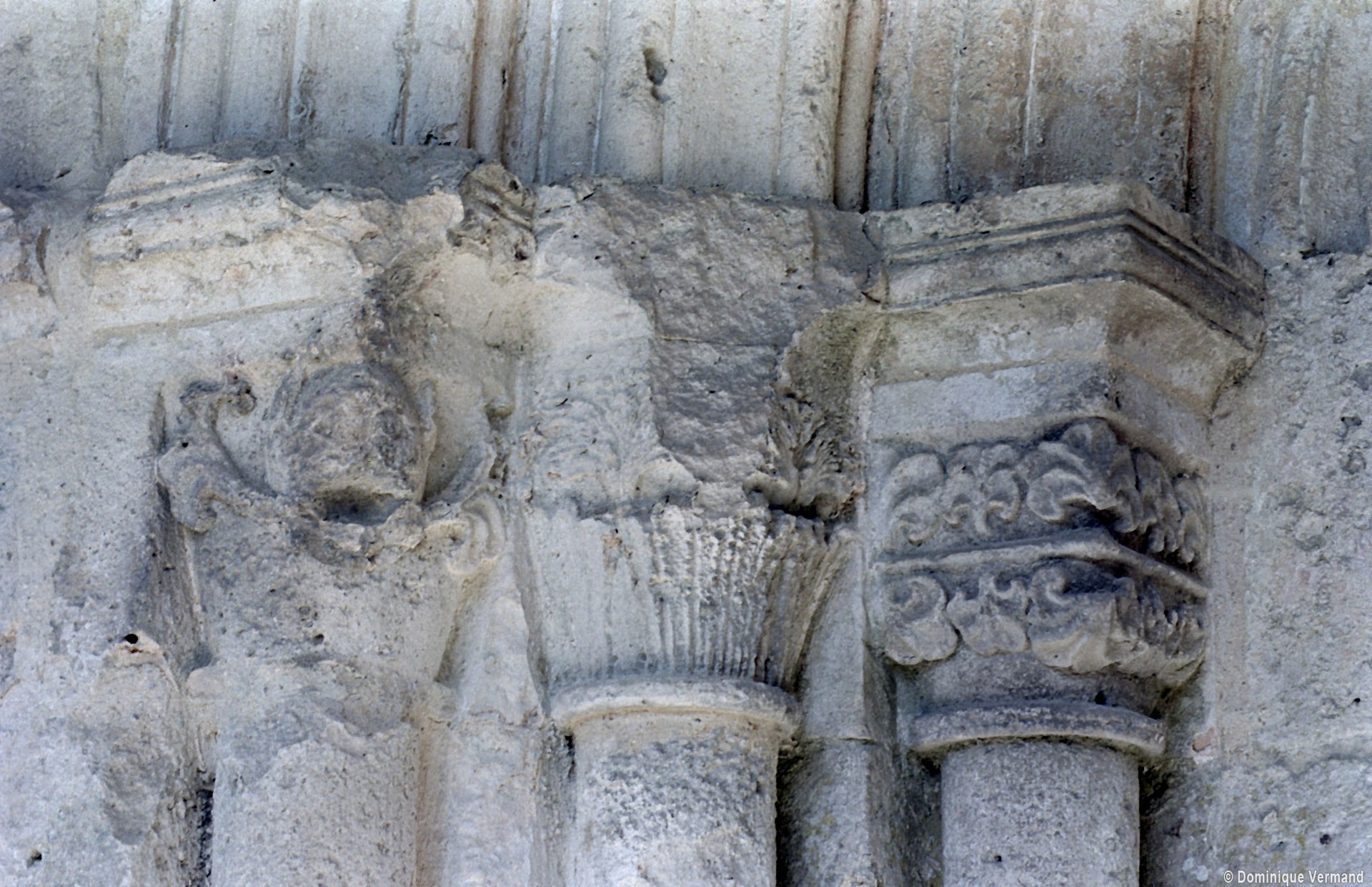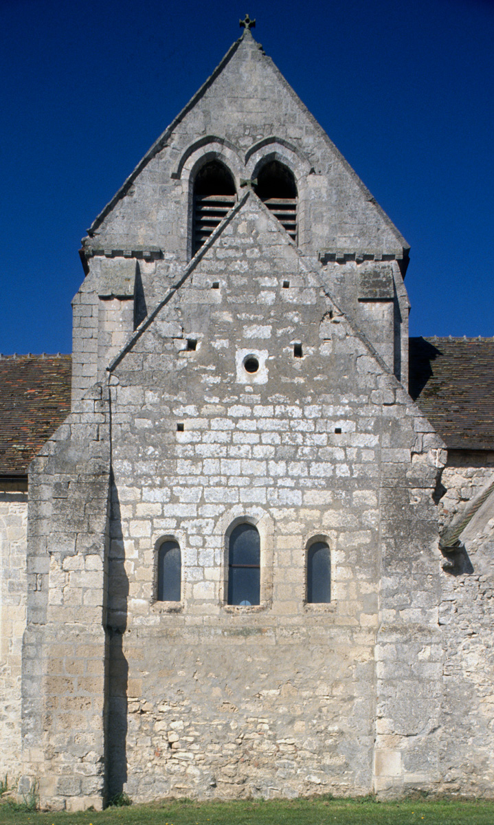 Entre-temps – vers 1160 – la nef avait été dotée de bas-côtés et d’une nouvelle façade. La liaison avec les bas-côtés s’effectue par des arcades brisées, agrandies au 13ème siècle en ce qui concerne la dernière travée. Le petit portail à gâble a ses piédroits garnis de trois rangées de colonnettes. Un porche le masque en partie depuis le 16ème siècle, époque à laquelle les bas-côtés furent reconstruits et une jolie tourelle d’escalier bâtie à l’angle du croisillon sud.