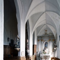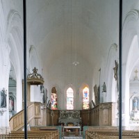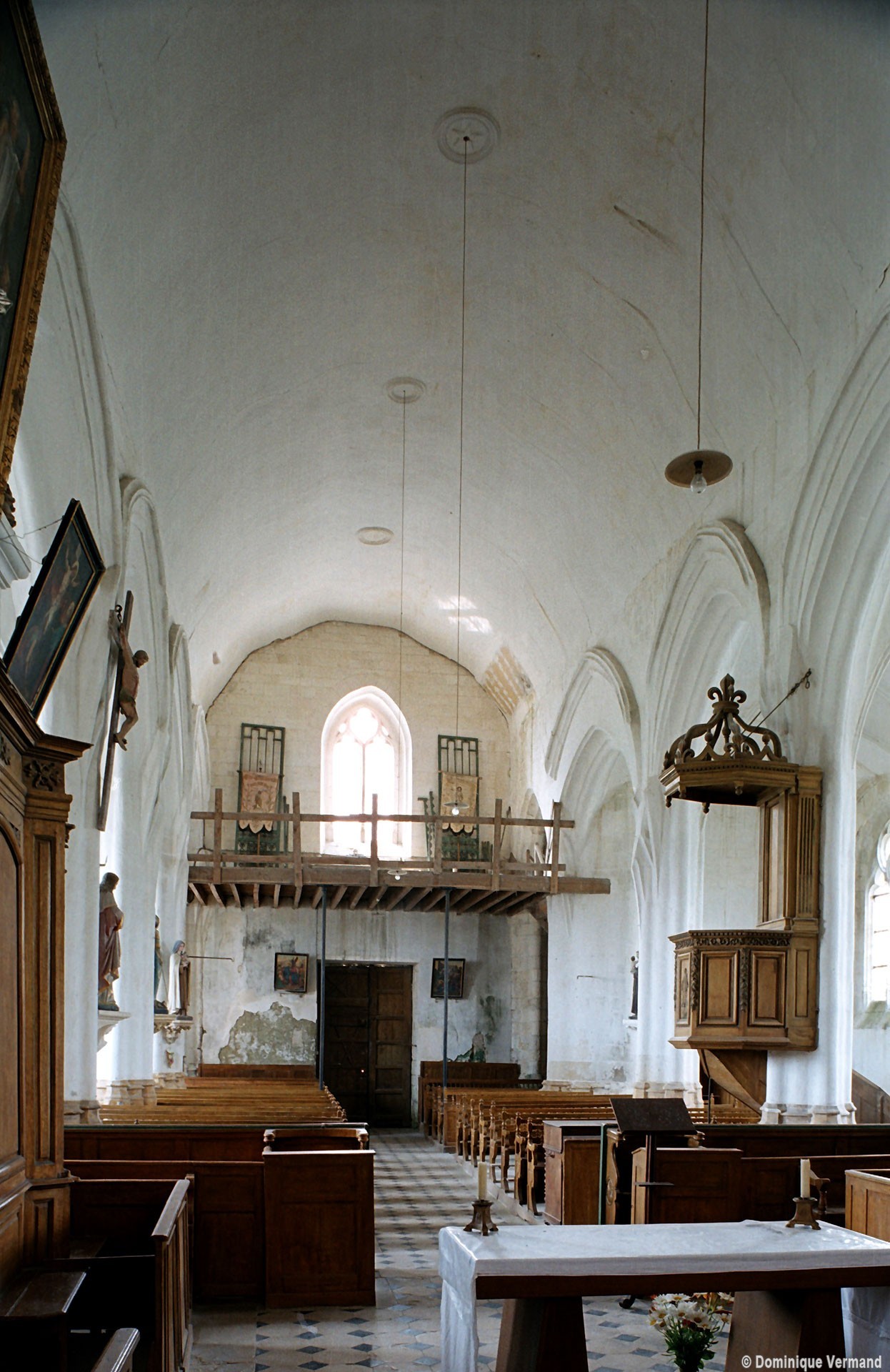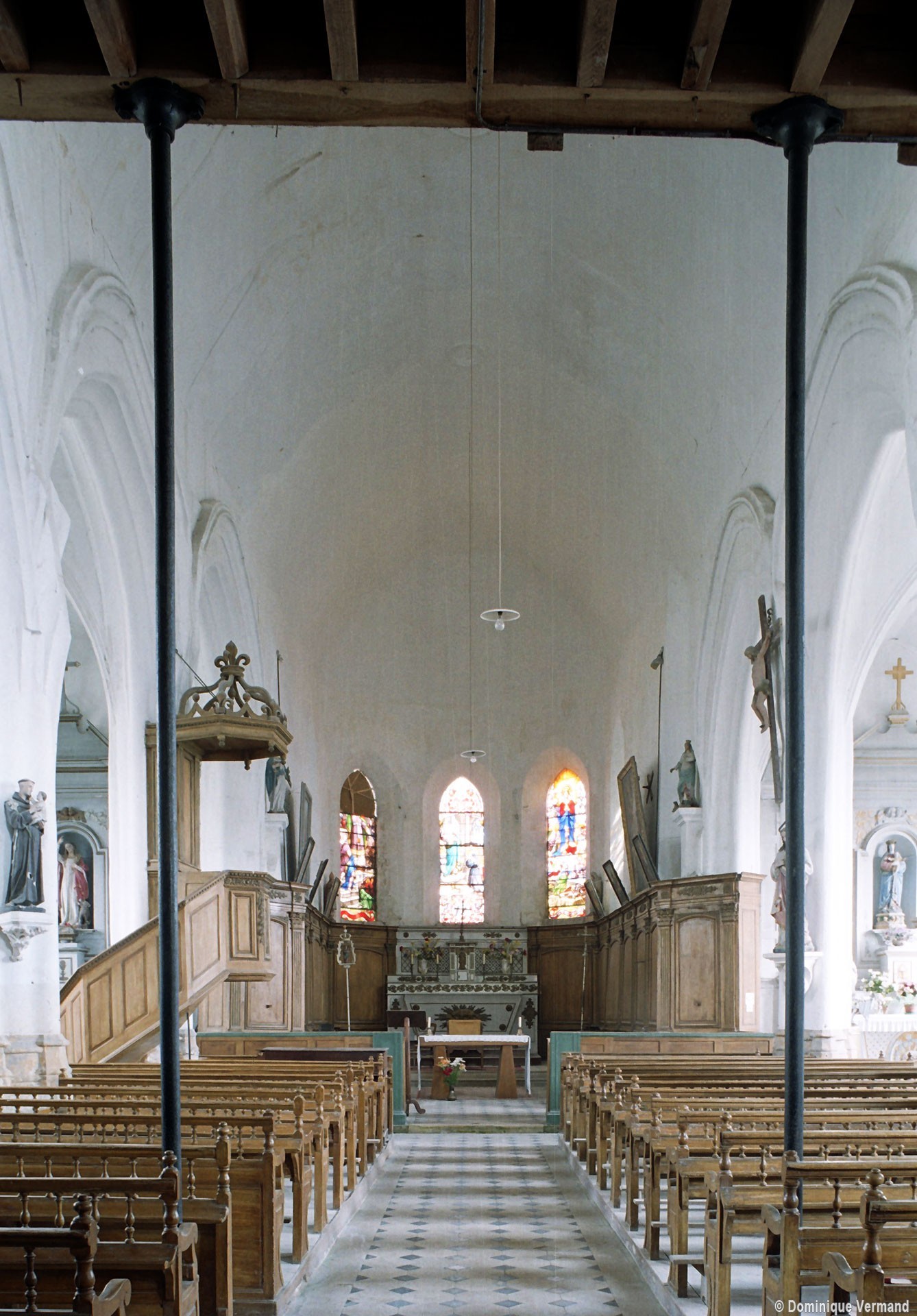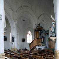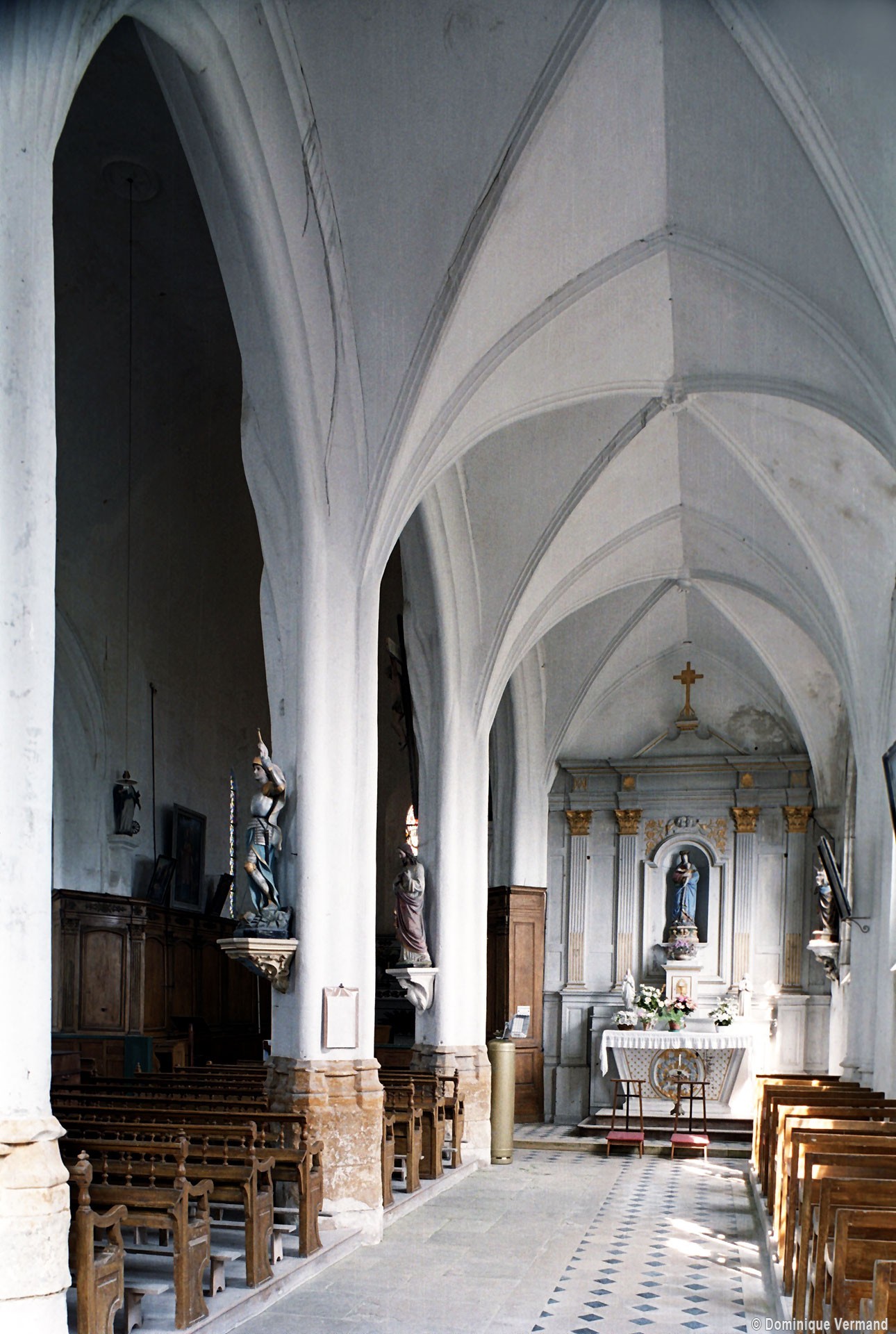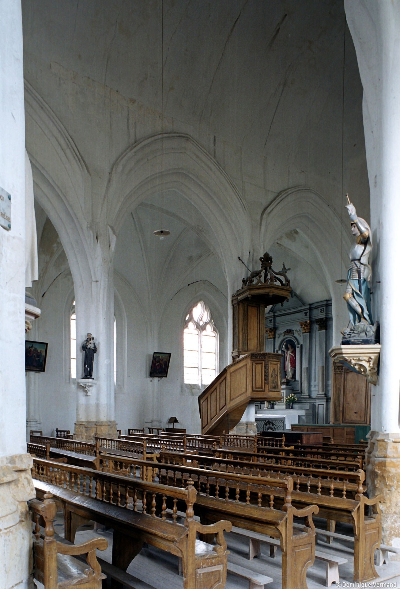 Une première fois éprouvée lors de la Guerre de Cent Ans, l’église sera dotée d’une nouvelle nef avec bas-côtés dans le style gothique flamboyant. Long de quatre travées, le vaisseau central communique avec les bas-côtés par des arcades qui retombent sur des piles quadrilobées inspirées des piles du 13ème siècle. Les fenêtres présentent un réseau flamboyant mais toutes les voûtes ont disparu, victimes des guerres des 16ème et 17ème siècles, fatales également au clocher, presque complètement reconstruit en brique.