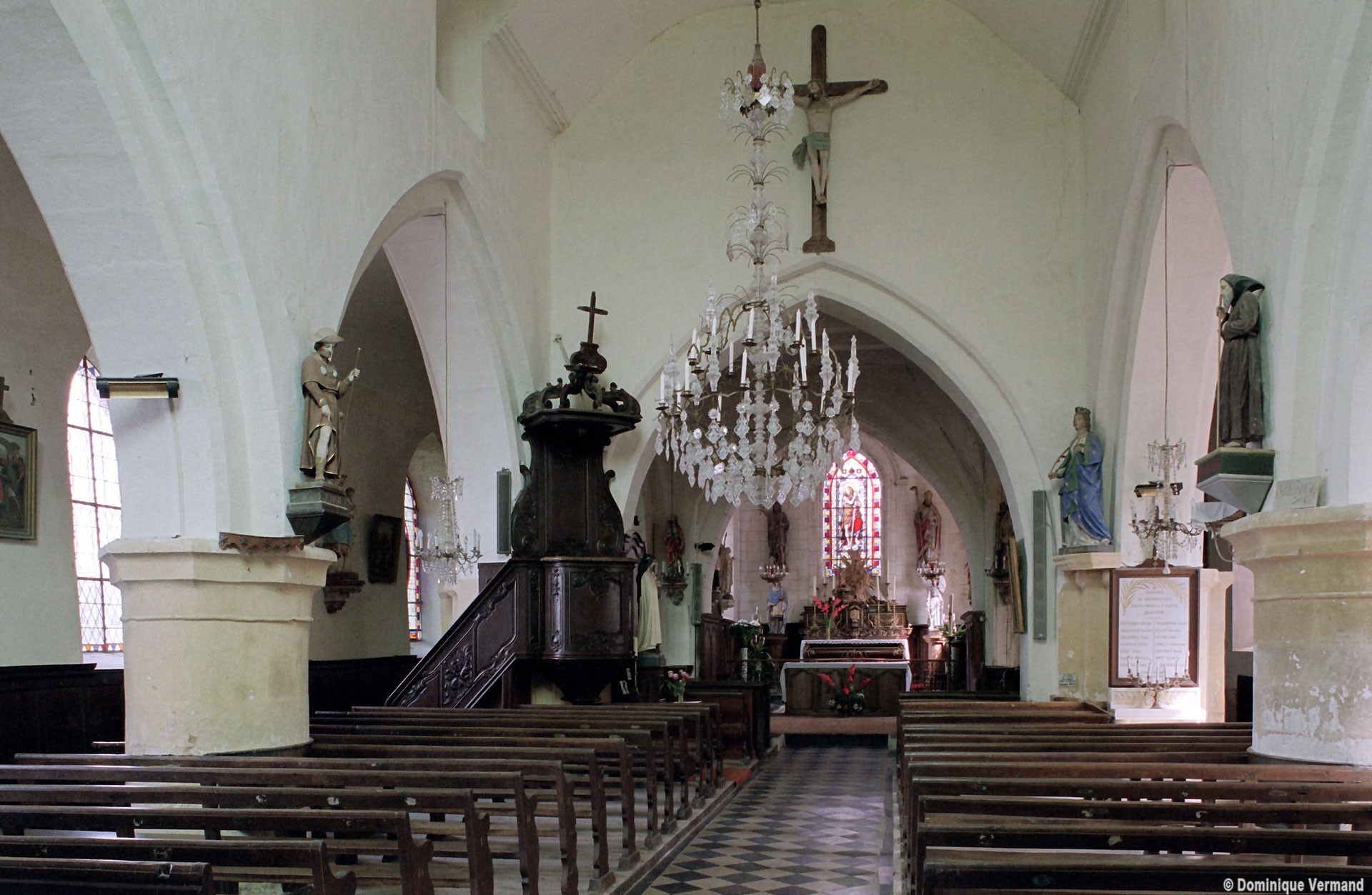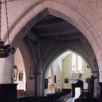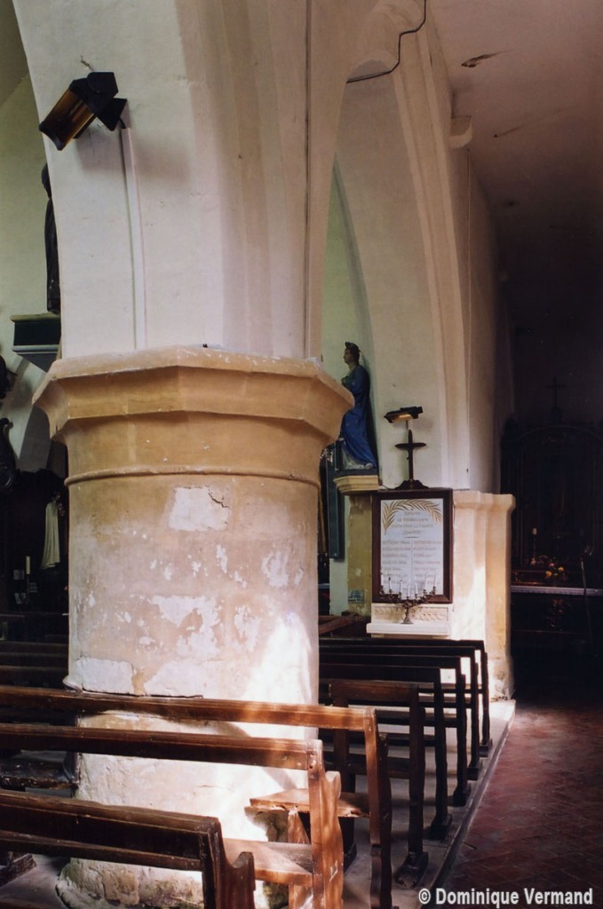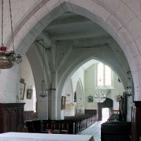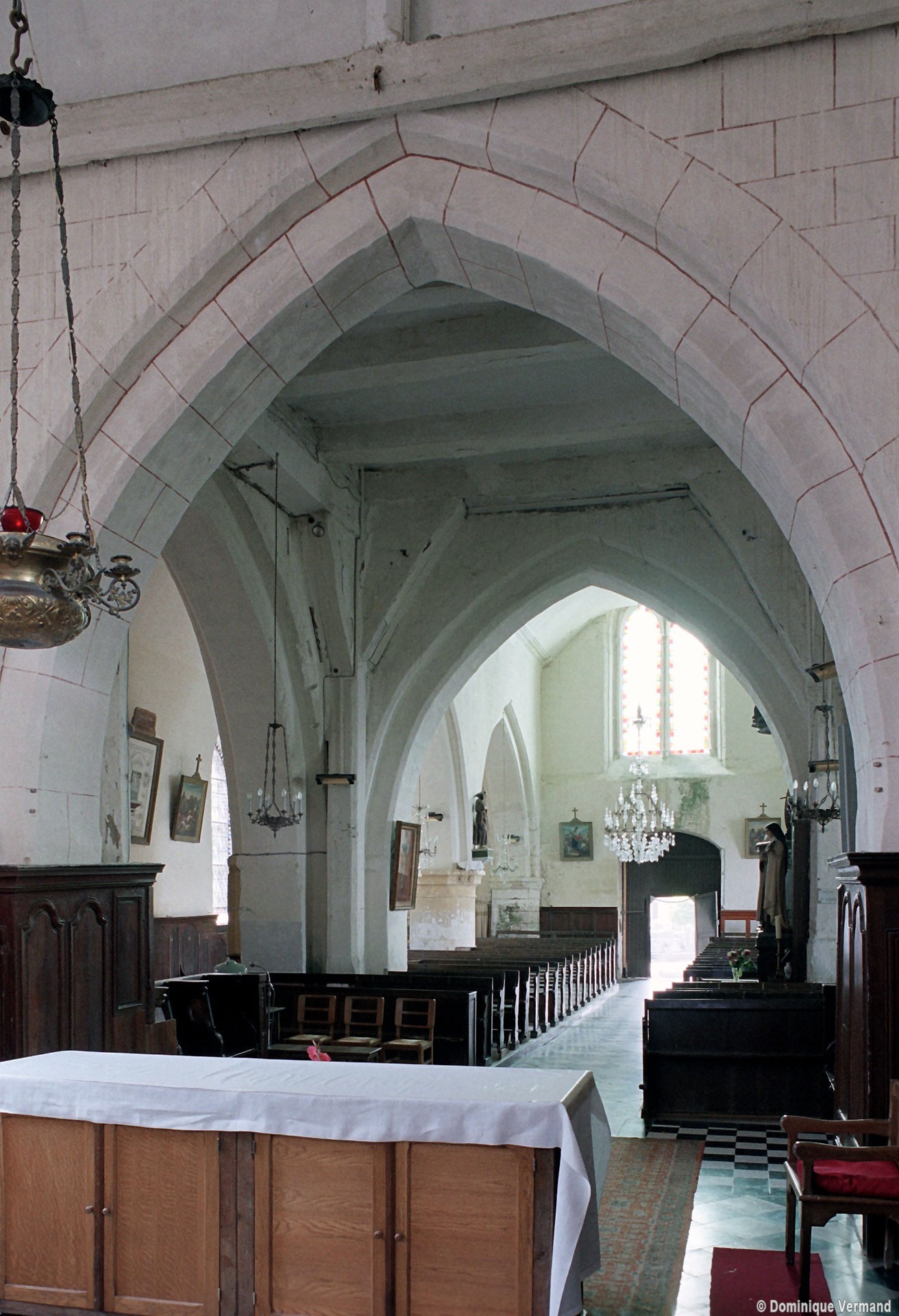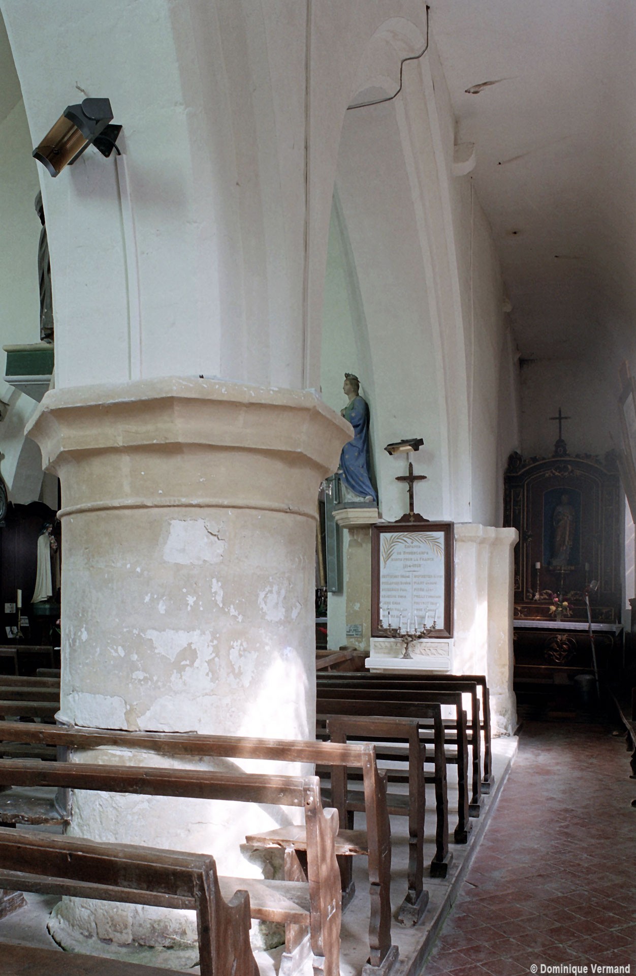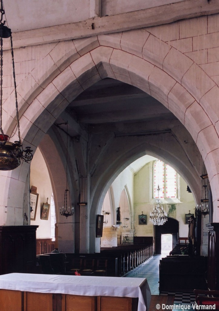 A l’intérieur, la nef comporte seulement deux travées et la communication avec les bas-côtés s’effectue par deux arcades brisées à ressaut retombant au centre sur une grosse mais courte pile circulaire. Il n’y a jamais eu de voûte en pierre et l’actuelle, en bois et plâtre, a été refaite à un niveau très inférieur en 1686. La croisée est formée par quatre arcades du même type que celles de la nef et reçues sur des piliers cruciformes. Un ouvrage en charpente y a été édifié pour soutenir le clocher.