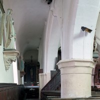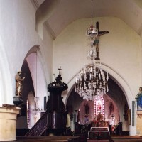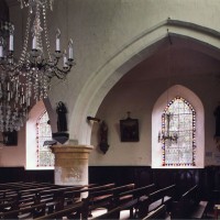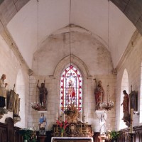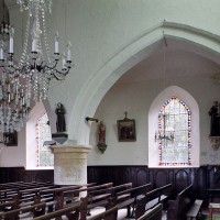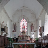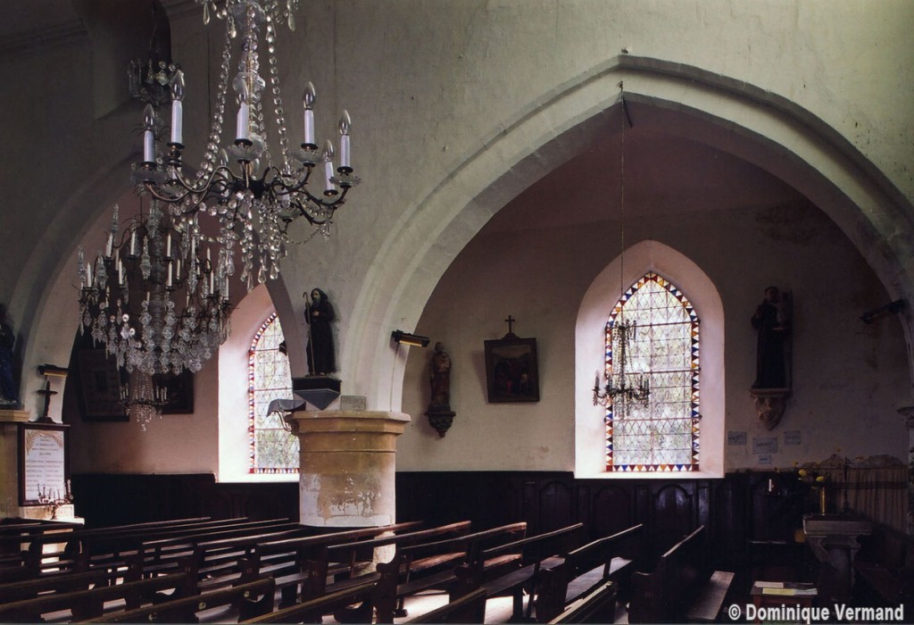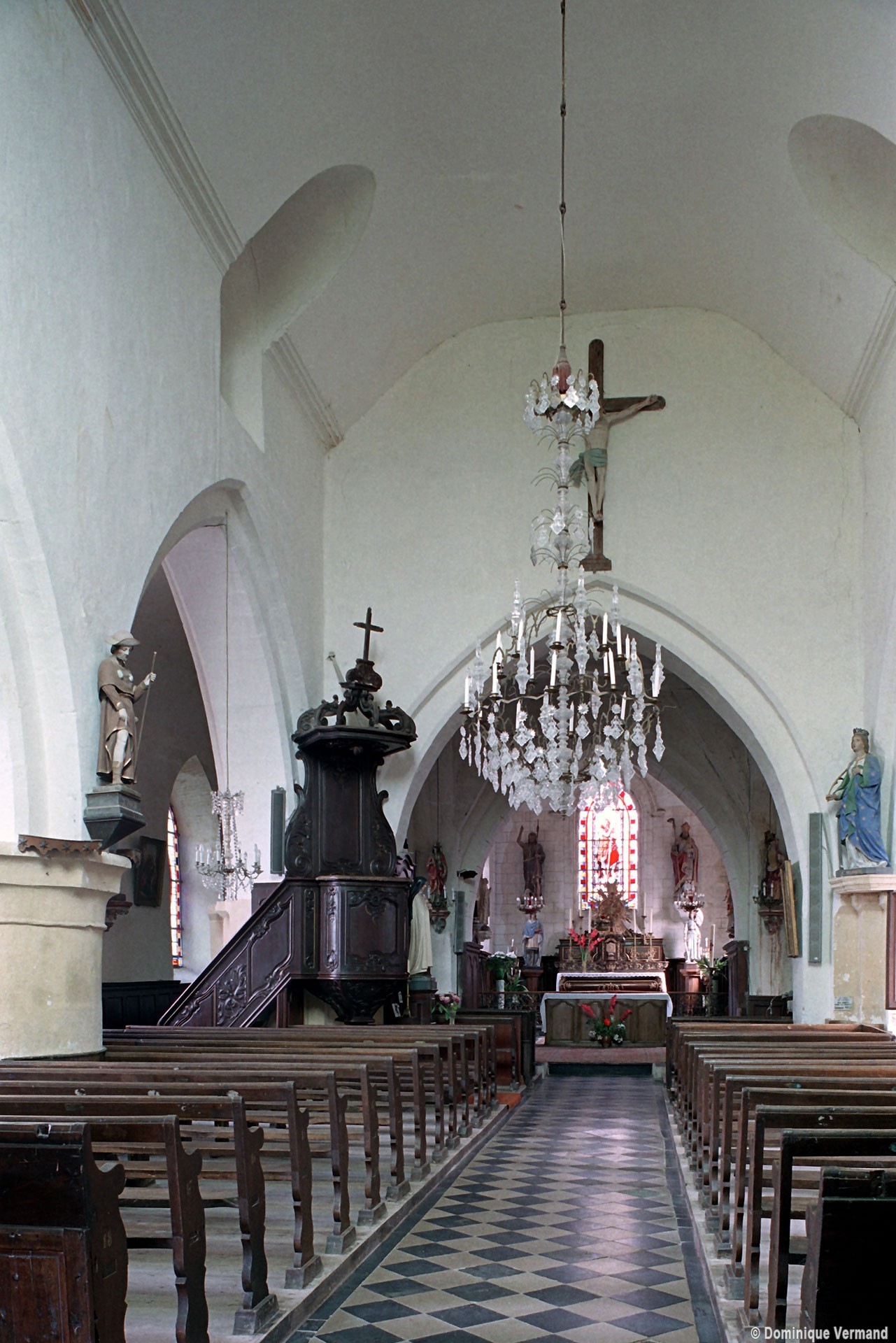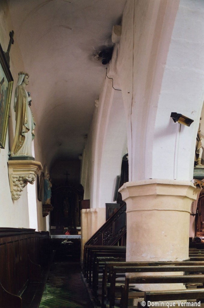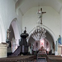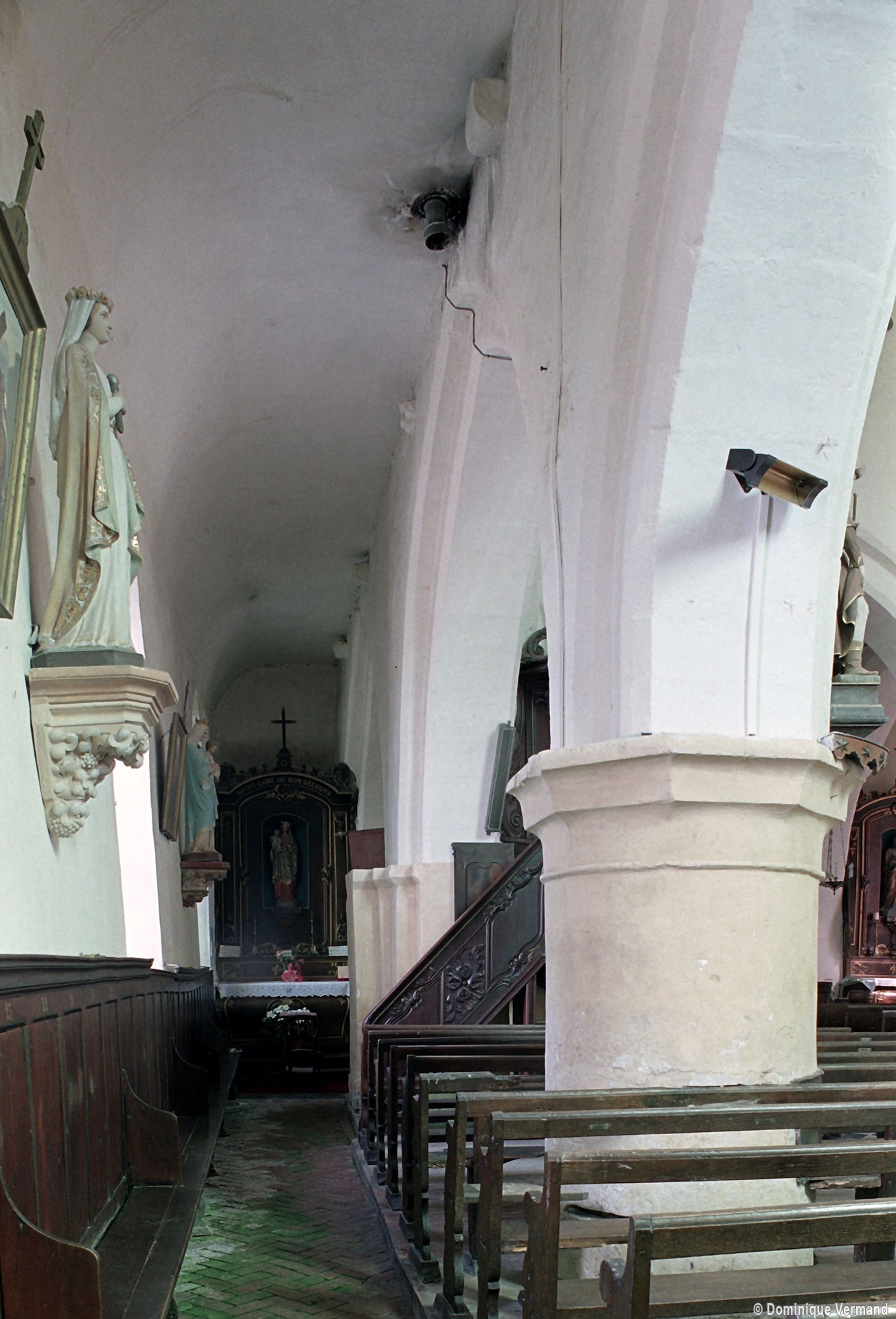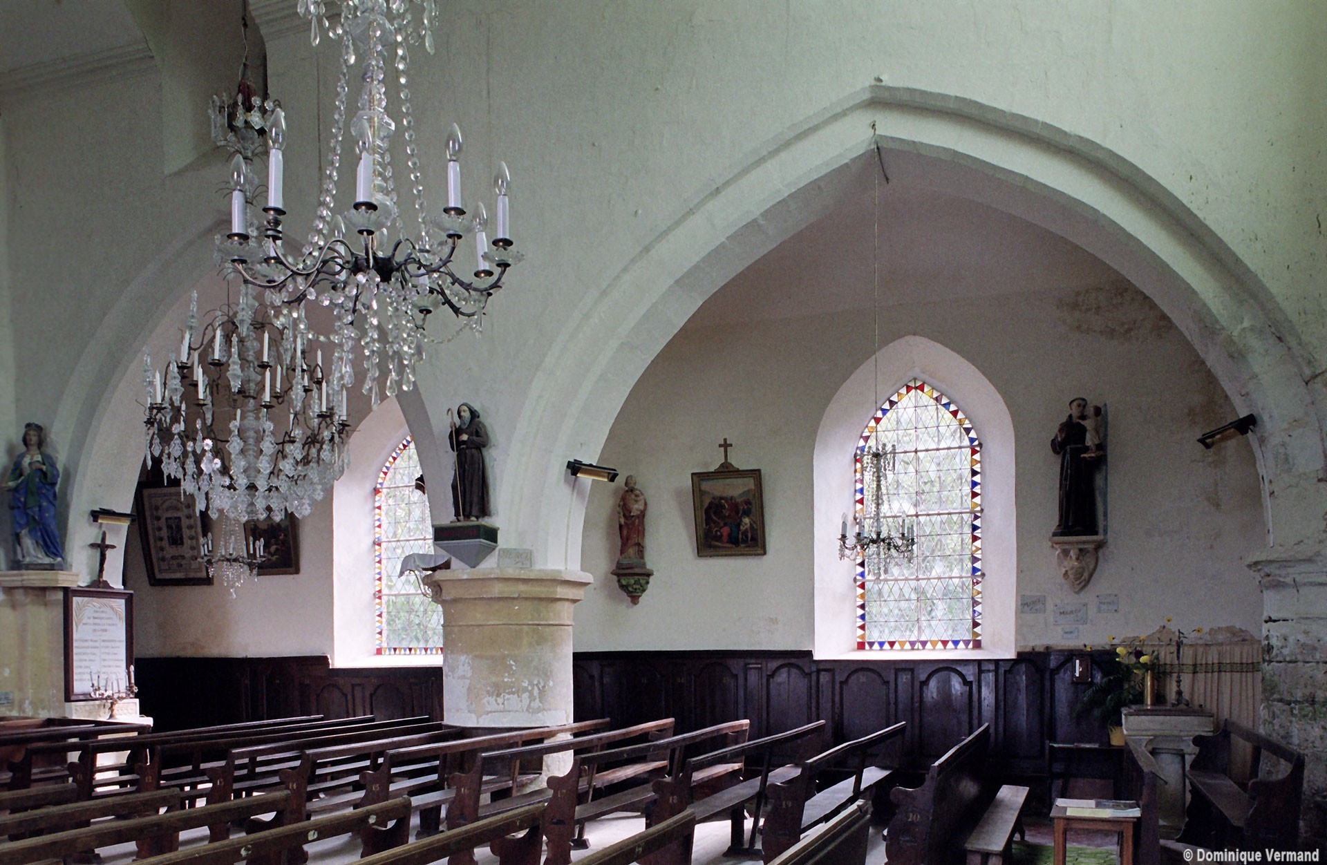A l’intérieur, la nef comporte seulement deux travées et la communication avec les bas-côtés s’effectue par deux arcades brisées à ressaut retombant au centre sur une grosse mais courte pile circulaire. Il n’y a jamais eu de voûte en pierre et l’actuelle, en bois et plâtre, a été refaite à un niveau très inférieur en 1686. La croisée est formée par quatre arcades du même type que celles de la nef et reçues sur des piliers cruciformes. Un ouvrage en charpente y a été édifié pour soutenir le clocher.