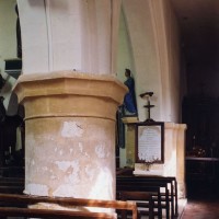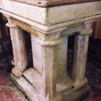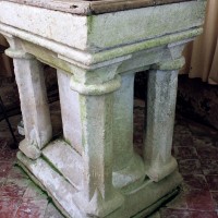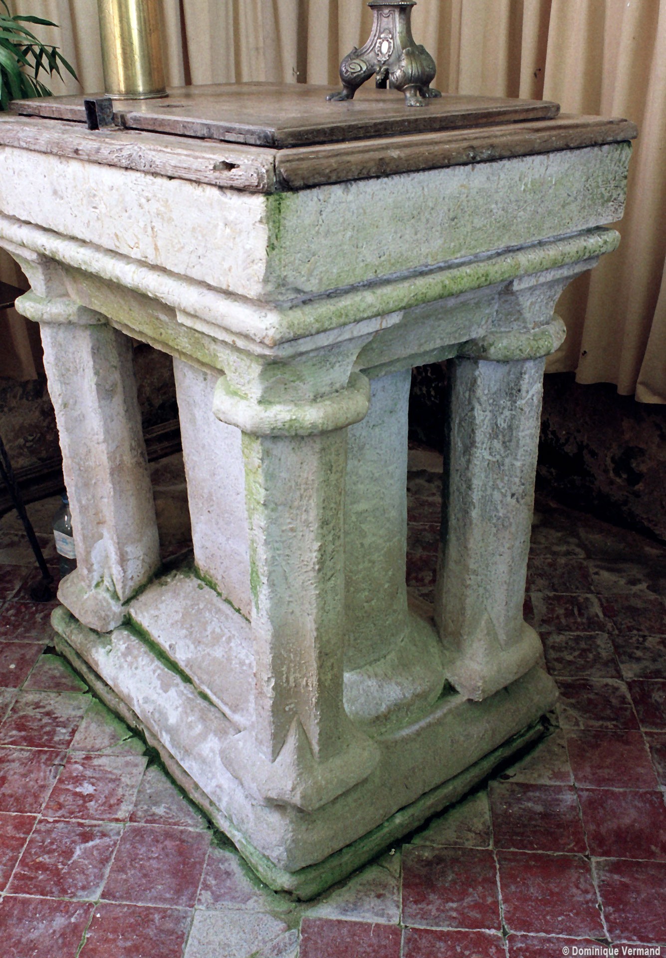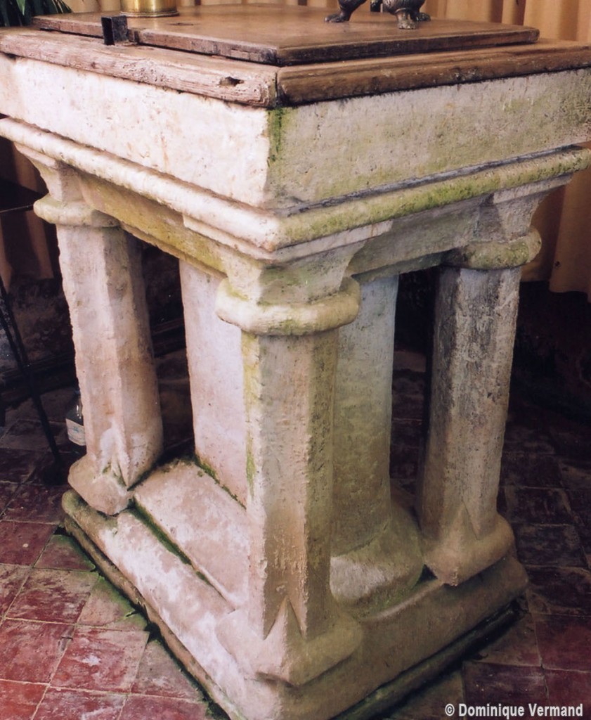 L’église a gardé une cuve baptismale contemporaine de sa construction. Quatre colonnettes hexagonales entourent le fût central et une croix de malte est incrustée dans la cuve (2007).