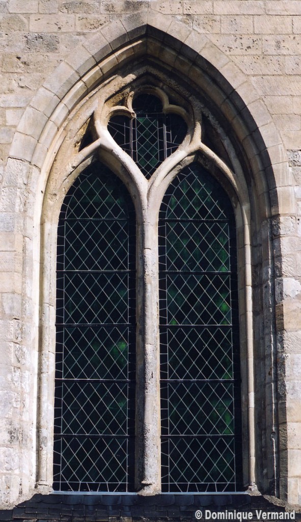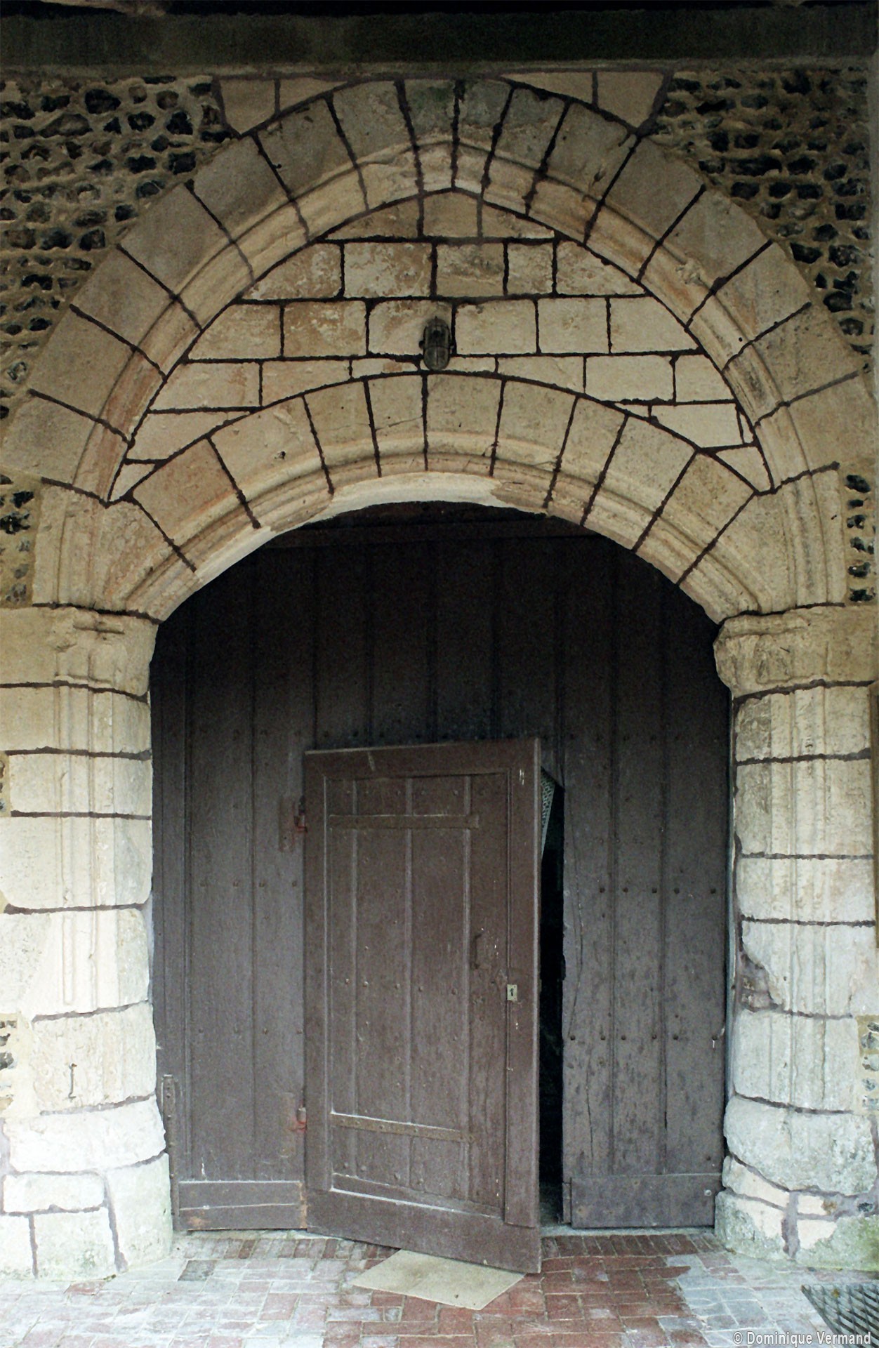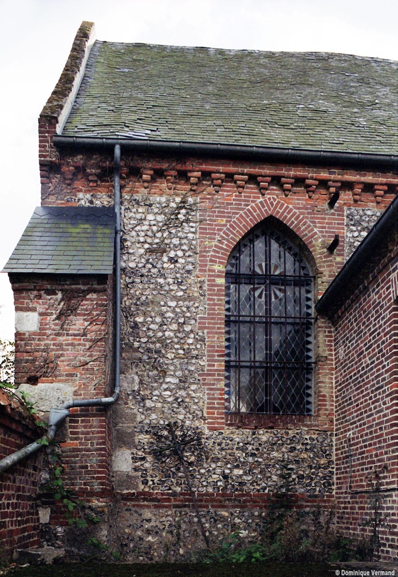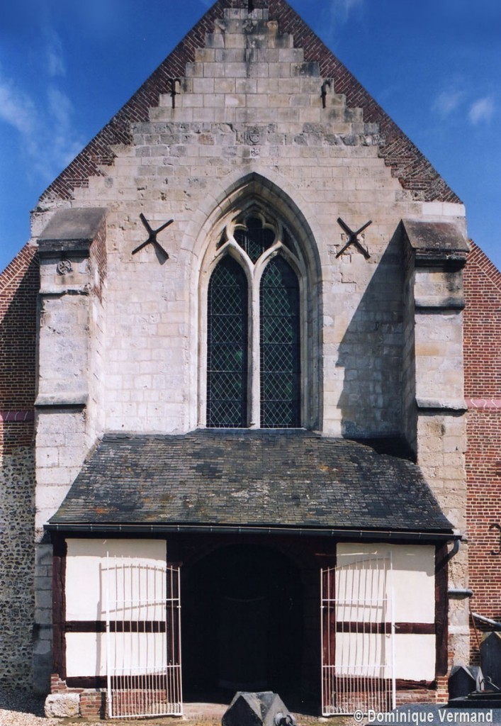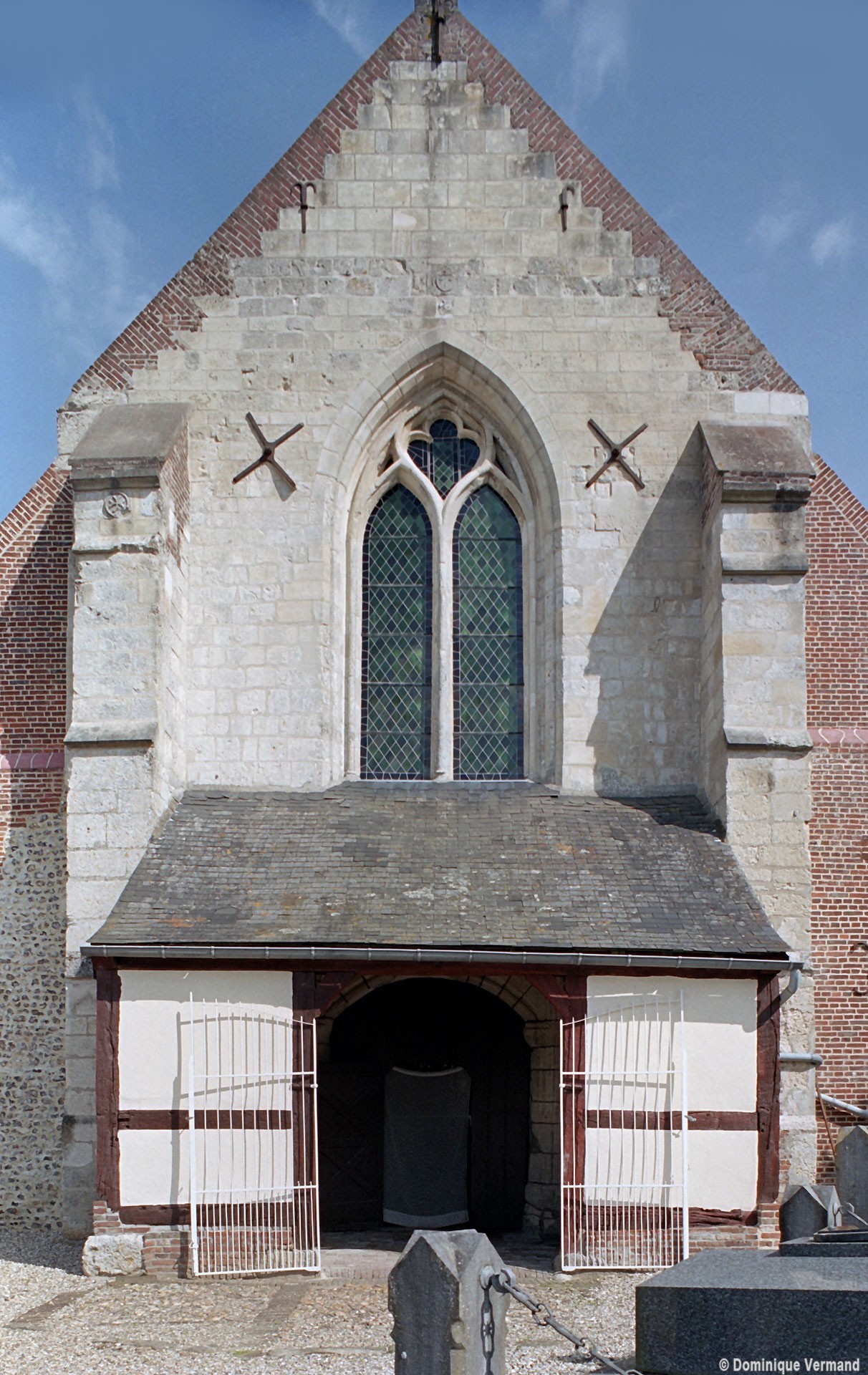 Partiellement refaite au 16ème siècle en silex et briques – bas-côtés et choeur – l’édifice du Moyen Age a conservé sa nef, avec la partie correspondante de la façade, et sa croisée. Epaulée par deux puissants contreforts, la façade est construite en blocs de pierre bien appareillés. Elle est percée d’une immense fenêtre dont le réseau mélange les références au rayonnant – mouluration torique, chapiteaux au revers – et au flamboyant naissant, avec ses courbes et contre courbes. Au-dessous, le portail superpose deux arcs de décharge – l’un brisé, l’autre surbaissé – qui retombent sur des colonnettes à peine dégagées et d’une minceur extrême.