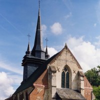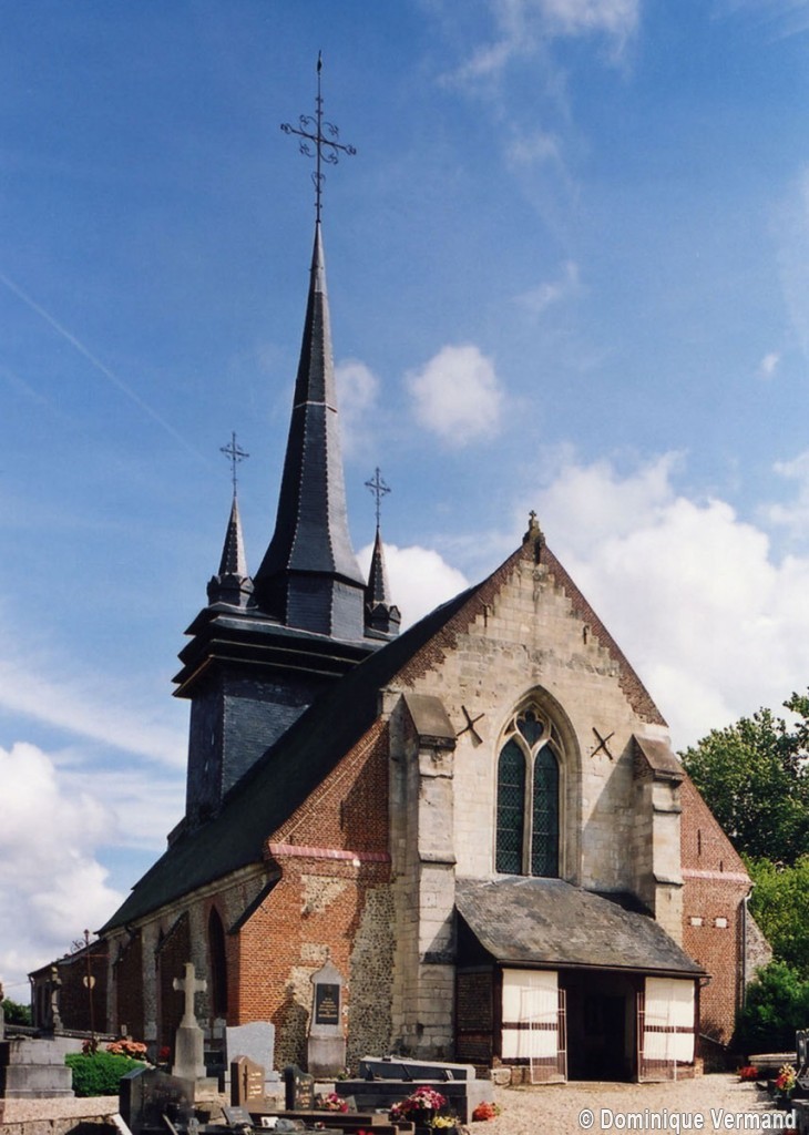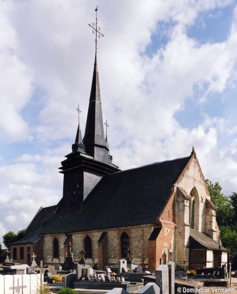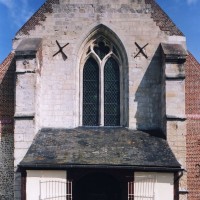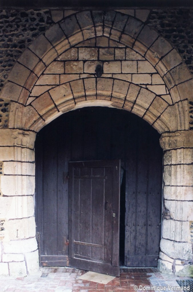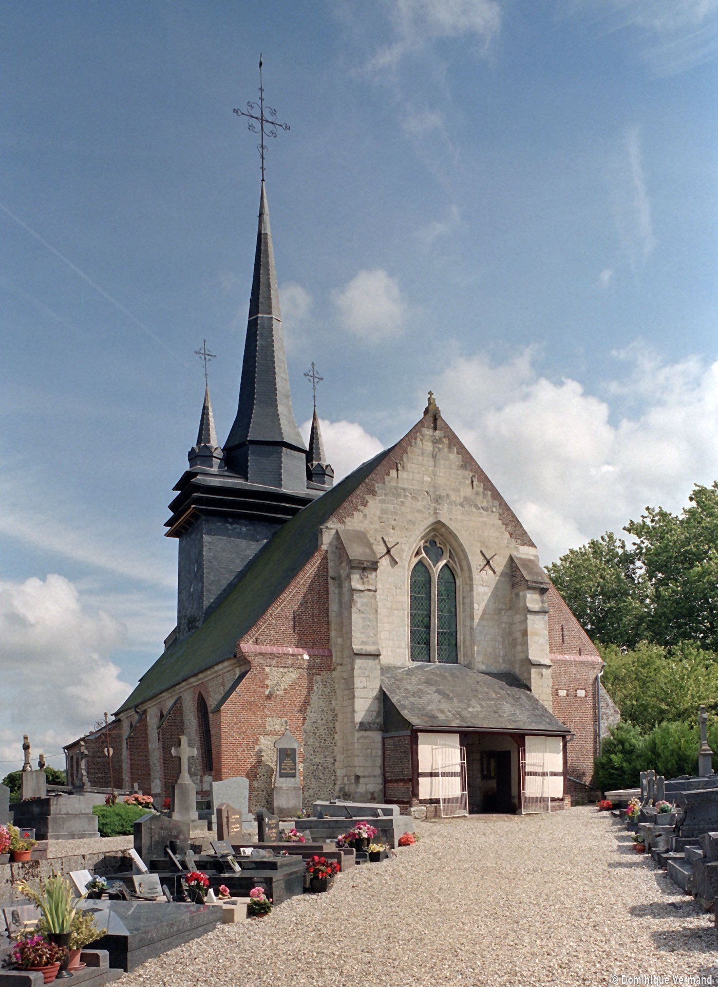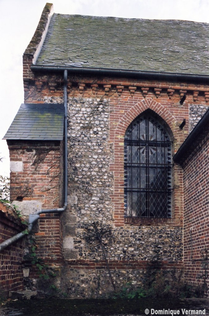 Partiellement refaite au 16ème siècle en silex et briques – bas-côtés et choeur – l’édifice du Moyen Age a conservé sa nef, avec la partie correspondante de la façade, et sa croisée. Epaulée par deux puissants contreforts, la façade est construite en blocs de pierre bien appareillés. Elle est percée d’une immense fenêtre dont le réseau mélange les références au rayonnant – mouluration torique, chapiteaux au revers – et au flamboyant naissant, avec ses courbes et contre courbes. Au-dessous, le portail superpose deux arcs de décharge – l’un brisé, l’autre surbaissé – qui retombent sur des colonnettes à peine dégagées et d’une minceur extrême.