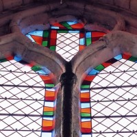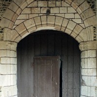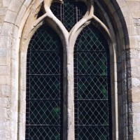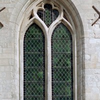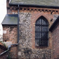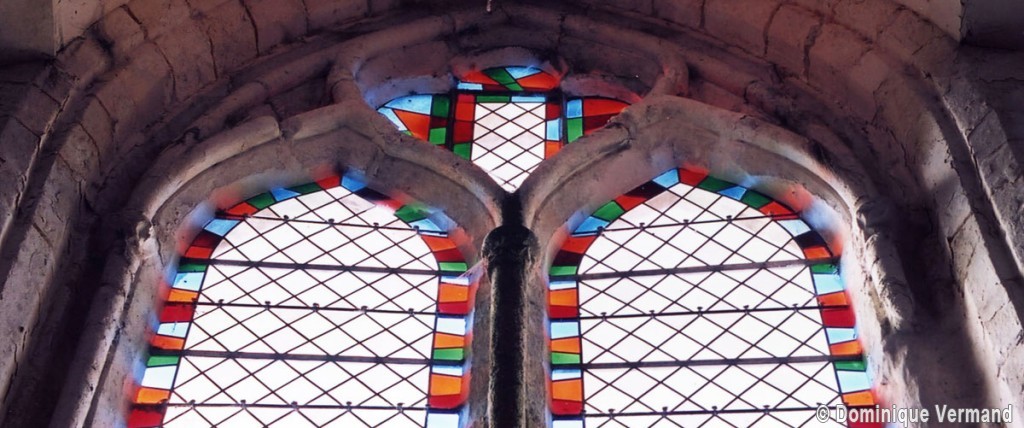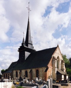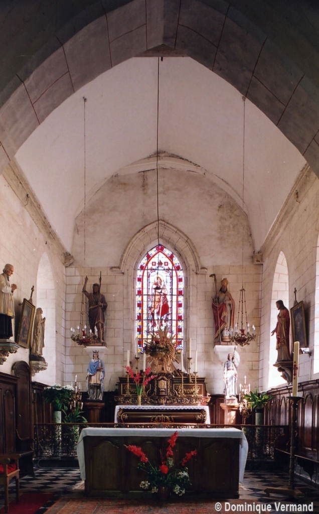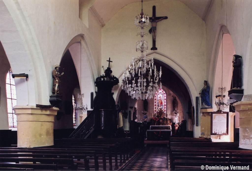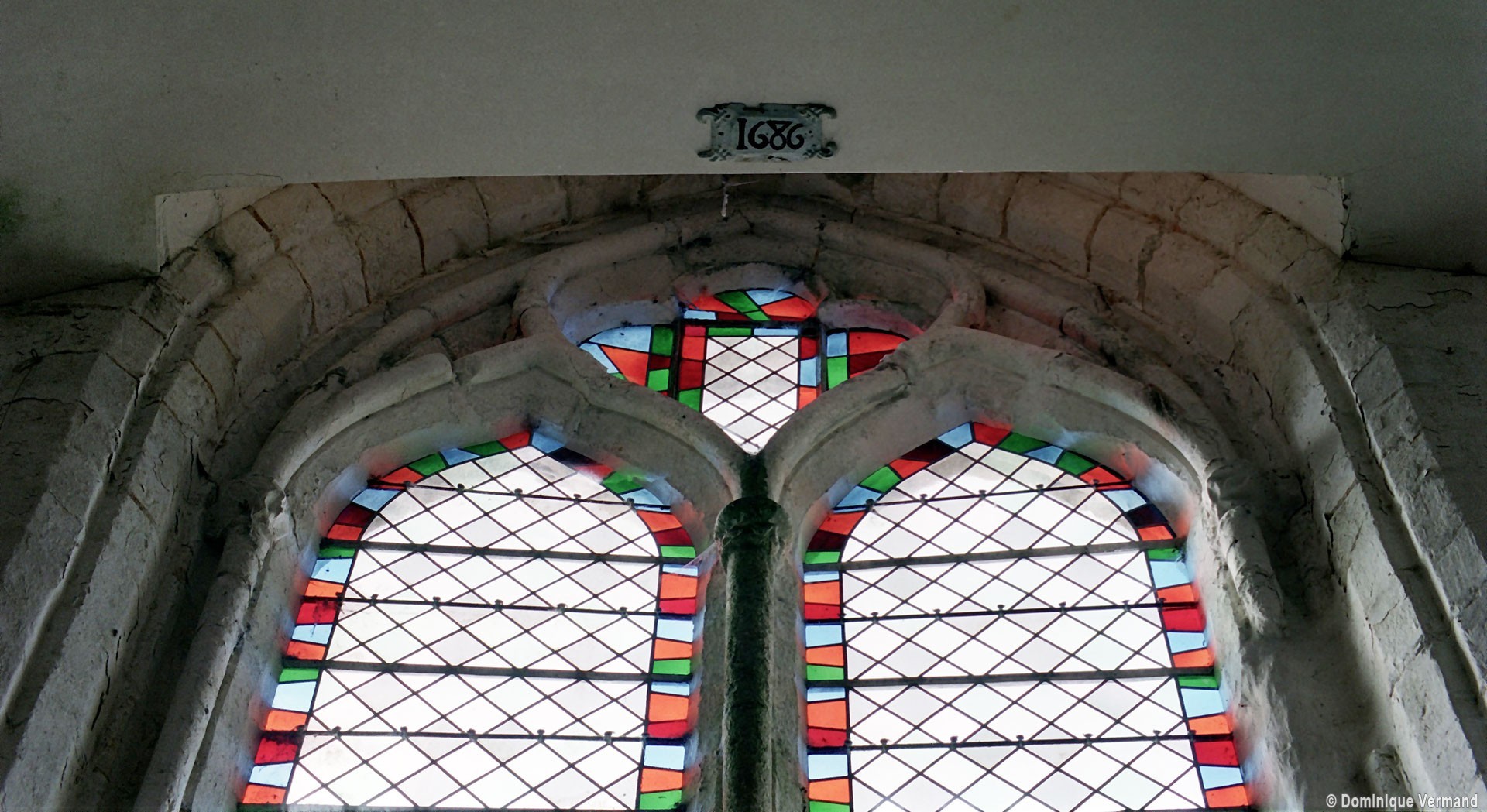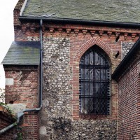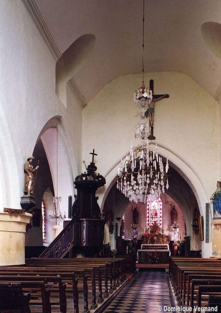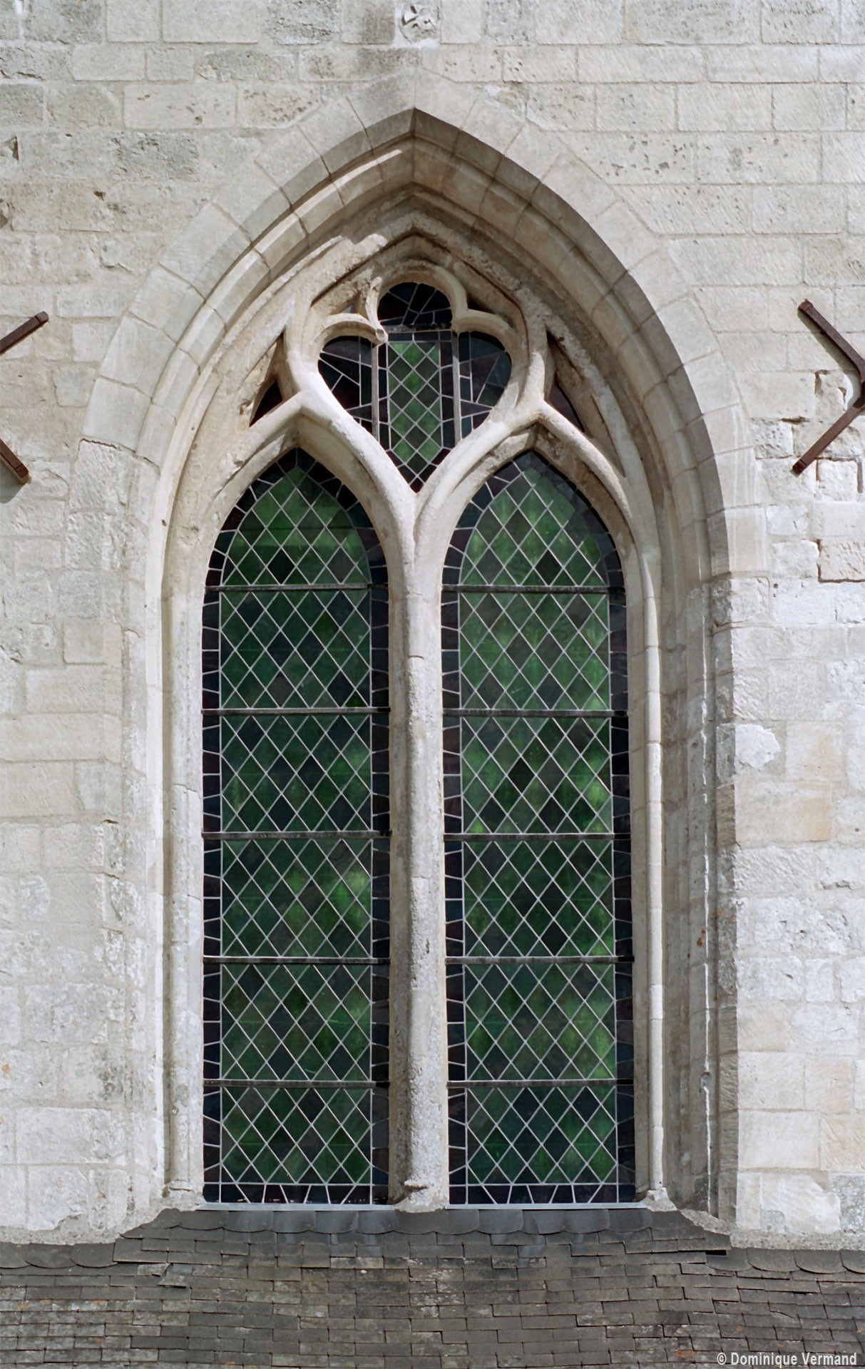 Partiellement refaite au 16ème siècle en silex et briques – bas-côtés et choeur – l’édifice du Moyen Age a conservé sa nef, avec la partie correspondante de la façade, et sa croisée. Epaulée par deux puissants contreforts, la façade est construite en blocs de pierre bien appareillés. Elle est percée d’une immense fenêtre dont le réseau mélange les références au rayonnant – mouluration torique, chapiteaux au revers – et au flamboyant naissant, avec ses courbes et contre courbes. Au-dessous, le portail superpose deux arcs de décharge – l’un brisé, l’autre surbaissé – qui retombent sur des colonnettes à peine dégagées et d’une minceur extrême.