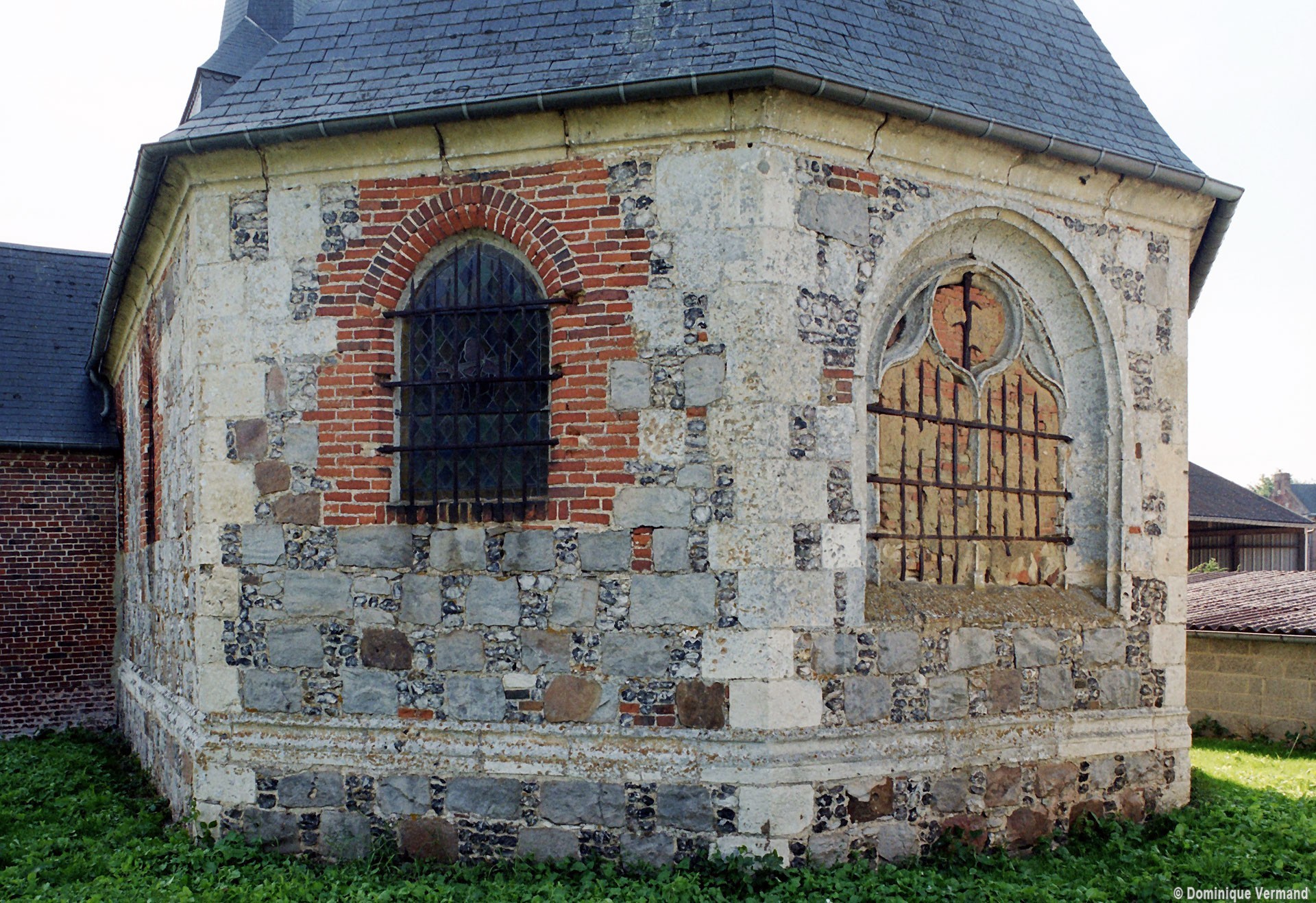 Terminé par une abside à trois côtés, ses murs associent quatre matériaux différents : le grés, le silex, la pierre calcaire et la brique. L’appareillage est en damier et l’accent a été mis sur la fenêtre axiale, plus grande et qui, bien que bouchée, montre encore son remplage flamboyant d’origine. Les autres fenêtres sont de simples lancettes en briques identiques à celles de la nef.