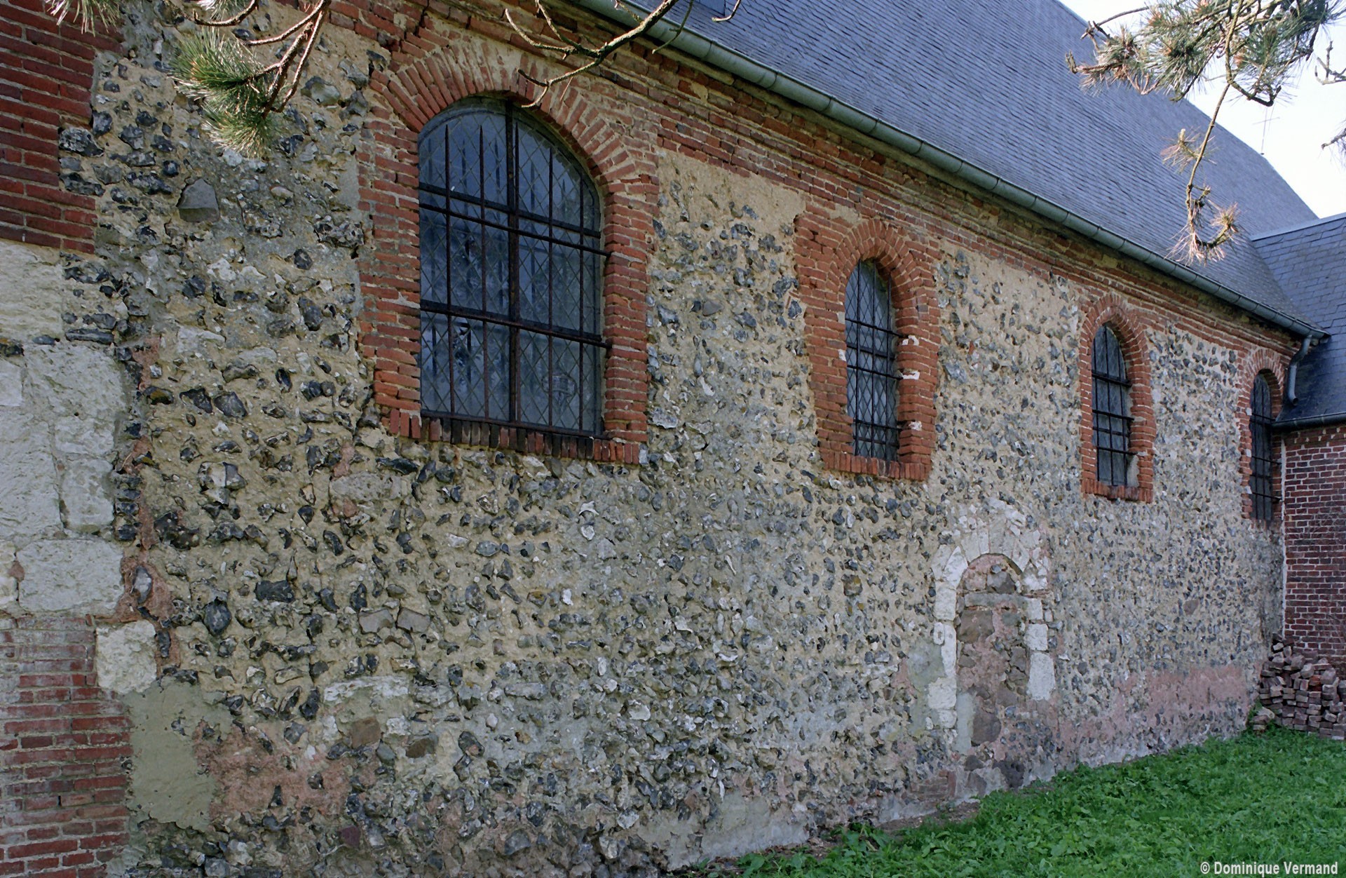 Dominée par le traditionnel clocher en charpente et ardoises et précédée par un petit porche également charpenté, l’église Saint-Lucien sacrifie au plan traditionnel de la région, qui associe une nef unique et un choeur à pans coupés. Comme très souvent, la nef, bâtie en silex, doit être d’origine romane. Si une petite porte en plein cintre aujourd’hui bouchée s’est conservée au sud, toutes les autres ouvertures ont été refaites en briques au 16ème siècle, époque à laquelle le choeur a été reconstruit.