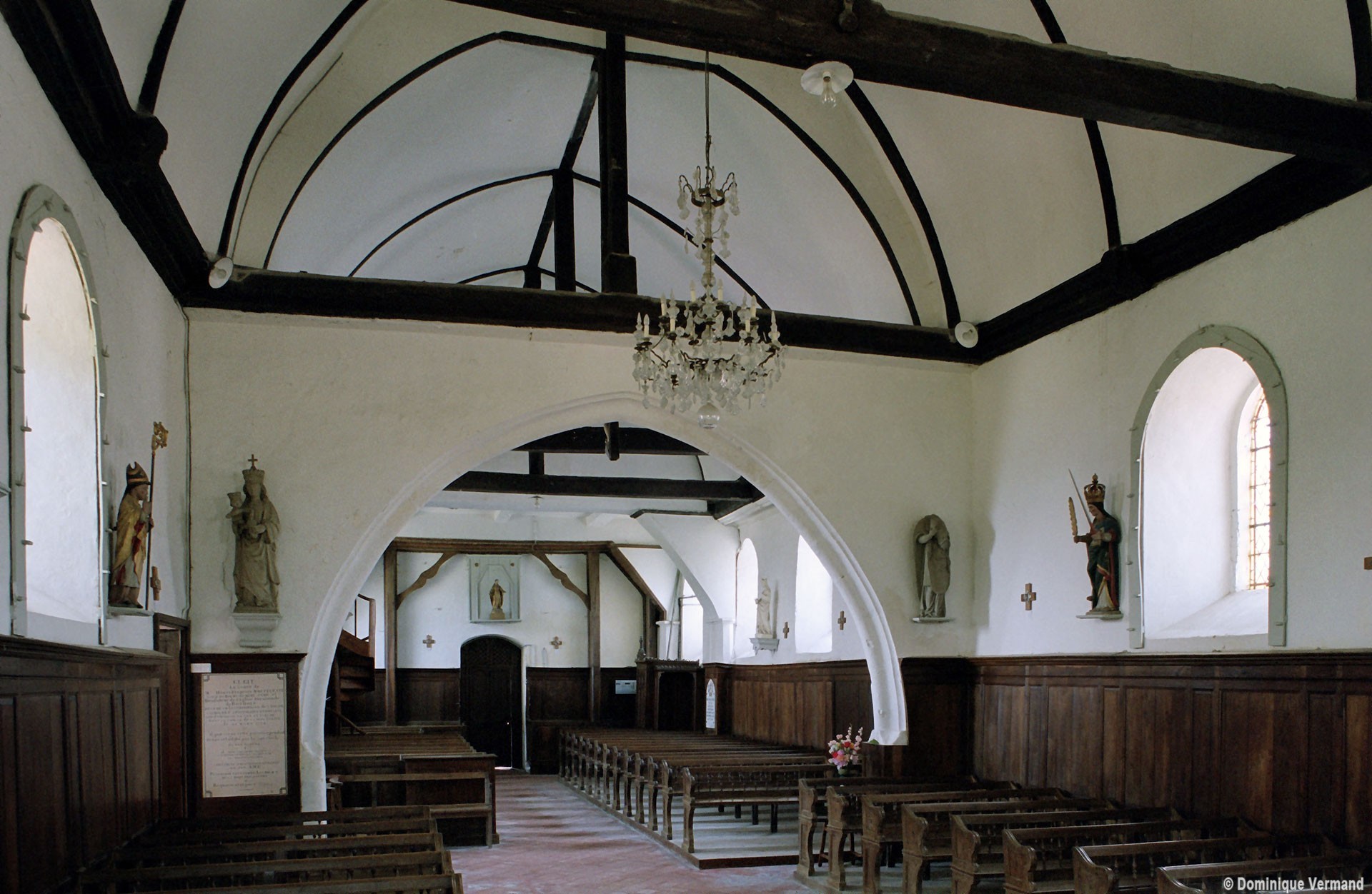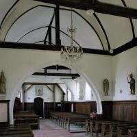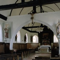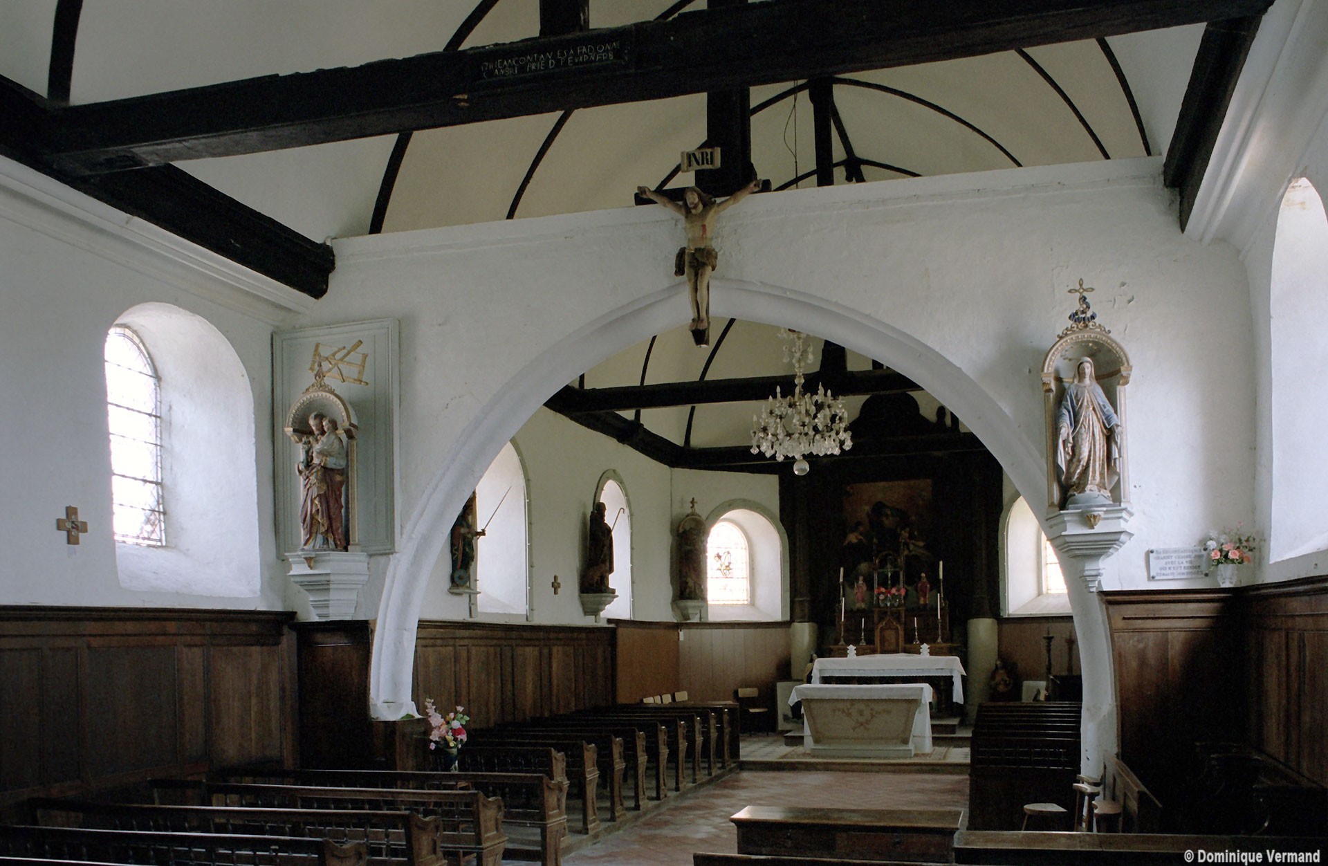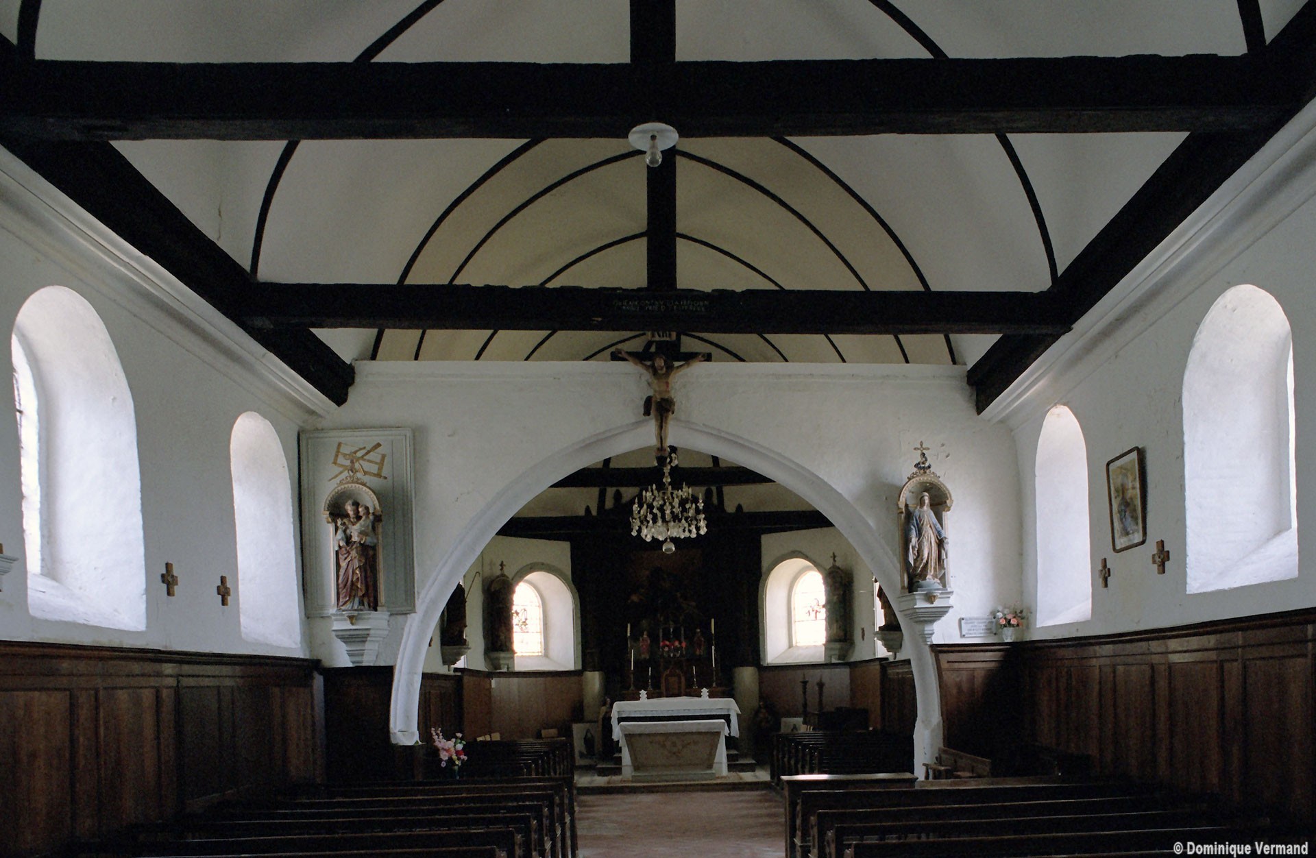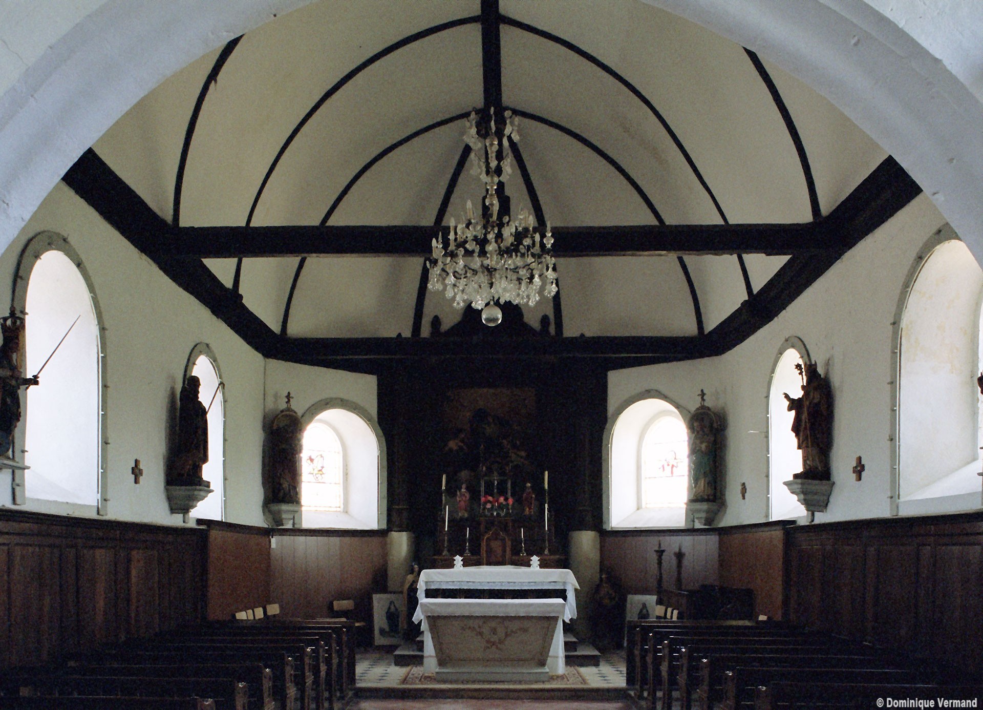 A l’intérieur, la séparation entre la nef et le choeur est nettement marquée par un arc triomphal au tracé brisé et dont le profil ondulé est caractéristique du 16ème siècle. Renforcée par deux entraits recevant chacun un poinçon, la charpente du choeur, dont les têtes qui décoraient autrefois les blochets ont été coupées, est également du 16ème siècle. Celle de la nef porte la date de 1711. Le mobilier comprend un retable du 18ème siècle et quelques statues anciennes.