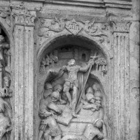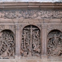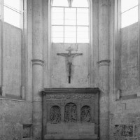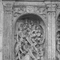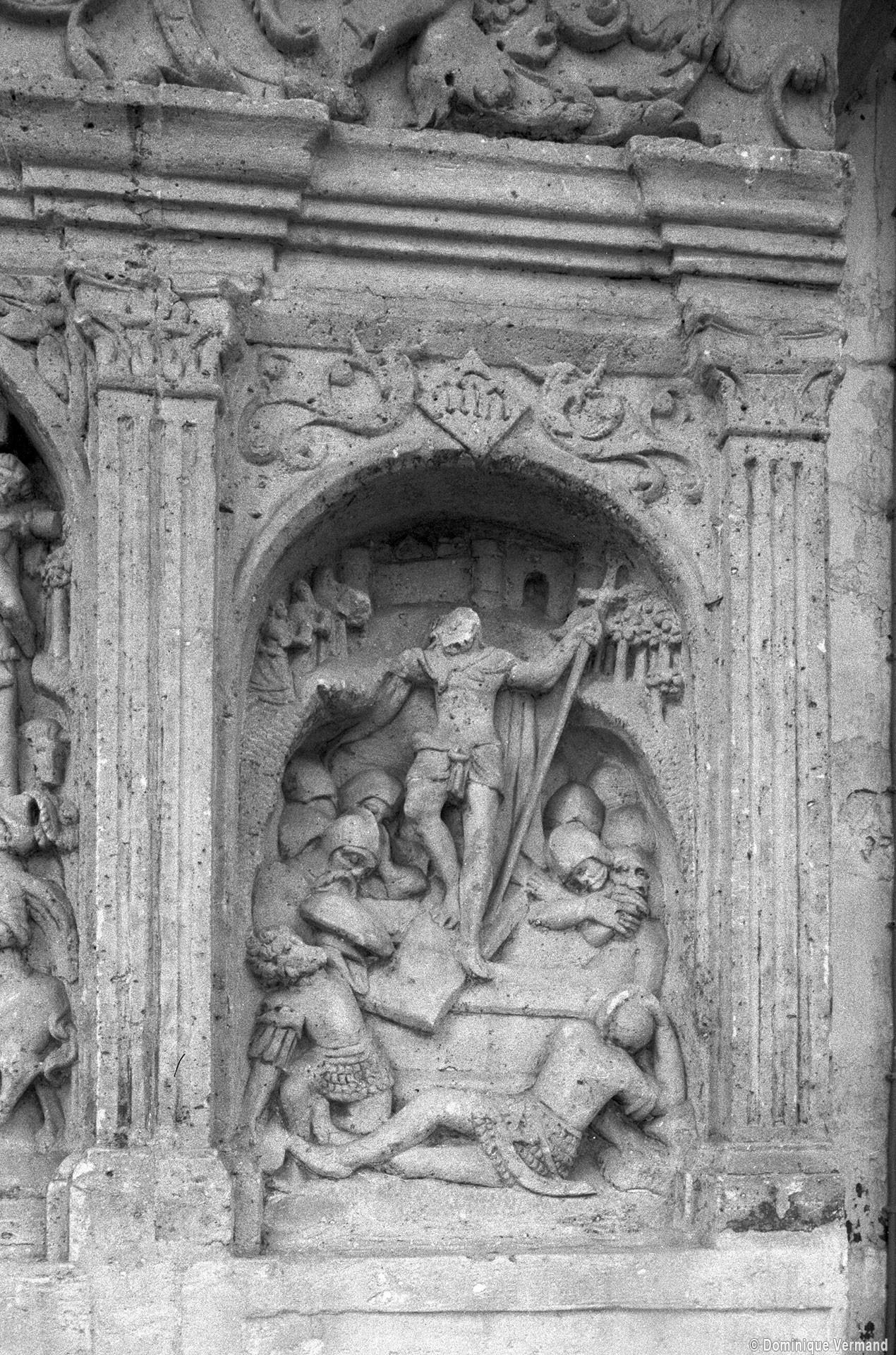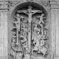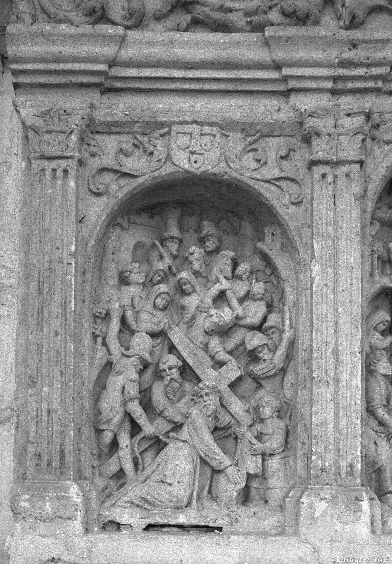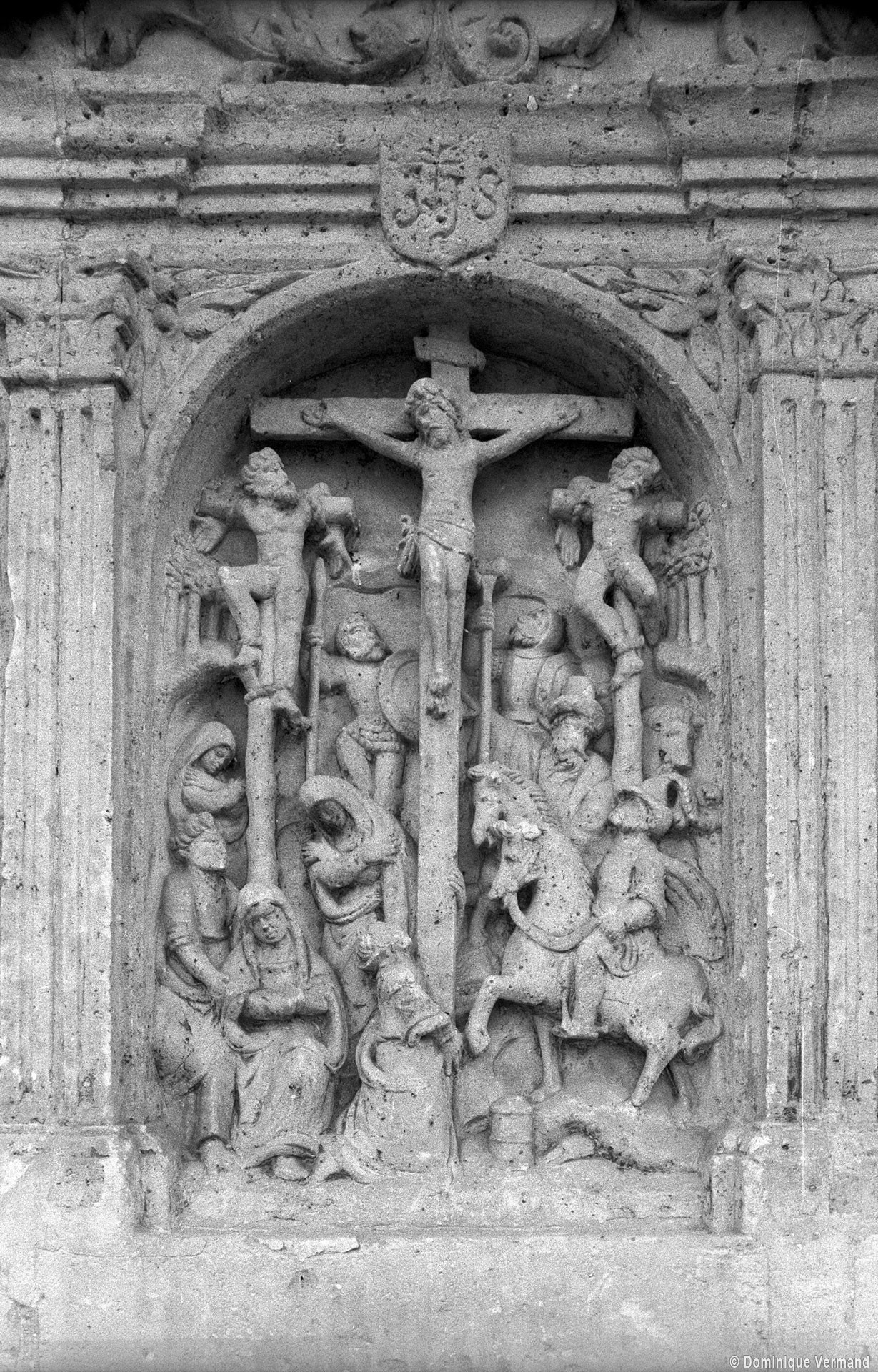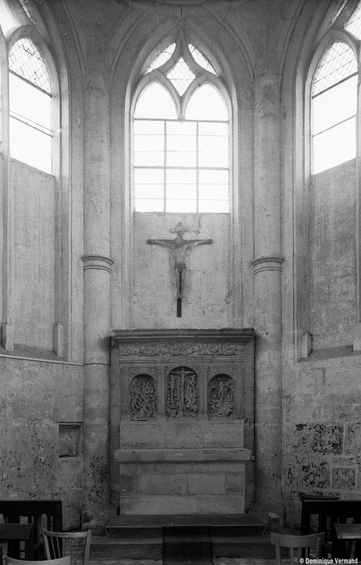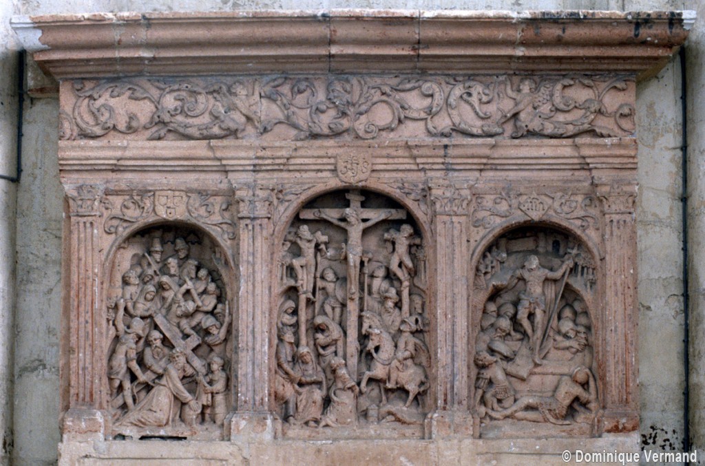 Ce morceau d’église abrite pourtant, comme à titre de compensation, un remarquable et imposant retable en pierre de la Renaissance. Sculpté vraisemblablement dans les années 1530 par un artiste qui avait le sens de la composition et de l’animation, il représente les scènes du Portement de Croix, de la Crucifixion et de la Résurrection. Des pilastres cannelés séparent les trois niches en plein cintre dans lesquelles s’inscrivent les scènes, remarquables par le fourmillement de personnages traités en haut relief et étagés sur plusieurs plans. La frise qui couronne l’ensemble paraît, dans l’état actuel, le résultat d’un remontage maladroit comme en témoignent les deux personnages issus des rinceaux, qui devaient plutôt encadrer un écusson (1996).