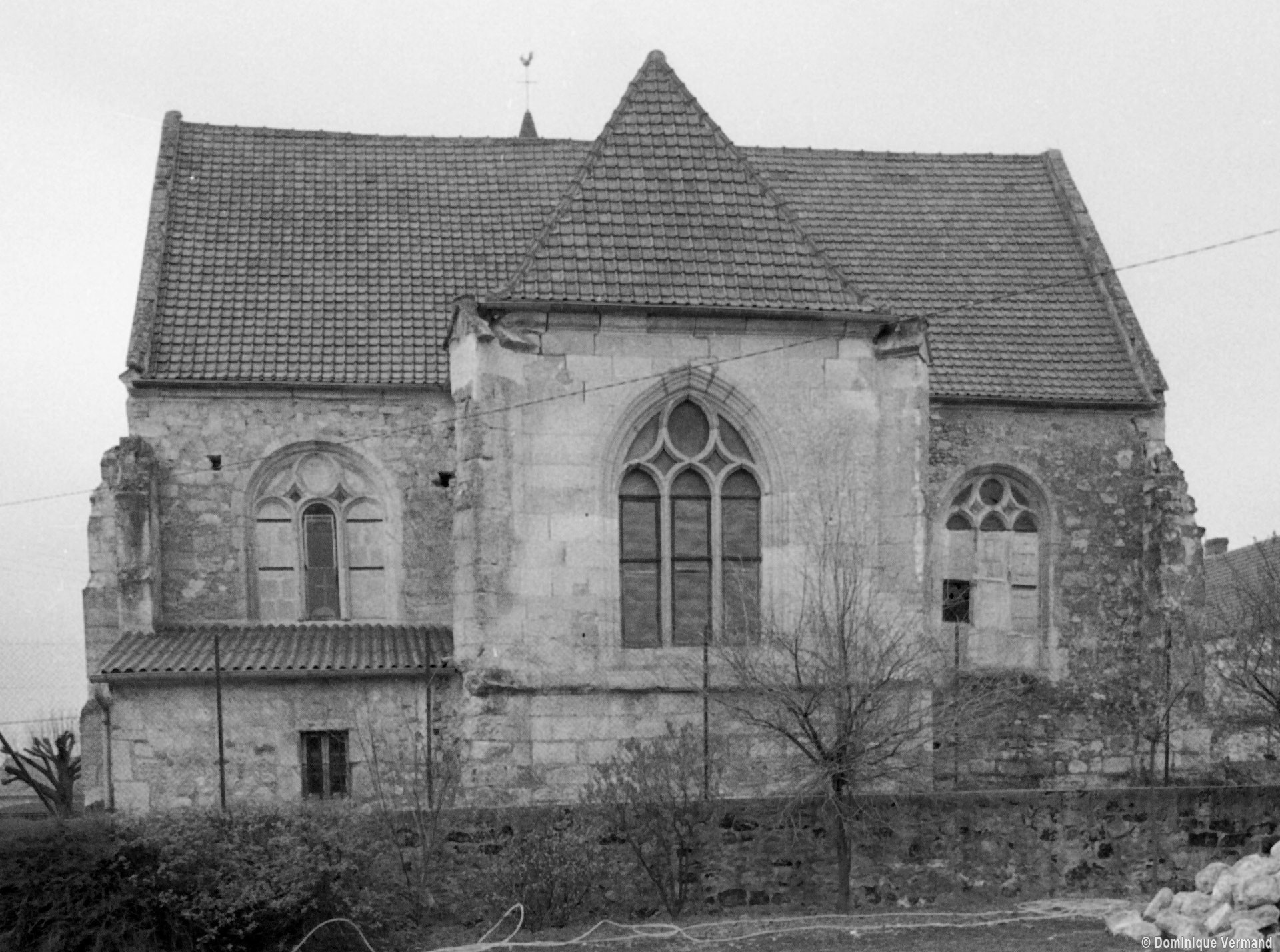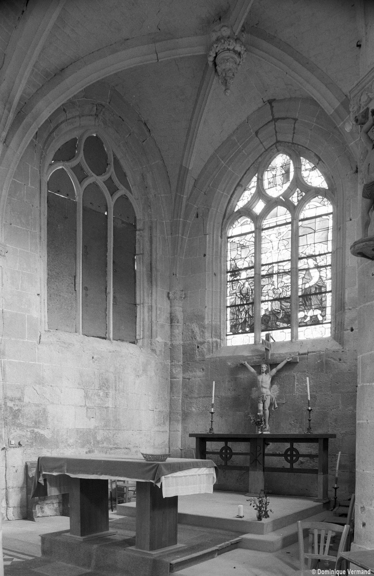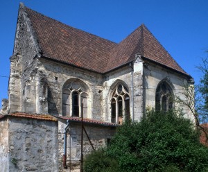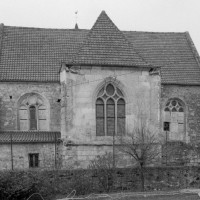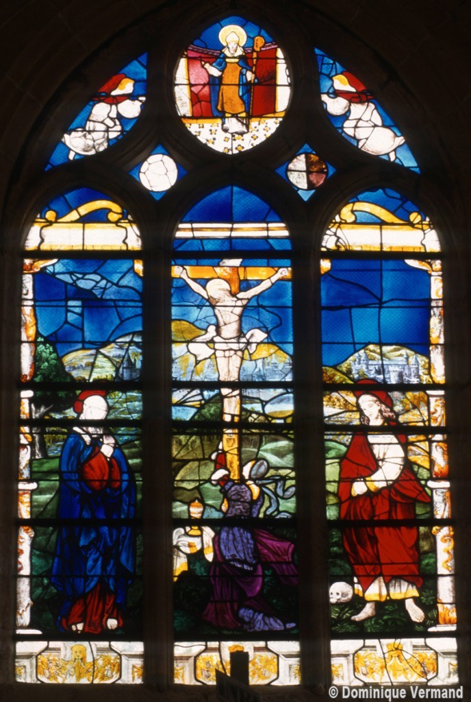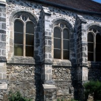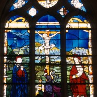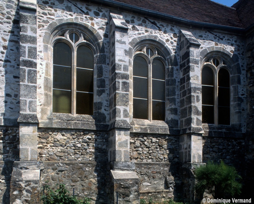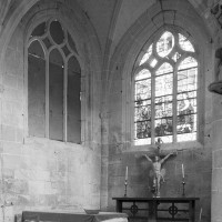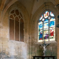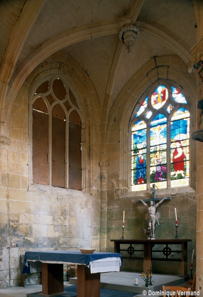 A l’extérieur, comme il est de règle, les deux travées du choeur sont couvertes d’une unique toiture et le mur pignon est épaulé par un puissant contrefort médian. Un fort beau vitrail représentant une Crucifixion a été remonté dans la fenêtre axiale du chœur (1997, modifié 2016).