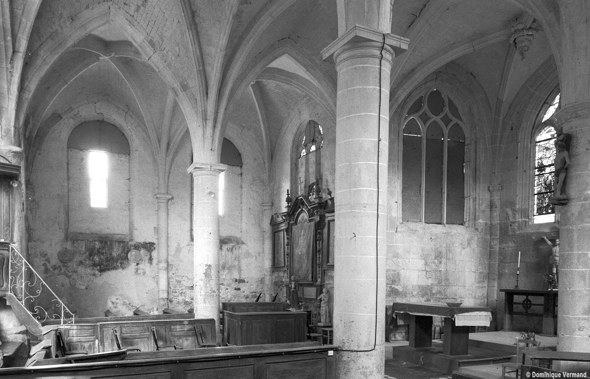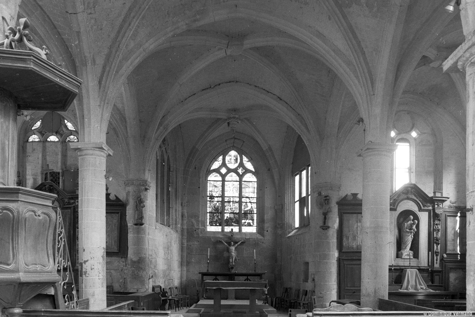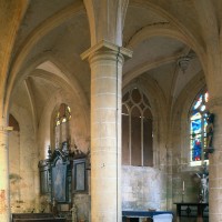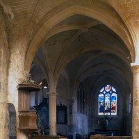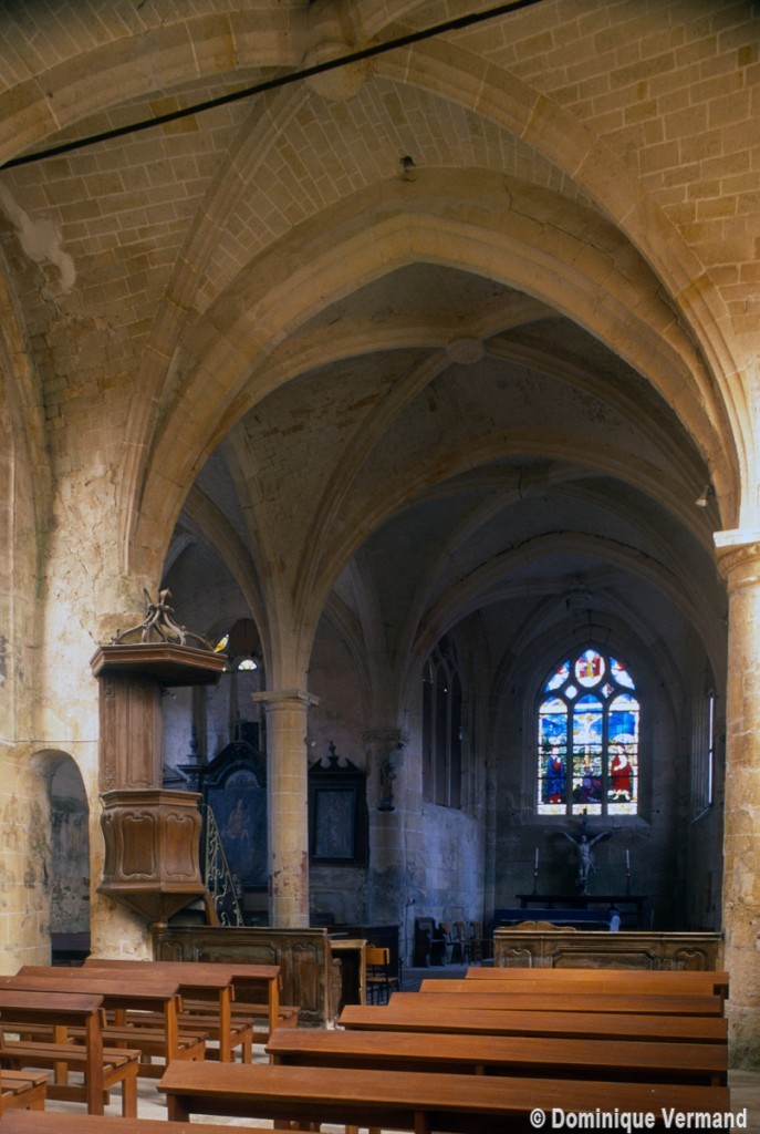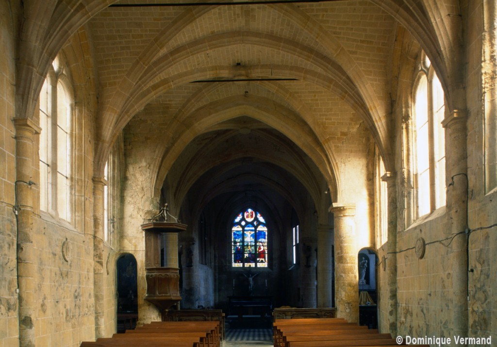 Par une disposition curieuse, la dernière travée de la nef ouvre sur les croisillons par deux petites arcades latérales, à l’image des passages dits “berrichons”, bien connus dans l’architecture romane. Les parties orientales comprennent deux travées et ses huit voûtes portées à la même hauteur retombent au centre sur deux piles circulaires selon le principe du choeur-halle, une formule répandue à cette époque dans la région et qui a le mérite de dégager largement l’espace. Les chapiteaux à tablette fortement débordante ou décorés d’une frise délicate (entrée du chœur) appartiennent bien à l’art de la Renaissance, comme la clef pendante de l’abside et le réseau des fenêtres.