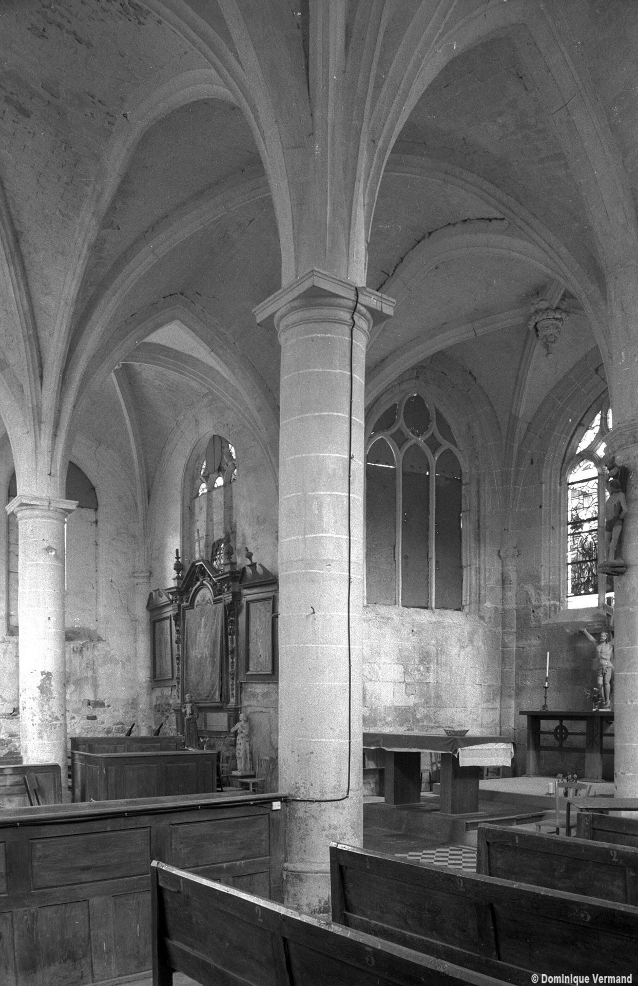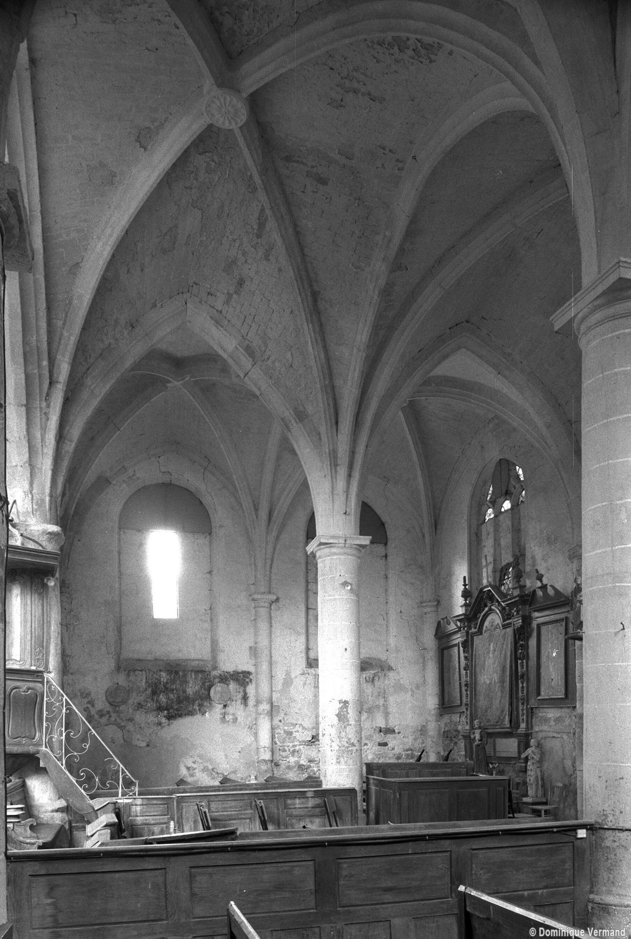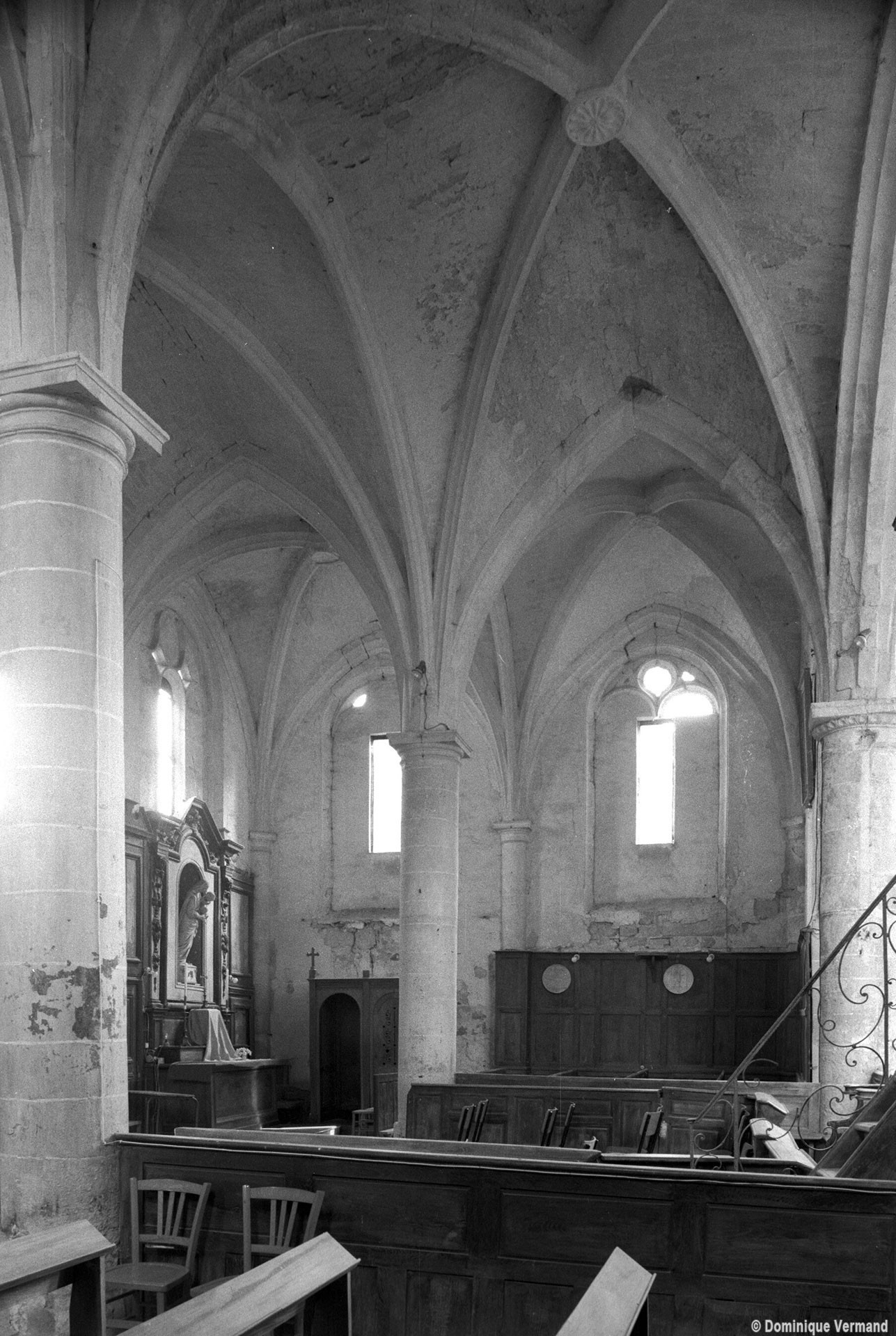 Par une disposition curieuse, la dernière travée de la nef ouvre sur les croisillons par deux petites arcades latérales, à l’image des passages dits “berrichons”, bien connus dans l’architecture romane. Les parties orientales comprennent deux travées et ses huit voûtes portées à la même hauteur retombent au centre sur deux piles circulaires selon le principe du choeur-halle, une formule répandue à cette époque dans la région et qui a le mérite de dégager largement l’espace. Les chapiteaux à tablette fortement débordante ou décorés d’une frise délicate (entrée du chœur) appartiennent bien à l’art de la Renaissance, comme la clef pendante de l’abside et le réseau des fenêtres.