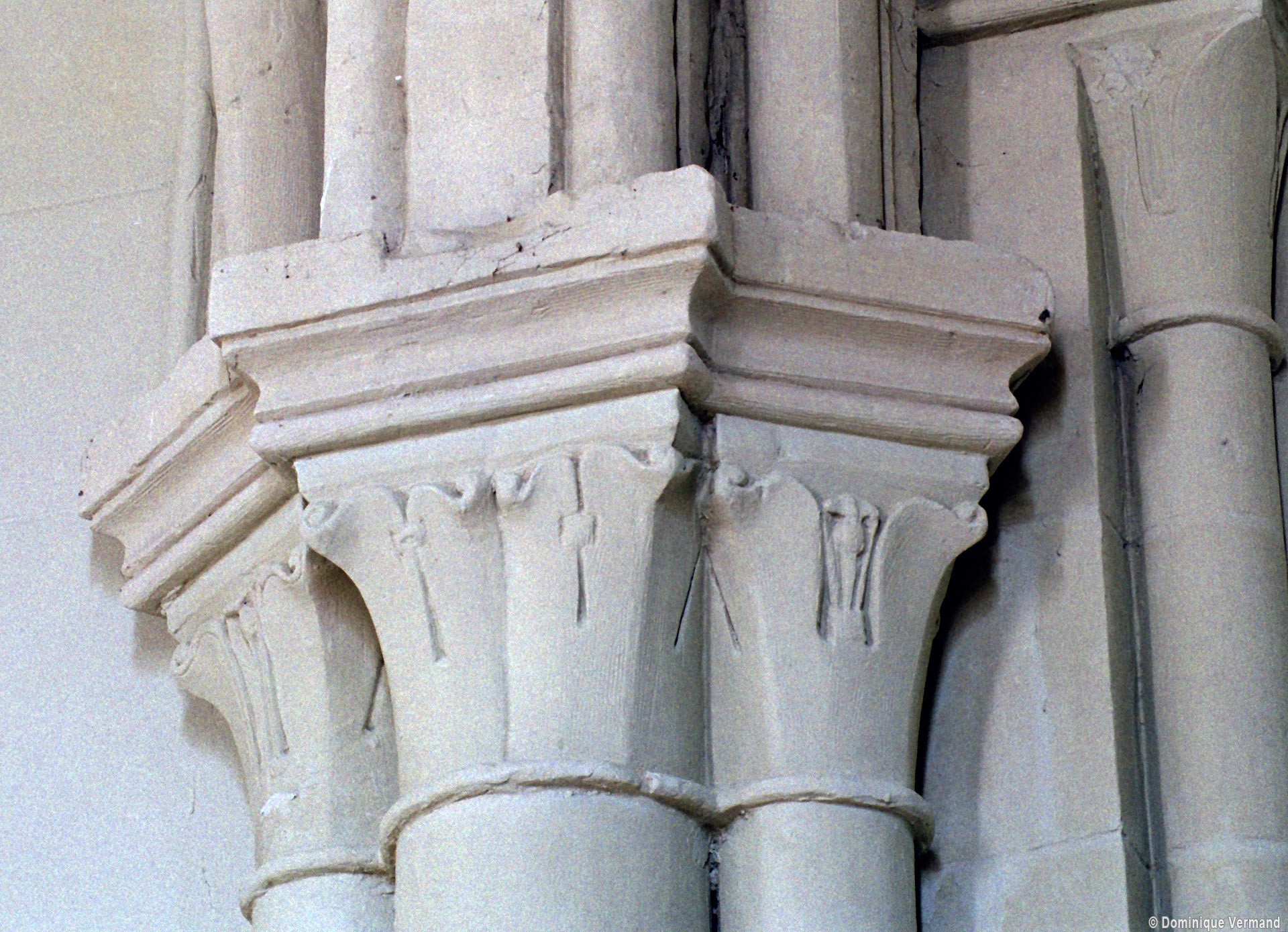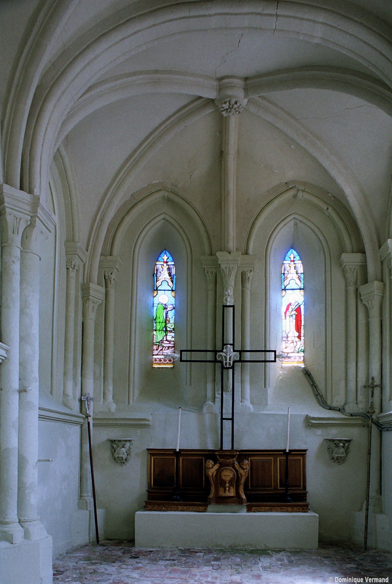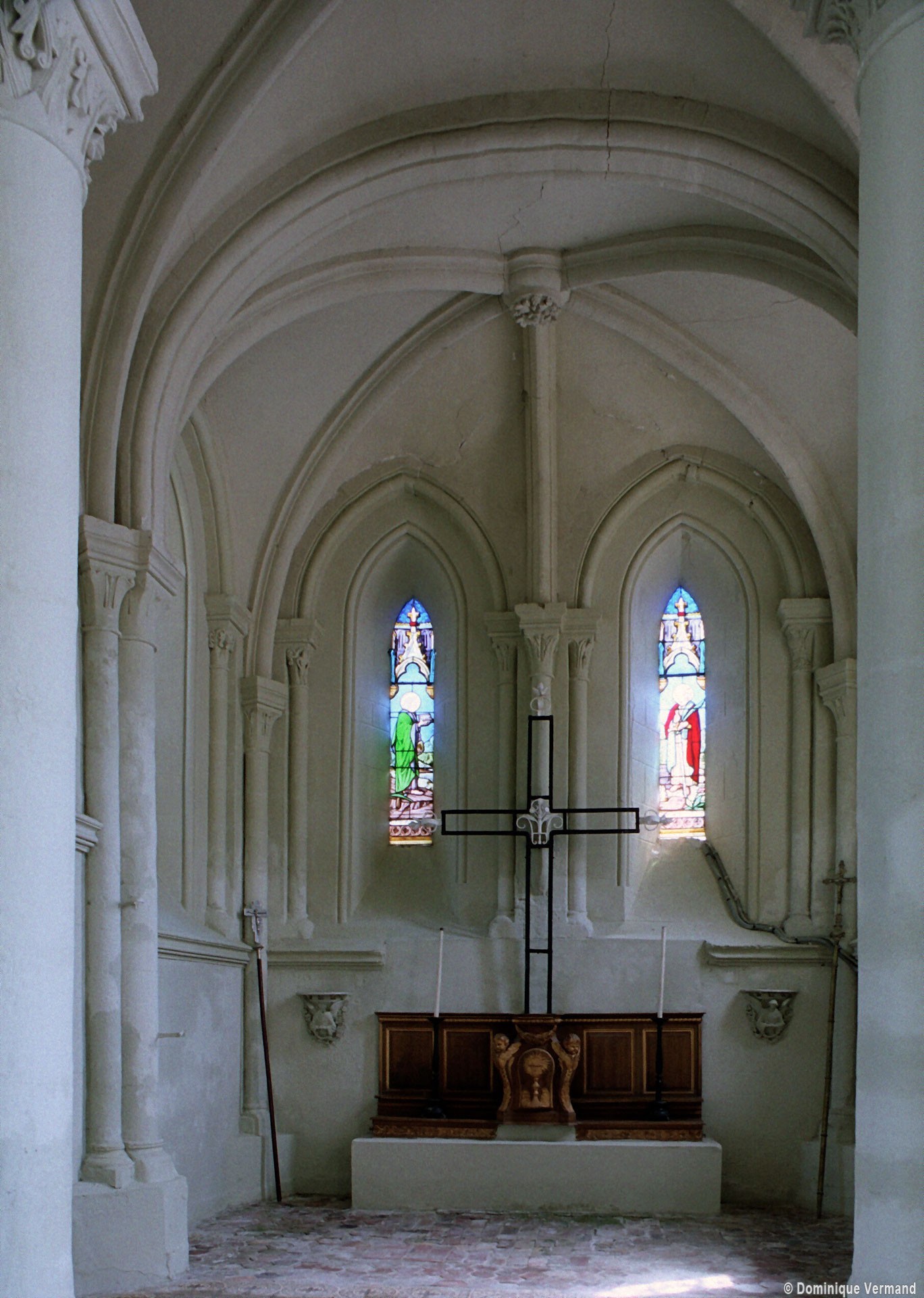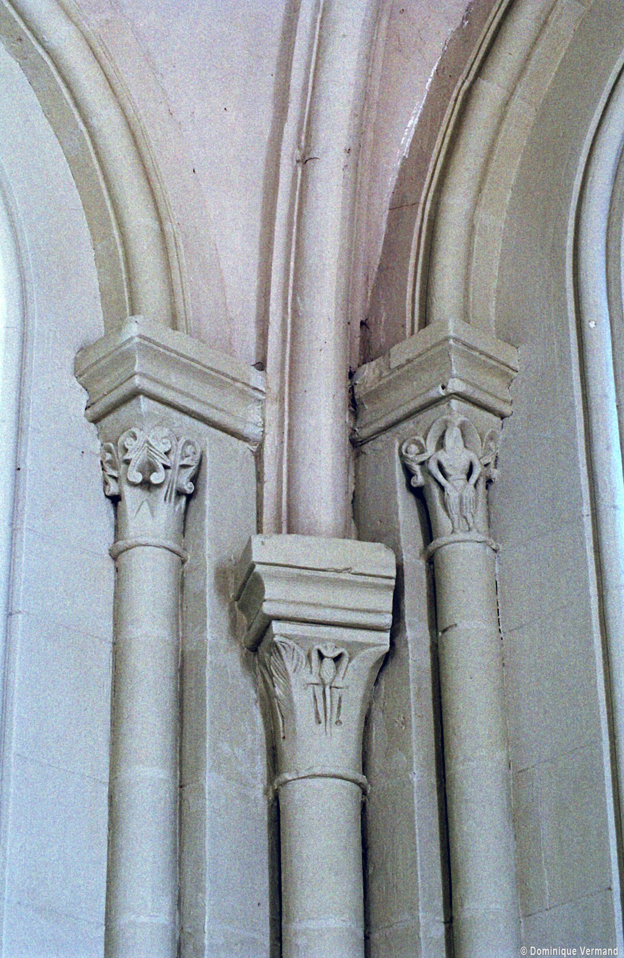 Le choeur, nettement plus large que la croisée avec laquelle il communique, est constitué de deux travées rectangulaires. La voûte de la seconde travée est dotée d’une nervure supplémentaire qui retombe entre les deux fenêtres du chevet. Il s’agit d’une disposition très originale très certainement reprise des chapelles de l’église abbatiale et qui se rencontre également, à la même époque, à Oudeuil. Les chapiteaux de cette partie orientale de l’église forment un ensemble tout à fait remarquable dont le décor est principalement constitué de feuilles découpées ou d’acanthe, deux thèmes alors très répandus. On y remarque également deux petits personnages sommairement traités. Malgré les lourdes restaurations opérées au 19ème siècle, tout cet ensemble sculpté est parfaitement authentique comme le prouve l’analyse minutieuse de la construction. A l’extérieur, le choeur frappe par la forme très aigüe des étroites fenêtres, autre influence de l’architecture cistercienne.