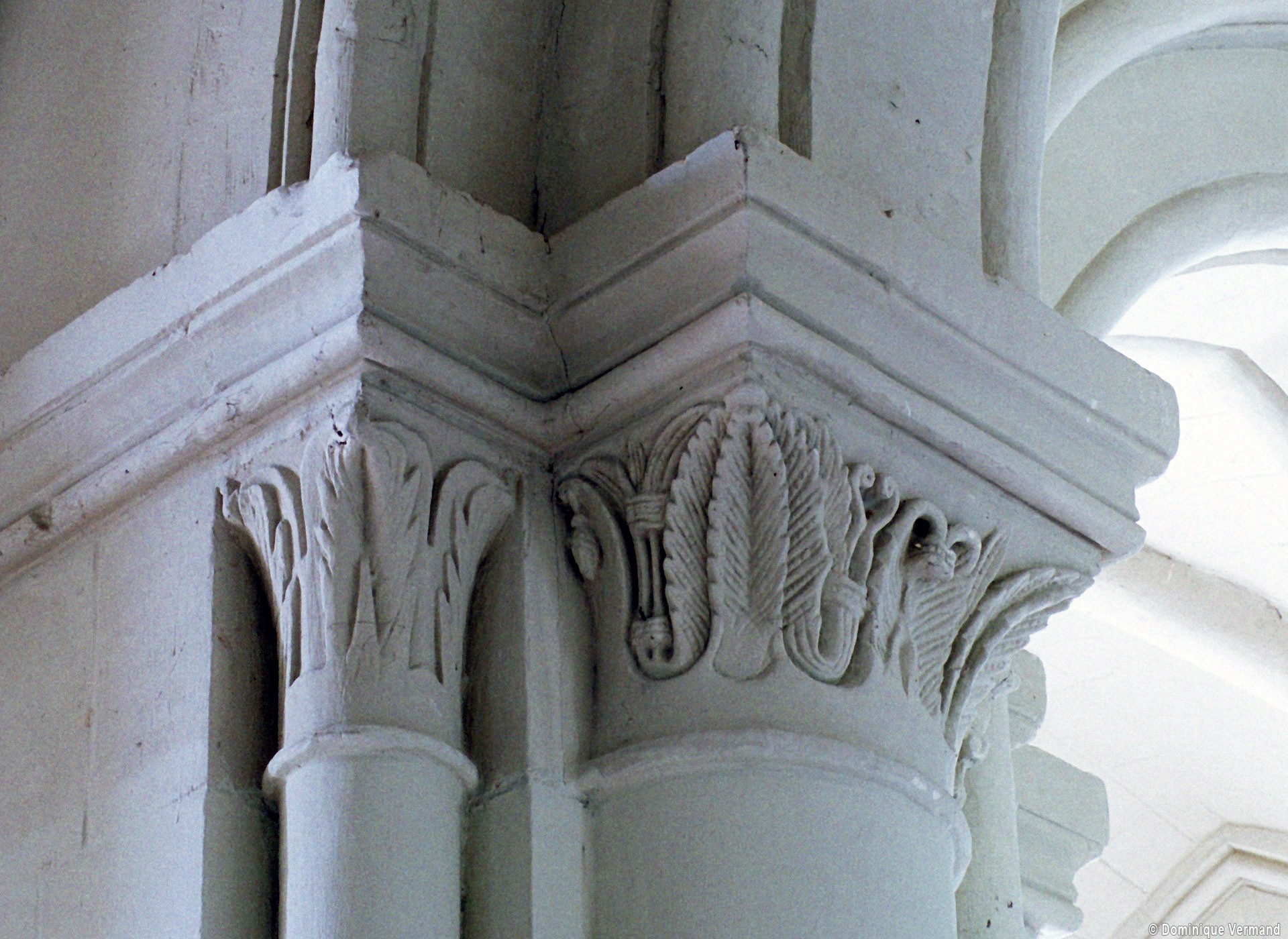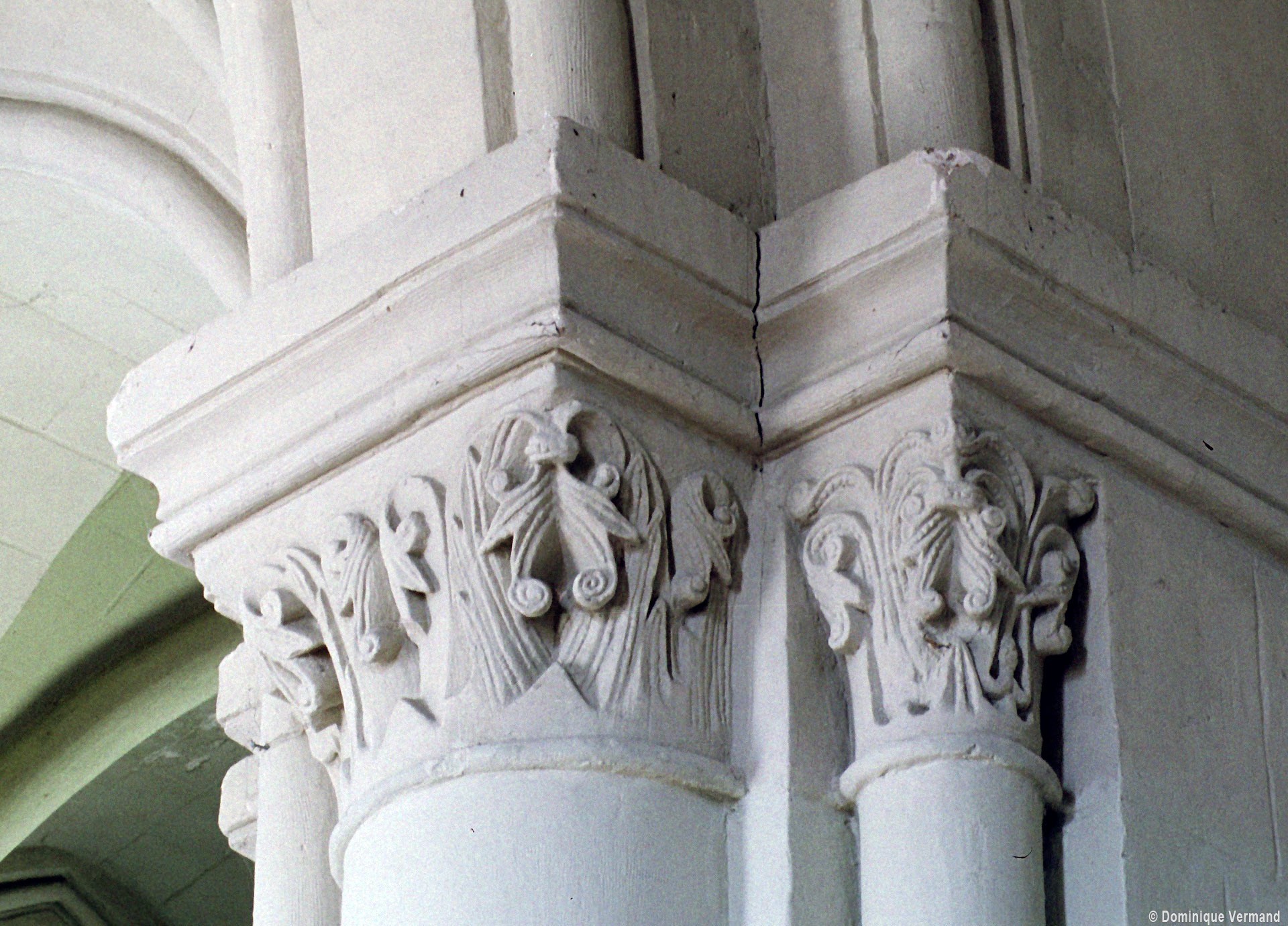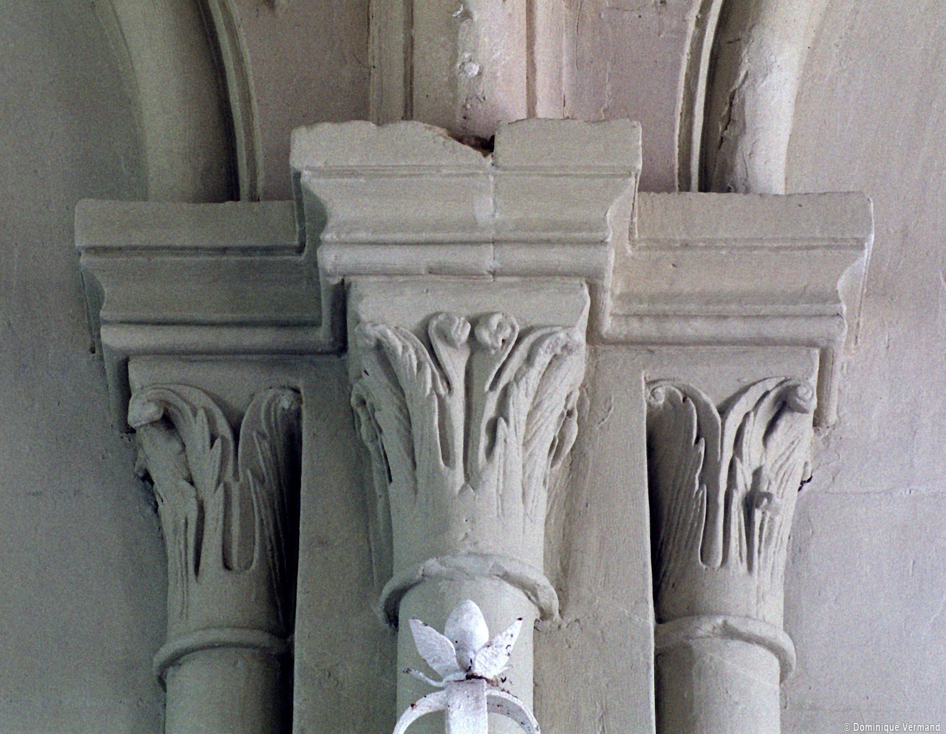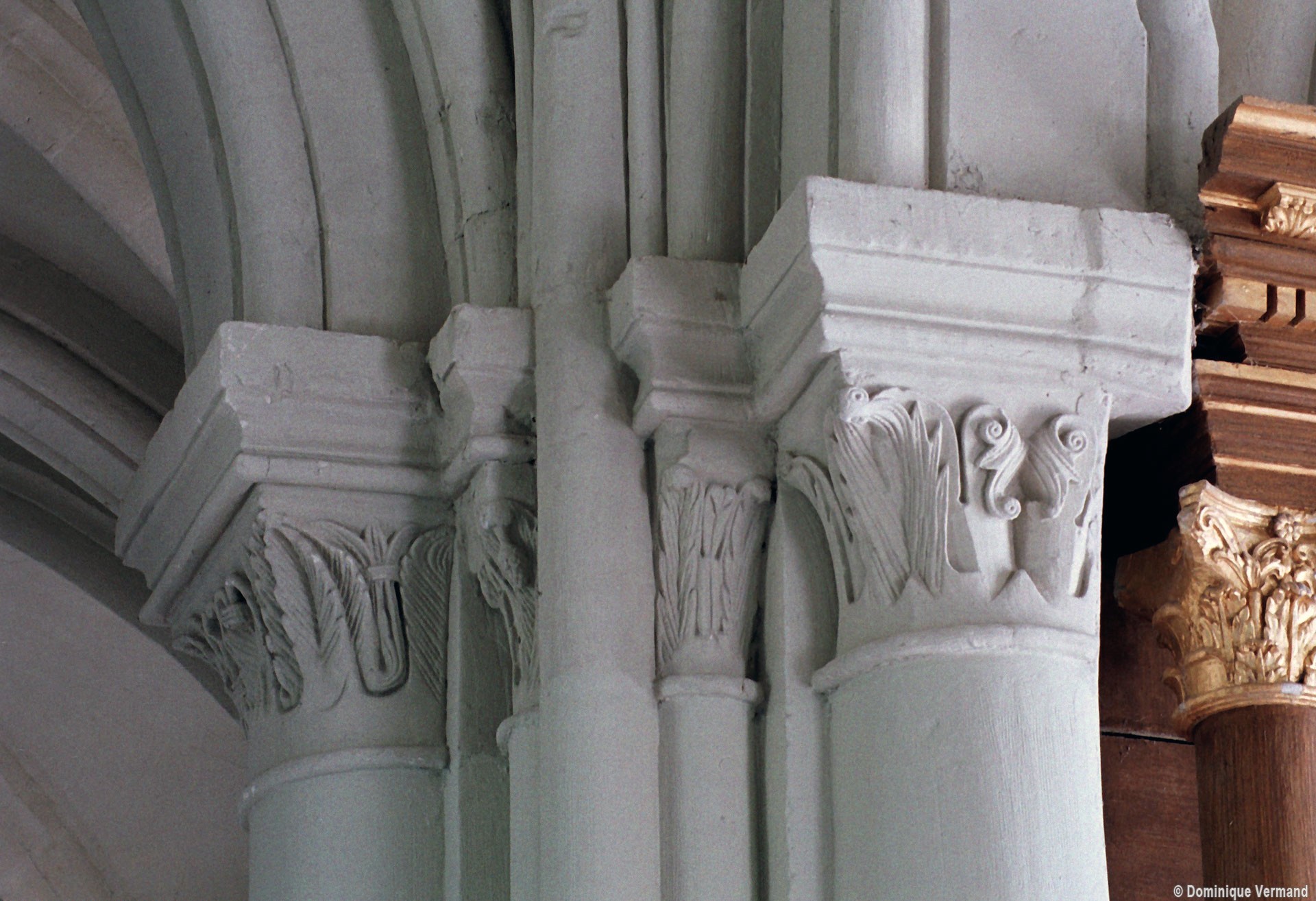 Le choeur, nettement plus large que la croisée avec laquelle il communique, est constitué de deux travées rectangulaires. La voûte de la seconde travée est dotée d’une nervure supplémentaire qui retombe entre les deux fenêtres du chevet. Il s’agit d’une disposition très originale très certainement reprise des chapelles de l’église abbatiale et qui se rencontre également, à la même époque, à Oudeuil. Les chapiteaux de cette partie orientale de l’église forment un ensemble tout à fait remarquable dont le décor est principalement constitué de feuilles découpées ou d’acanthe, deux thèmes alors très répandus. On y remarque également deux petits personnages sommairement traités. Malgré les lourdes restaurations opérées au 19ème siècle, tout cet ensemble sculpté est parfaitement authentique comme le prouve l’analyse minutieuse de la construction. A l’extérieur, le choeur frappe par la forme très aigüe des étroites fenêtres, autre influence de l’architecture cistercienne.