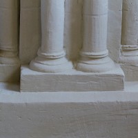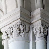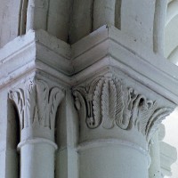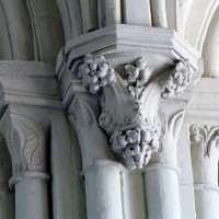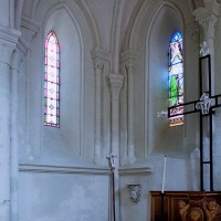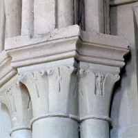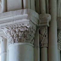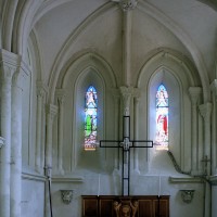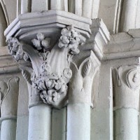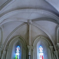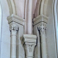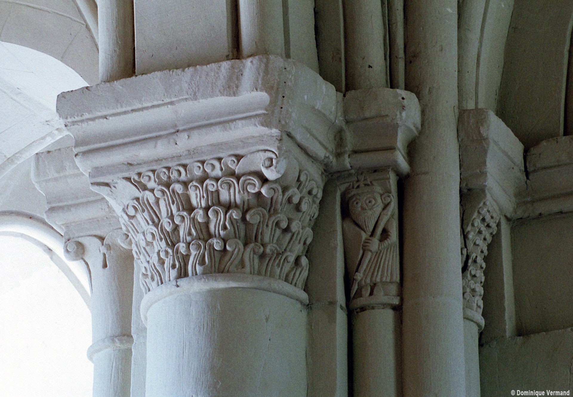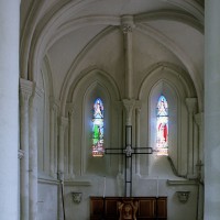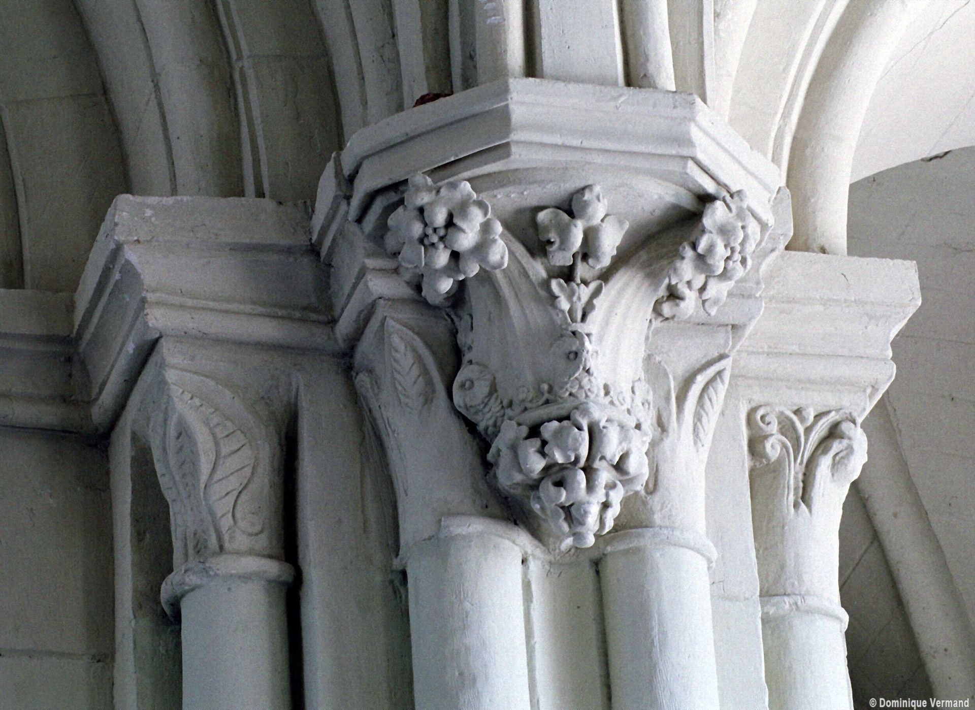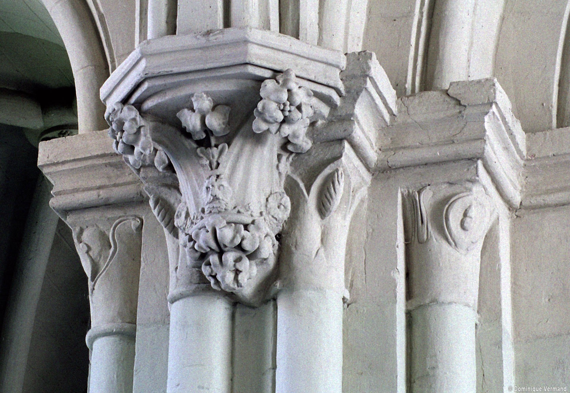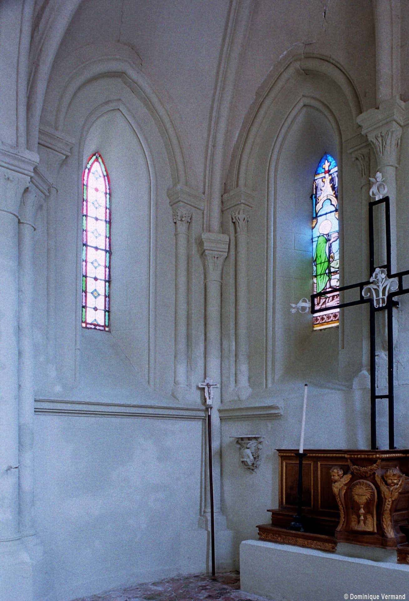 Le choeur, nettement plus large que la croisée avec laquelle il communique, est constitué de deux travées rectangulaires. La voûte de la seconde travée est dotée d’une nervure supplémentaire qui retombe entre les deux fenêtres du chevet. Il s’agit d’une disposition très originale très certainement reprise des chapelles de l’église abbatiale et qui se rencontre également, à la même époque, à Oudeuil. Les chapiteaux de cette partie orientale de l’église forment un ensemble tout à fait remarquable dont le décor est principalement constitué de feuilles découpées ou d’acanthe, deux thèmes alors très répandus. On y remarque également deux petits personnages sommairement traités. Malgré les lourdes restaurations opérées au 19ème siècle, tout cet ensemble sculpté est parfaitement authentique comme le prouve l’analyse minutieuse de la construction. A l’extérieur, le choeur frappe par la forme très aigüe des étroites fenêtres, autre influence de l’architecture cistercienne.