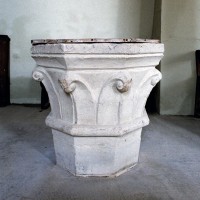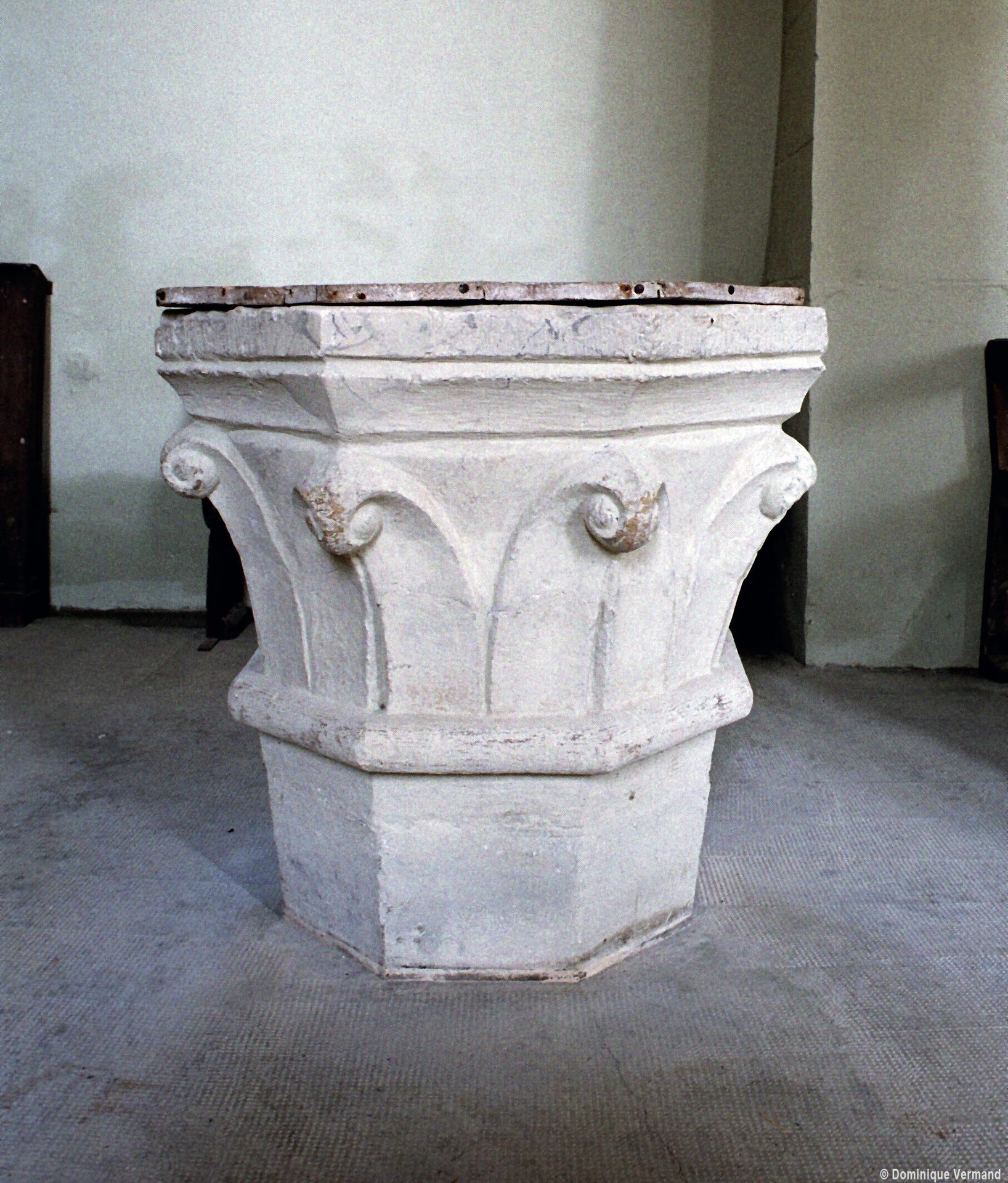 Remontant au début du 13ème siècle, la cuve baptismale de forme hexagonale revêt la forme d’un gros chapiteau à crochets et il faut peut-être y voir un élément sculpté provenant de l’abbaye de Lannoy (2007).