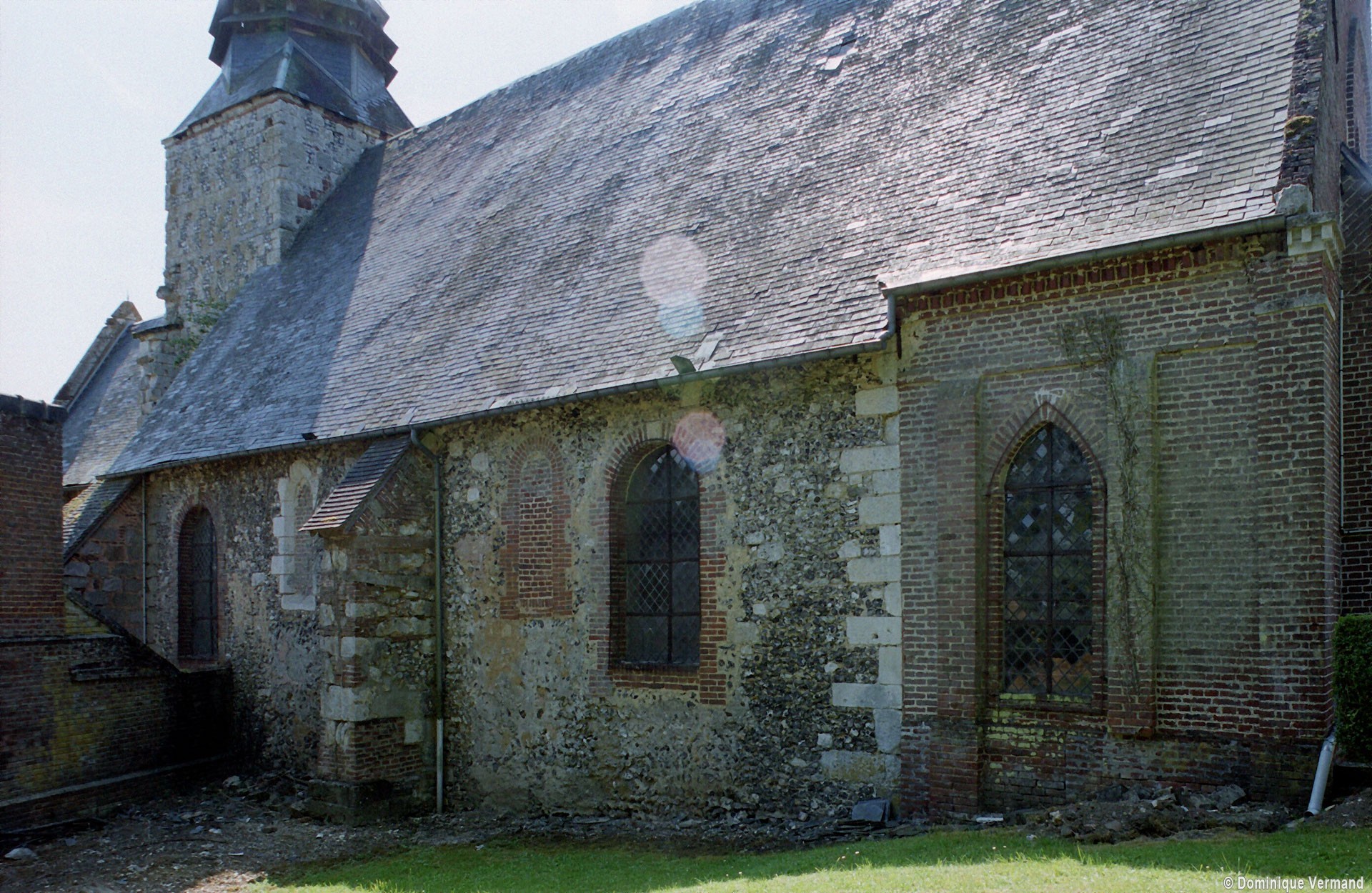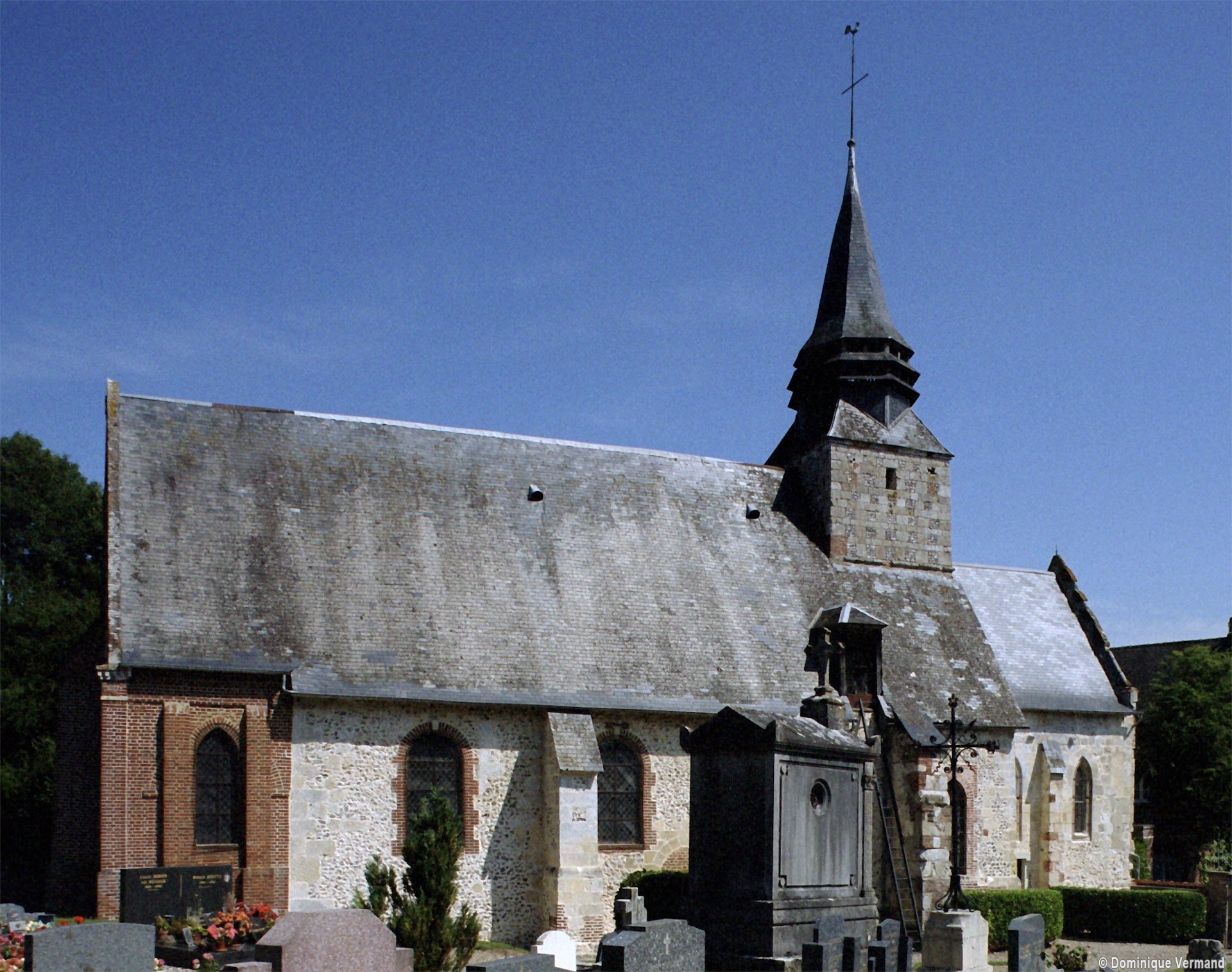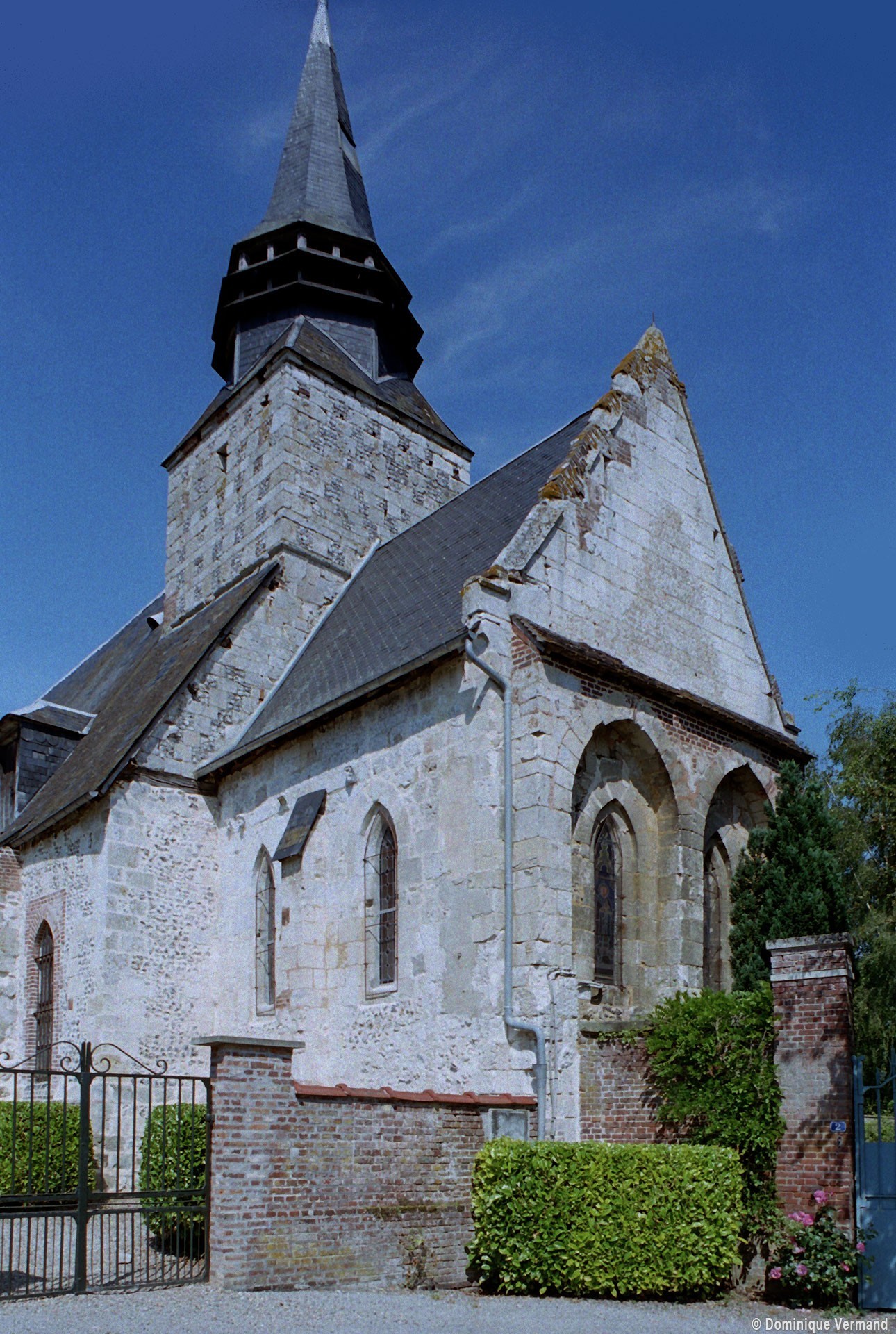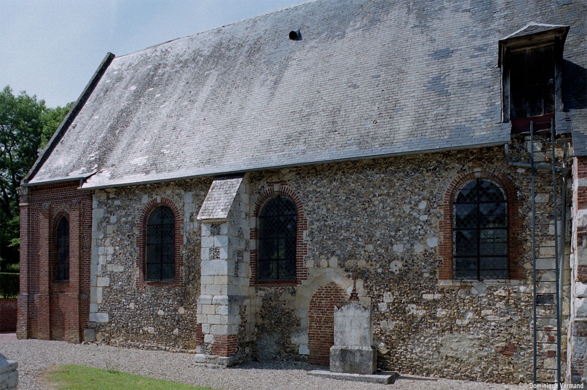 Construite en silex et portant les traces de nombreuses modifications, la nef est la partie la plus ancienne et peut remonter au 11ème siècle. Peu après le milieu du 12ème siècle, l’église est dotée d’un nouvel ensemble oriental, entièrement voûté d’ogives. L’extrémité de la nef est alors transformée en un transept constitué d’une croisée et deux bras non débordants puisque inclus dans le périmètre de la nef. Les voûtes du bras nord et de la croisée ont été refaites au 19ème siècle. L’importance des piles comme l’épaisseur des arcades constituant cette croisée montrent qu’une tour, formant peut-être lanterne, existait à l’origine. Construit en damier de pierre et de silex et dépourvu de baies, le clocher actuel est une reconstruction tardive.