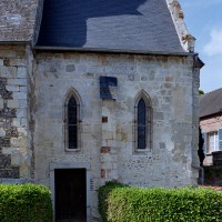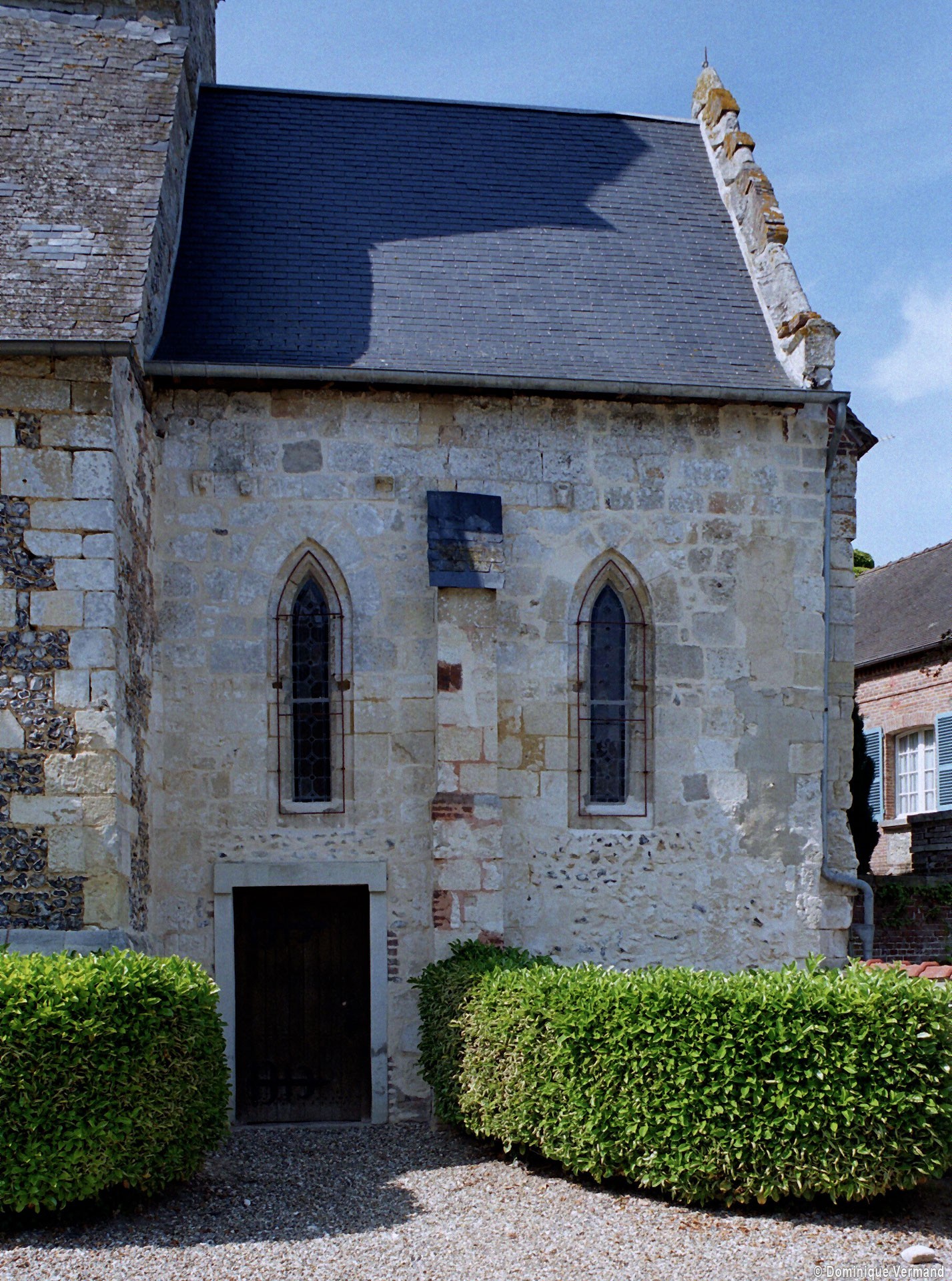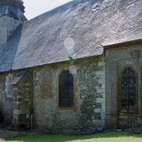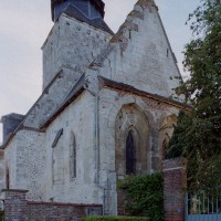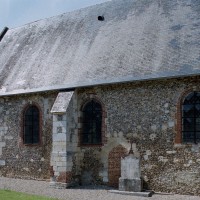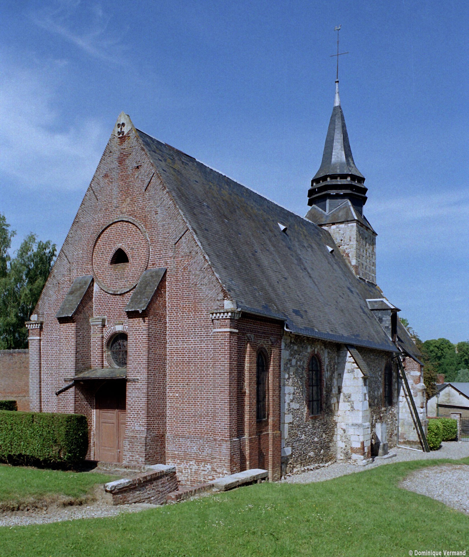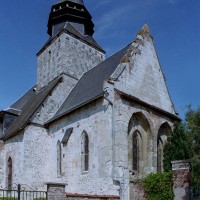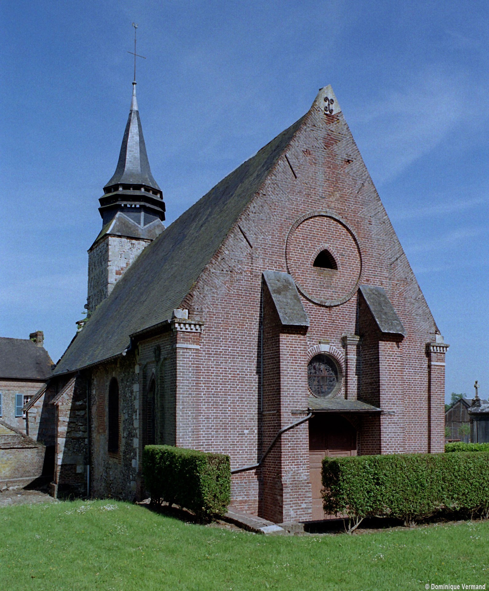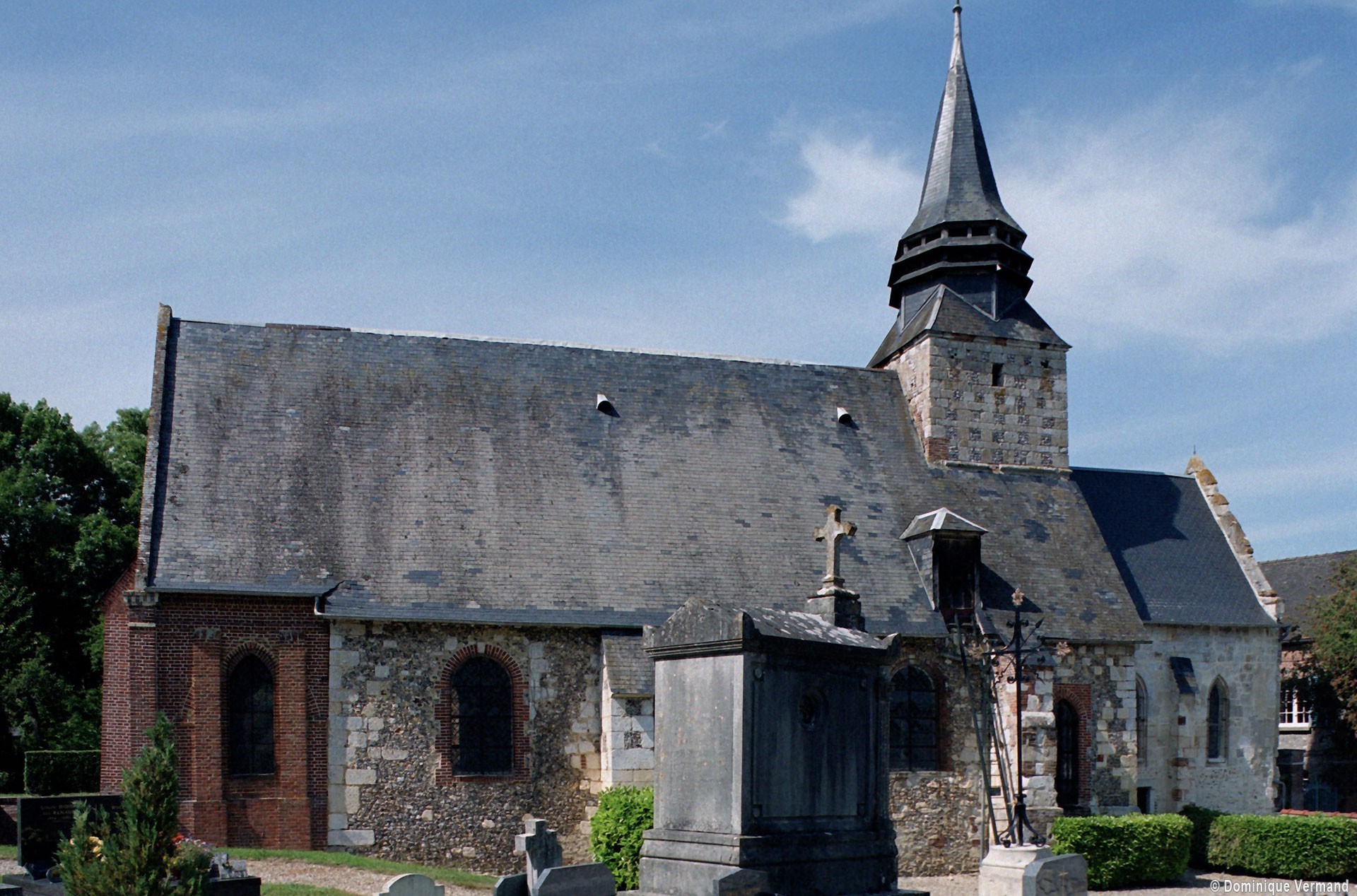Construite en silex et portant les traces de nombreuses modifications, la nef est la partie la plus ancienne et peut remonter au 11ème siècle. Peu après le milieu du 12ème siècle, l’église est dotée d’un nouvel ensemble oriental, entièrement voûté d’ogives. L’extrémité de la nef est alors transformée en un transept constitué d’une croisée et deux bras non débordants puisque inclus dans le périmètre de la nef. Les voûtes du bras nord et de la croisée ont été refaites au 19ème siècle. L’importance des piles comme l’épaisseur des arcades constituant cette croisée montrent qu’une tour, formant peut-être lanterne, existait à l’origine. Construit en damier de pierre et de silex et dépourvu de baies, le clocher actuel est une reconstruction tardive.