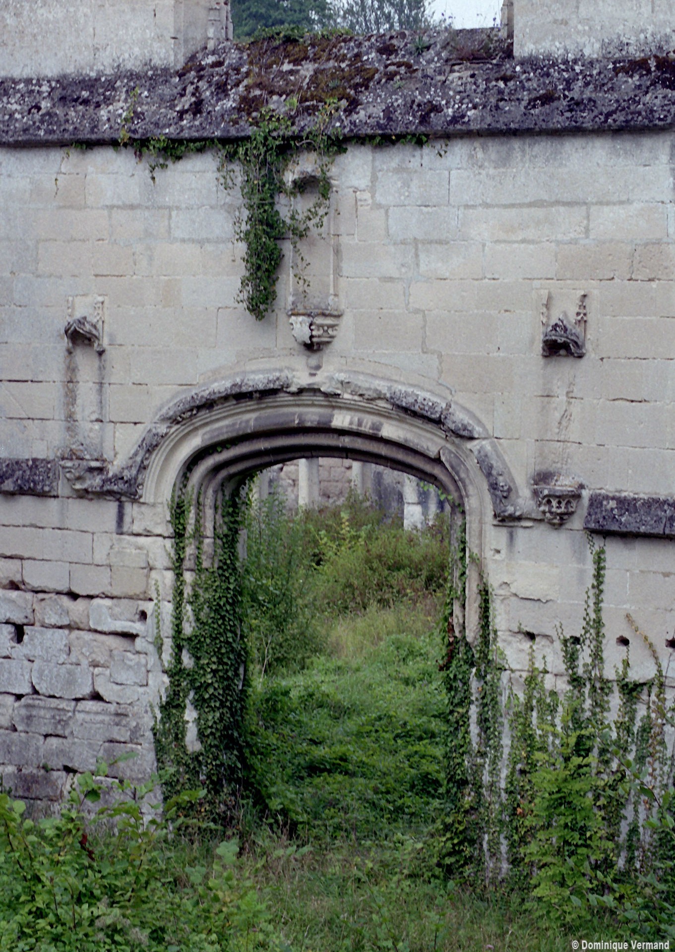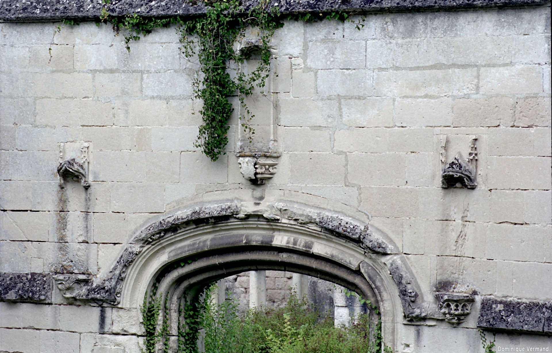 Mieux conservée, la façade est percée d’un portail en anse de panier accompagné de trois petites niches avec dais qui contenaient autrefois des statues. Au-dessus, la grande fenêtre qui s’ouvre dans le mur pignon très aigu a perdu son remplage. Dans le prolongement du mur gouttereau sud de la nef, mais se raccordant mal à celui-ci, une tourelle d’escalier accompagne un mur percé d’une fenêtre au remplage presque totalement disparu mais de style nettement flamboyant, vestiges d’un croisillon ou d’une chapelle.