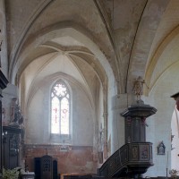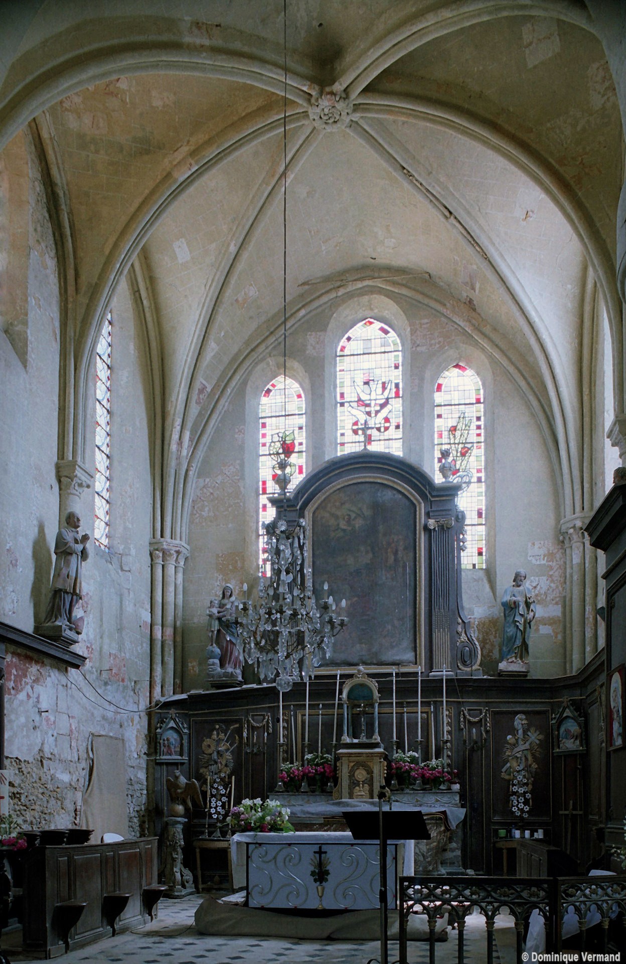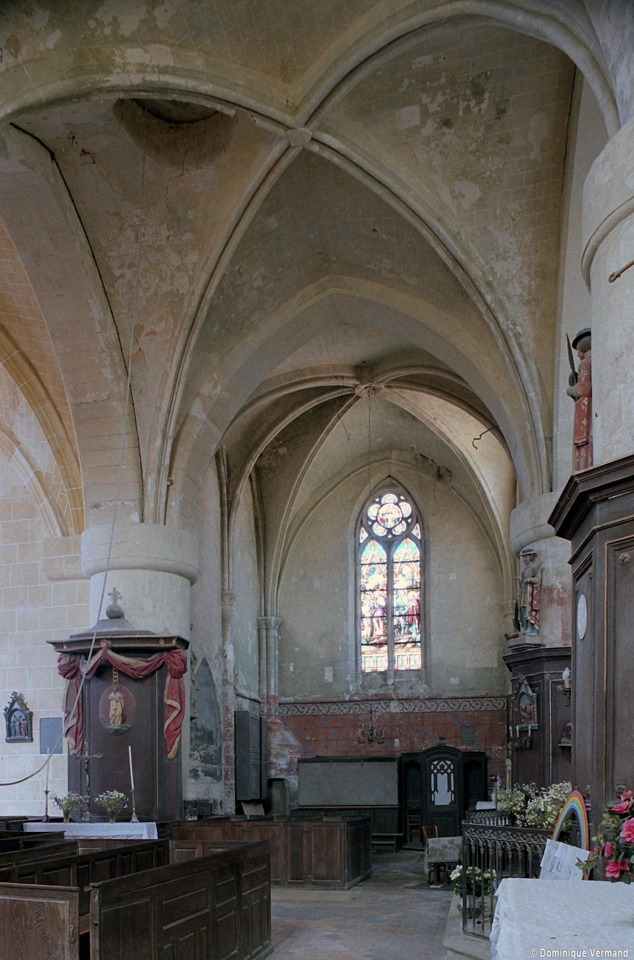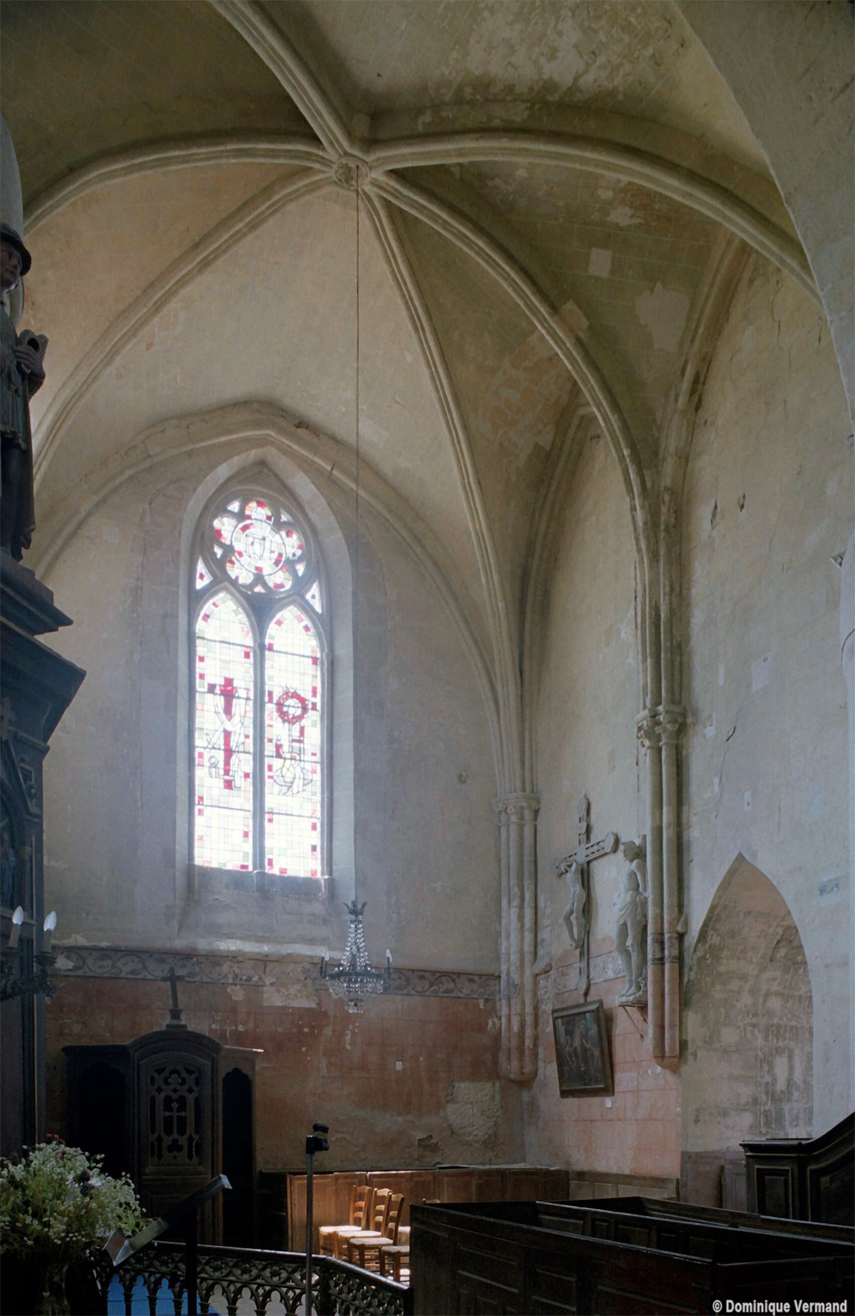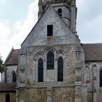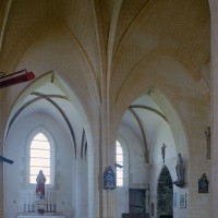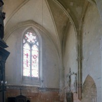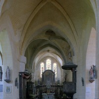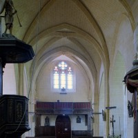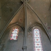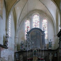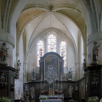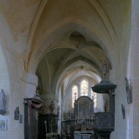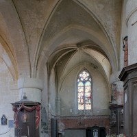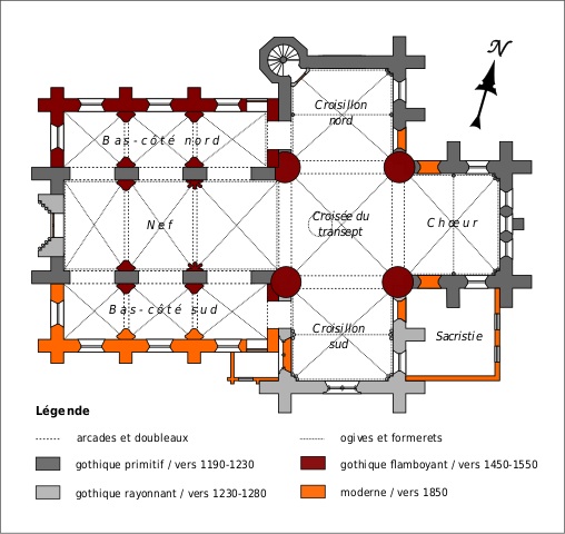 Les parties les plus anciennes identifiables avec certitude sont le chœur et les deux croisillons. Tous trois de plan carré, ils présentent la particularité d’être couverts de voûtes sexpartites, c’est-à-dire avec une ogive supplémentaire qui détermine six compartiments. Les ogives, profilées d’une arête entre deux tores, et les formerets sont reçus sur des chapiteaux décorés de feuilles découpées ou de petits crochets.