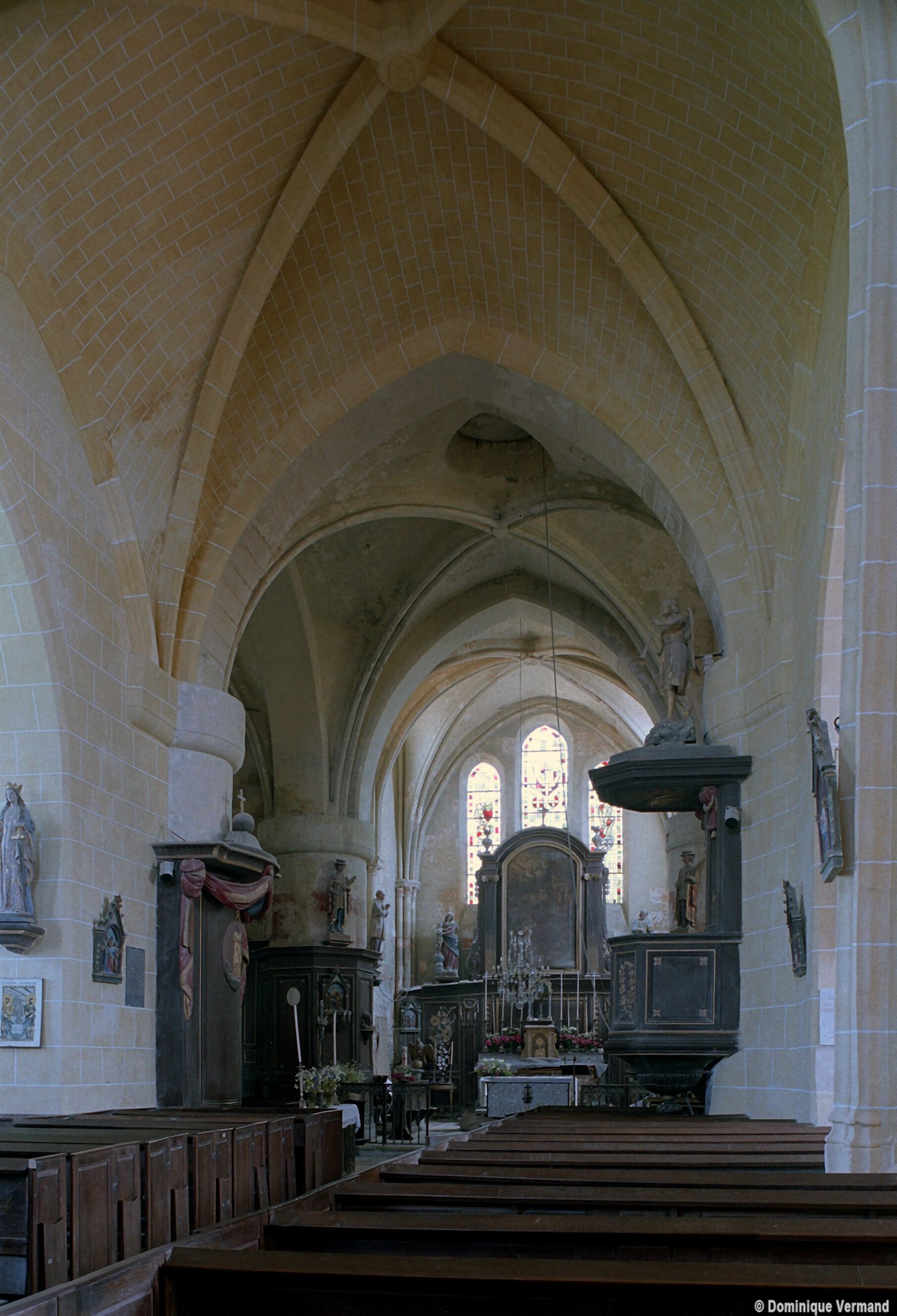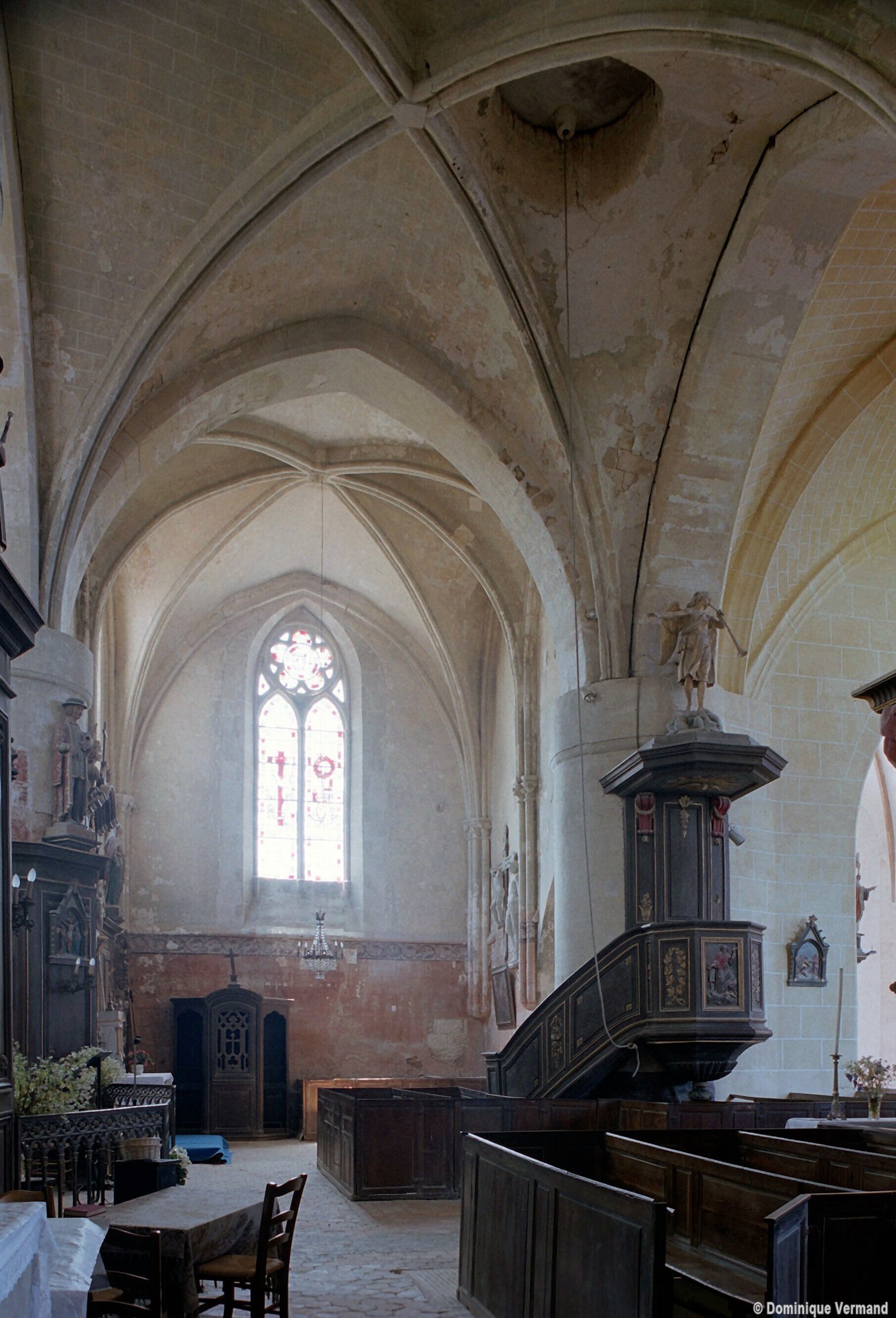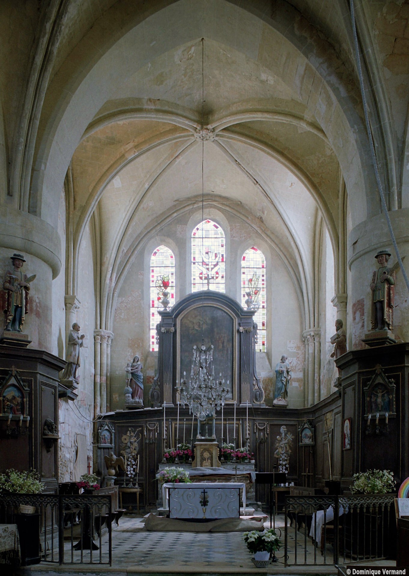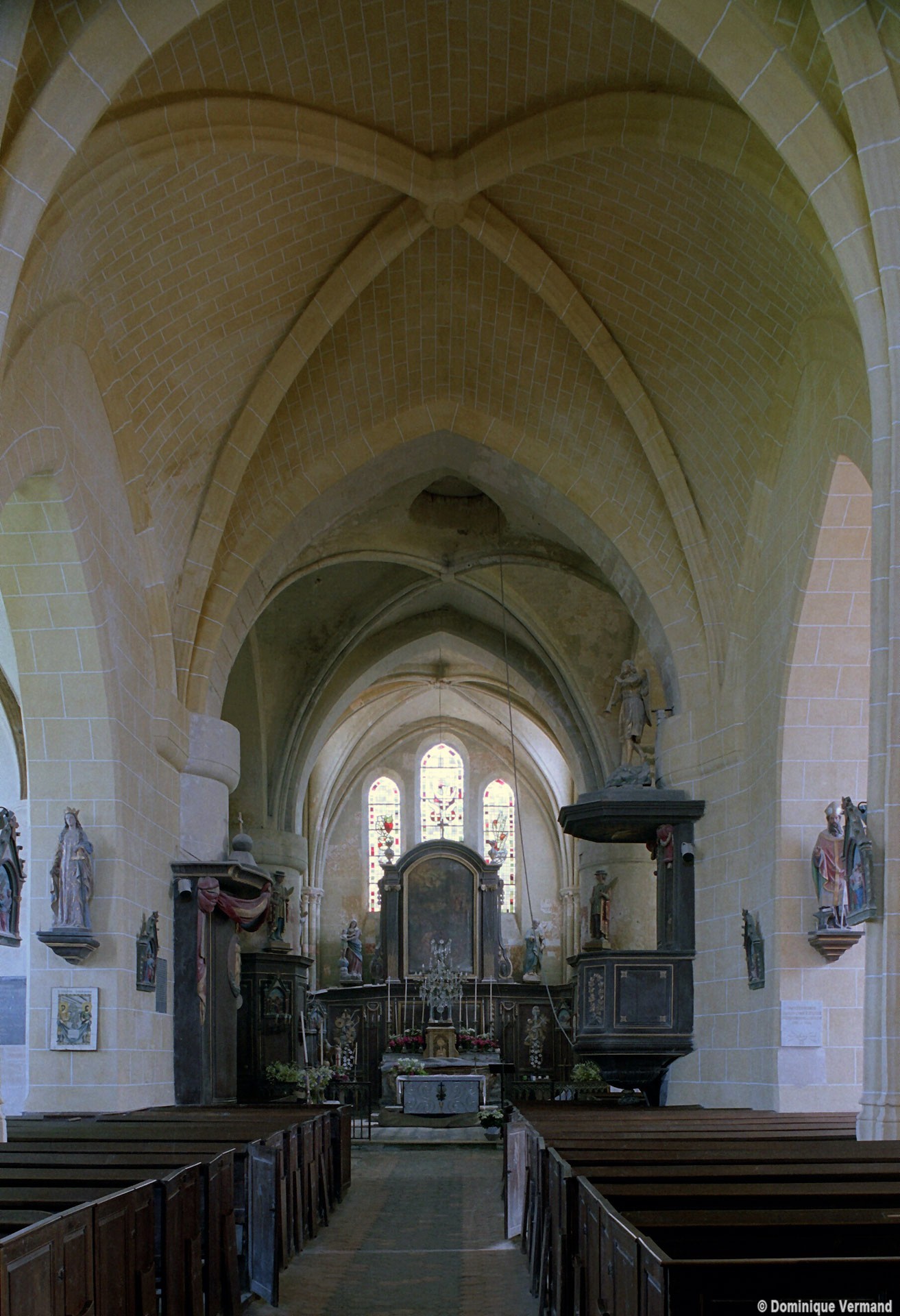 Les parties les plus anciennes identifiables avec certitude sont le chœur et les deux croisillons. Tous trois de plan carré, ils présentent la particularité d’être couverts de voûtes sexpartites, c’est-à-dire avec une ogive supplémentaire qui détermine six compartiments. Les ogives, profilées d’une arête entre deux tores, et les formerets sont reçus sur des chapiteaux décorés de feuilles découpées ou de petits crochets.