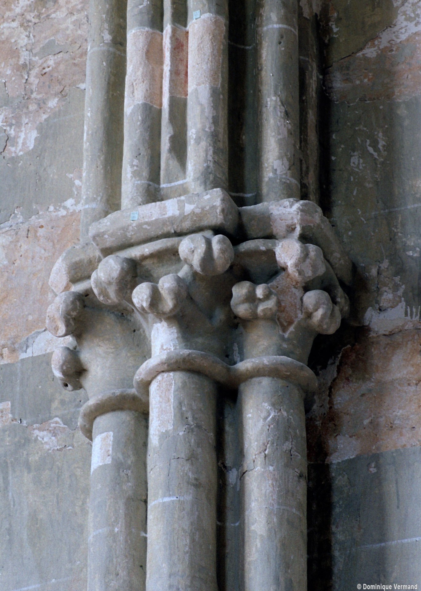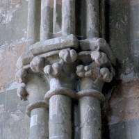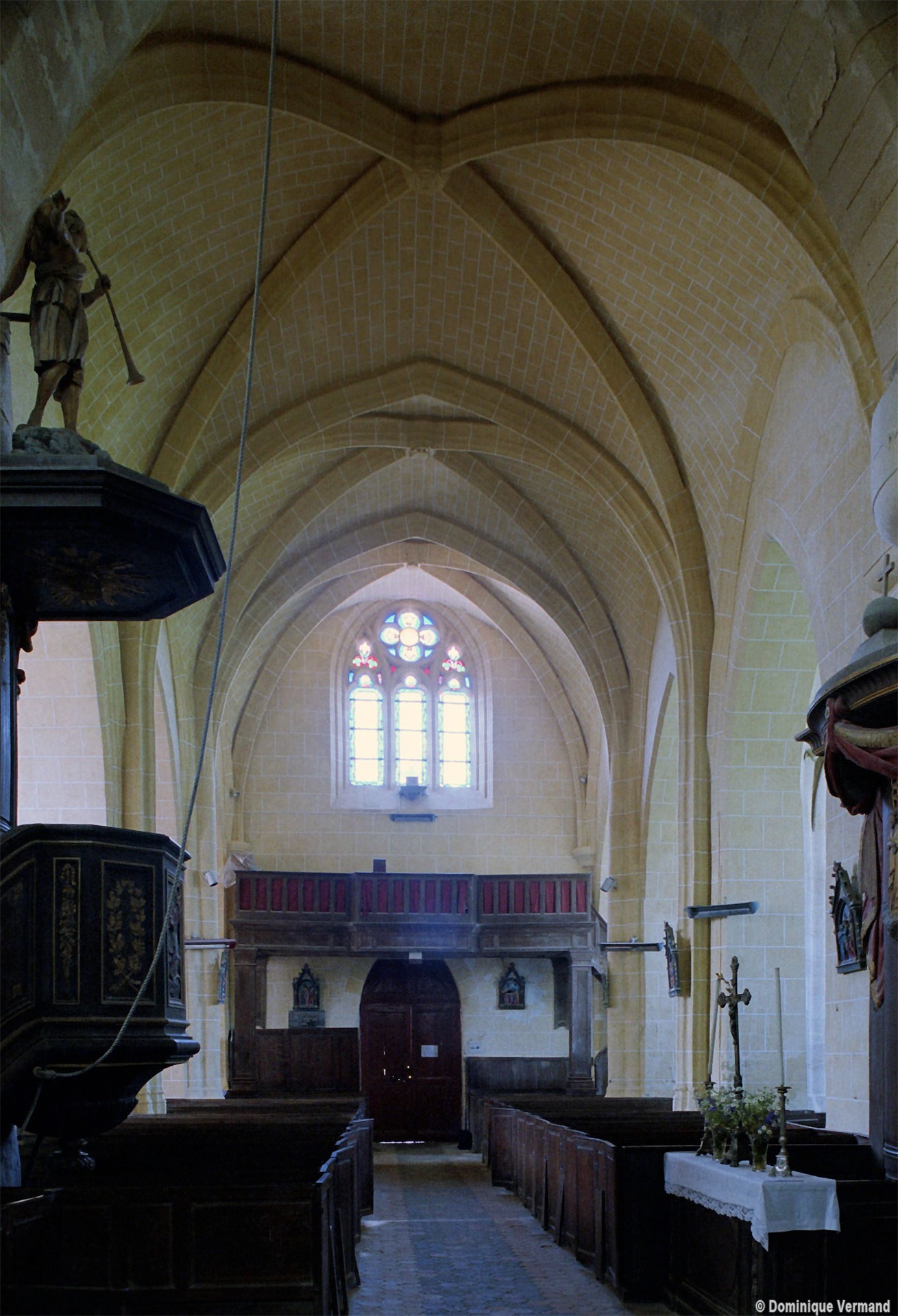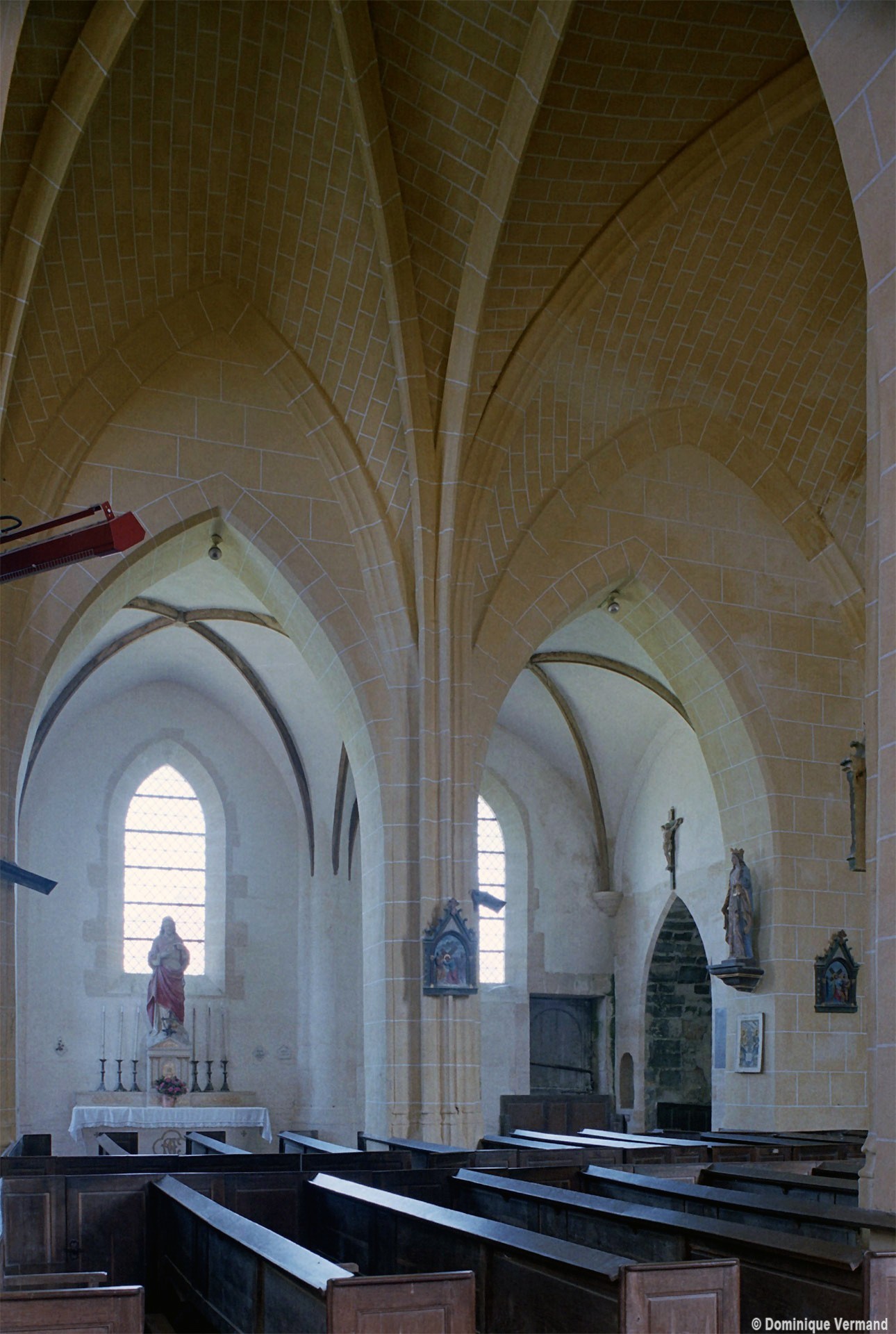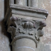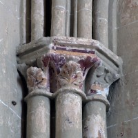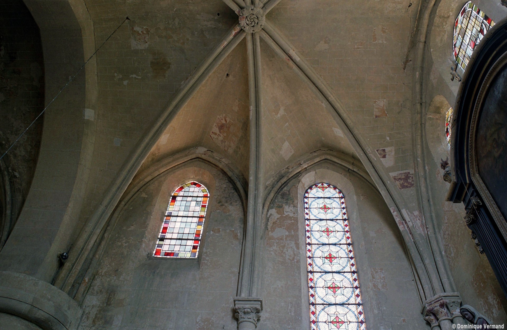 Les parties les plus anciennes identifiables avec certitude sont le chœur et les deux croisillons. Tous trois de plan carré, ils présentent la particularité d’être couverts de voûtes sexpartites, c’est-à-dire avec une ogive supplémentaire qui détermine six compartiments. Les ogives, profilées d’une arête entre deux tores, et les formerets sont reçus sur des chapiteaux décorés de feuilles découpées ou de petits crochets.