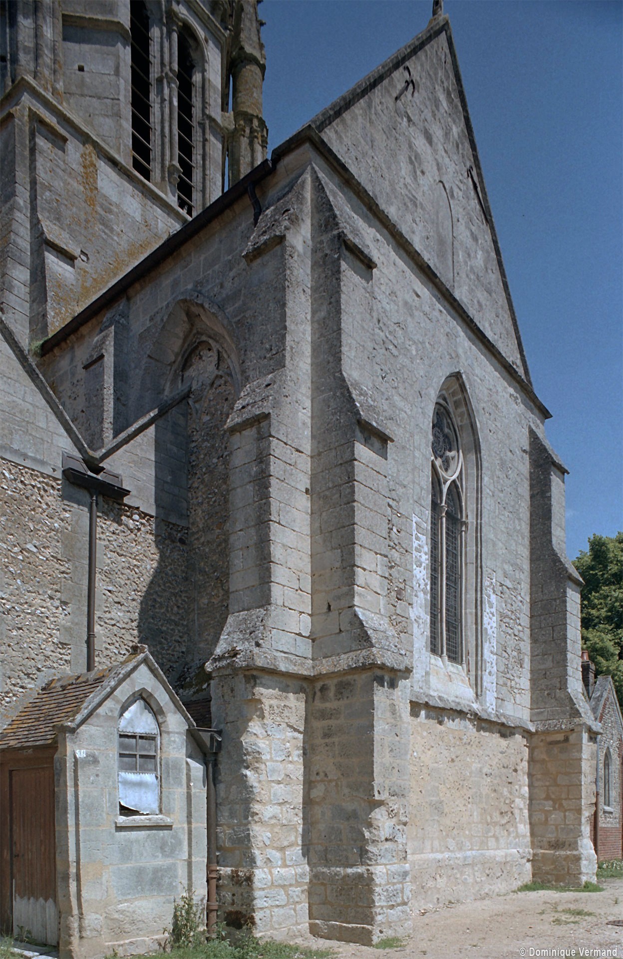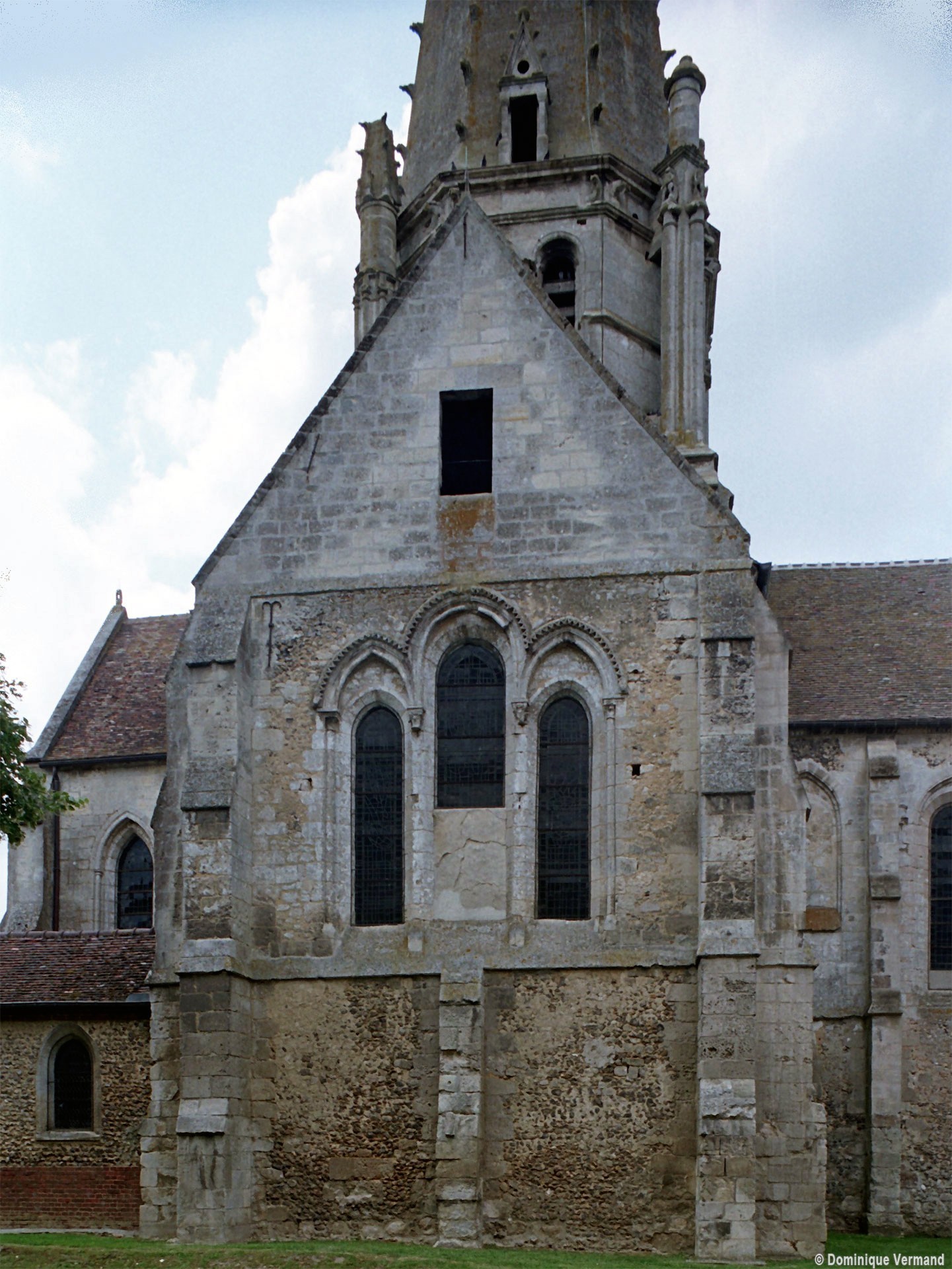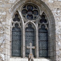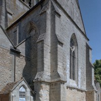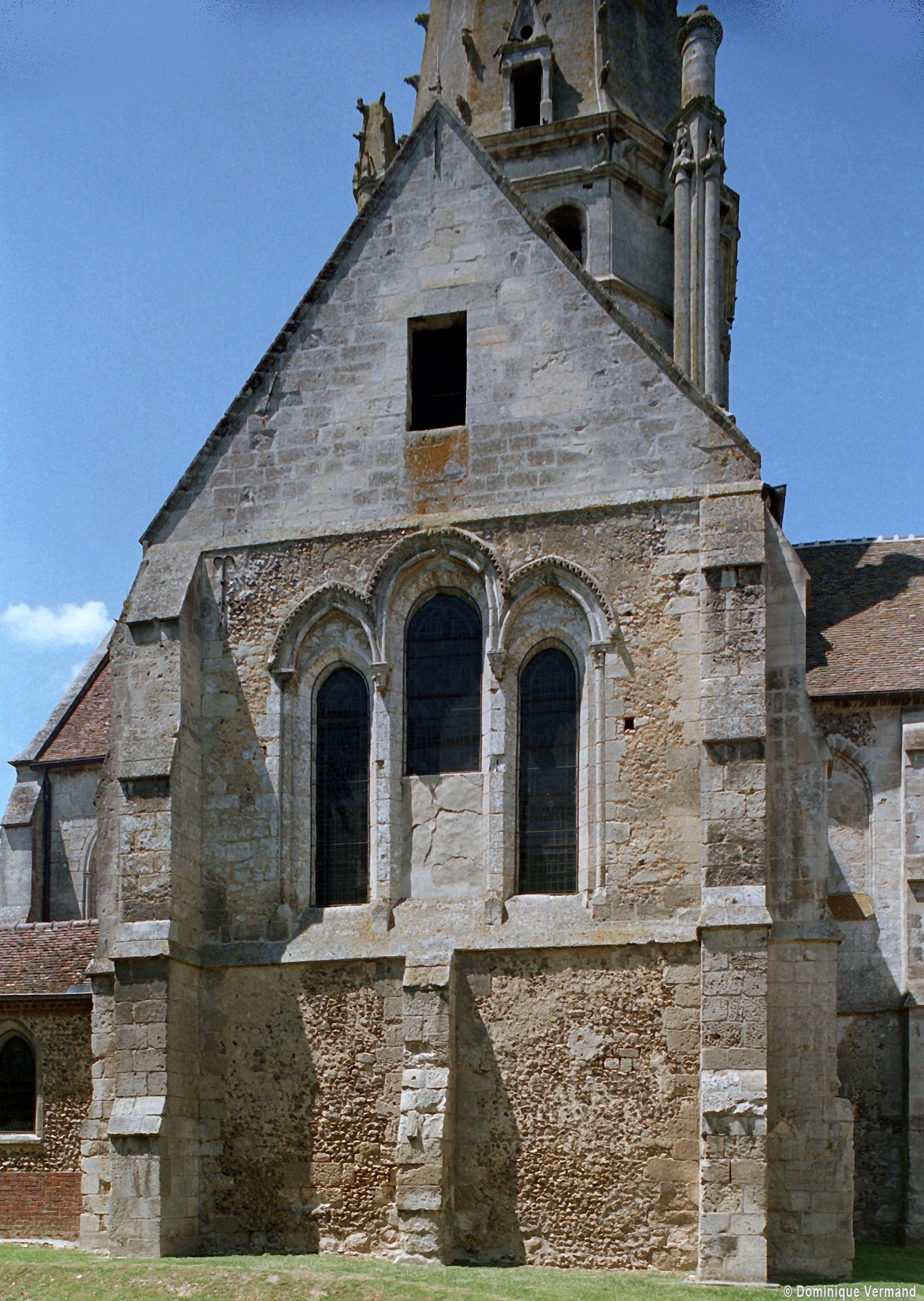 Les fenêtres sont de simples lancettes. Des colonnettes garnissent parfois les piédroits et celles du chevet sont regroupées en un beau triplet avec une moulure décorée de fleurs de violette soulignant les archivoltes. Les fenêtres à remplage des murs pignons des croisillons sont du 19ème siècle mais celle s’ouvrant à l’ouest du croisillon sud (aujourd’hui bouchée et à moitié masquée par le bas-côté sud) est bonne. Composée de deux lancettes surmontées d’une rose, elle n’est pas antérieure aux années 1230. Le très beau portail à gâble ne comporte pas moins de huit colonnettes. Il est contemporain du chœur et a peut-être été ajouté à la nef unique conservée de l’église précédente. Il est surmonté d’une grande rose bouchée, à l’intérieur de laquelle est percée une très intéressante fenêtre à trois lancettes tréflées et rose quadrilobée de la fin du 13ème ou du début du siècle suivant.
