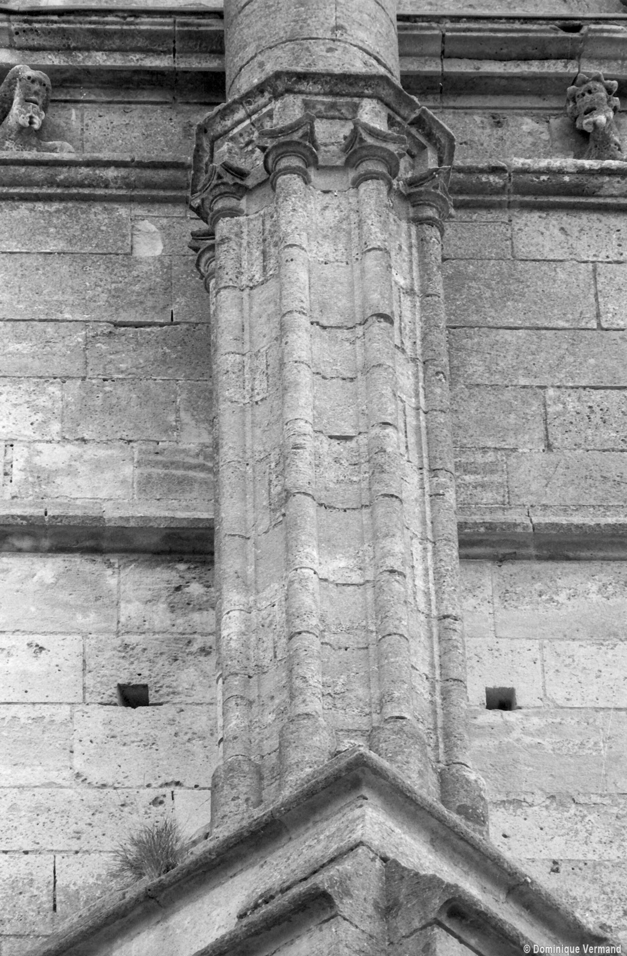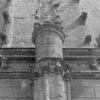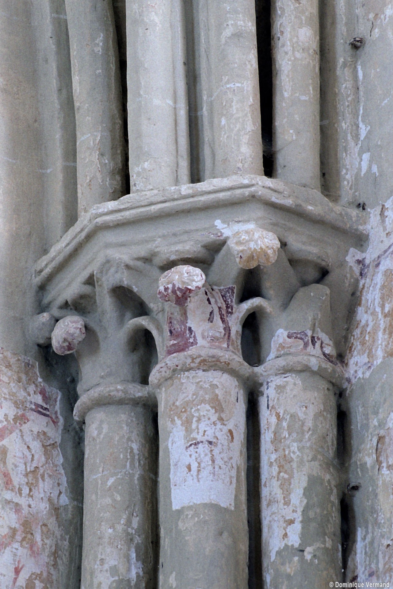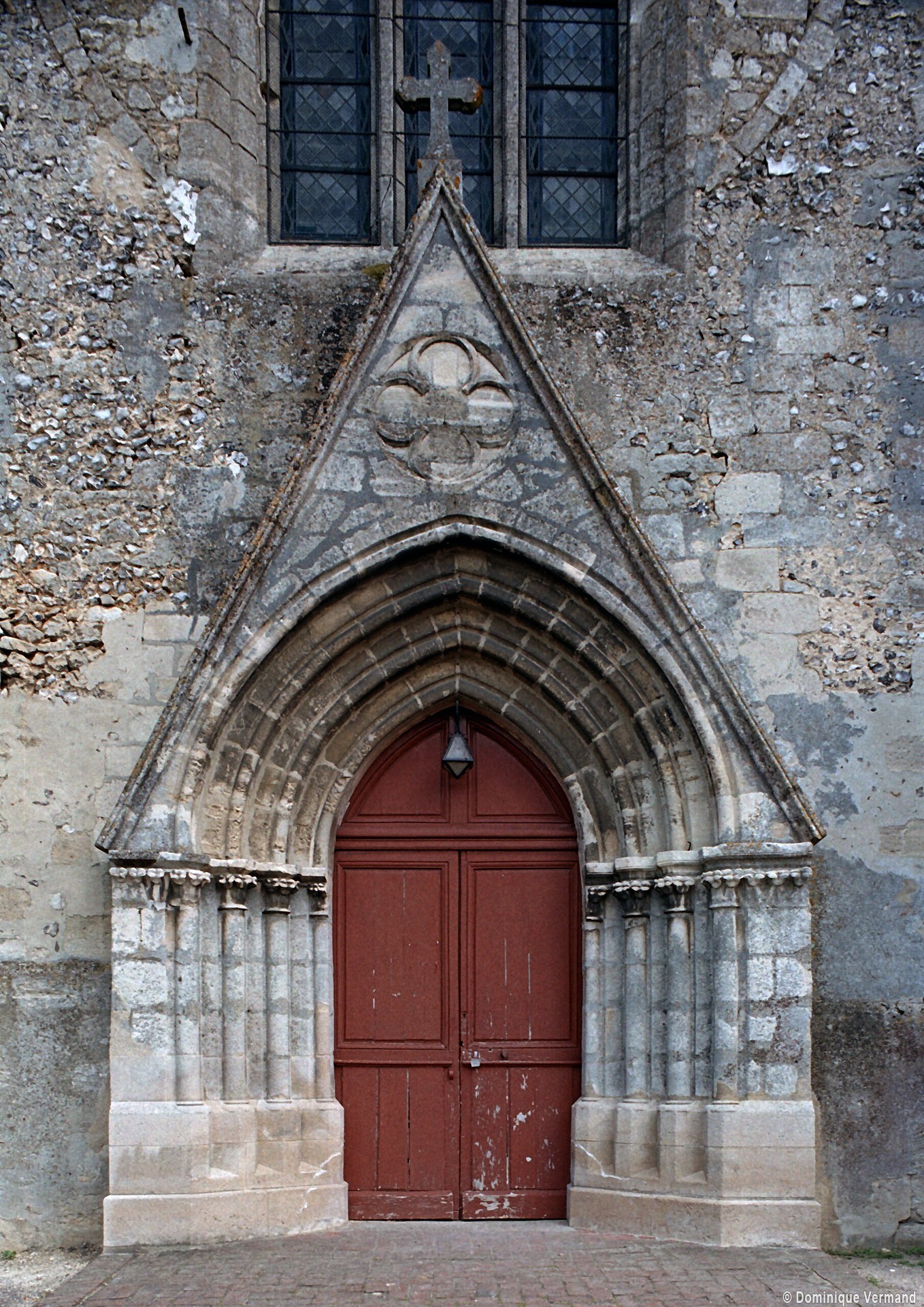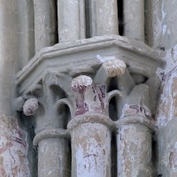 Les fenêtres sont de simples lancettes. Des colonnettes garnissent parfois les piédroits et celles du chevet sont regroupées en un beau triplet avec une moulure décorée de fleurs de violette soulignant les archivoltes. Les fenêtres à remplage des murs pignons des croisillons sont du 19ème siècle mais celle s’ouvrant à l’ouest du croisillon sud (aujourd’hui bouchée et à moitié masquée par le bas-côté sud) est bonne. Composée de deux lancettes surmontées d’une rose, elle n’est pas antérieure aux années 1230. Le très beau portail à gâble ne comporte pas moins de huit colonnettes. Il est contemporain du chœur et a peut-être été ajouté à la nef unique conservée de l’église précédente. Il est surmonté d’une grande rose bouchée, à l’intérieur de laquelle est percée une très intéressante fenêtre à trois lancettes tréflées et rose quadrilobée de la fin du 13ème ou du début du siècle suivant.