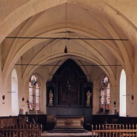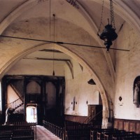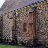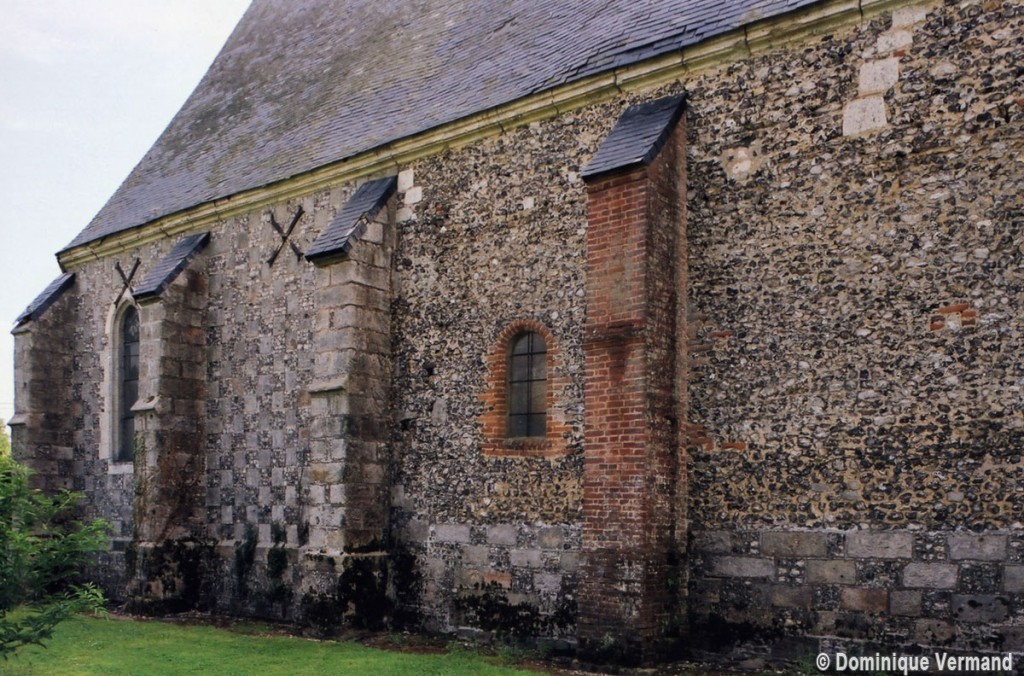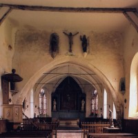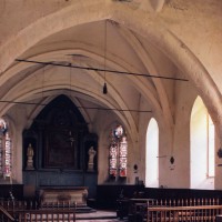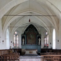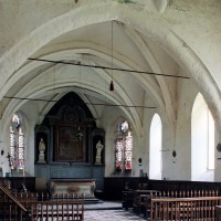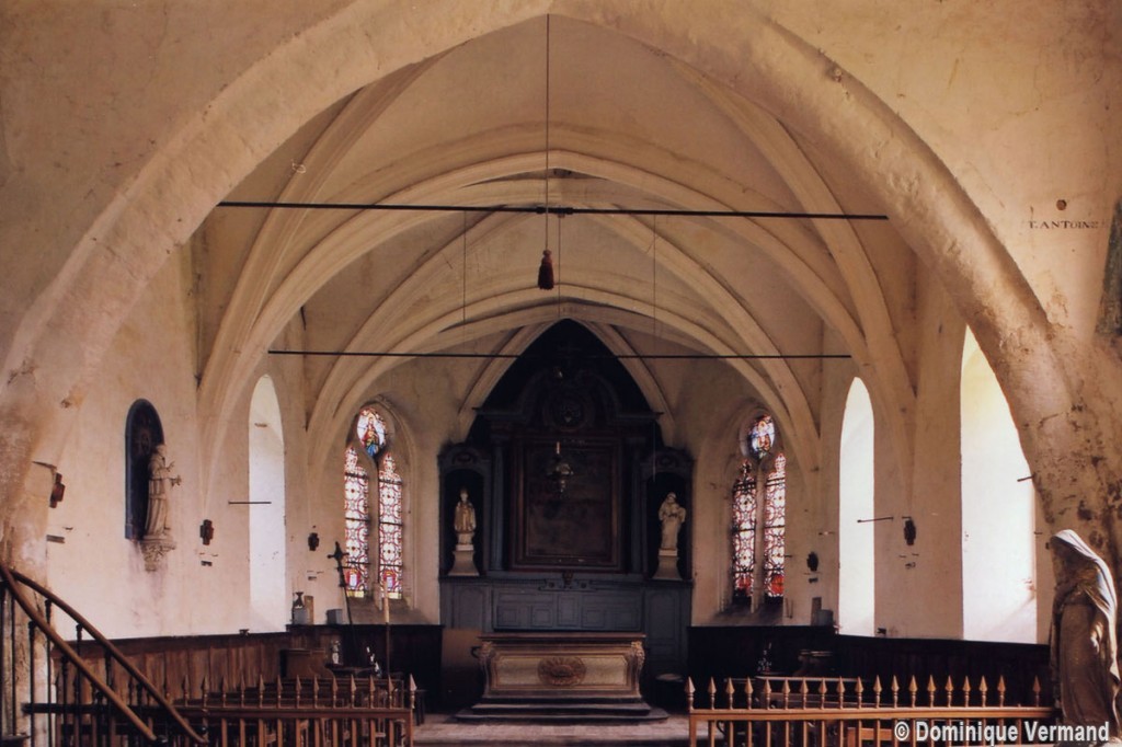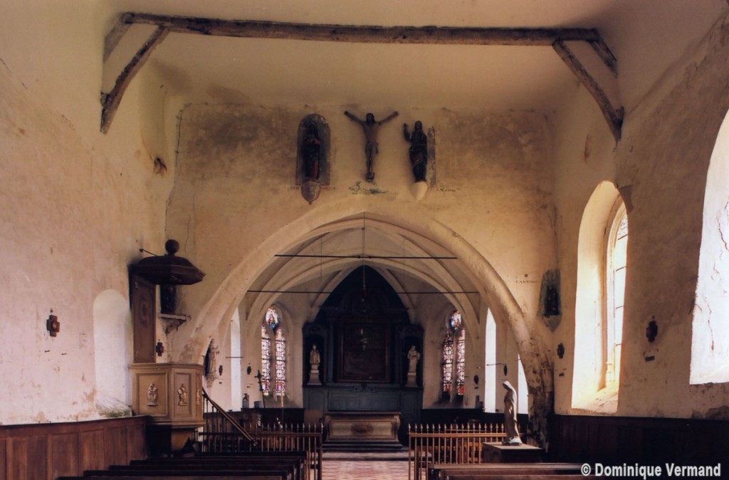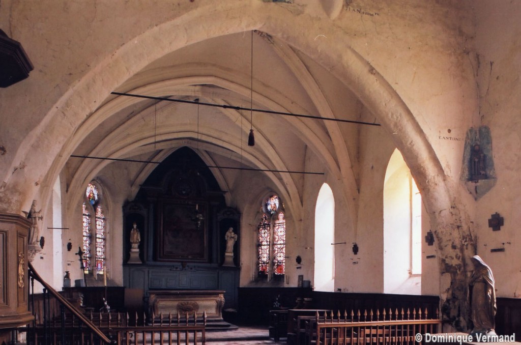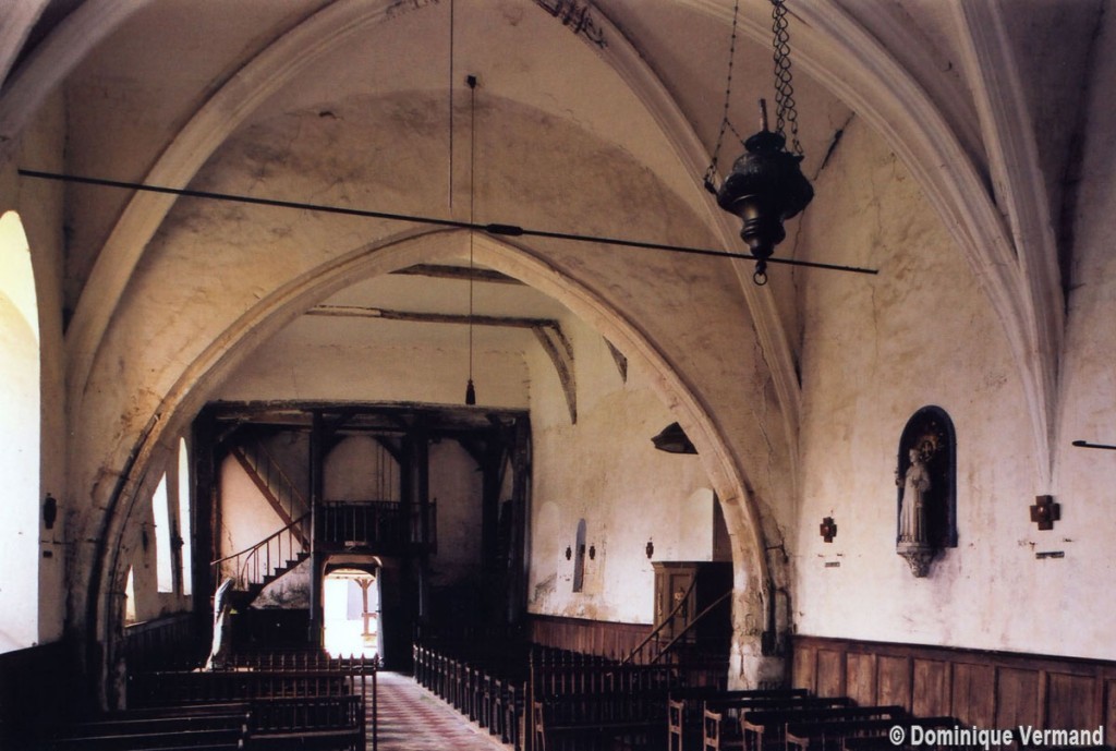 L’intérieur, qui communique avec la nef par une arcade – que l’on appelle encore arc triomphal – surbaissée, est voûté d’ogives qui retombent dans les murs par pénétration. La voûte de l’abside comporte également quatre compartiments et porte la date de 1581. La nef, comme presque toujours, ne bénéficie pas du même soin que celui apporté au choeur et seul le silex a été utilisé pour sa construction. Si deux fenêtres, au sud, sont contemporaines du choeur – l’une comportait un remplage aujourd’hui disparu – , d’autres sont plus récentes et associées à des réparations effectuées en briques, au 17ème siècle sans doute. La partie occidentale est remarquable pour l’ouvrage en charpente qui supporte le clocher, pourvu d’une petite tribune au 19ème siècle.