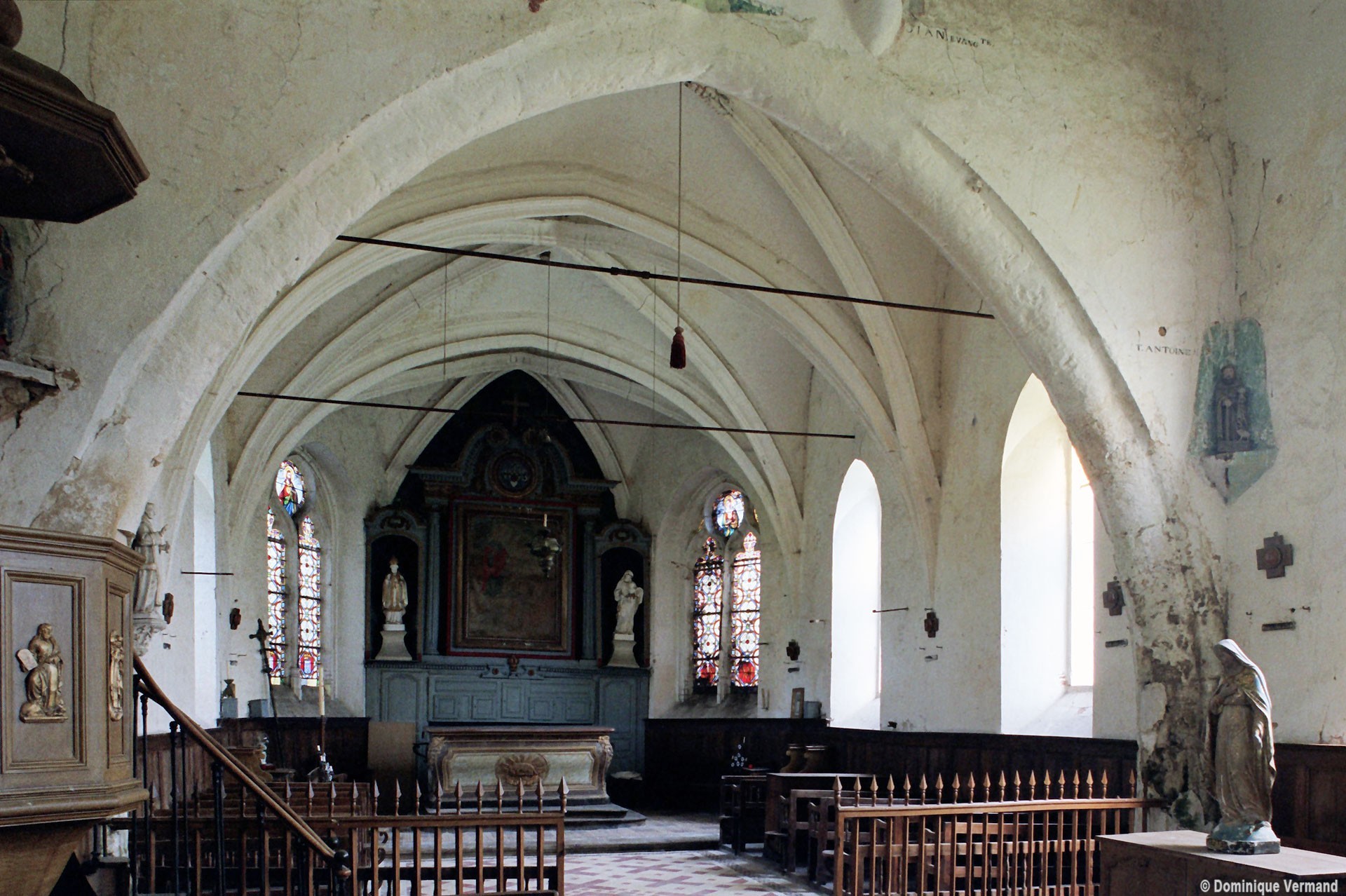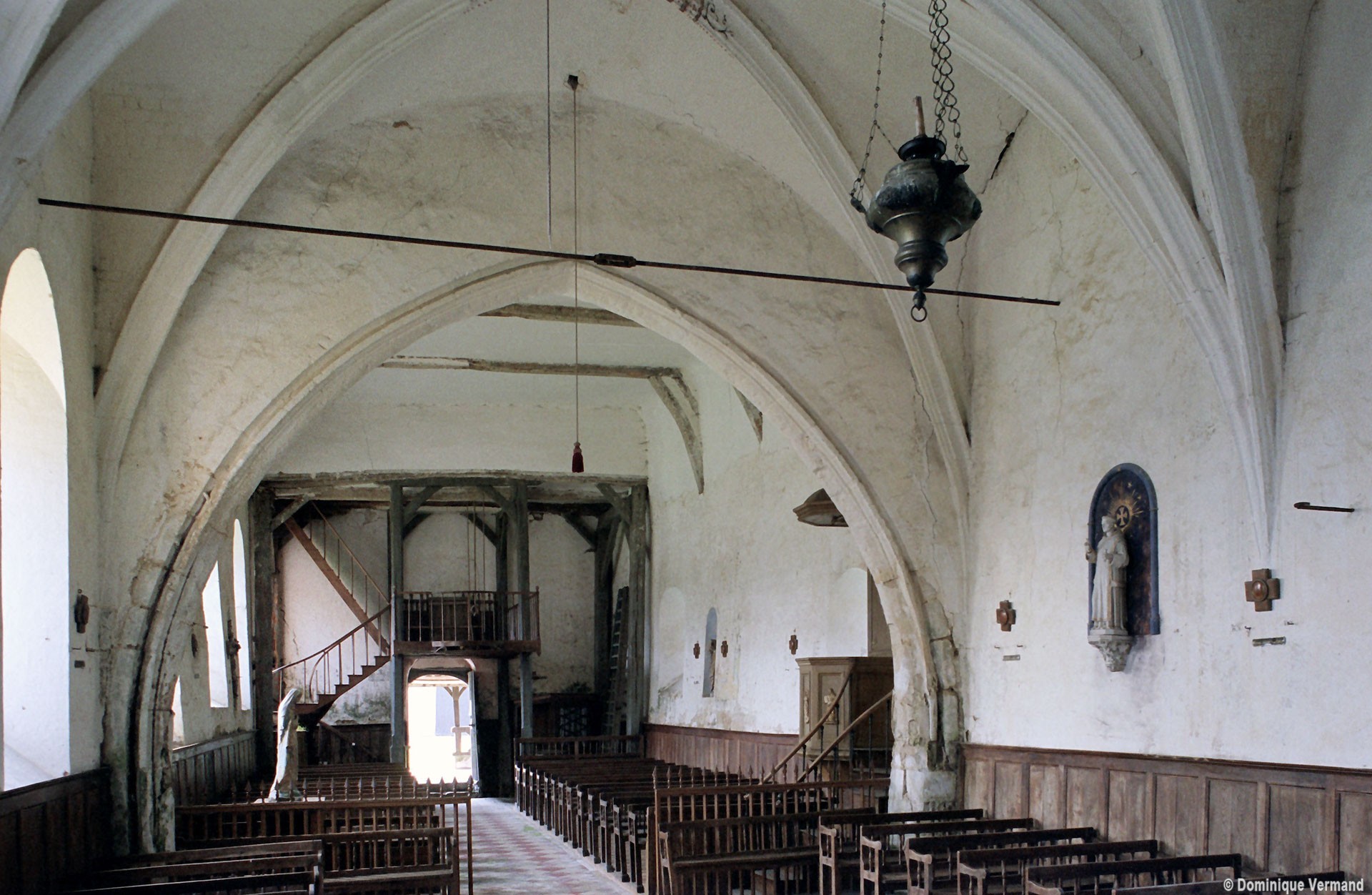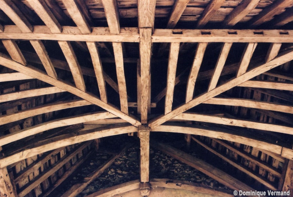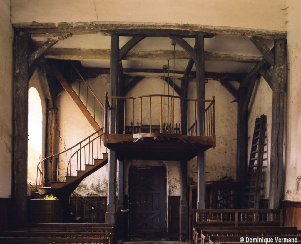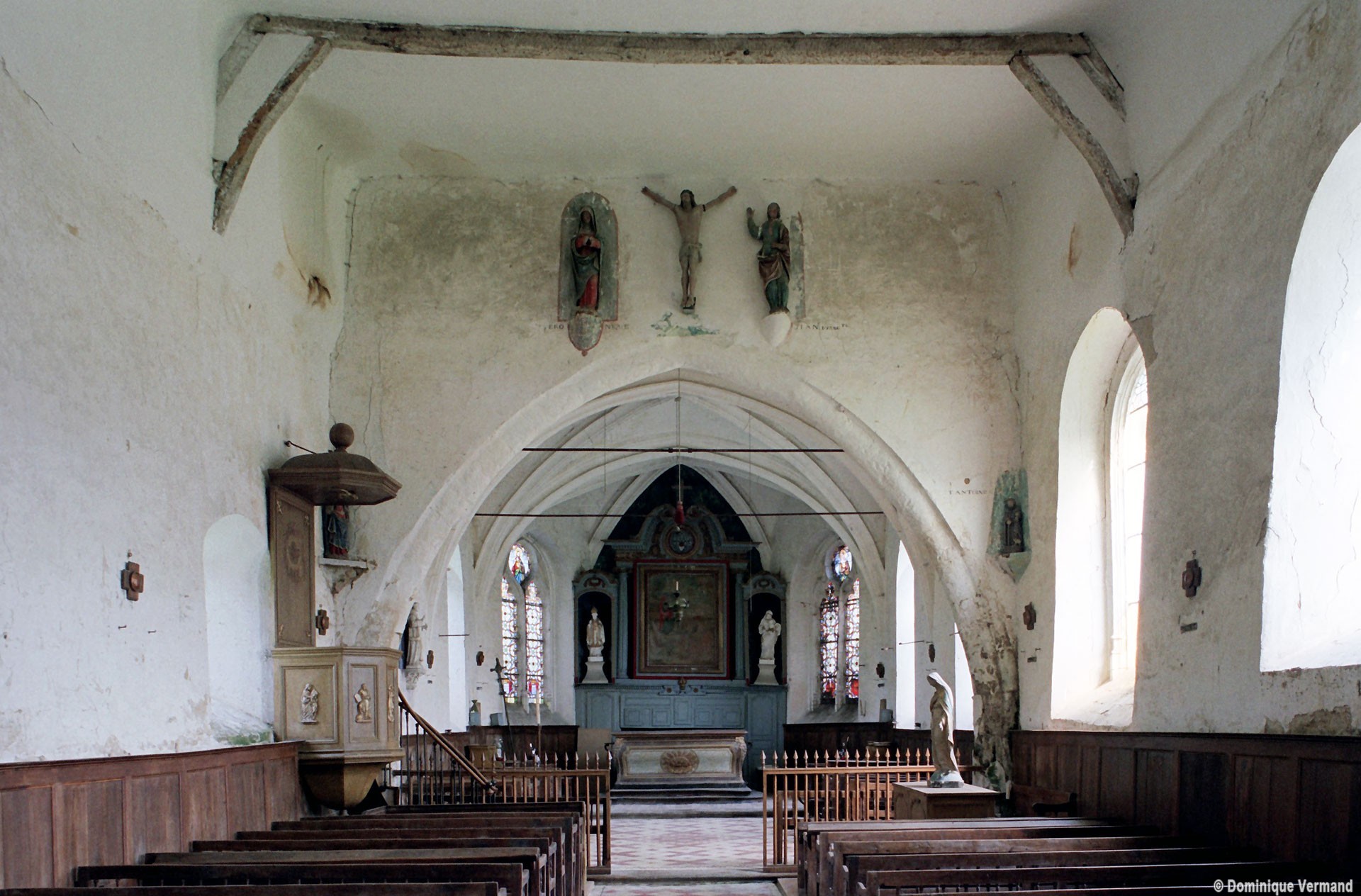 L’intérieur, qui communique avec la nef par une arcade – que l’on appelle encore arc triomphal – surbaissée, est voûté d’ogives qui retombent dans les murs par pénétration. La voûte de l’abside comporte également quatre compartiments et porte la date de 1581. La nef, comme presque toujours, ne bénéficie pas du même soin que celui apporté au choeur et seul le silex a été utilisé pour sa construction. Si deux fenêtres, au sud, sont contemporaines du choeur – l’une comportait un remplage aujourd’hui disparu – , d’autres sont plus récentes et associées à des réparations effectuées en briques, au 17ème siècle sans doute. La partie occidentale est remarquable pour l’ouvrage en charpente qui supporte le clocher, pourvu d’une petite tribune au 19ème siècle.