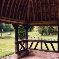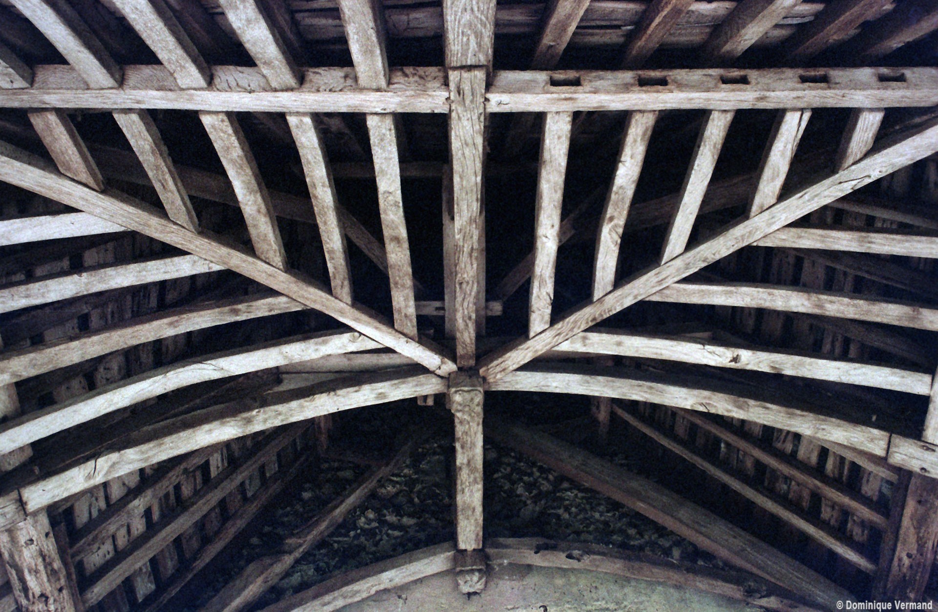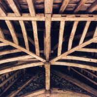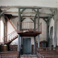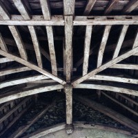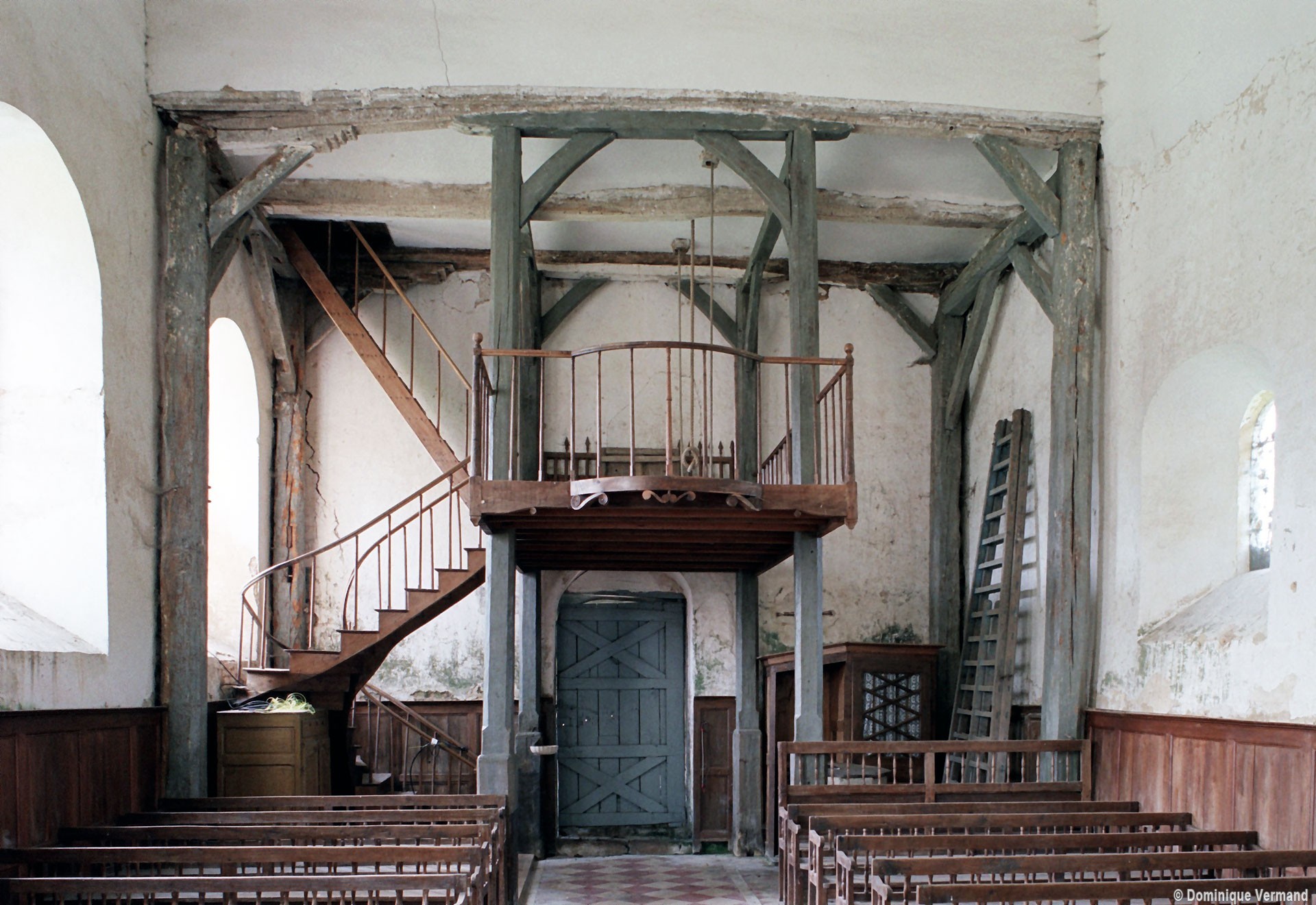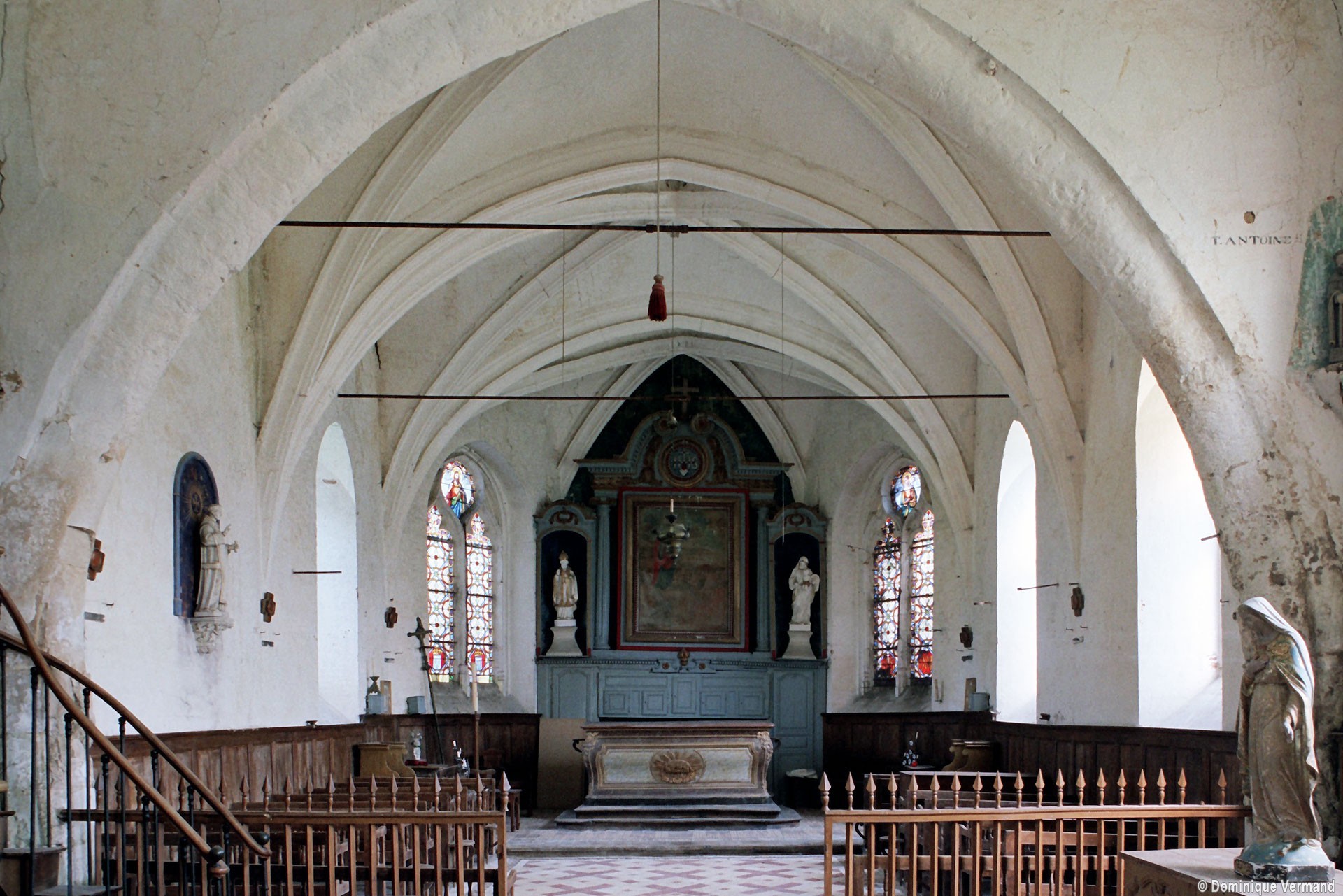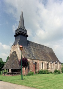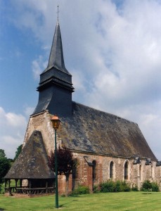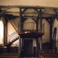 L’intérieur, qui communique avec la nef par une arcade – que l’on appelle encore arc triomphal – surbaissée, est voûté d’ogives qui retombent dans les murs par pénétration. La voûte de l’abside comporte également quatre compartiments et porte la date de 1581. La nef, comme presque toujours, ne bénéficie pas du même soin que celui apporté au choeur et seul le silex a été utilisé pour sa construction. Si deux fenêtres, au sud, sont contemporaines du choeur – l’une comportait un remplage aujourd’hui disparu – , d’autres sont plus récentes et associées à des réparations effectuées en briques, au 17ème siècle sans doute. La partie occidentale est remarquable pour l’ouvrage en charpente qui supporte le clocher, pourvu d’une petite tribune au 19ème siècle.