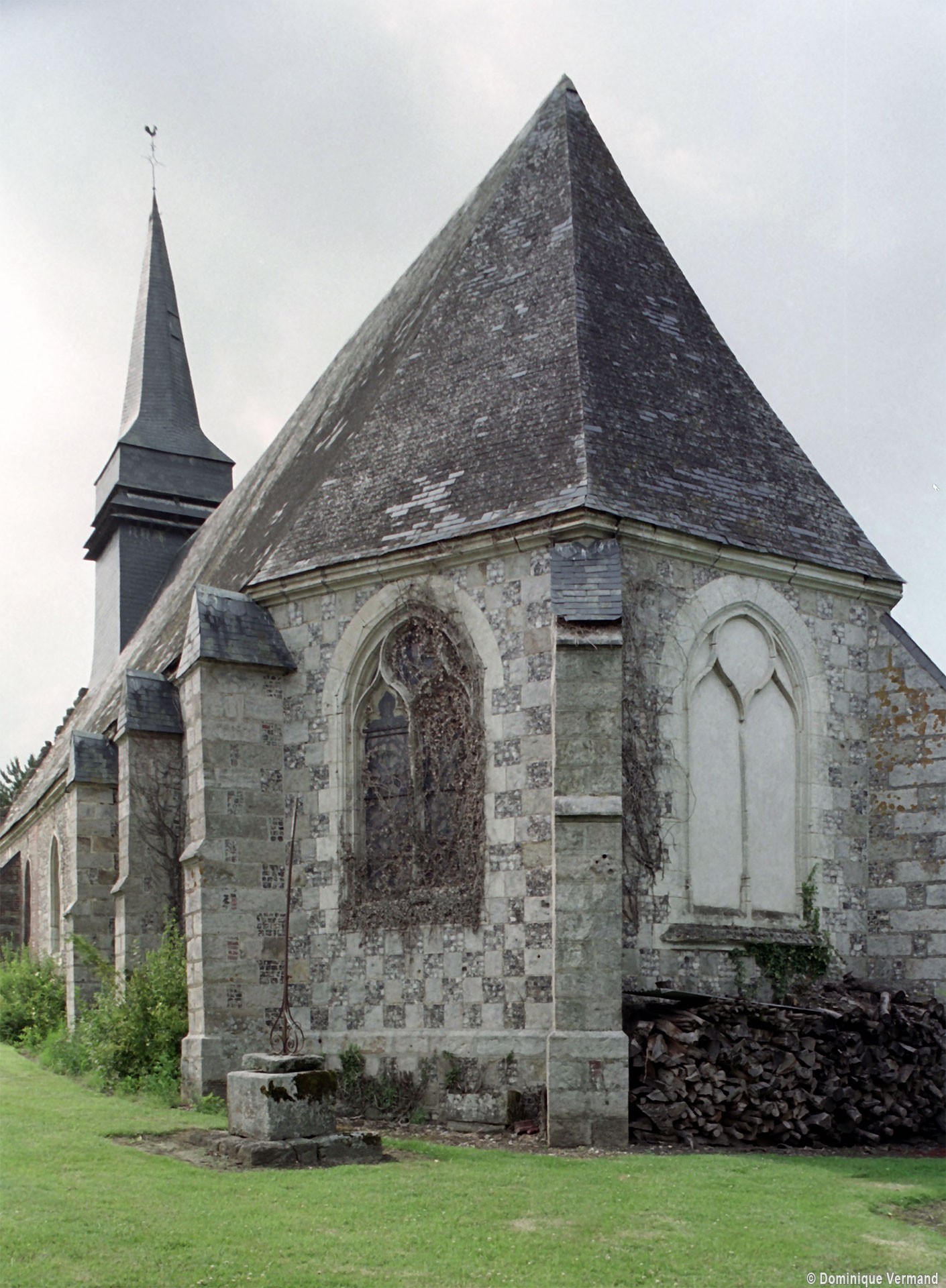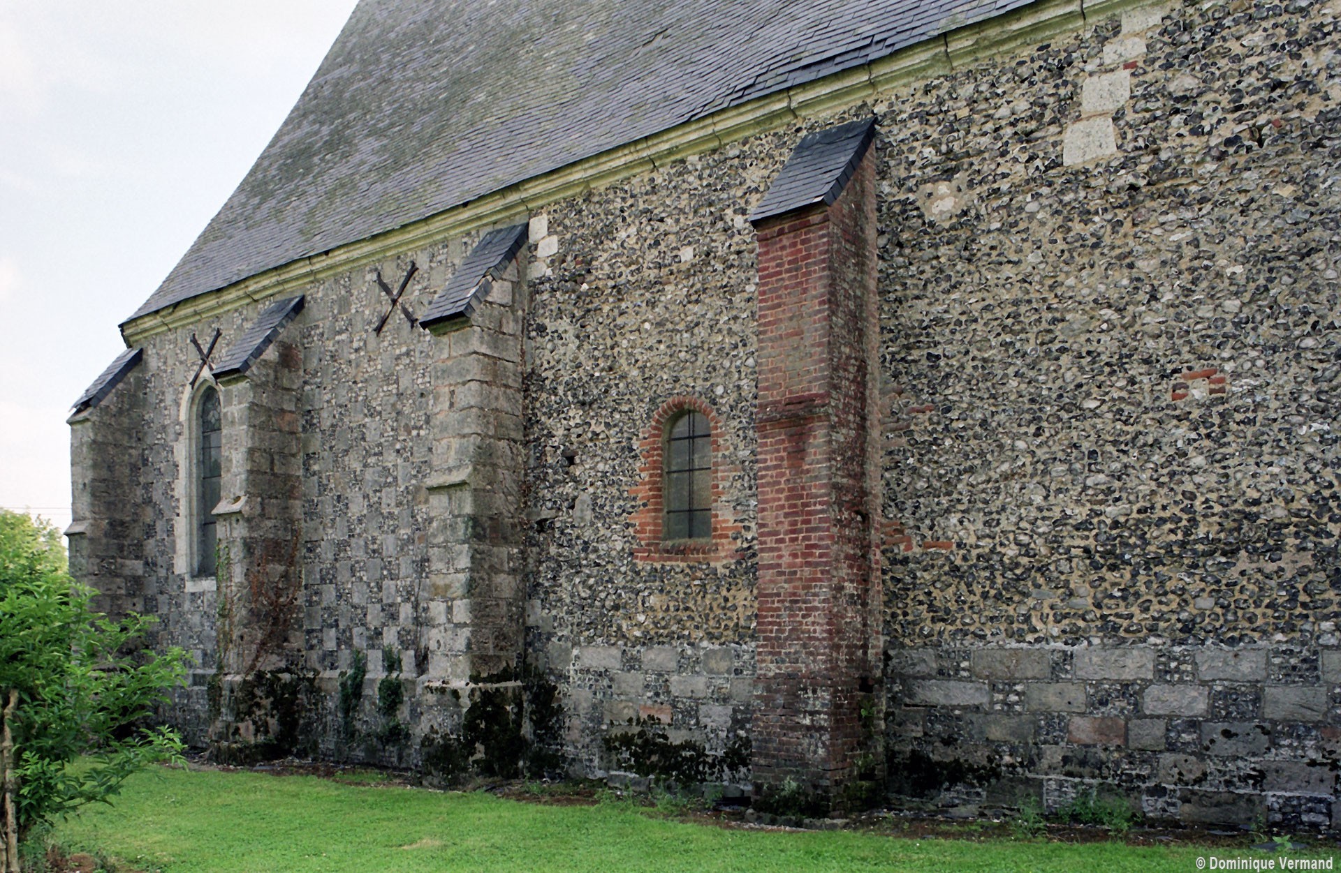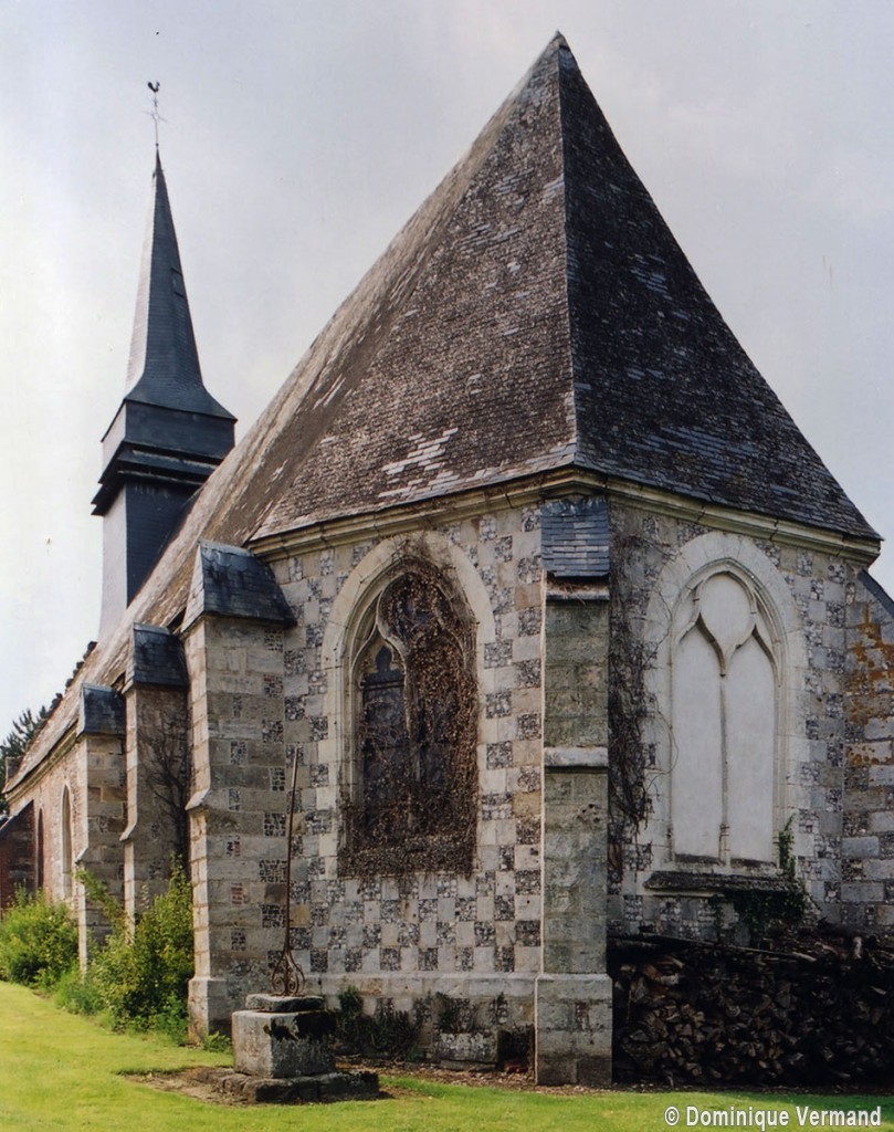 Le choeur est la partie la plus intéressante. C’est une construction soignée, réalisée en damier de grès et de silex sur un soubassement en grès. Les contreforts bien marqués s’amortissent en bâtière dans la partie droite. Les fenêtres sont de deux types : de simples lancettes éclairent les deux travées droites tandis que l’abside est ajourée par des fenêtres plus grandes comportant un réseau flamboyant, suivant en cela l’usage qui consiste à mettre l’accent sur le sanctuaire.