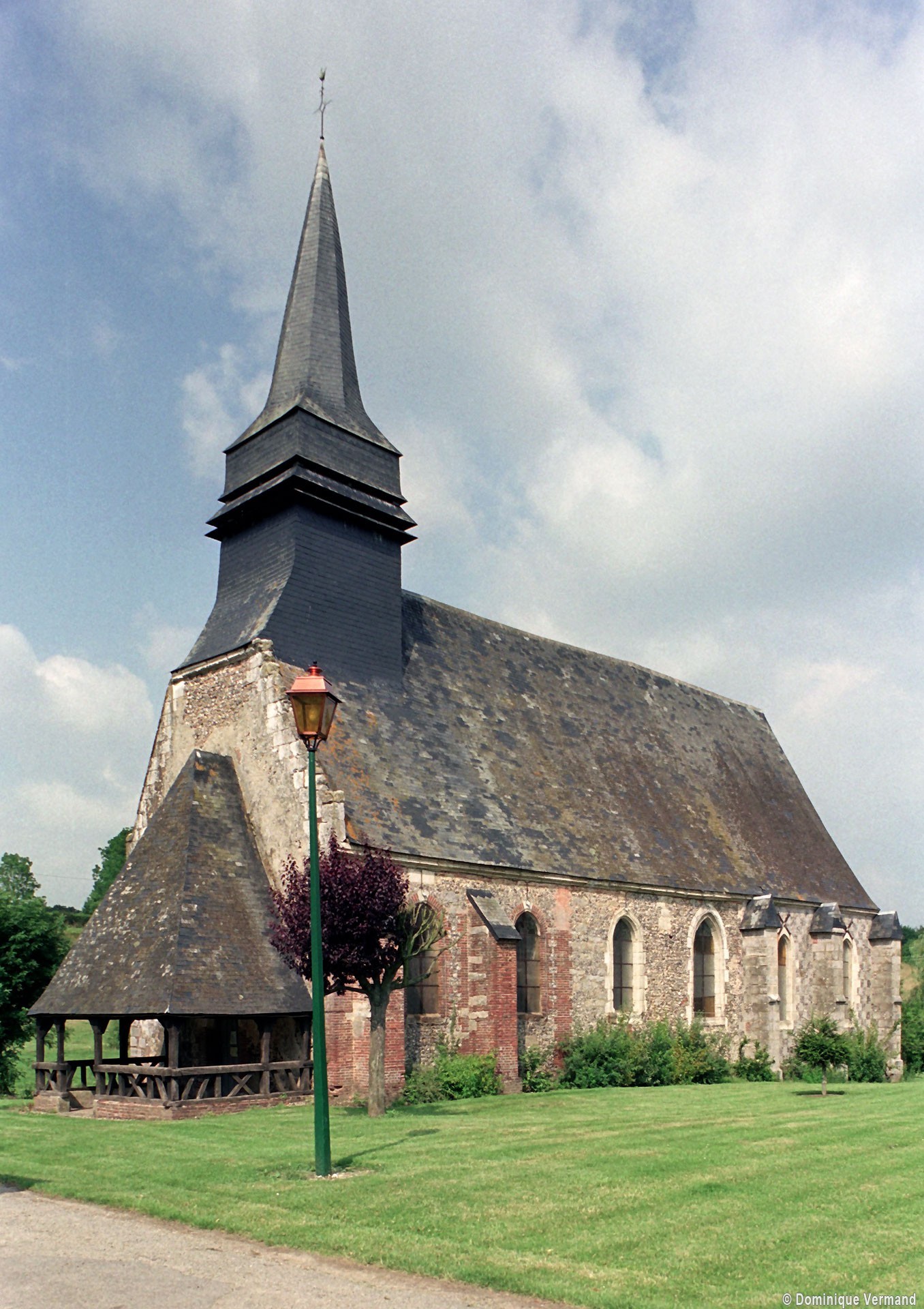 Saint-Denis s’élève dans la pittoresque vallée du Petit Thérain, ici au début de son parcours. C’est un édifice relativement homogène, construit au 16ème siècle. Son plan associe une nef unique à un choeur de deux travées terminées par un chevet à trois pans. Un petit porche en bois, légèrement plus tardif, le précède à l’ouest et le clocher en charpente et ardoises qui s’élève au-dessus de la façade vient, seul, troubler le volume simple de l’édifice.