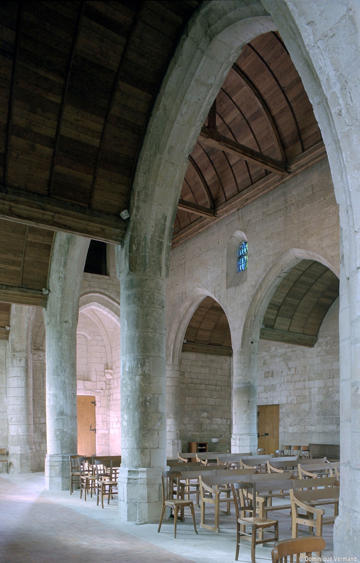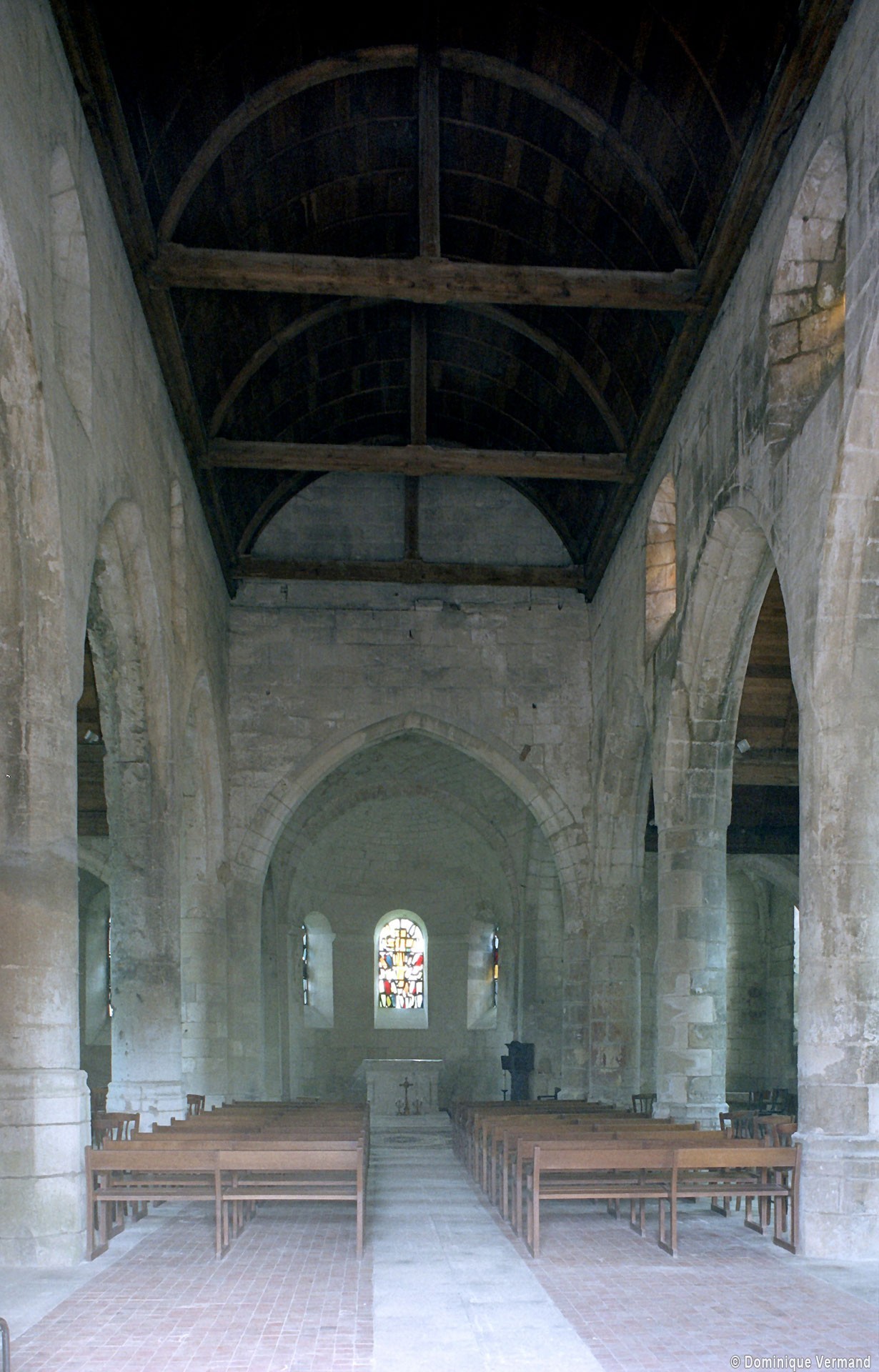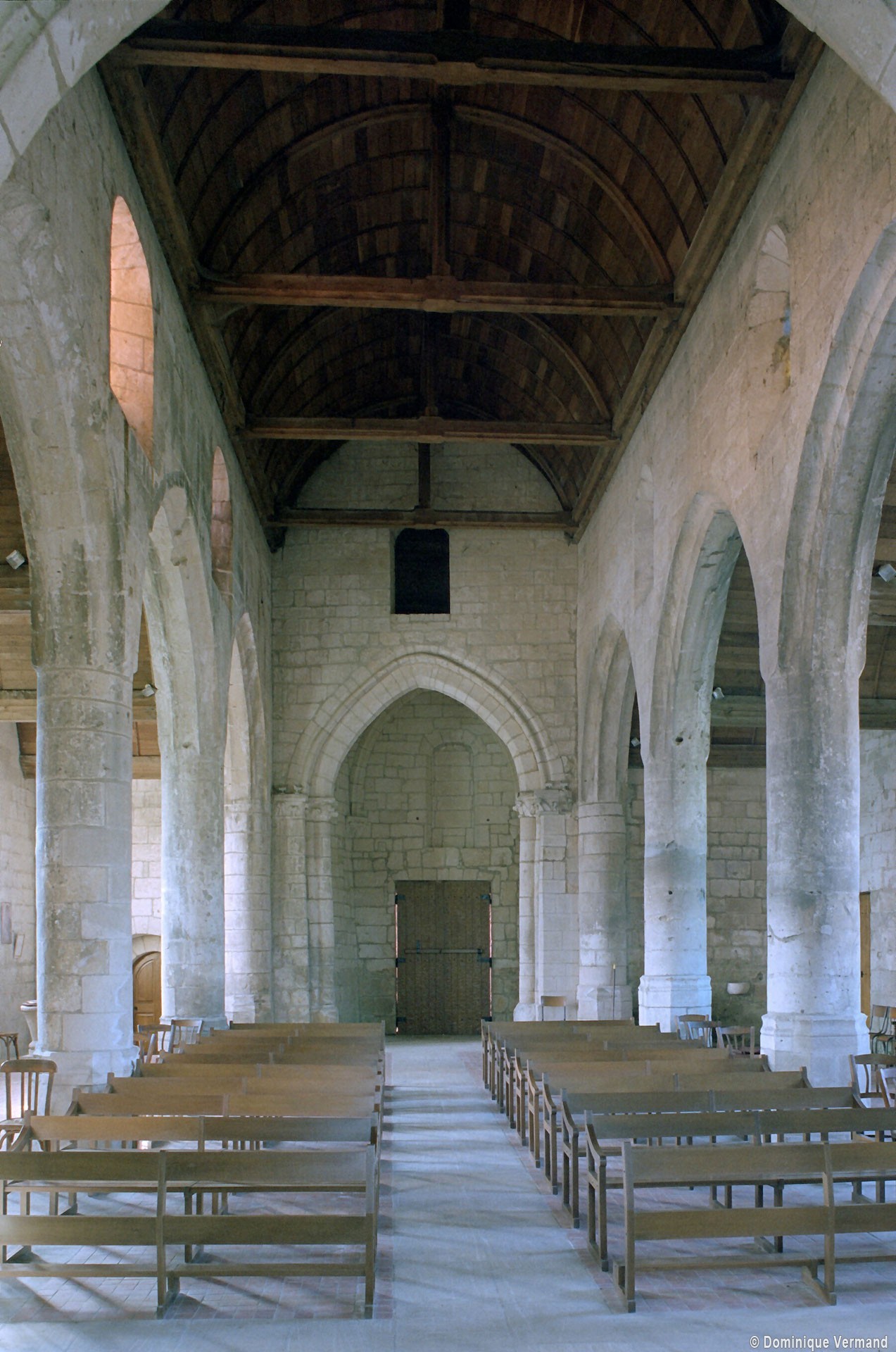 Partie la plus intéressante, la nef est remarquable par ses grandes arcades qui occupent plus des trois-quarts de l’élévation totale et retombent sur de minces piles circulaires, ouvrant ainsi largement l’espace sur les bas-côtés. Faute de place, les fenêtres hautes sont minuscules et ouvertes entre les arcades et non au-dessus comme c’est généralement l’usage. A l’extérieur, on remarquera les petites toitures avec pignon associées à chaque travée des bas-côtés et l’austère clocher porche, de plan rectangulaire et couvert d’une bâtière. Parmi le mobilier, on note un rare autel roman, avec colonnettes, contemporain de l’abside (2009).