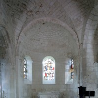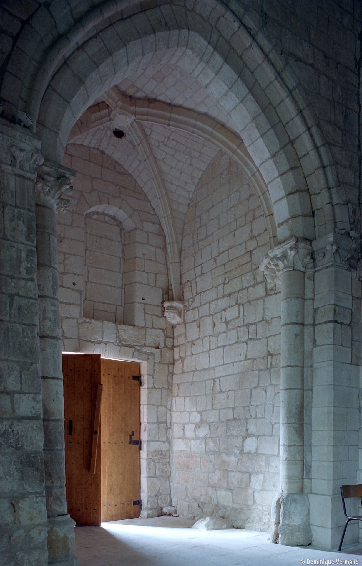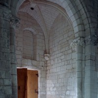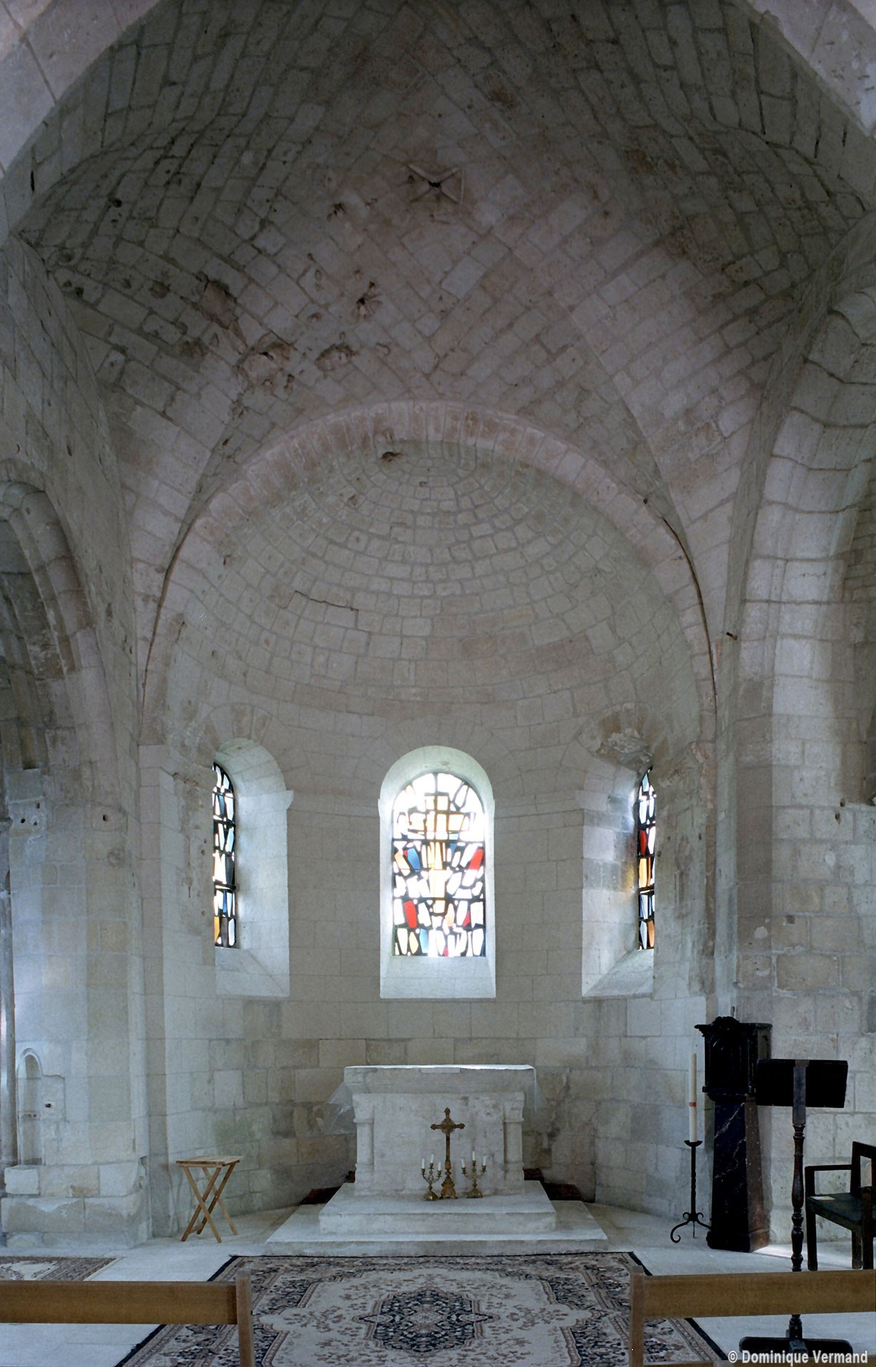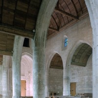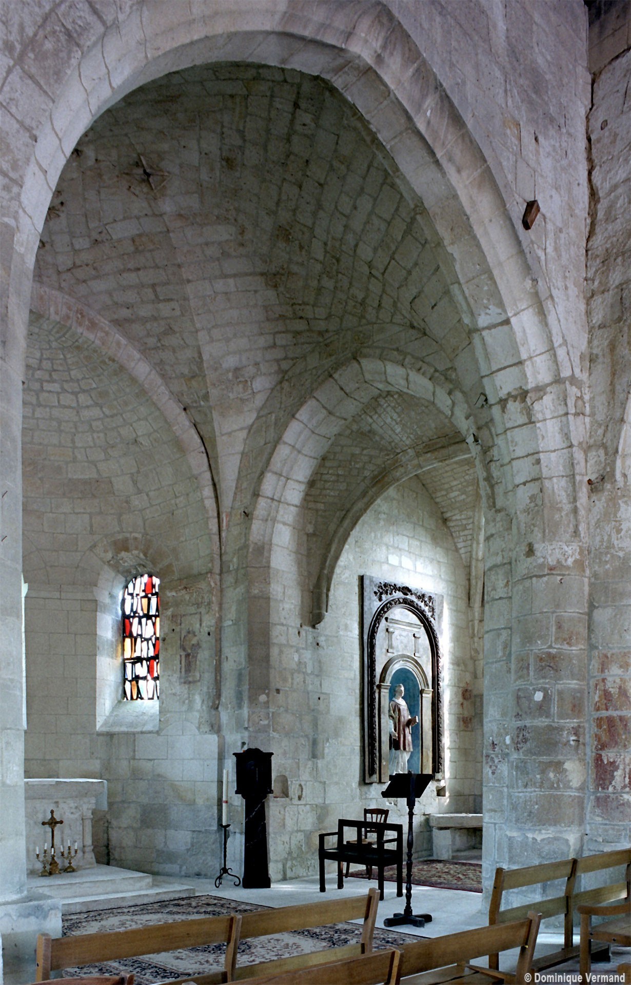 Partie la plus intéressante, la nef est remarquable par ses grandes arcades qui occupent plus des trois-quarts de l’élévation totale et retombent sur de minces piles circulaires, ouvrant ainsi largement l’espace sur les bas-côtés. Faute de place, les fenêtres hautes sont minuscules et ouvertes entre les arcades et non au-dessus comme c’est généralement l’usage. A l’extérieur, on remarquera les petites toitures avec pignon associées à chaque travée des bas-côtés et l’austère clocher porche, de plan rectangulaire et couvert d’une bâtière. Parmi le mobilier, on note un rare autel roman, avec colonnettes, contemporain de l’abside (2009).