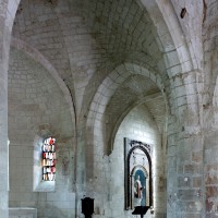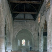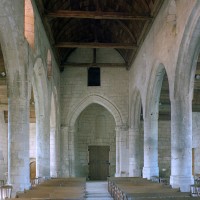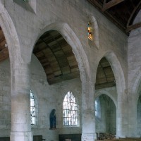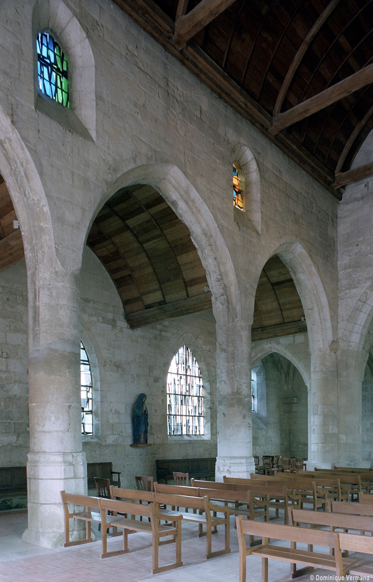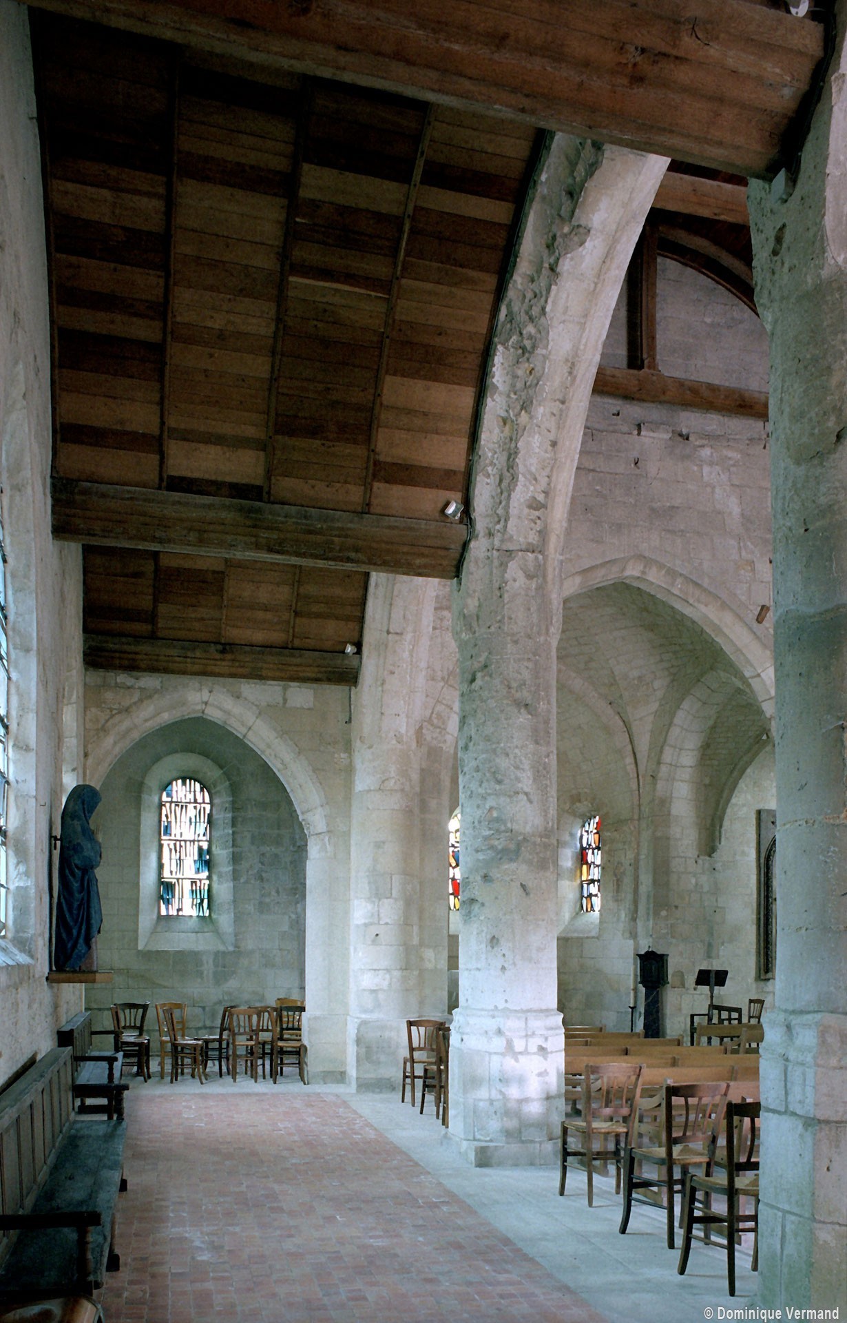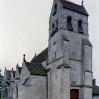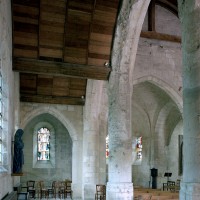 Pour le reste, l’église reconstruite au 16ème siècle comporte une nef de trois travées avec bas-côtés, un transept étroit et faiblement saillant et un clocher formant porche, à l’ouest. L’arcade qui assure la communication de ce dernier avec la nef remonte toutefois au début du 13ème siècle, de même que les quatre consoles décorées de têtes associées à la voûte, preuves qu’un clocher porche existait déjà à cette époque.