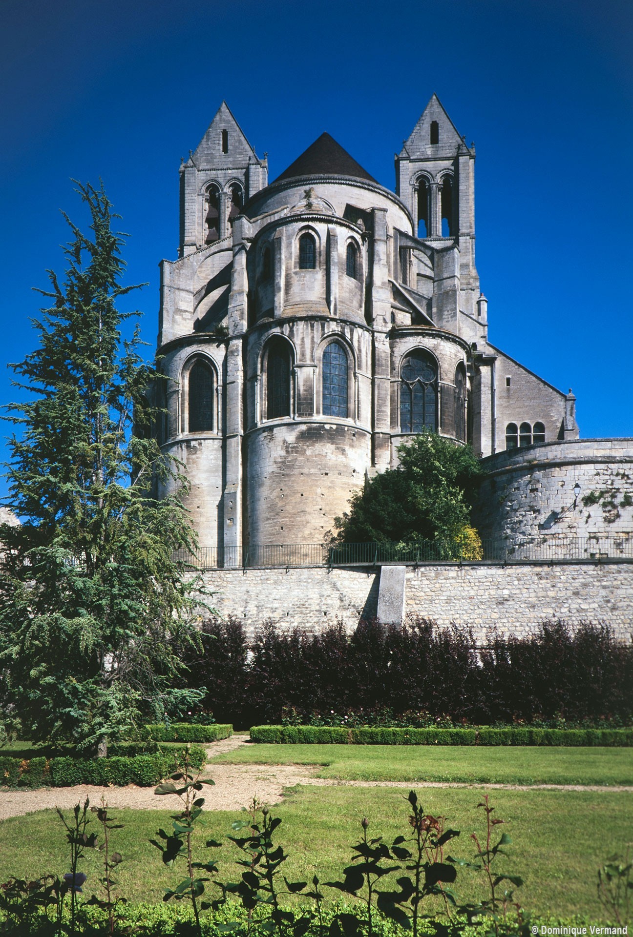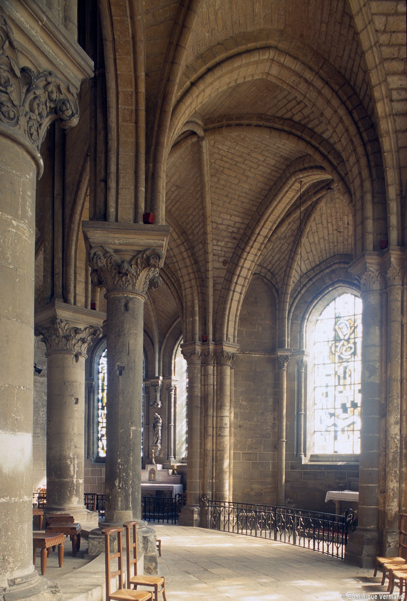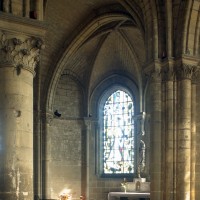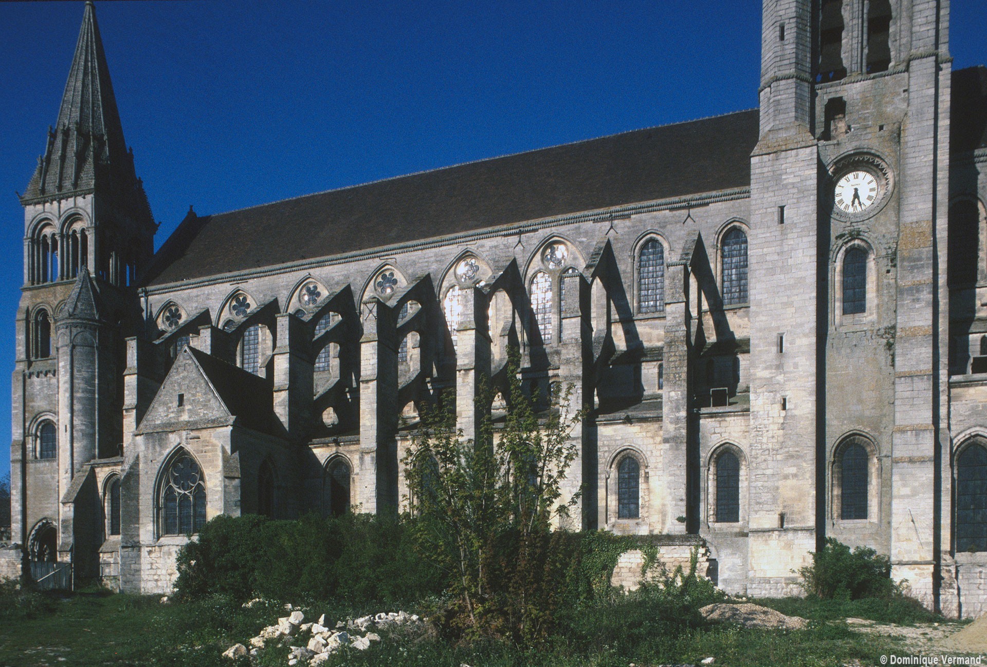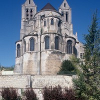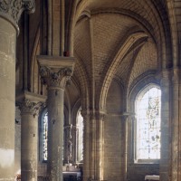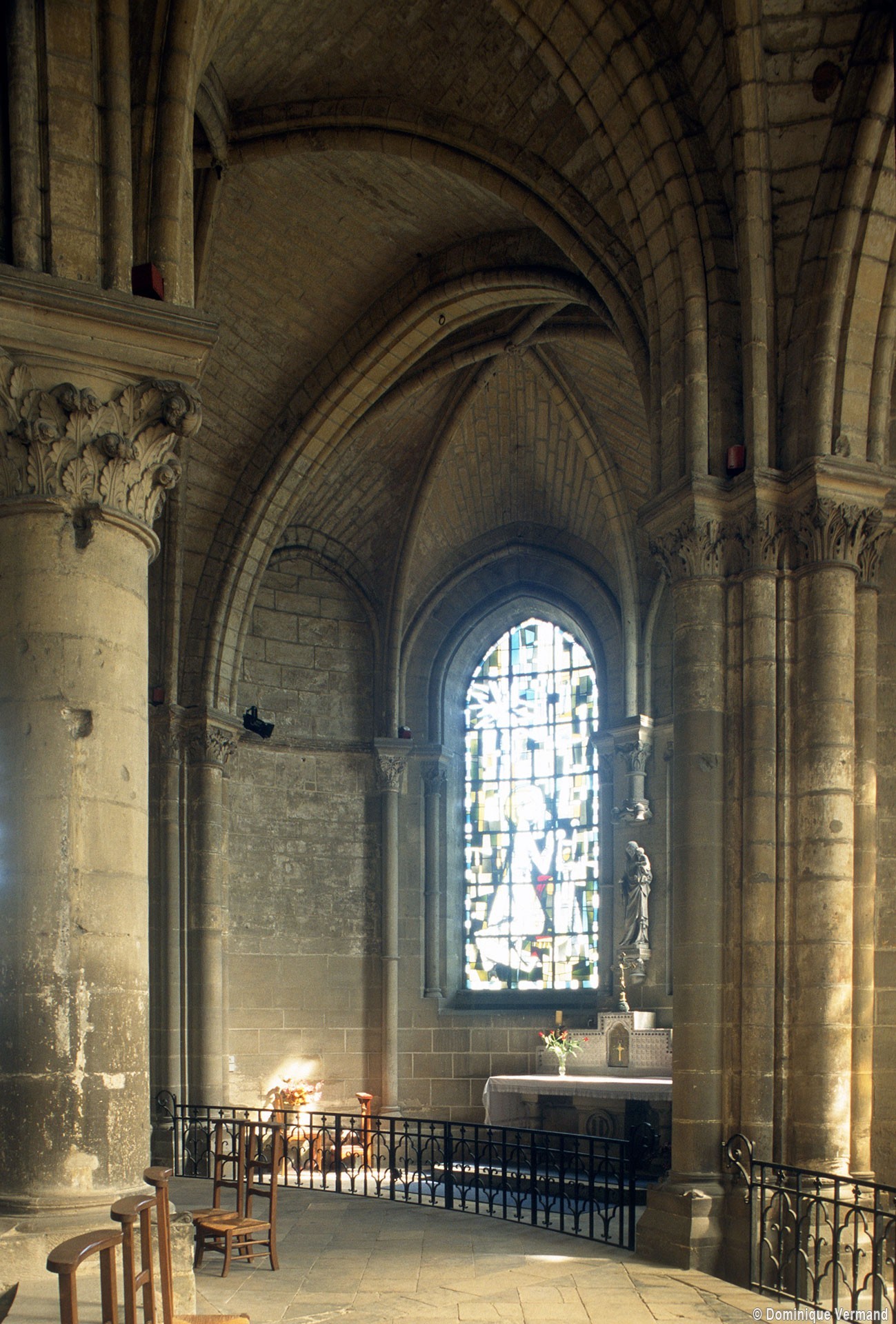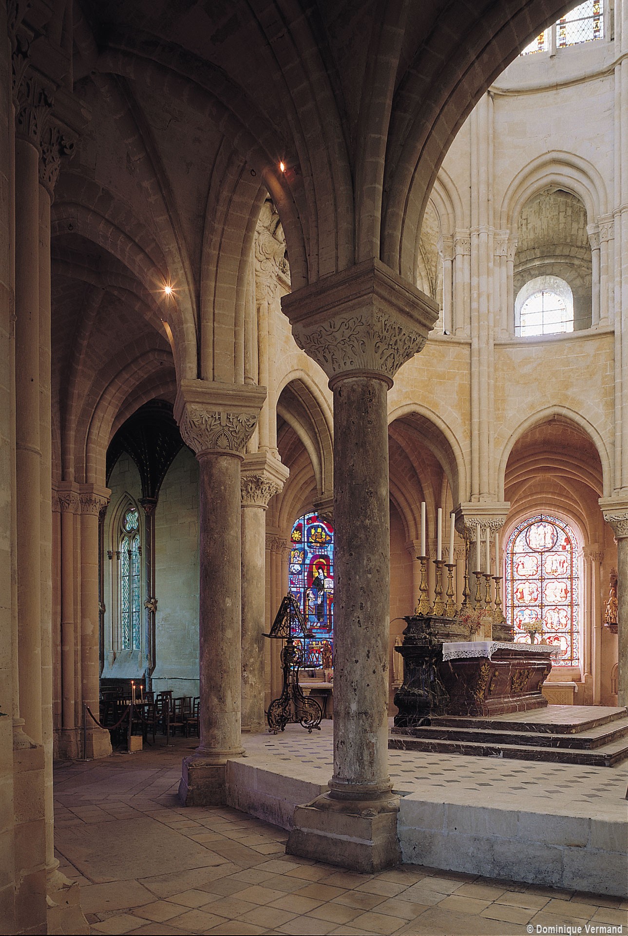 C’est au chœur, bâti à partir des années 1160 à l’est du chevet roman conservé pendant quelque temps encore, qu’il appartiendra de rompre avec cette architecture de “transition” en donnant une œuvre résolument gothique. Son plan comprend une travée double avec voûte sexpartite, suivie d’une travée simple correspondant aux deux tours et un hémicycle couvert d’une voûte à huit compartiments. Un bas-côté et un déambulatoire sur lequel se greffent cinq chapelles rayonnantes contiguës contournent l’ensemble.