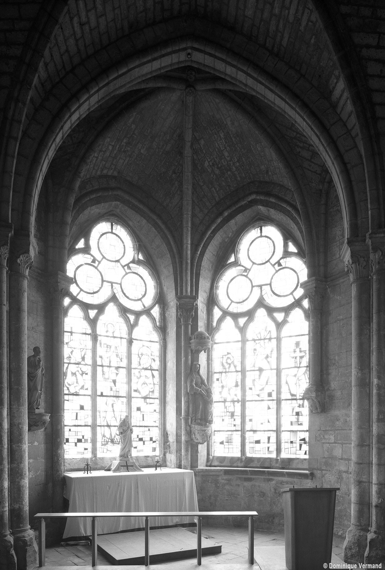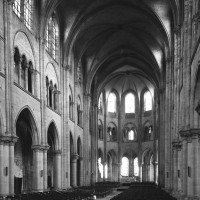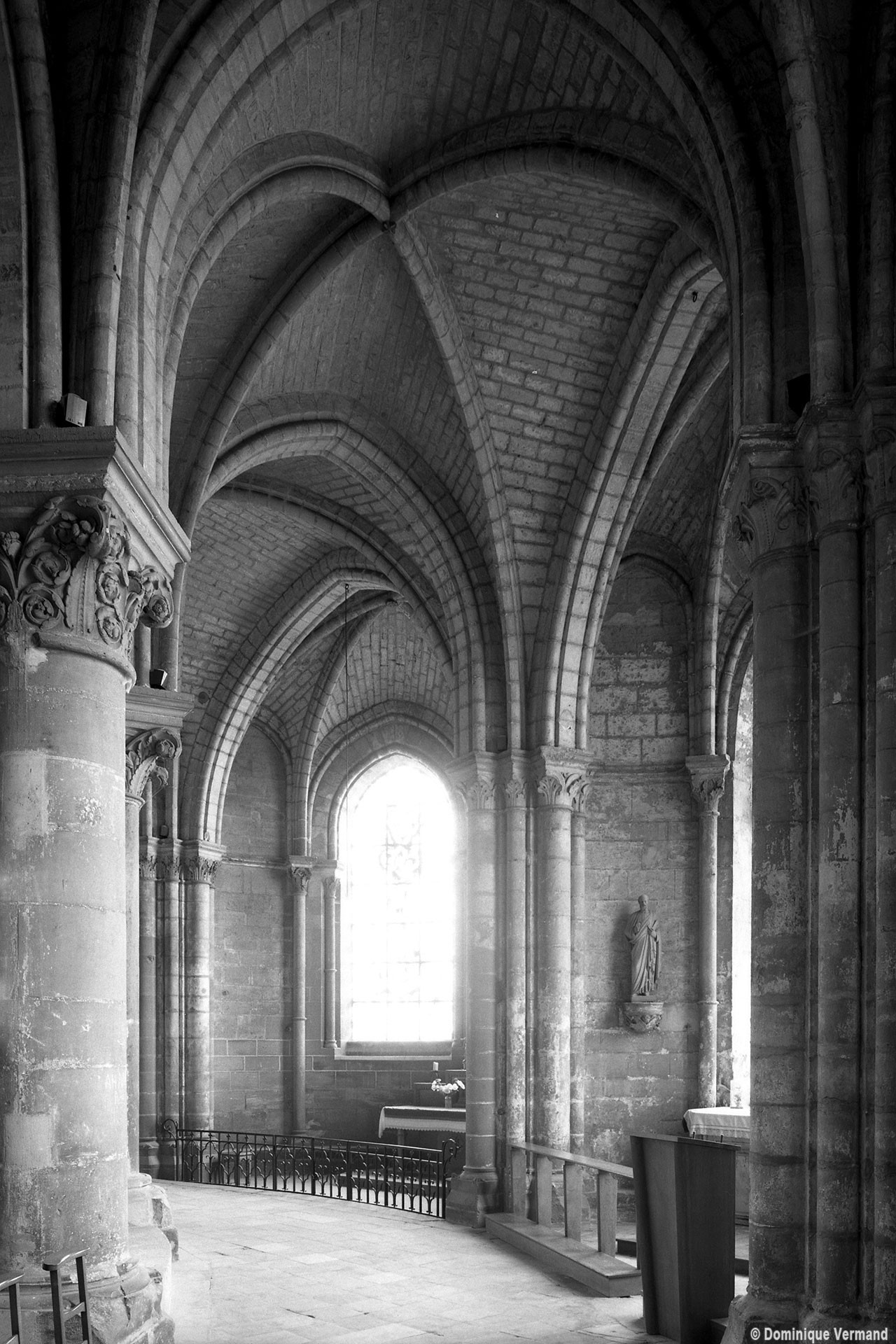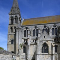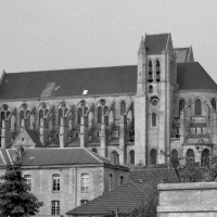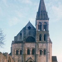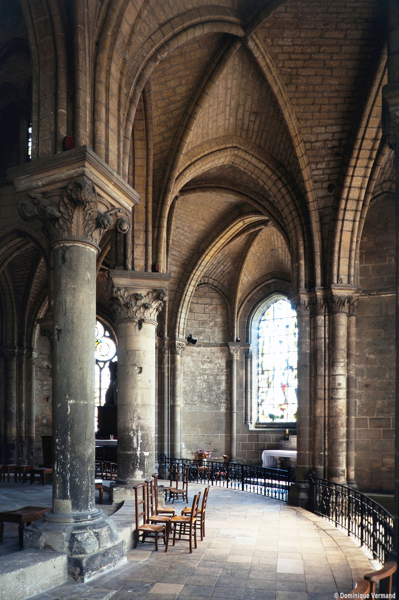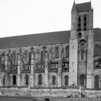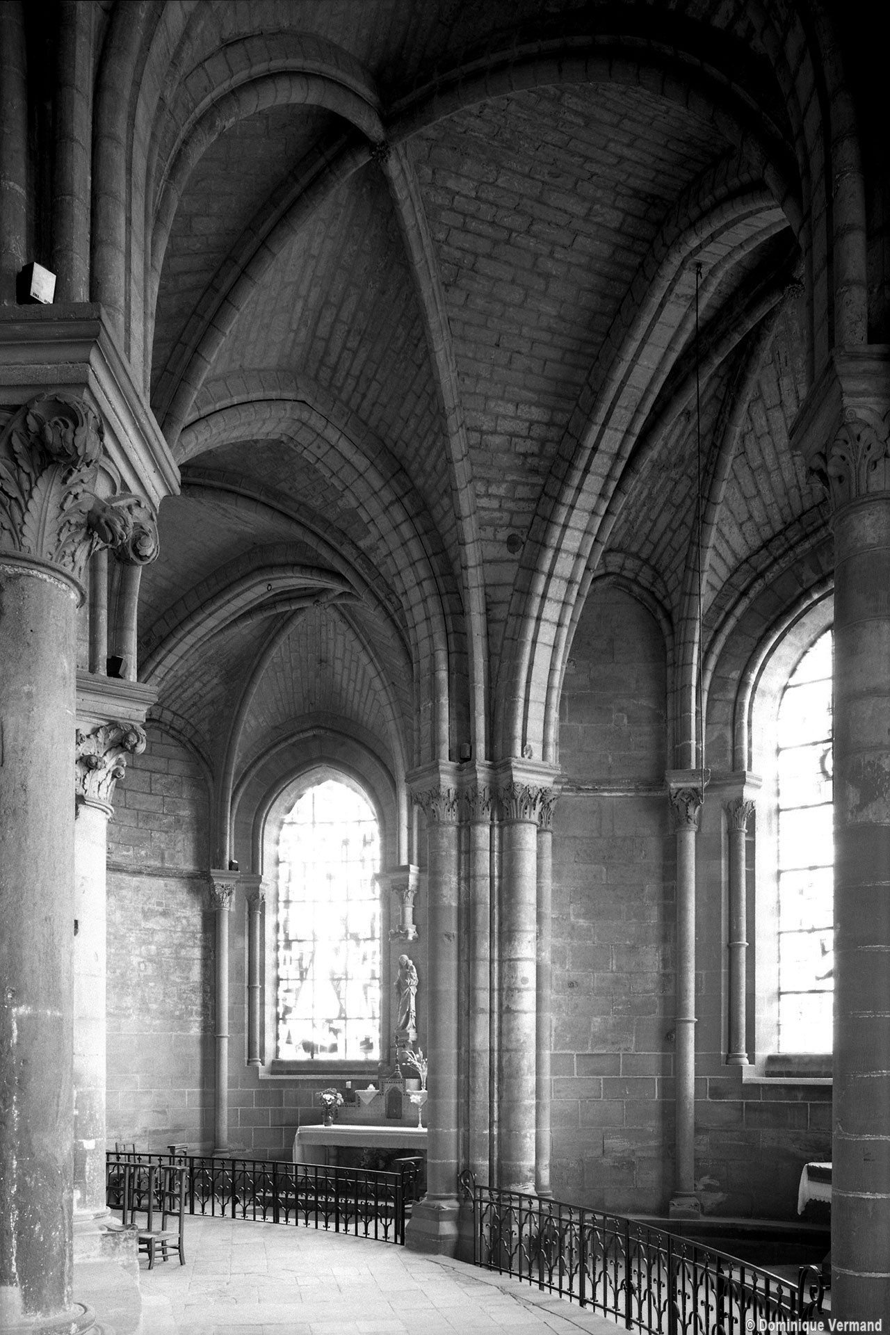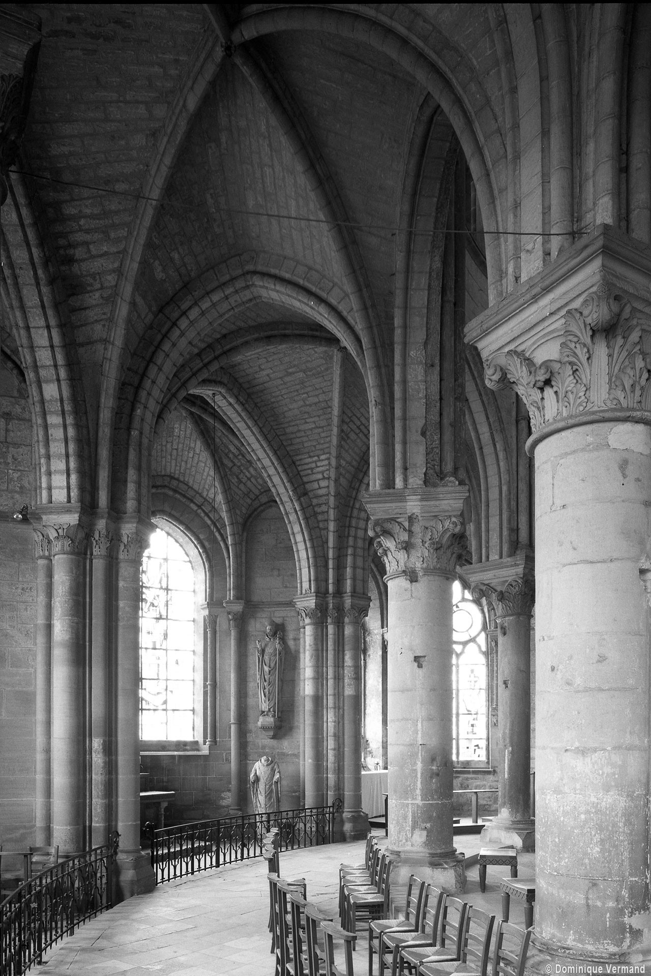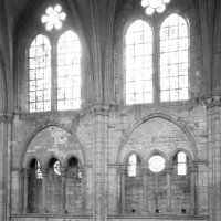 C’est au chœur, bâti à partir des années 1160 à l’est du chevet roman conservé pendant quelque temps encore, qu’il appartiendra de rompre avec cette architecture de “transition” en donnant une œuvre résolument gothique. Son plan comprend une travée double avec voûte sexpartite, suivie d’une travée simple correspondant aux deux tours et un hémicycle couvert d’une voûte à huit compartiments. Un bas-côté et un déambulatoire sur lequel se greffent cinq chapelles rayonnantes contiguës contournent l’ensemble.