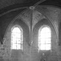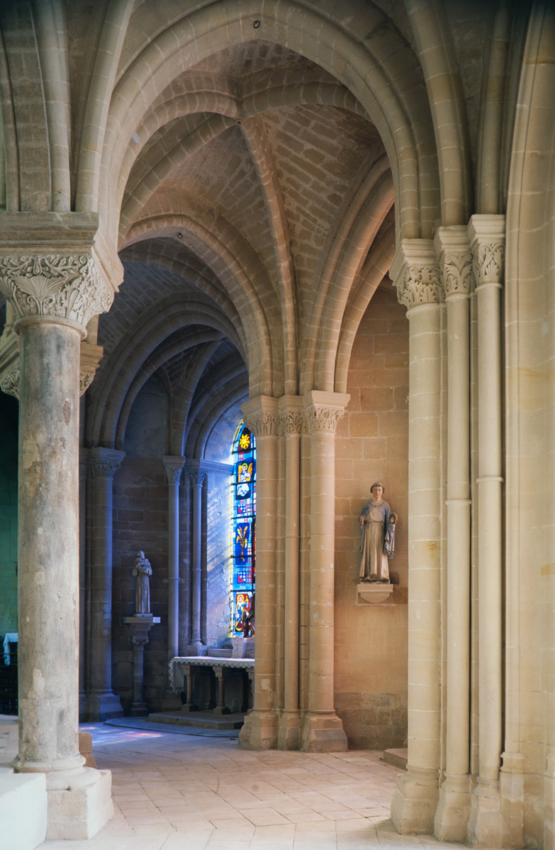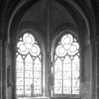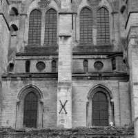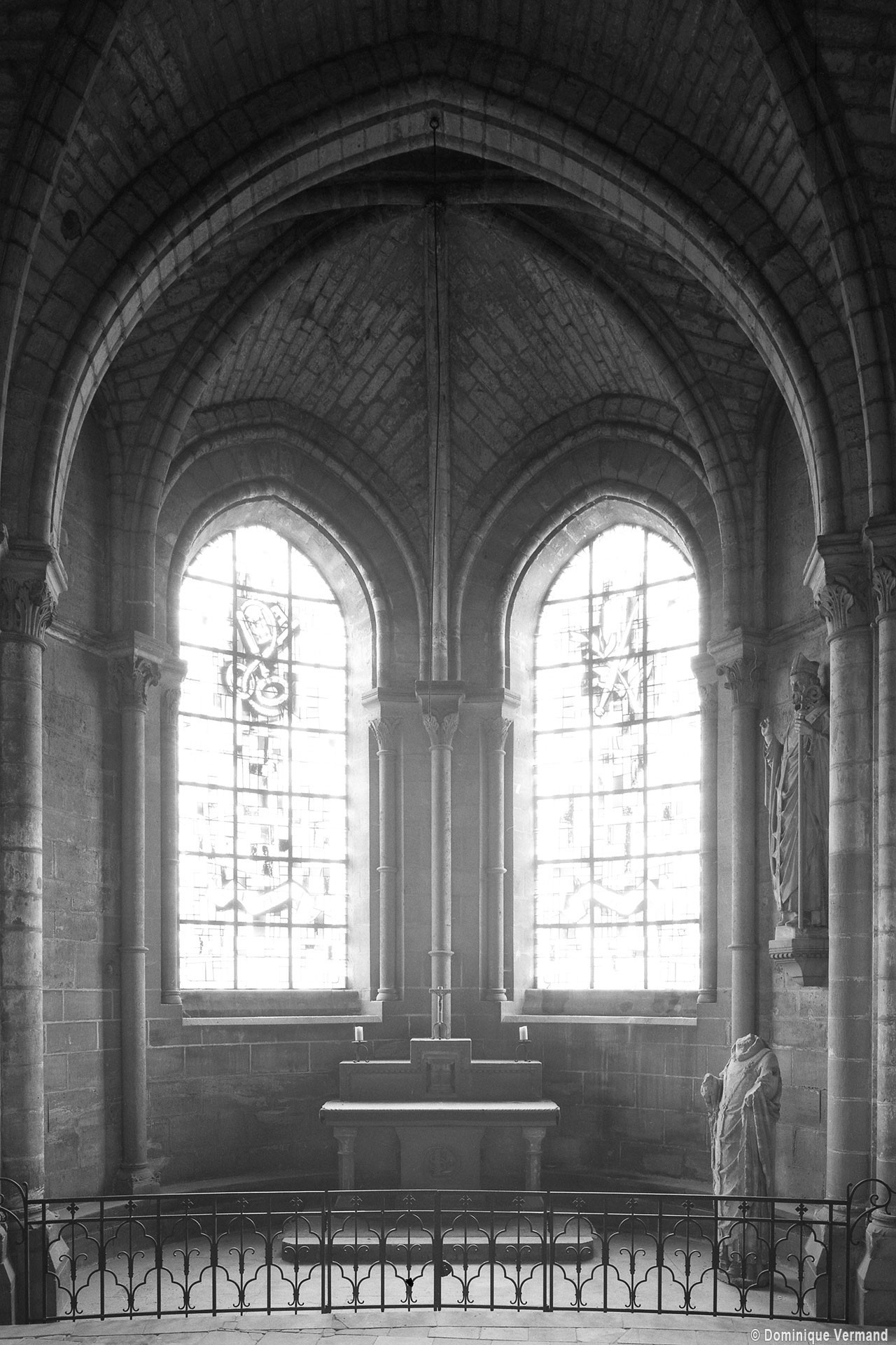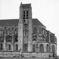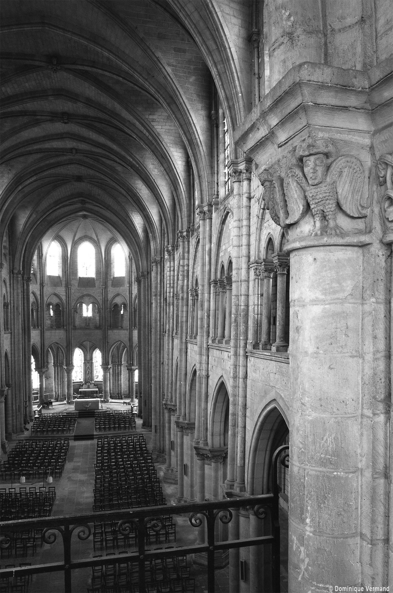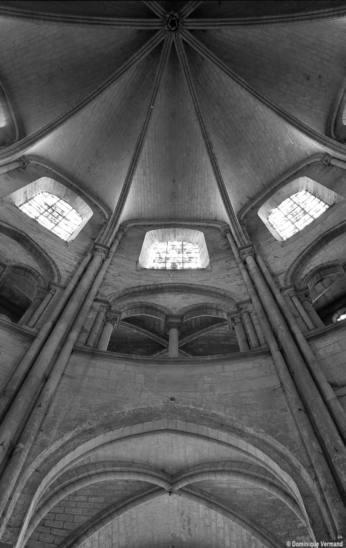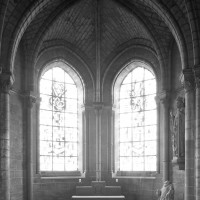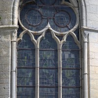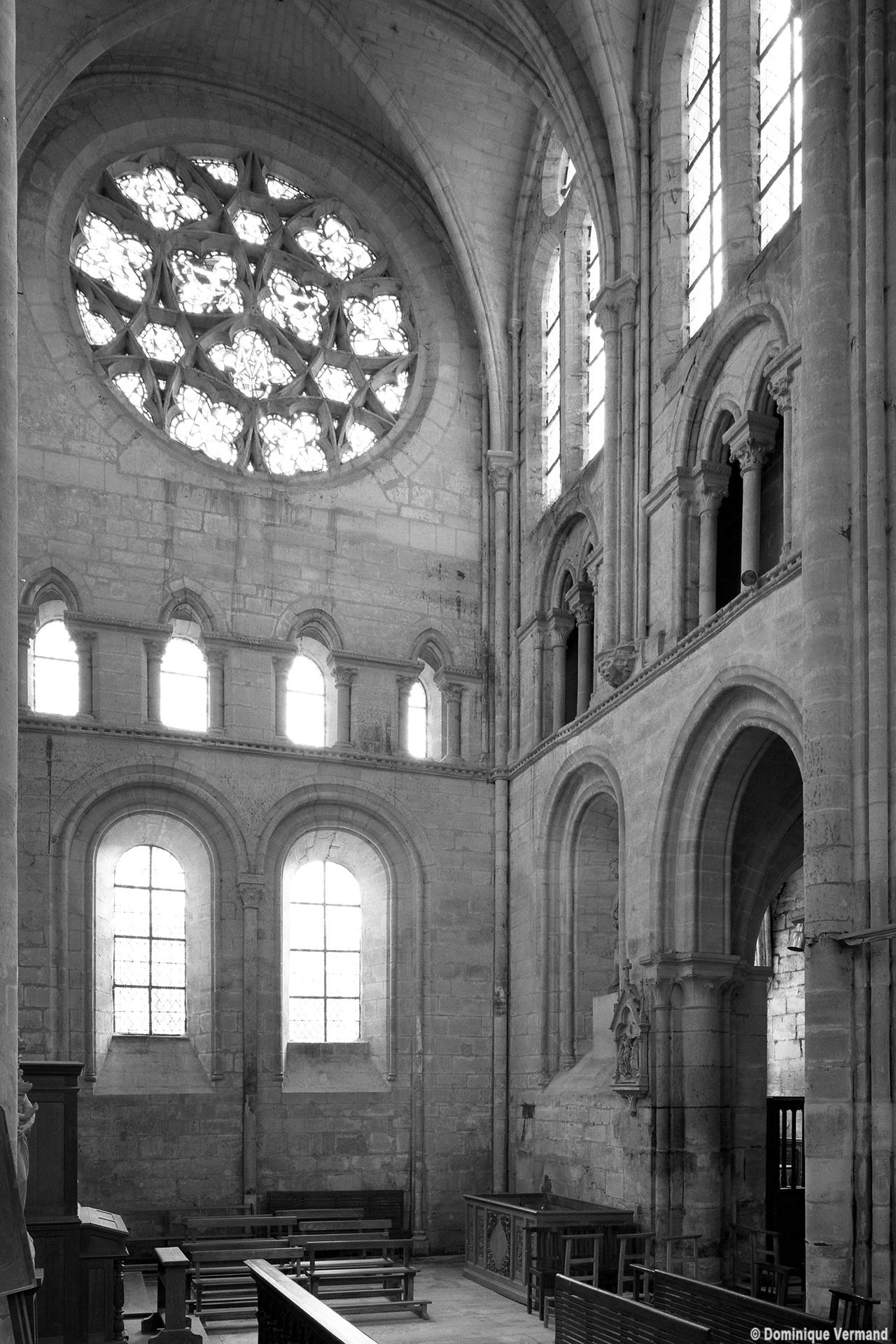 C’est au chœur, bâti à partir des années 1160 à l’est du chevet roman conservé pendant quelque temps encore, qu’il appartiendra de rompre avec cette architecture de “transition” en donnant une œuvre résolument gothique. Son plan comprend une travée double avec voûte sexpartite, suivie d’une travée simple correspondant aux deux tours et un hémicycle couvert d’une voûte à huit compartiments. Un bas-côté et un déambulatoire sur lequel se greffent cinq chapelles rayonnantes contiguës contournent l’ensemble.