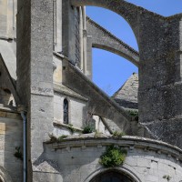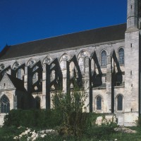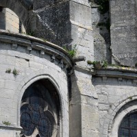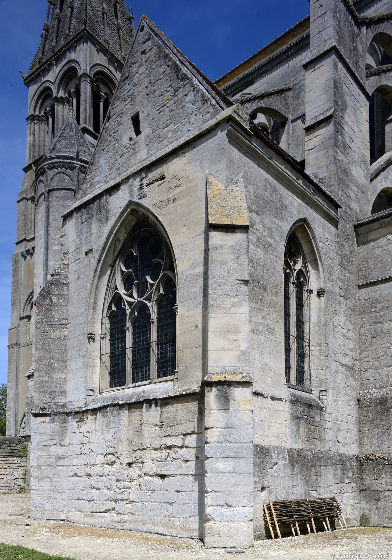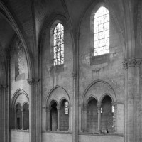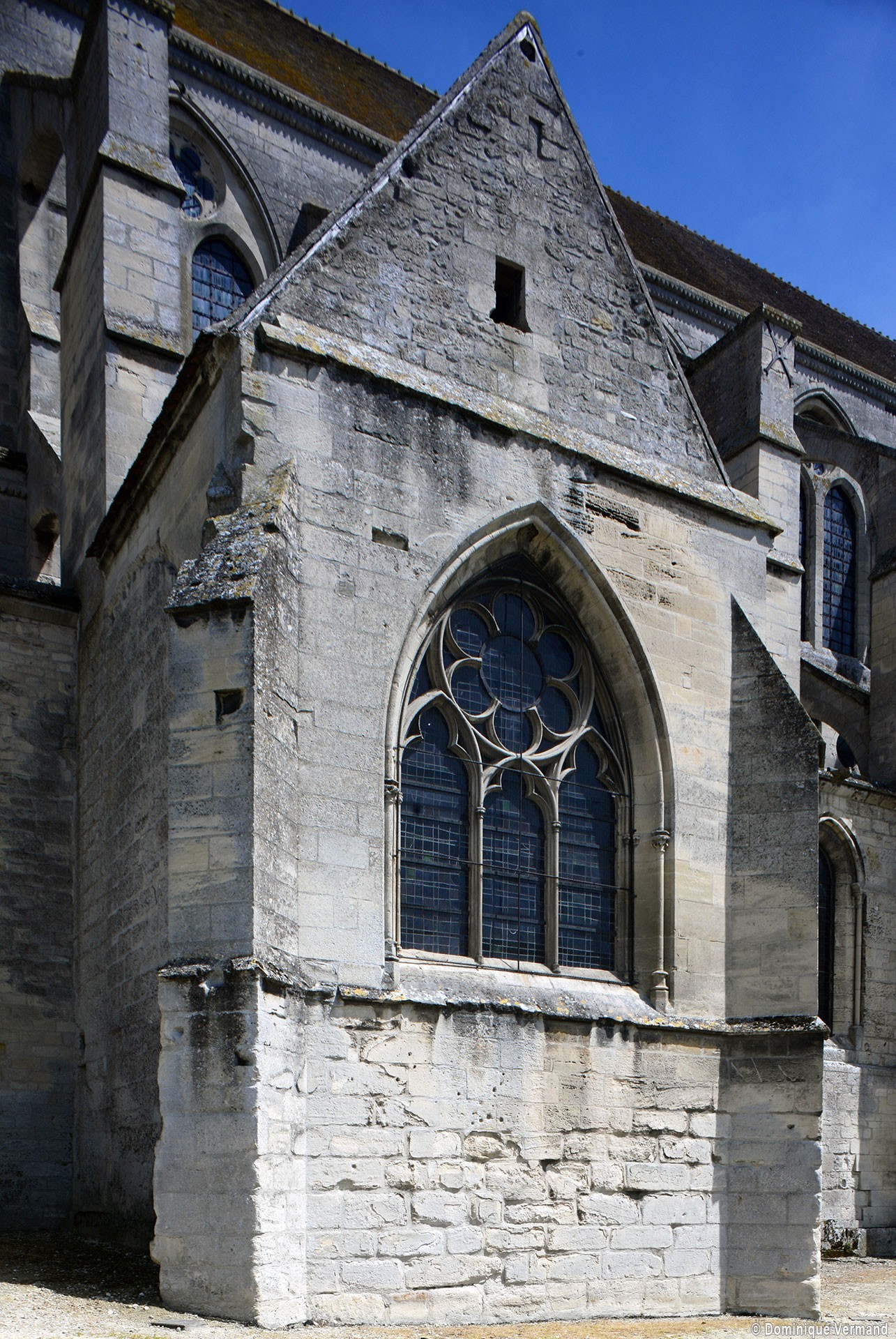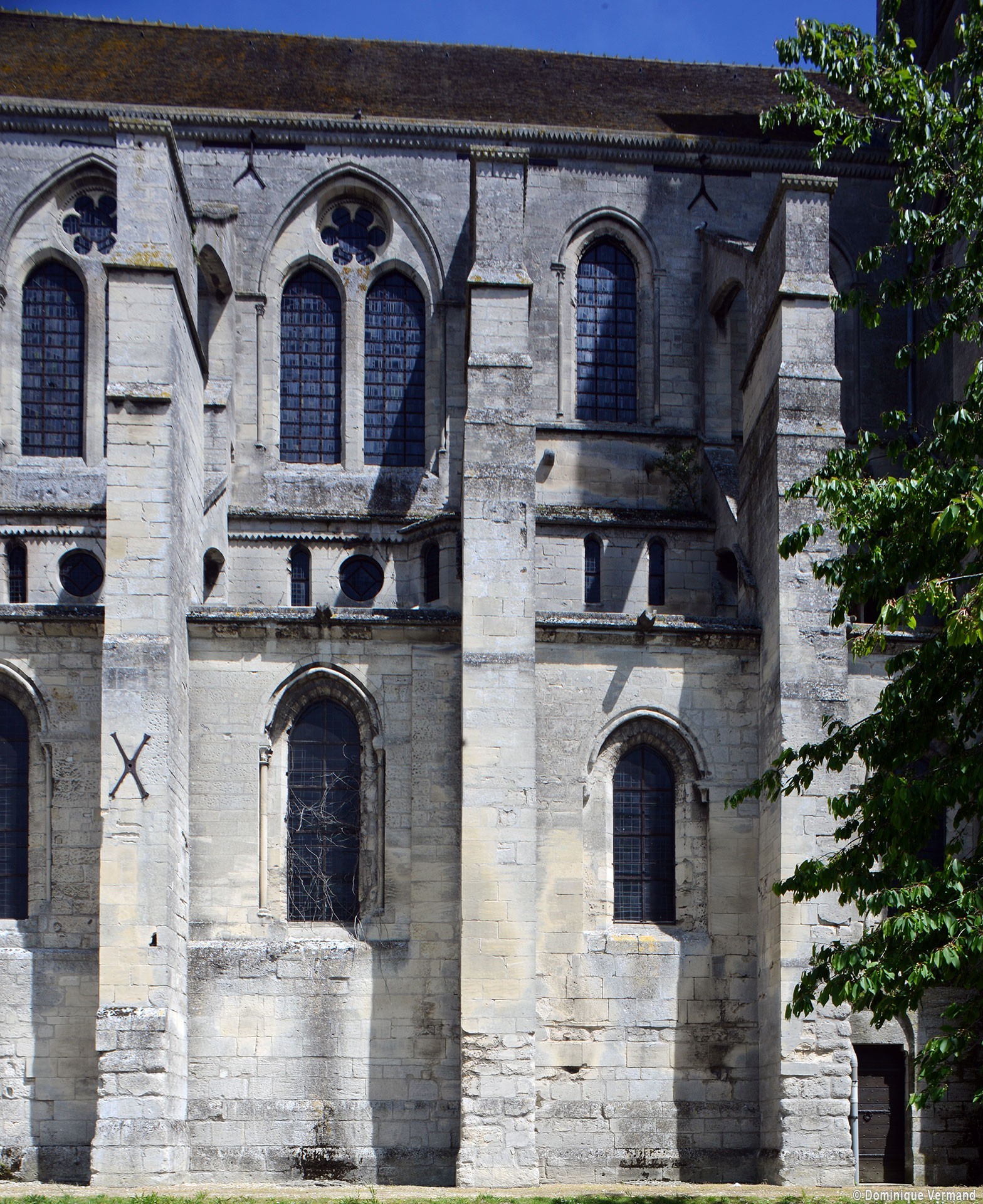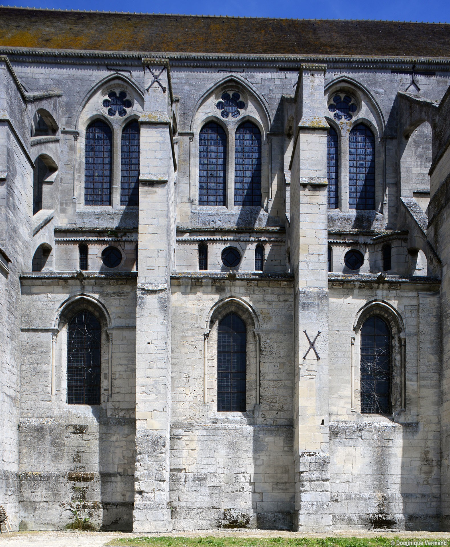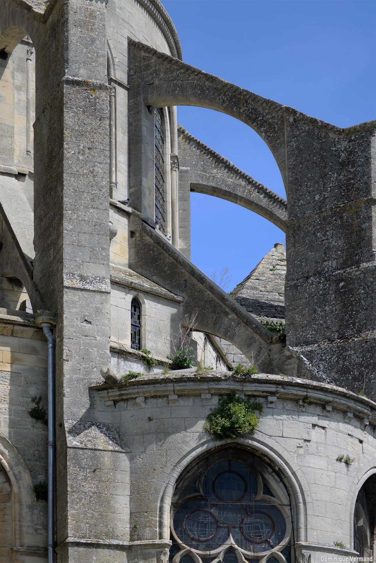 La construction des parties hautes du chœur, achevée avant la fin du 12e siècle, s’accompagnera de la mise en œuvre d’arcs-boutants, semble-t-il non prévus au moment de l’édification des chapelles rayonnantes. Contemporaine de ces travaux, une chapelle haute dont le rôle est d’ailleurs mal défini surmonte la chapelle axiale. L’étage intermédiaire sera repris au 13e siècle, lors de la construction de la nef, et les larges mais sombres tribunes sous comble feront place à une étroite galerie de circulation (triforium) éclairée d’une petite fenêtre par travée. Achevées les dernières, les deux tours de chevet inscrivent Saint-Leu dans la longue tradition, d’origine carolingienne, des chevets dits harmoniques et dont Morienval constitue, dans la région, un bel exemple pour l’époque romane.