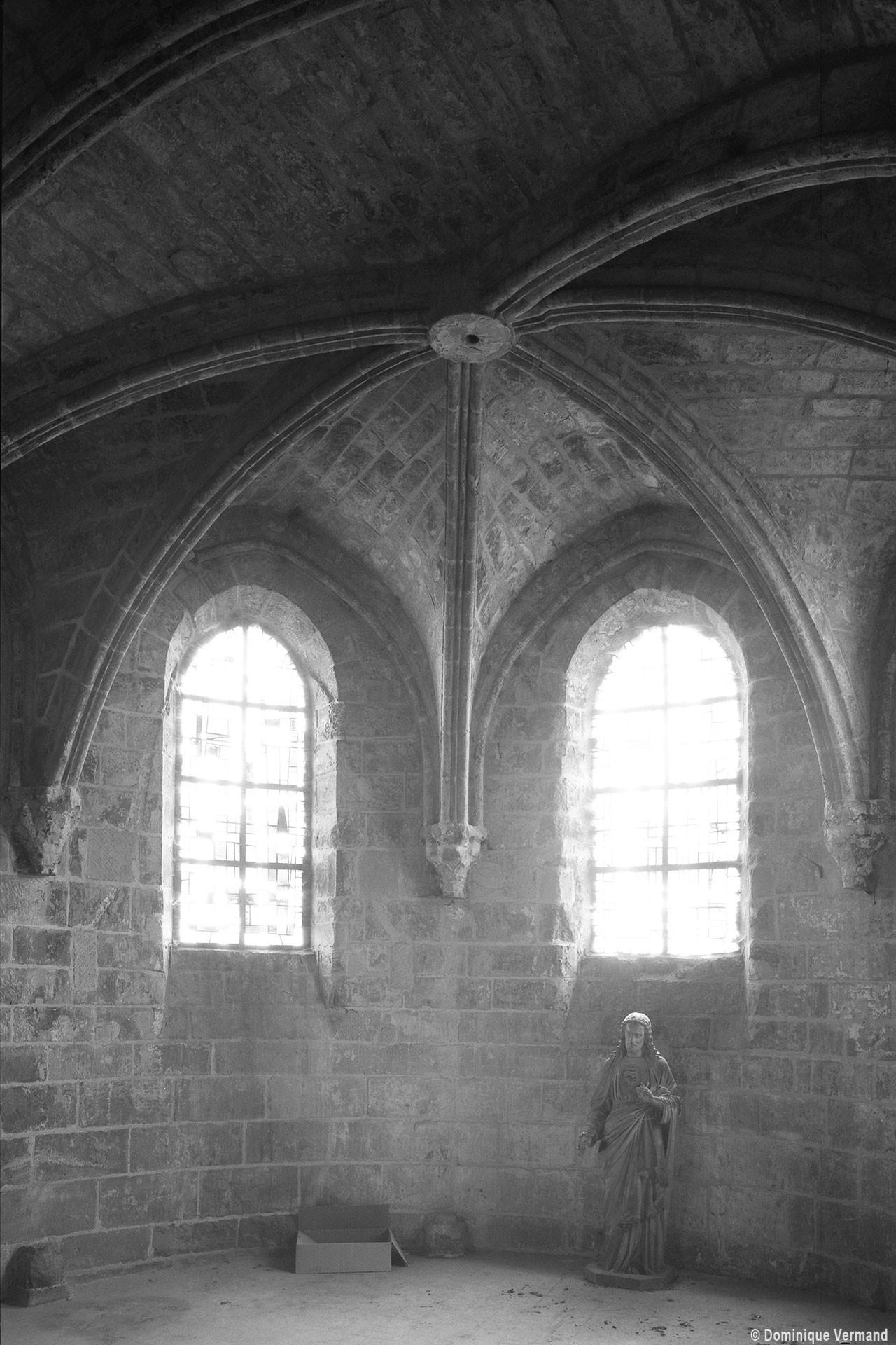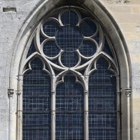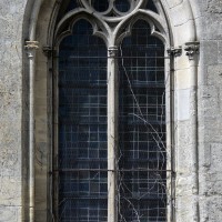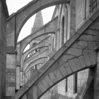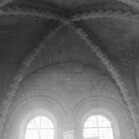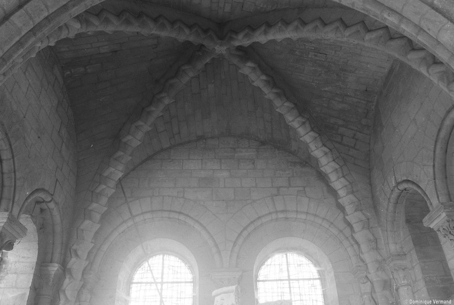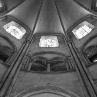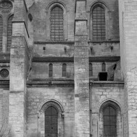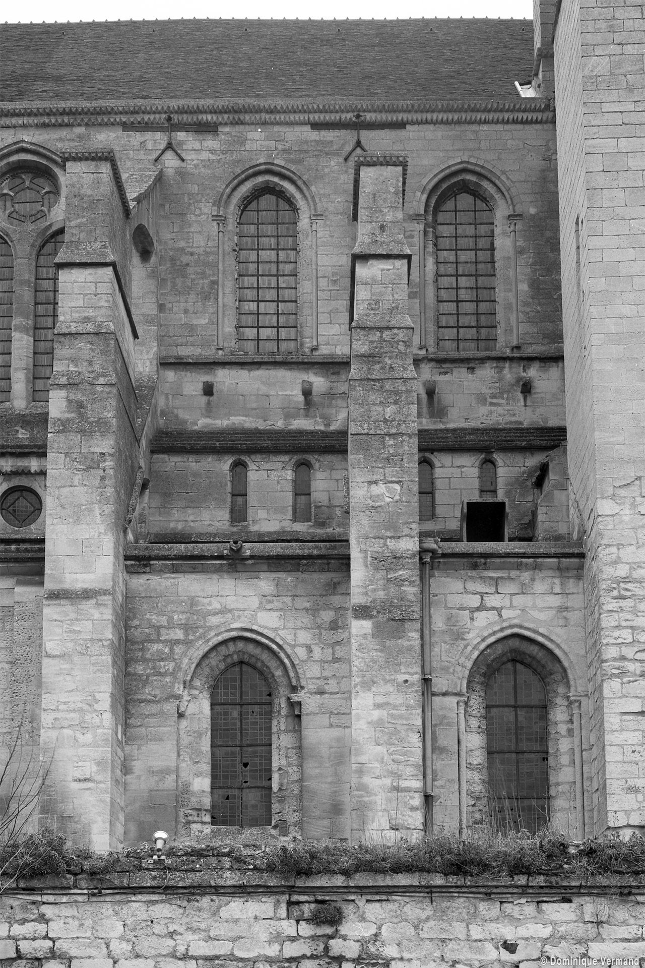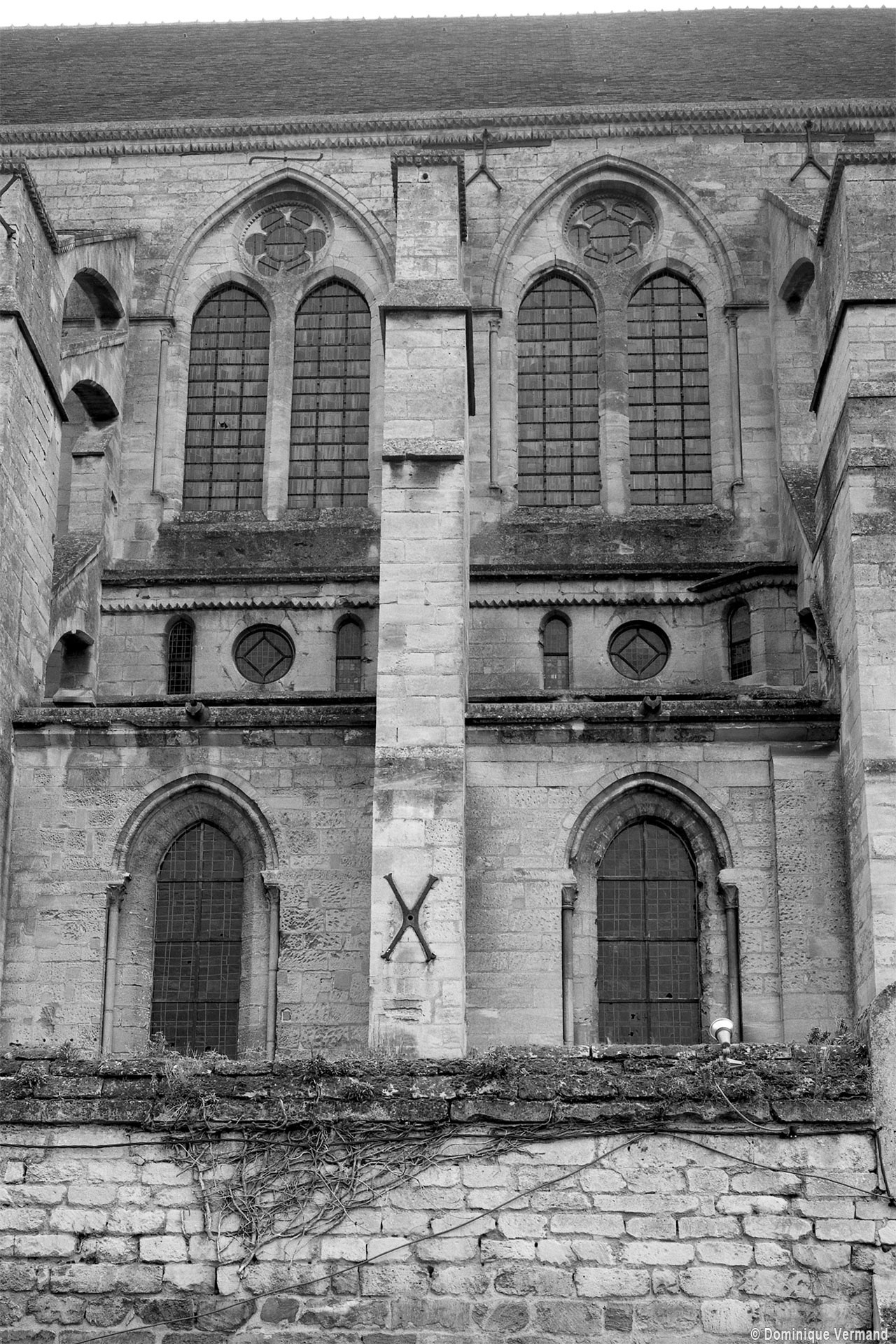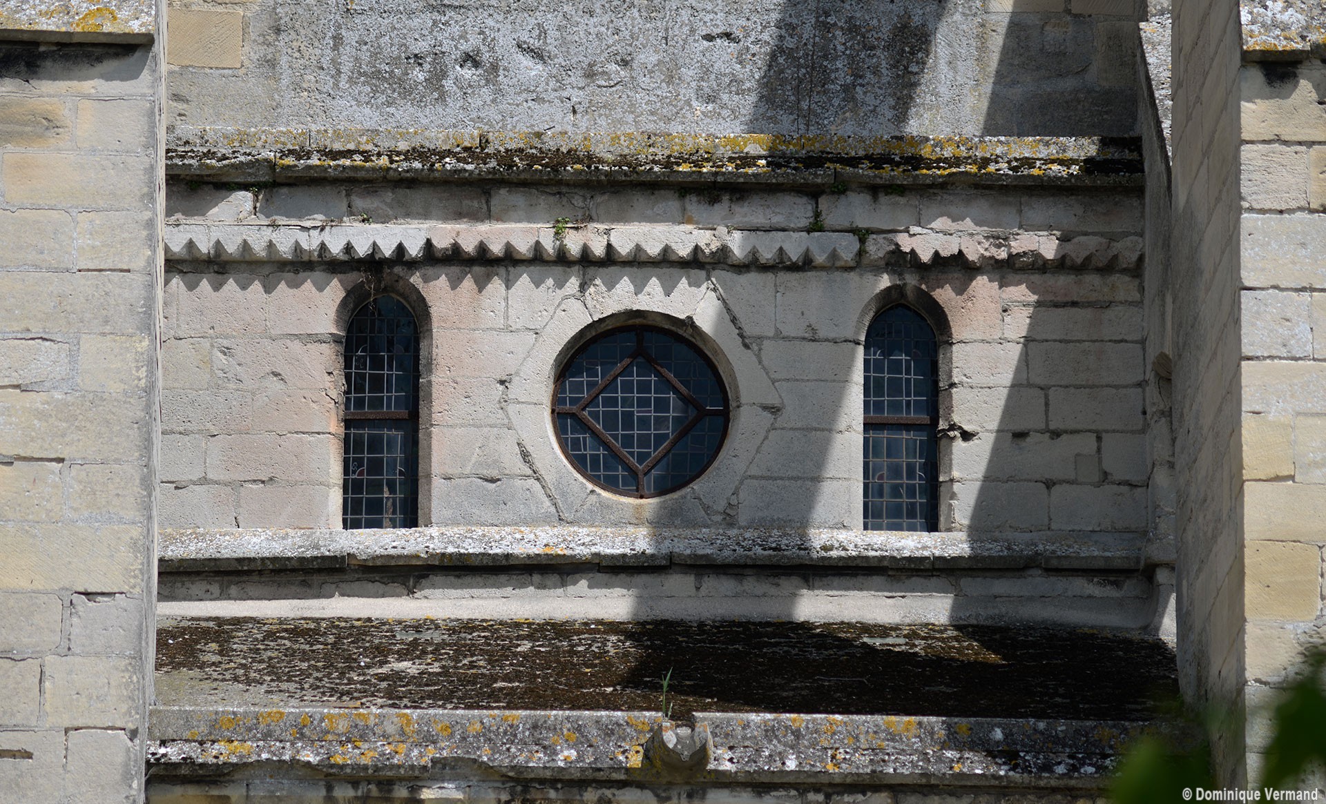 La construction des parties hautes du chœur, achevée avant la fin du 12e siècle, s’accompagnera de la mise en œuvre d’arcs-boutants, semble-t-il non prévus au moment de l’édification des chapelles rayonnantes. Contemporaine de ces travaux, une chapelle haute dont le rôle est d’ailleurs mal défini surmonte la chapelle axiale. L’étage intermédiaire sera repris au 13e siècle, lors de la construction de la nef, et les larges mais sombres tribunes sous comble feront place à une étroite galerie de circulation (triforium) éclairée d’une petite fenêtre par travée. Achevées les dernières, les deux tours de chevet inscrivent Saint-Leu dans la longue tradition, d’origine carolingienne, des chevets dits harmoniques et dont Morienval constitue, dans la région, un bel exemple pour l’époque romane.