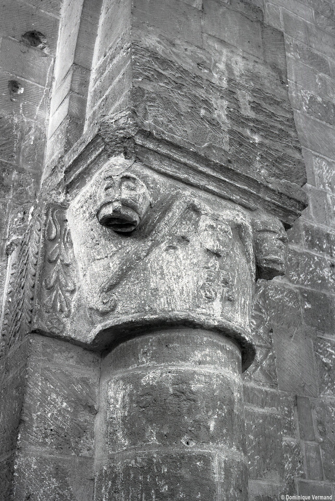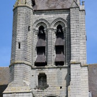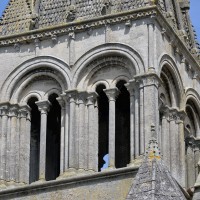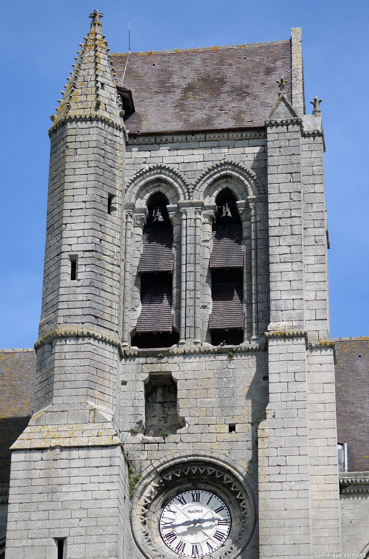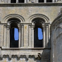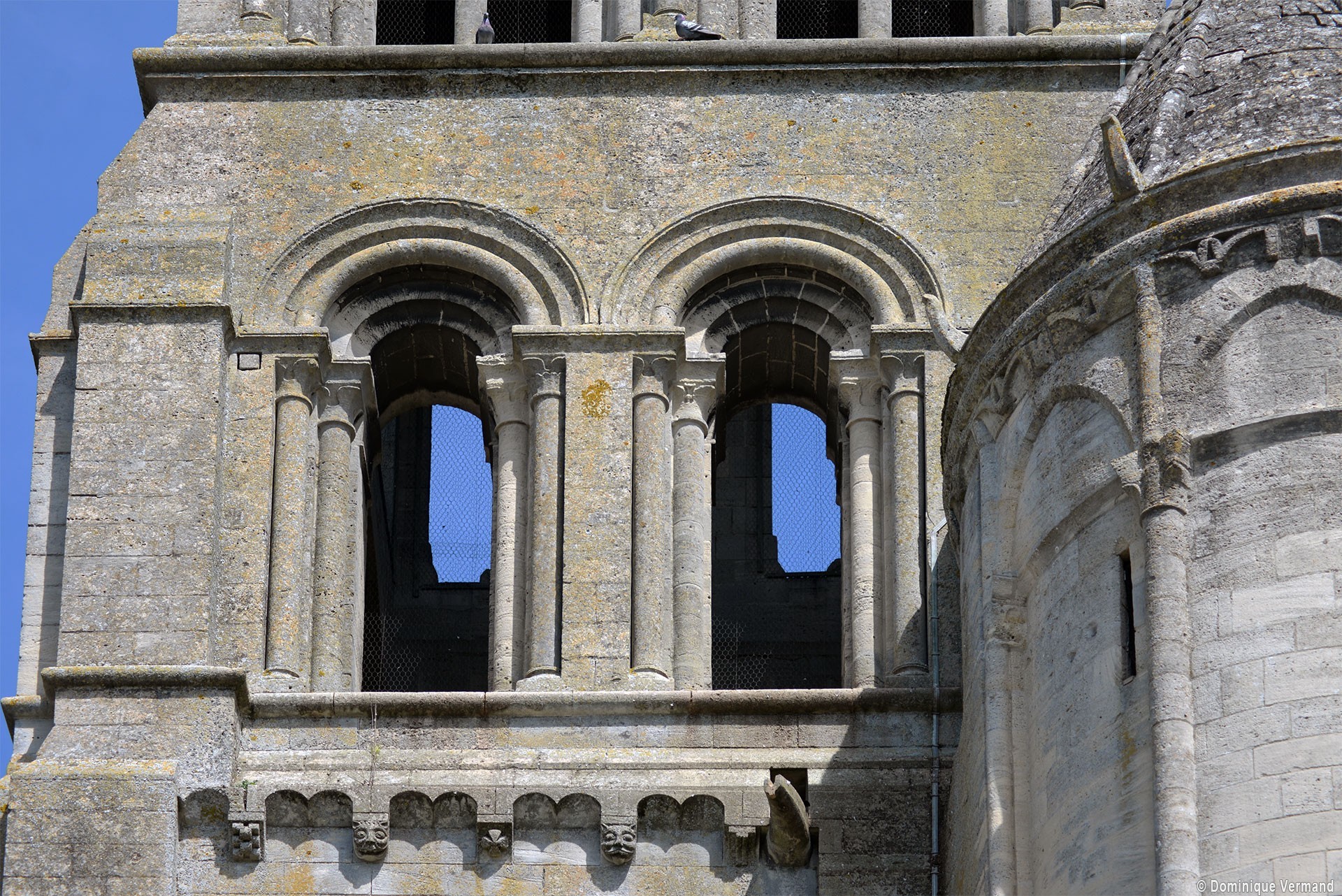 Trop refait, le rez-de-chaussée se signale toutefois par son portail à trois rangées de voussures décorées de bâtons brisés, semblable à celui qui, au nord, donnait accès au prieuré. Au-dessus d’une frise de feuilles d’acanthe, l’étage supérieur est éclairé par des fenêtres en plein cintre groupées par deux et dont les archivoltes et les piédroits sont soulignés de tores et de colonnettes. Bien que peu saillants, les contreforts marquent clairement la division de la façade en trois parties. Seule construite, la tour méridionale comporte deux étages de baies géminées en plein cintre, celles du second étage, plus importantes, étant subdivisées par une colonnette. Une haute flèche octogonale cantonnée de pyramidions d’angle la couronne.