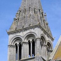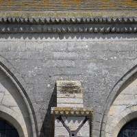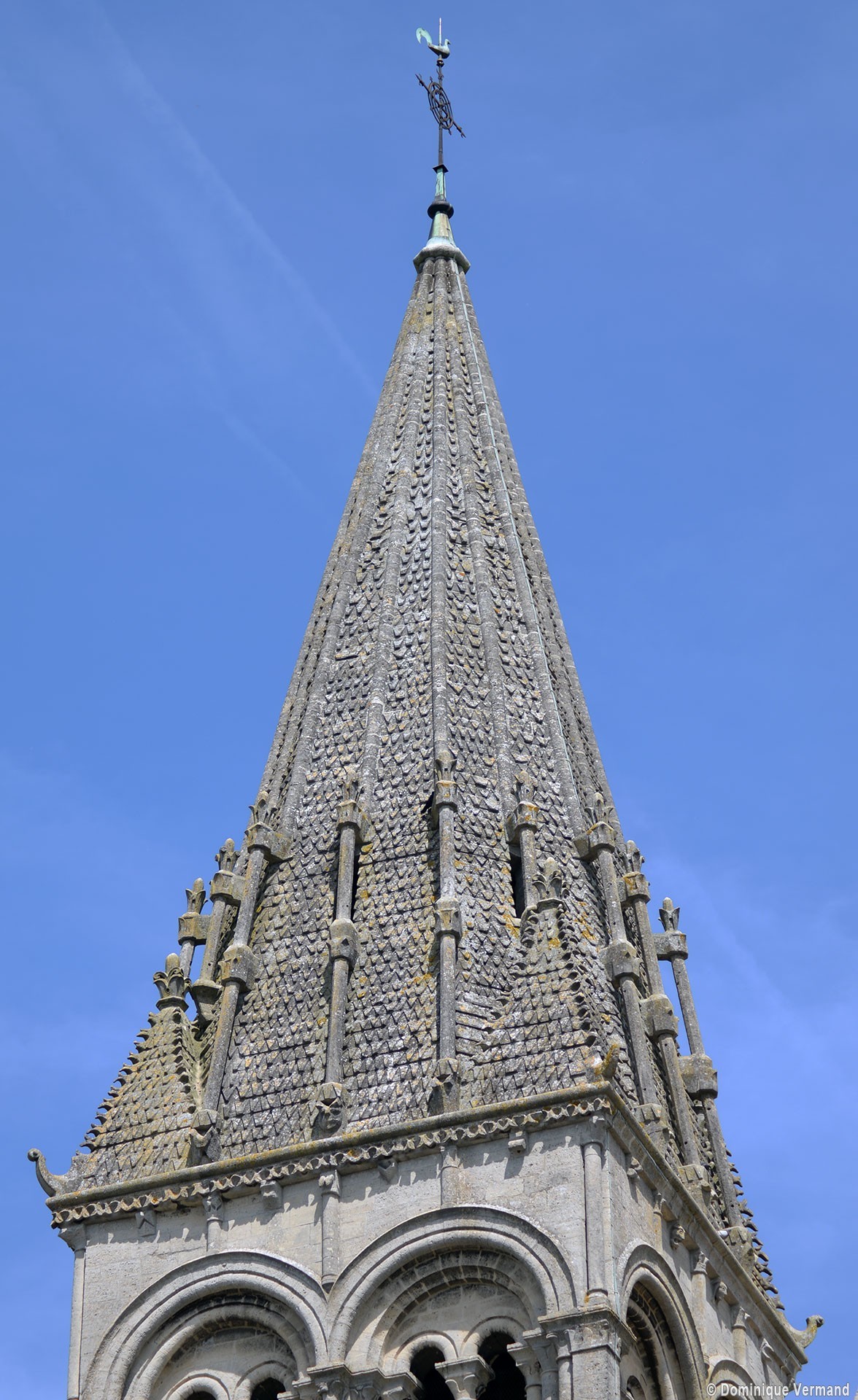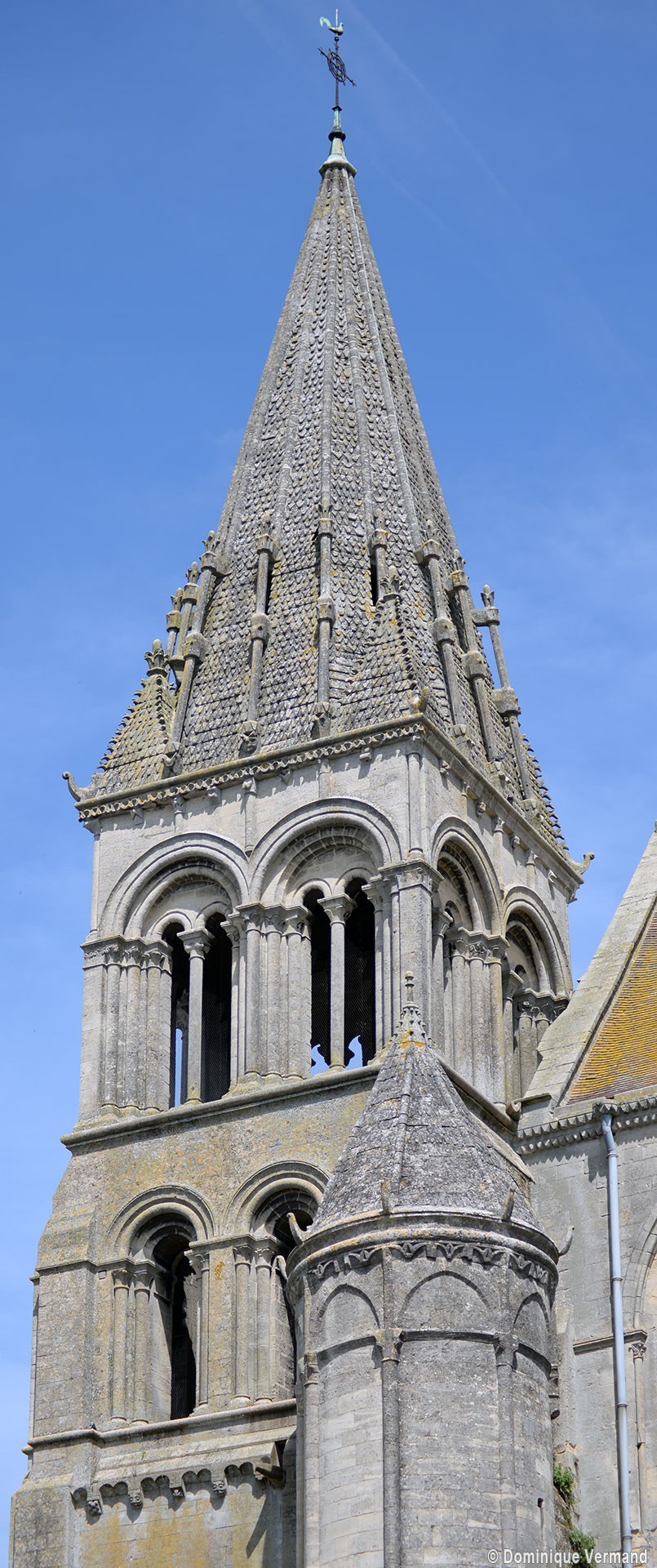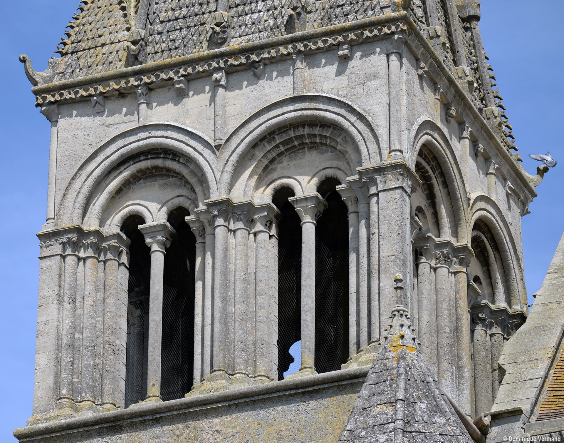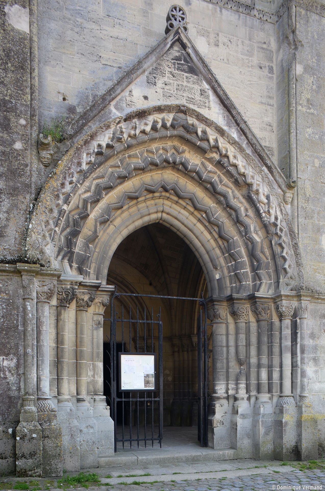 Trop refait, le rez-de-chaussée se signale toutefois par son portail à trois rangées de voussures décorées de bâtons brisés, semblable à celui qui, au nord, donnait accès au prieuré. Au-dessus d’une frise de feuilles d’acanthe, l’étage supérieur est éclairé par des fenêtres en plein cintre groupées par deux et dont les archivoltes et les piédroits sont soulignés de tores et de colonnettes. Bien que peu saillants, les contreforts marquent clairement la division de la façade en trois parties. Seule construite, la tour méridionale comporte deux étages de baies géminées en plein cintre, celles du second étage, plus importantes, étant subdivisées par une colonnette. Une haute flèche octogonale cantonnée de pyramidions d’angle la couronne.
