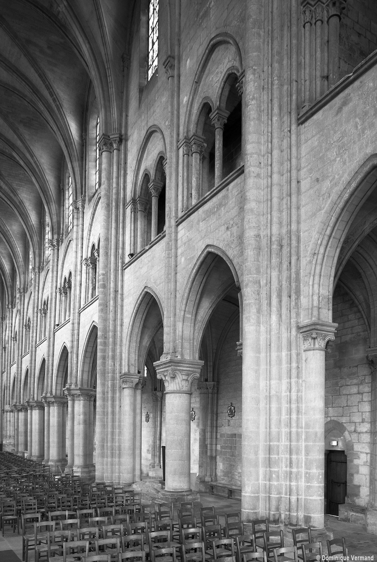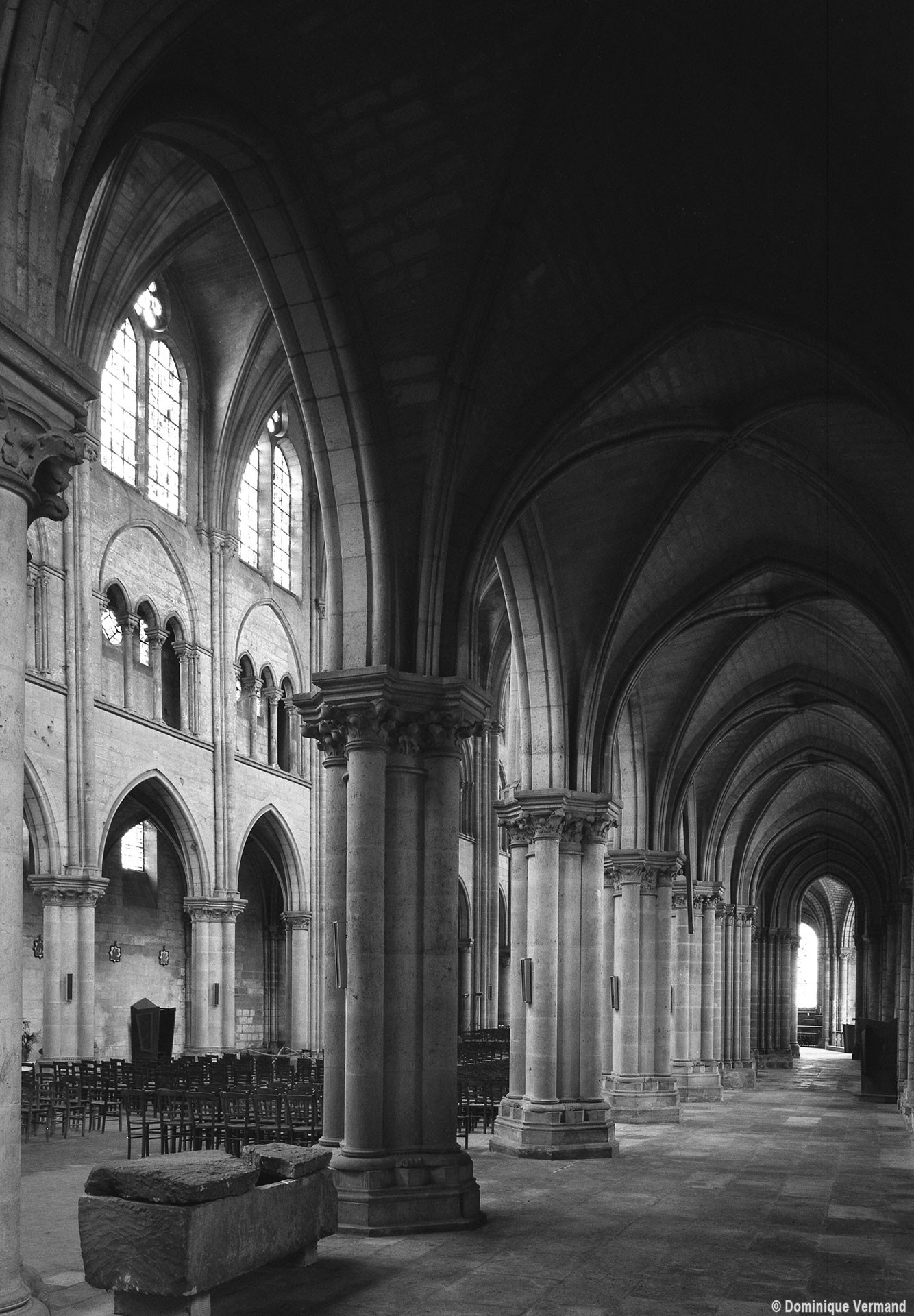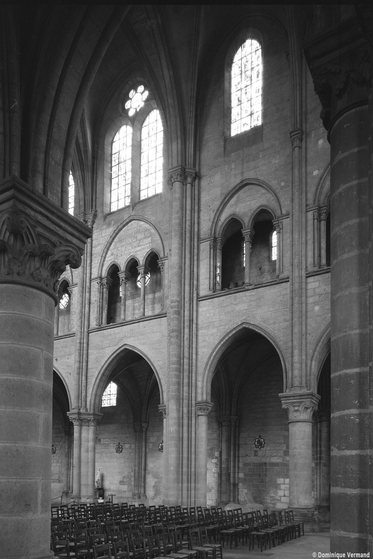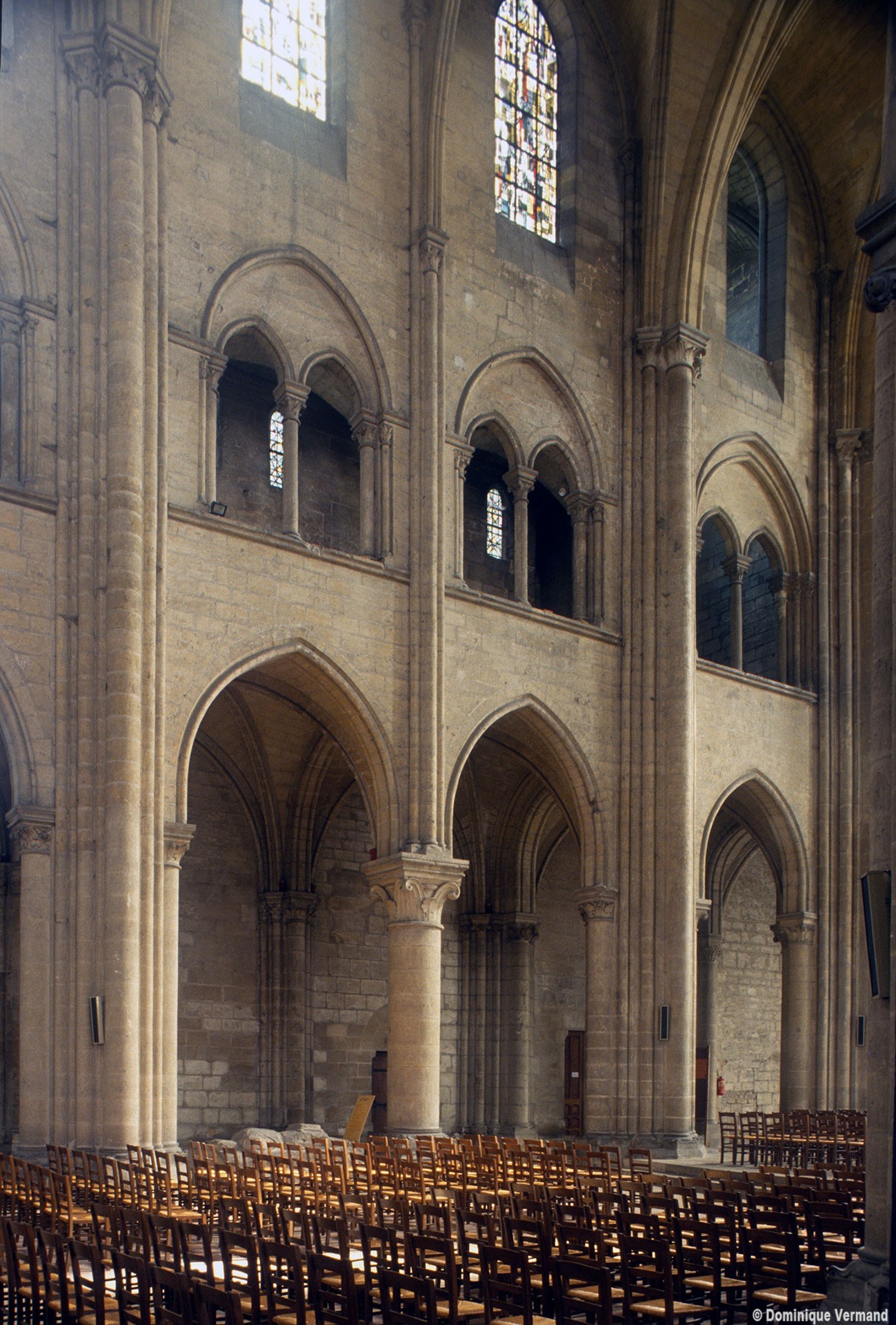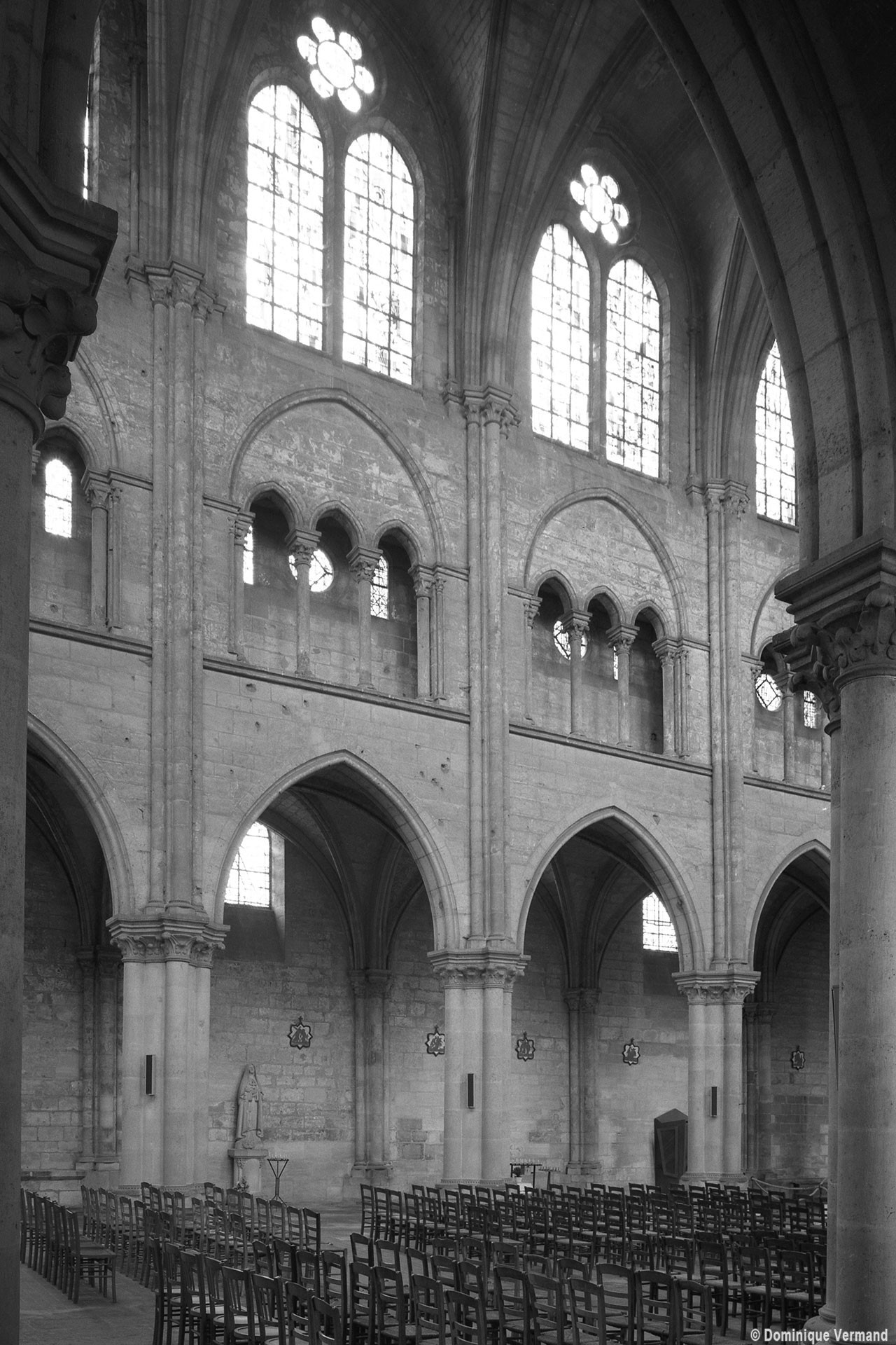 C’est à partir du début du 13e siècle que sera entreprise la jonction entre les deux extrémités de l’édifice avec l’édification de la nef. Ses six travées sont couvertes de voûtes quadripartites et non plus sexpartites comme dans la travée droite du chœur. L’élévation reste à trois étages mais les grandes arcades retombent désormais sur des piliers cantonnés – quatre demi colonnes greffées sur un noyau circulaire -, un type rencontré dans nombre d’édifices majeurs de ce temps. De même, les fenêtres hautes composées de deux lancettes surmontées d’une rose à six lobes appartiennent-elles à un type initié à Soissons et à Chartres tandis que le triforium passage de l’étage intermédiaire est la formule qui prévaut partout. Les petites fenêtres qui ajourent celui de Saint-Leu en font cependant l’un des premiers de ce type avec celui de Mello. Le triforium ajouré connaîtra par la suite un vif succès dans l’architecture rayonnante.