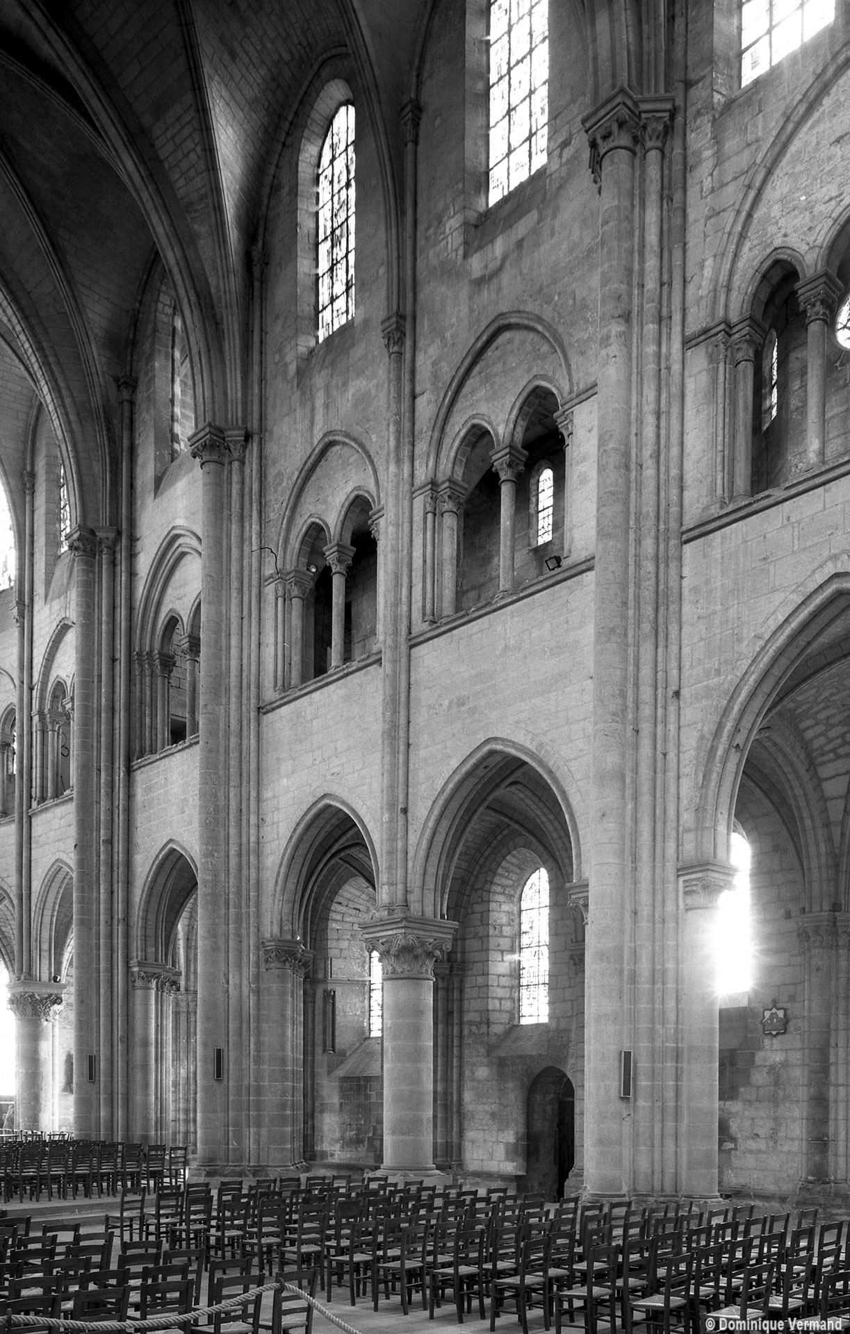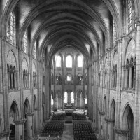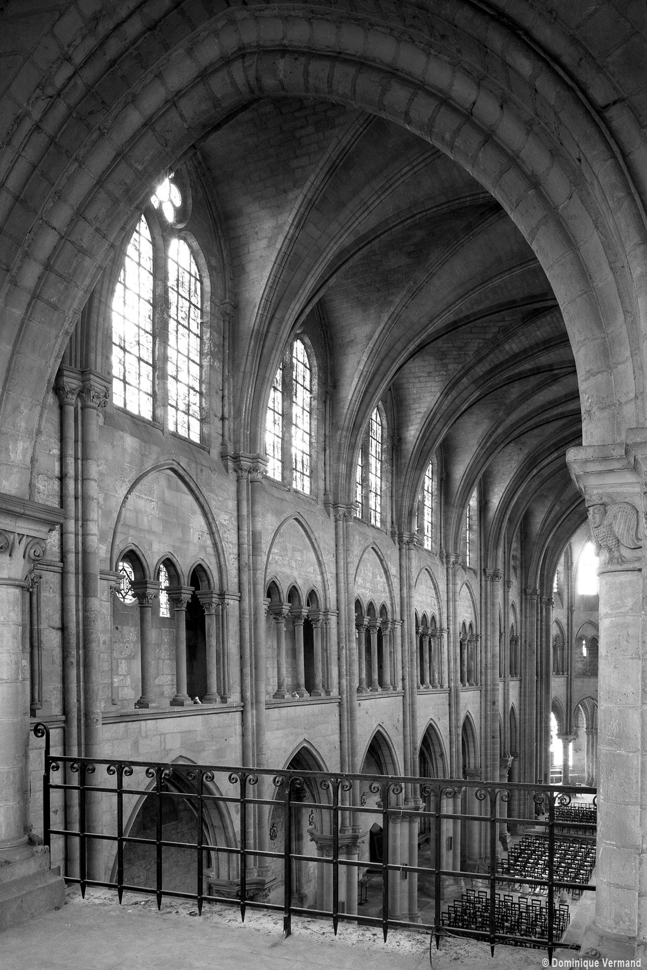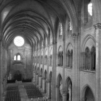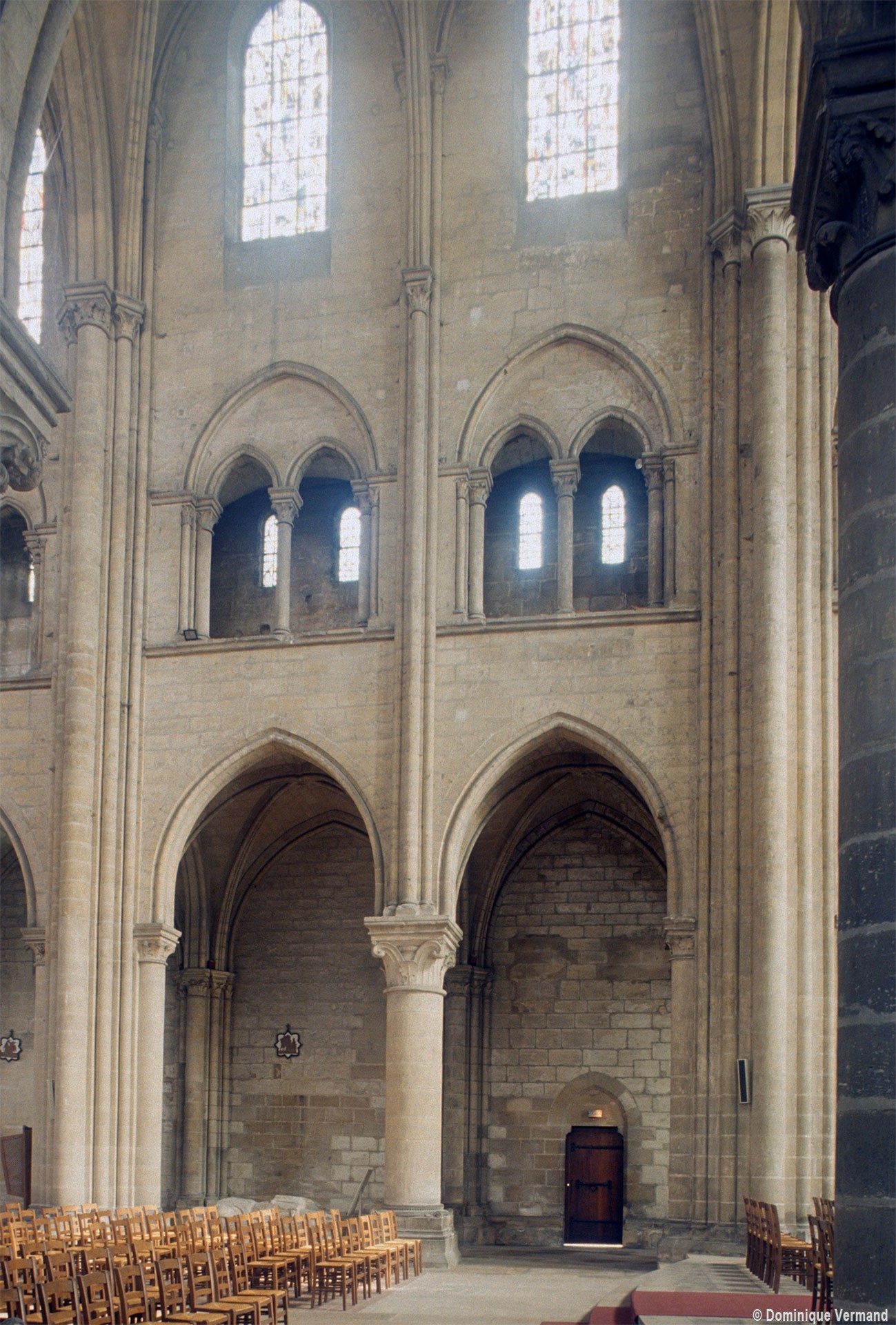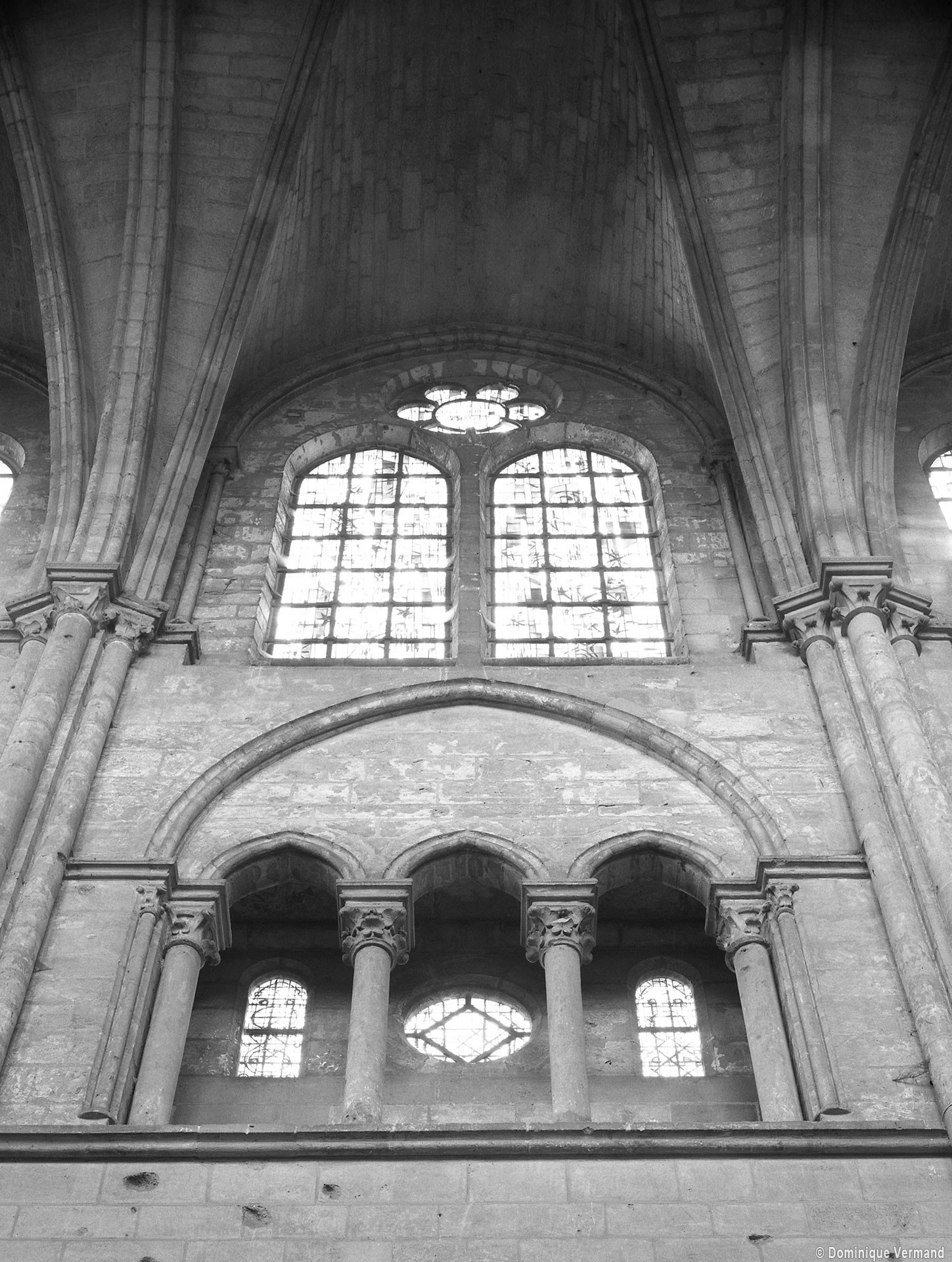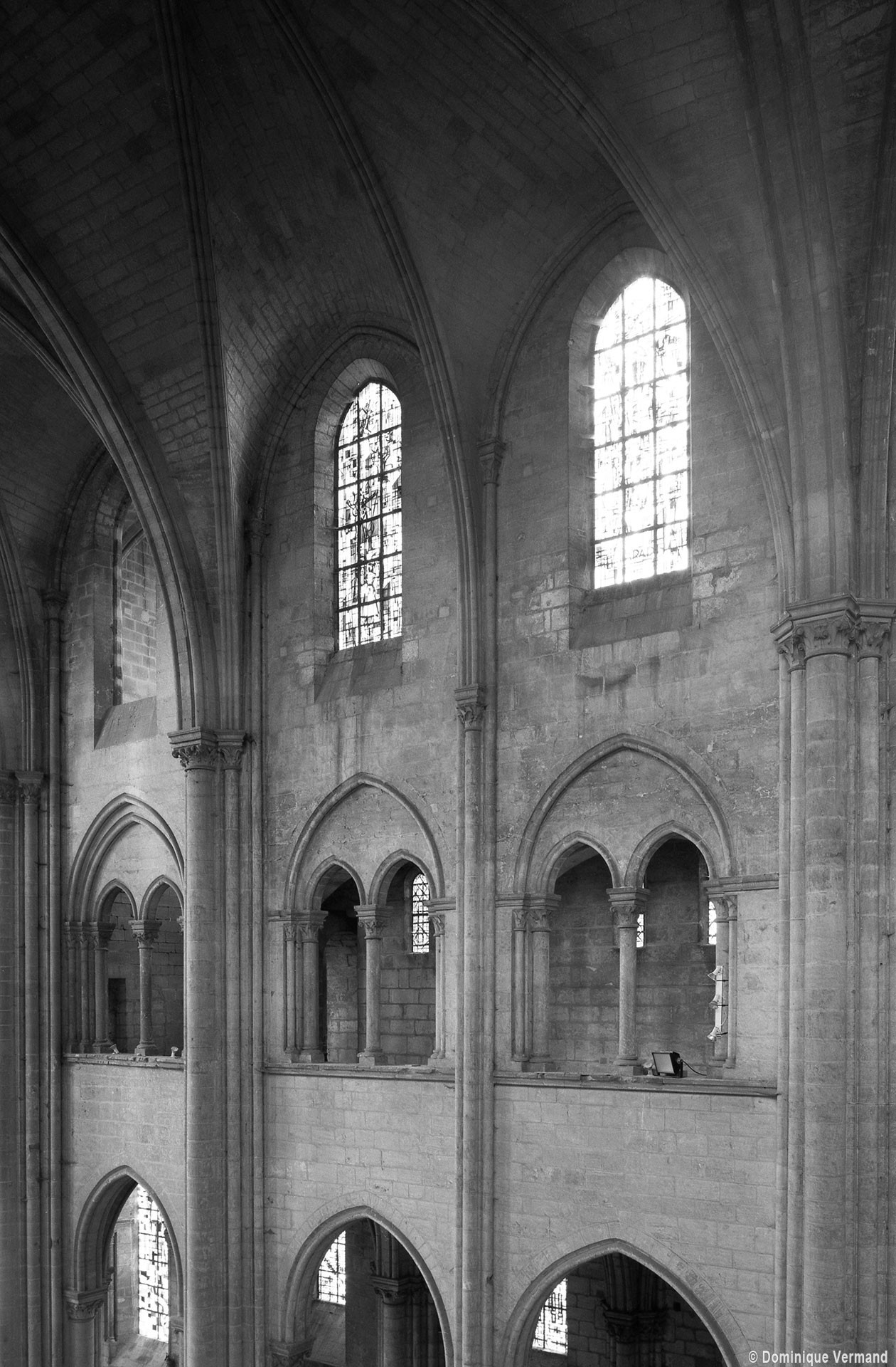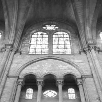C’est à partir du début du 13e siècle que sera entreprise la jonction entre les deux extrémités de l’édifice avec l’édification de la nef. Ses six travées sont couvertes de voûtes quadripartites et non plus sexpartites comme dans la travée droite du chœur. L’élévation reste à trois étages mais les grandes arcades retombent désormais sur des piliers cantonnés – quatre demi colonnes greffées sur un noyau circulaire -, un type rencontré dans nombre d’édifices majeurs de ce temps. De même, les fenêtres hautes composées de deux lancettes surmontées d’une rose à six lobes appartiennent-elles à un type initié à Soissons et à Chartres tandis que le triforium passage de l’étage intermédiaire est la formule qui prévaut partout. Les petites fenêtres qui ajourent celui de Saint-Leu en font cependant l’un des premiers de ce type avec celui de Mello. Le triforium ajouré connaîtra par la suite un vif succès dans l’architecture rayonnante.
