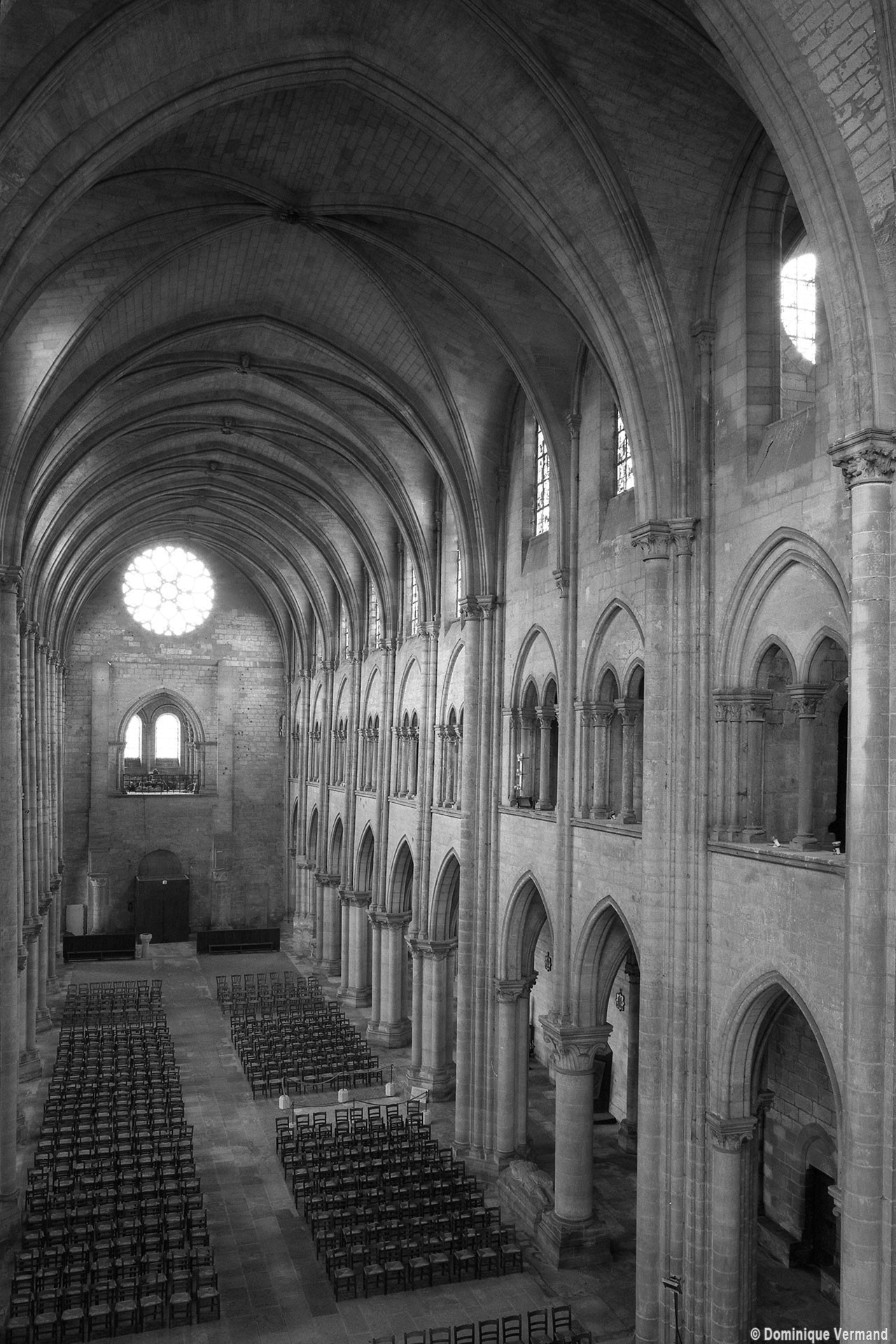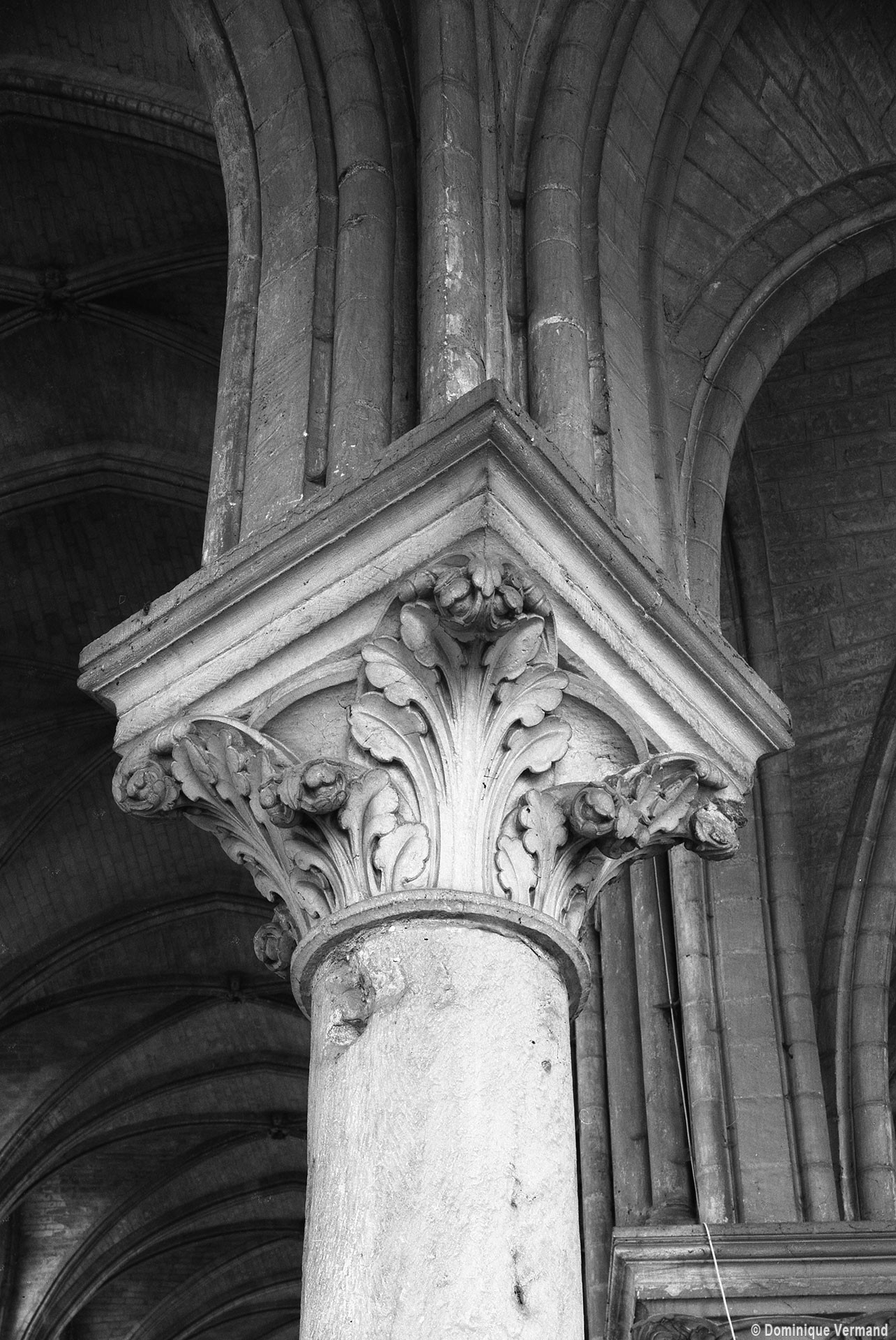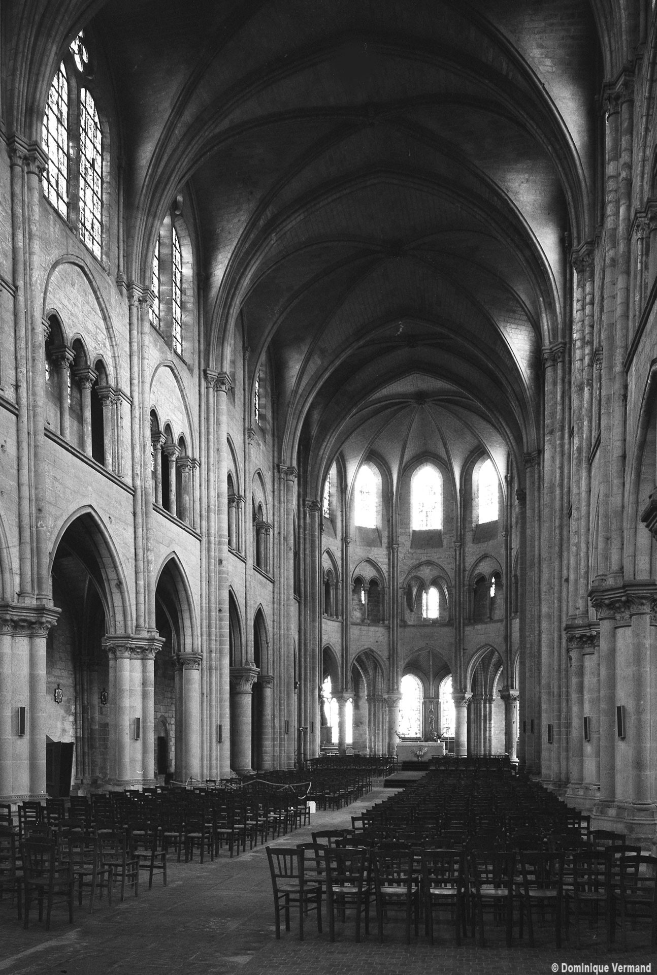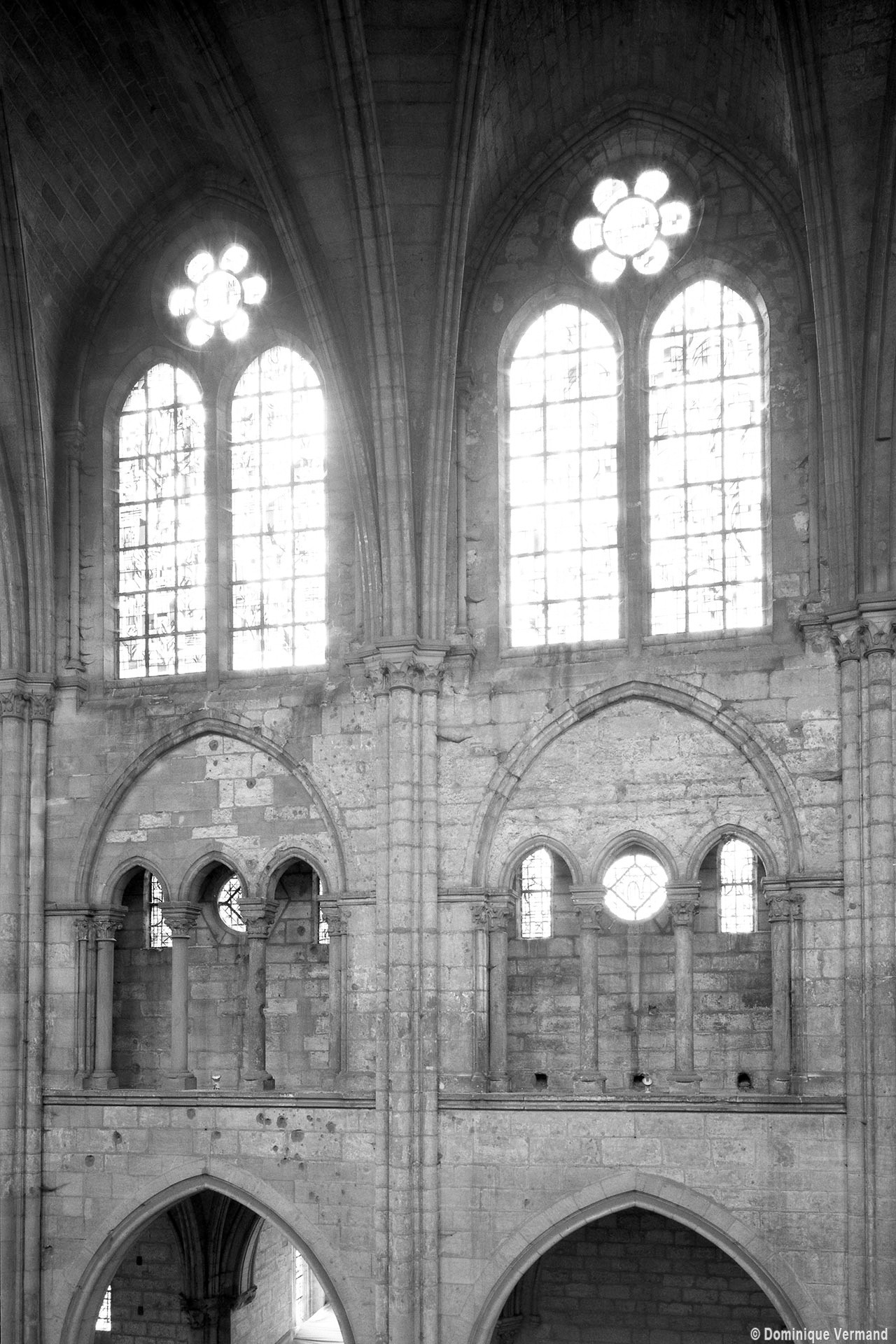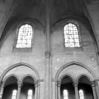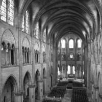 C’est à partir du début du 13e siècle que sera entreprise la jonction entre les deux extrémités de l’édifice avec l’édification de la nef. Ses six travées sont couvertes de voûtes quadripartites et non plus sexpartites comme dans la travée droite du chœur. L’élévation reste à trois étages mais les grandes arcades retombent désormais sur des piliers cantonnés – quatre demi colonnes greffées sur un noyau circulaire -, un type rencontré dans nombre d’édifices majeurs de ce temps. De même, les fenêtres hautes composées de deux lancettes surmontées d’une rose à six lobes appartiennent-elles à un type initié à Soissons et à Chartres tandis que le triforium passage de l’étage intermédiaire est la formule qui prévaut partout. Les petites fenêtres qui ajourent celui de Saint-Leu en font cependant l’un des premiers de ce type avec celui de Mello. Le triforium ajouré connaîtra par la suite un vif succès dans l’architecture rayonnante.