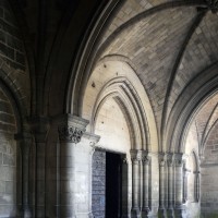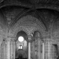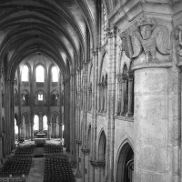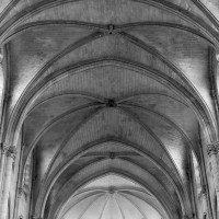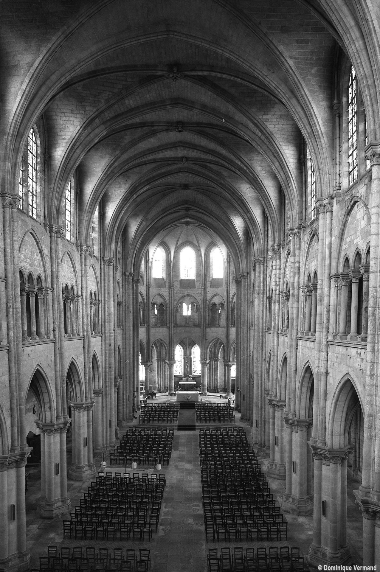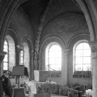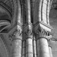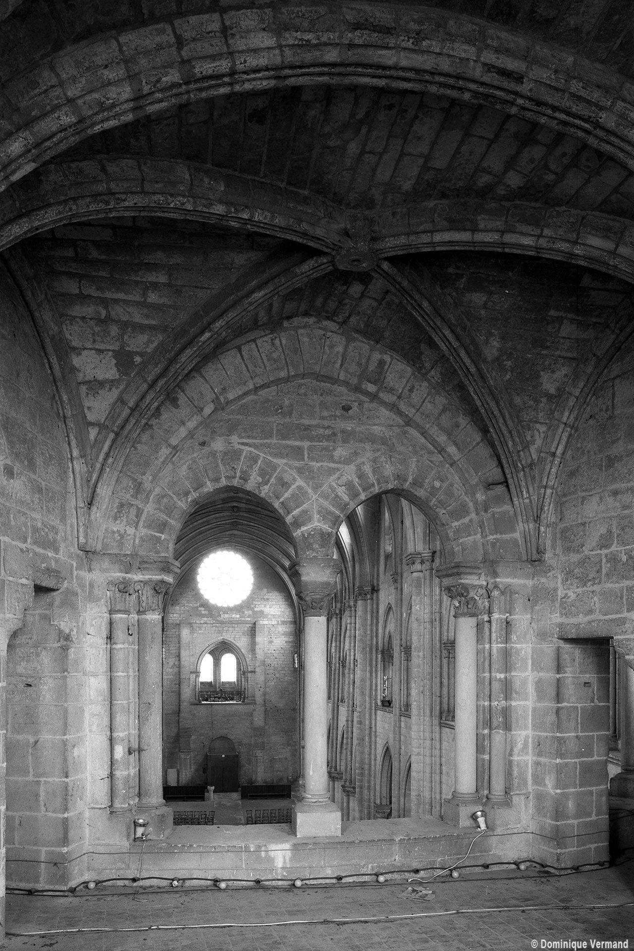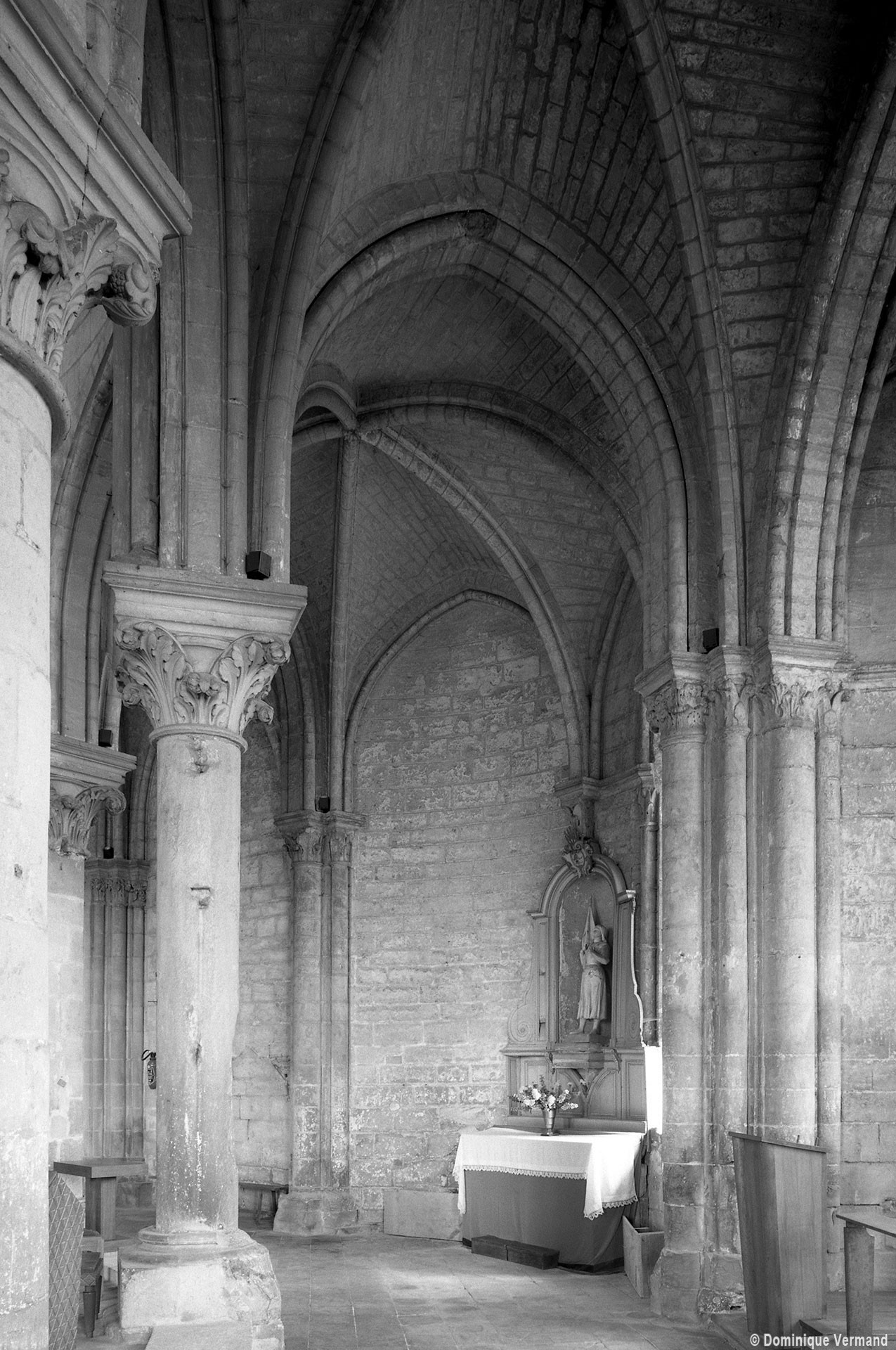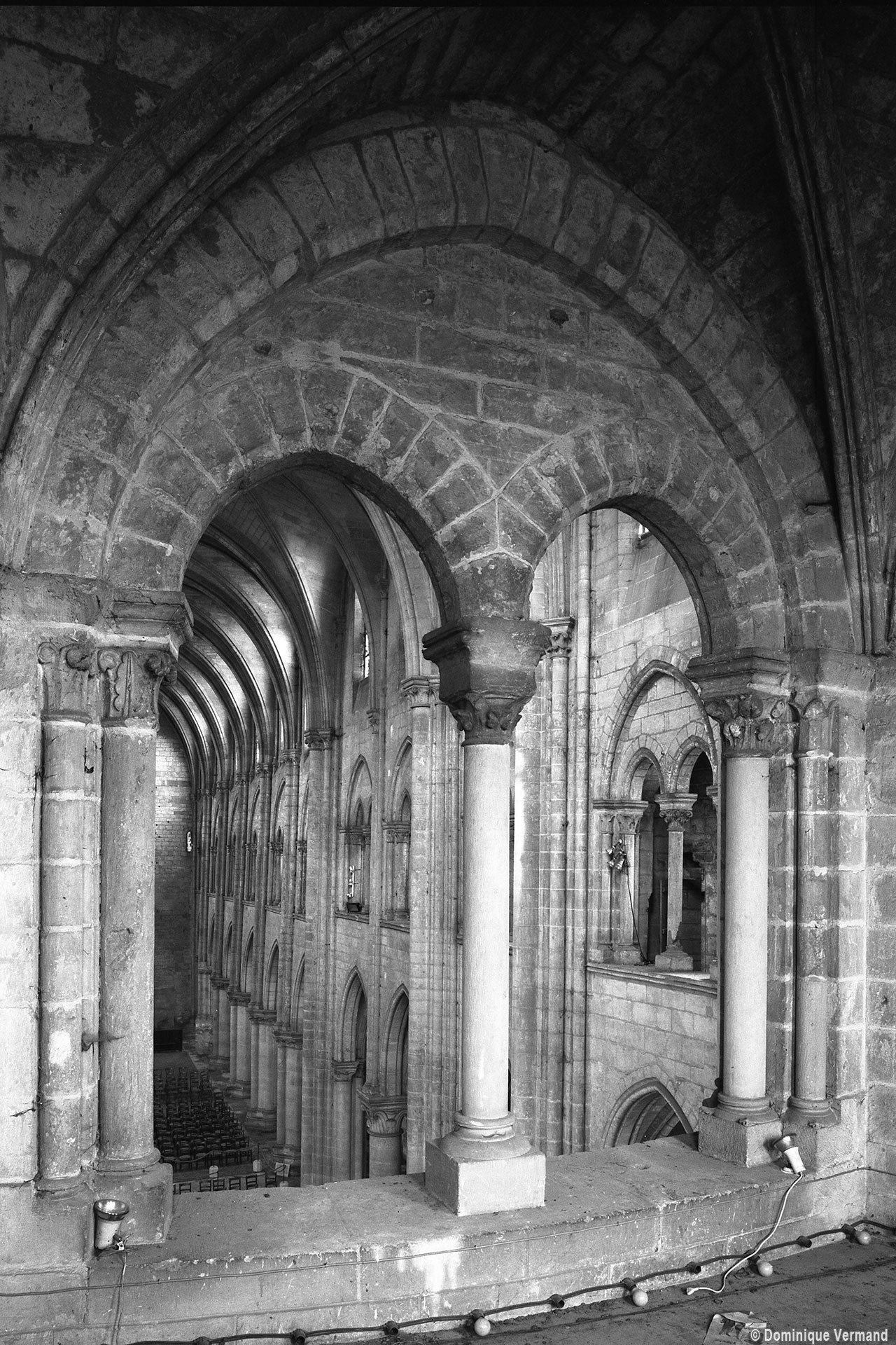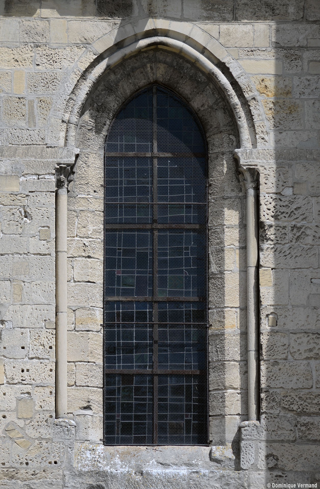 C’est à partir du début du 13e siècle que sera entreprise la jonction entre les deux extrémités de l’édifice avec l’édification de la nef. Ses six travées sont couvertes de voûtes quadripartites et non plus sexpartites comme dans la travée droite du chœur. L’élévation reste à trois étages mais les grandes arcades retombent désormais sur des piliers cantonnés – quatre demi colonnes greffées sur un noyau circulaire -, un type rencontré dans nombre d’édifices majeurs de ce temps. De même, les fenêtres hautes composées de deux lancettes surmontées d’une rose à six lobes appartiennent-elles à un type initié à Soissons et à Chartres tandis que le triforium passage de l’étage intermédiaire est la formule qui prévaut partout. Les petites fenêtres qui ajourent celui de Saint-Leu en font cependant l’un des premiers de ce type avec celui de Mello. Le triforium ajouré connaîtra par la suite un vif succès dans l’architecture rayonnante.