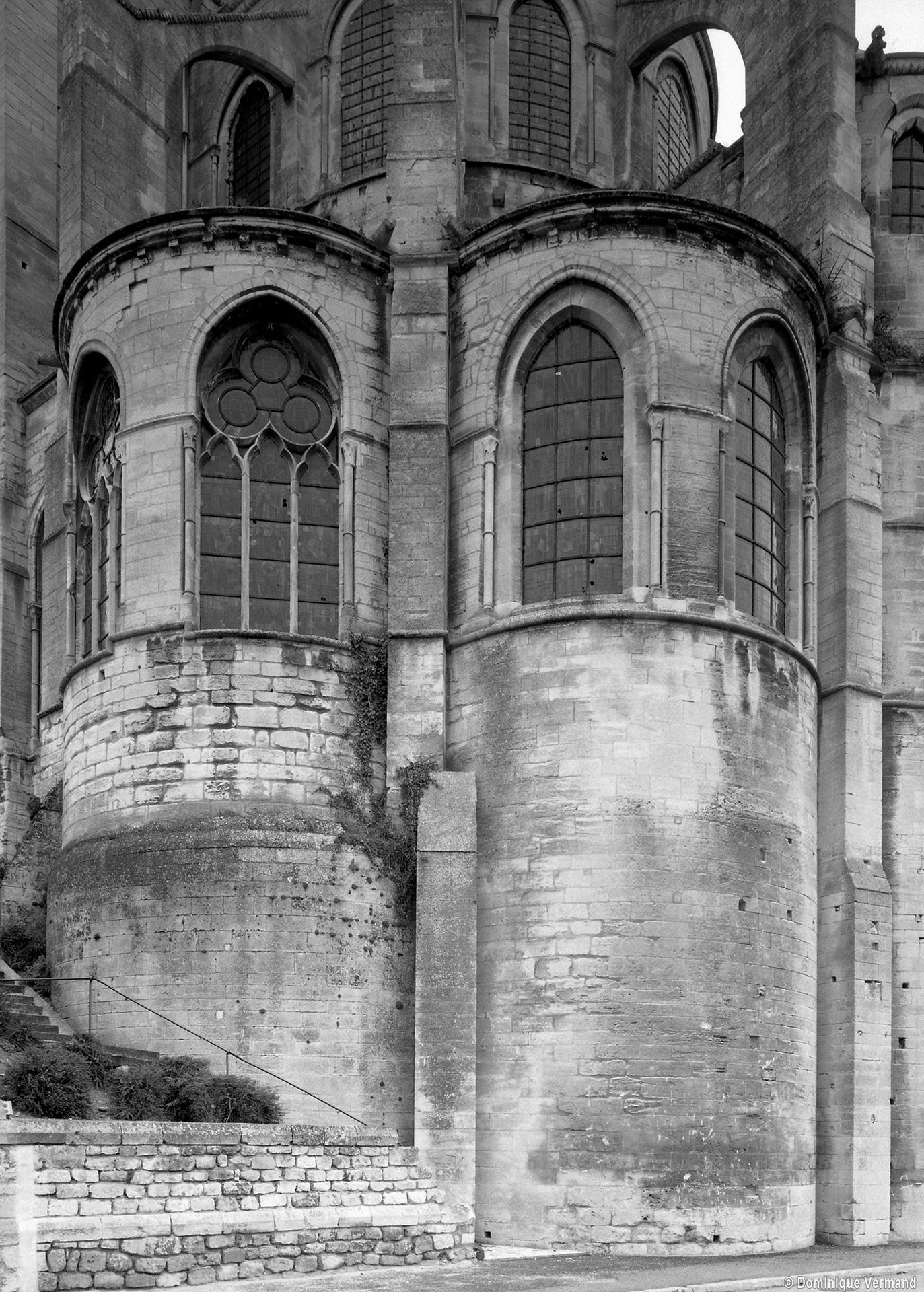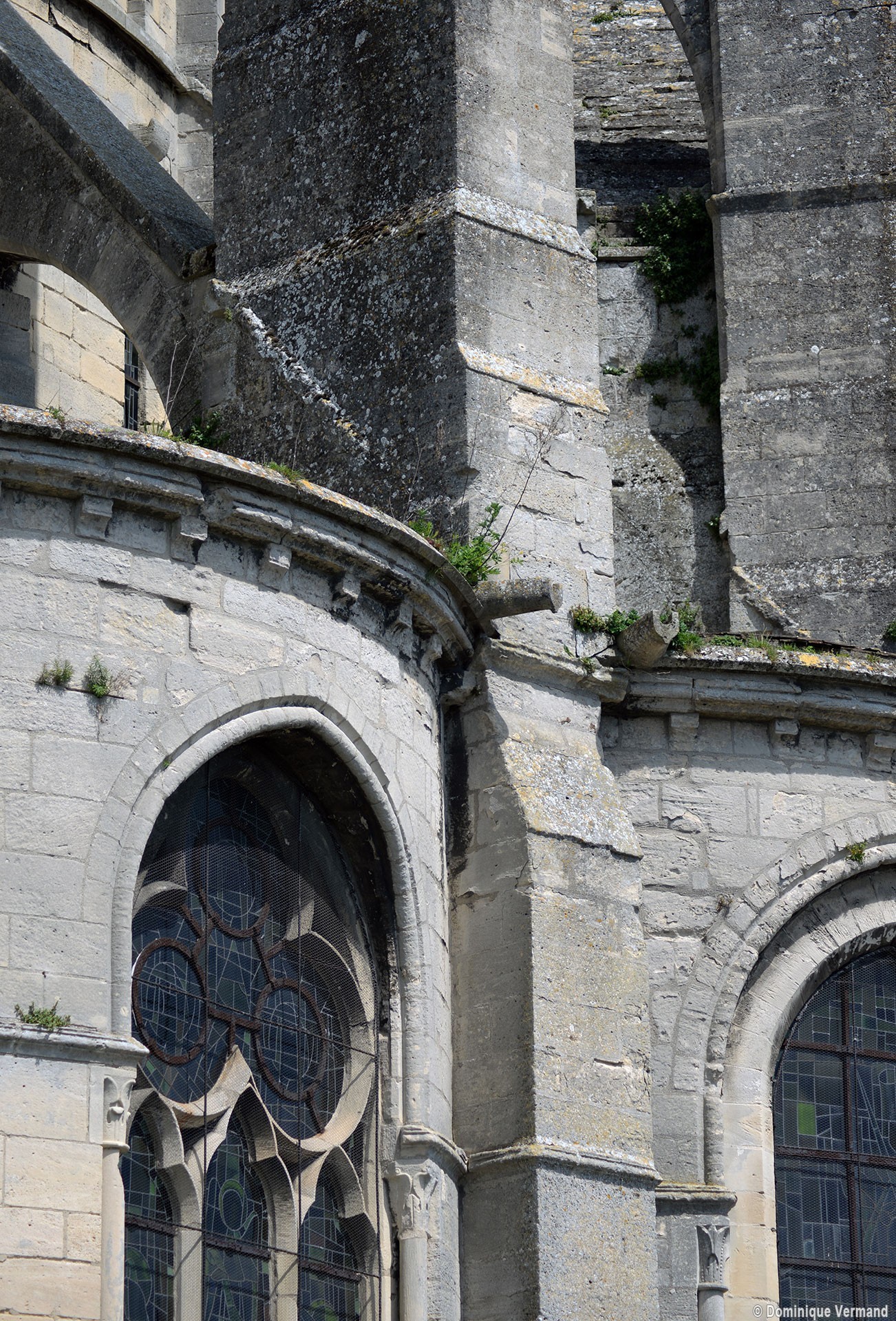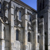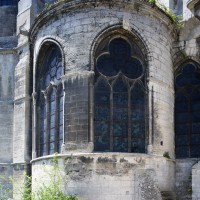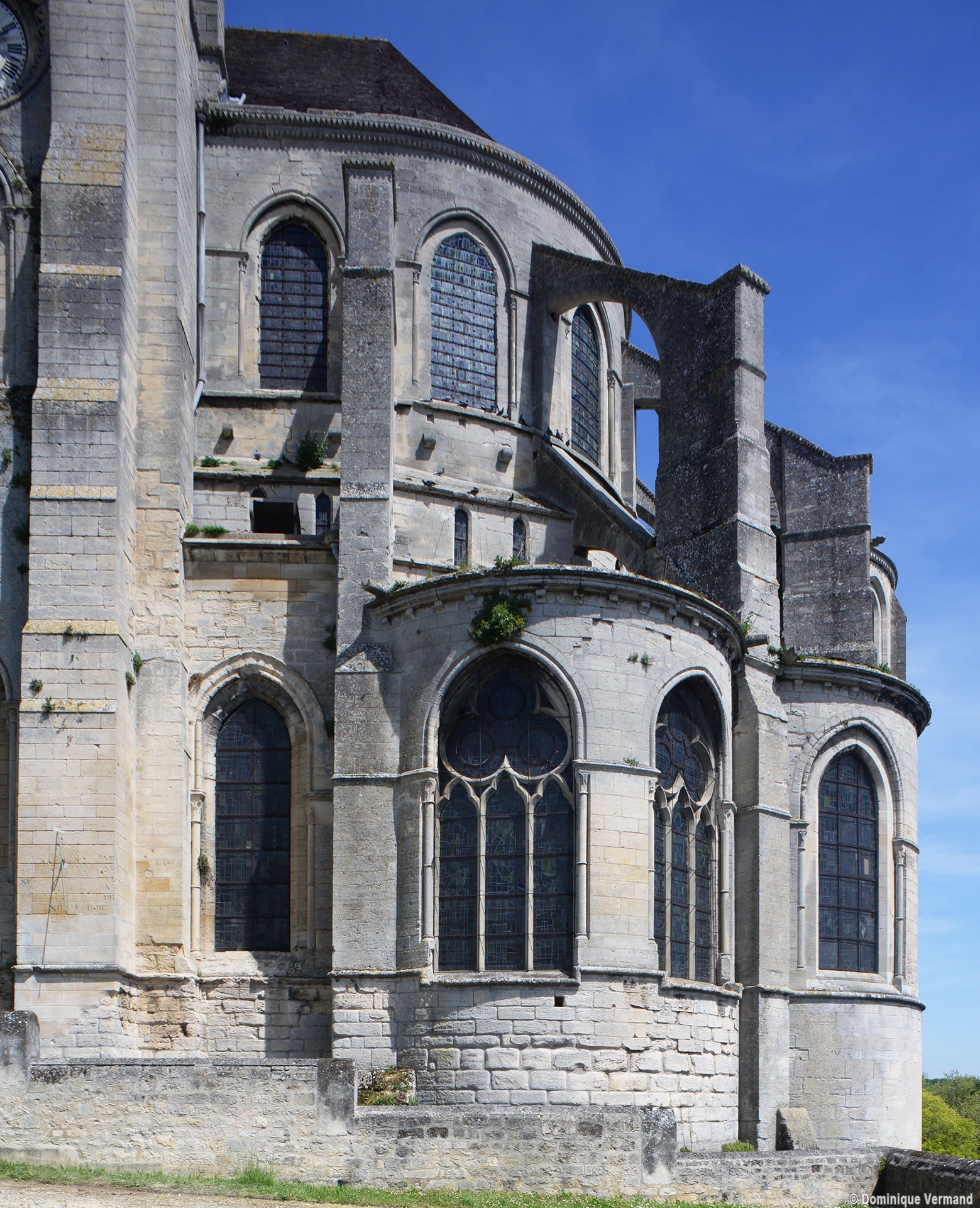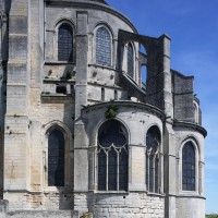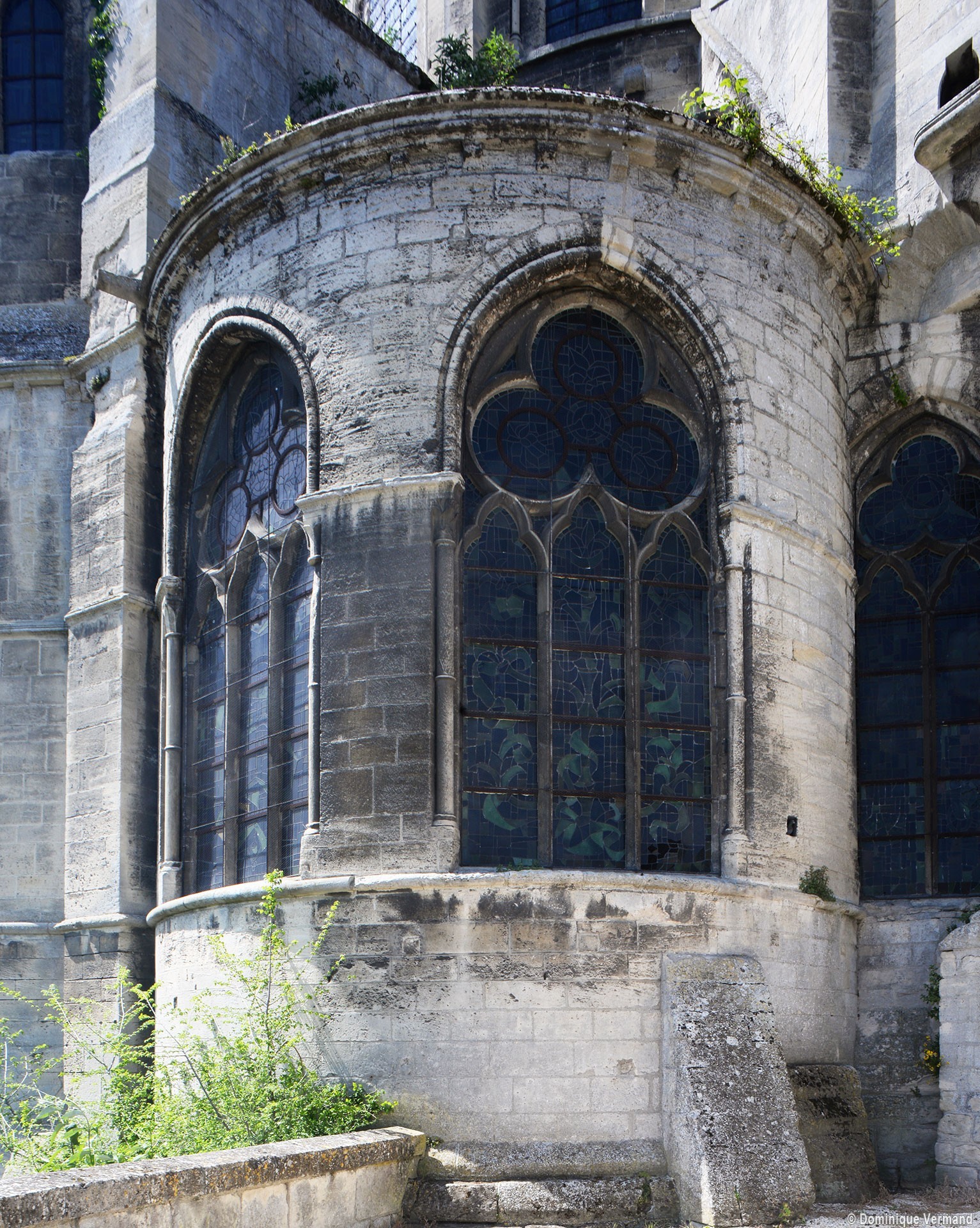 Construites en premier au-dessus d’un impressionnant soubassement que nécessitait la forte pente du terrain, les chapelles rayonnantes, d’un grand raffinement, s’inspirent directement de celles de Saint-Denis (1144) et de Senlis (vers 1155). Le thème de la feuille d’acanthe, omniprésent dans la sculpture des chapiteaux, fait également référence au répertoire décoratif de ces deux monuments précurseurs du gothique.
