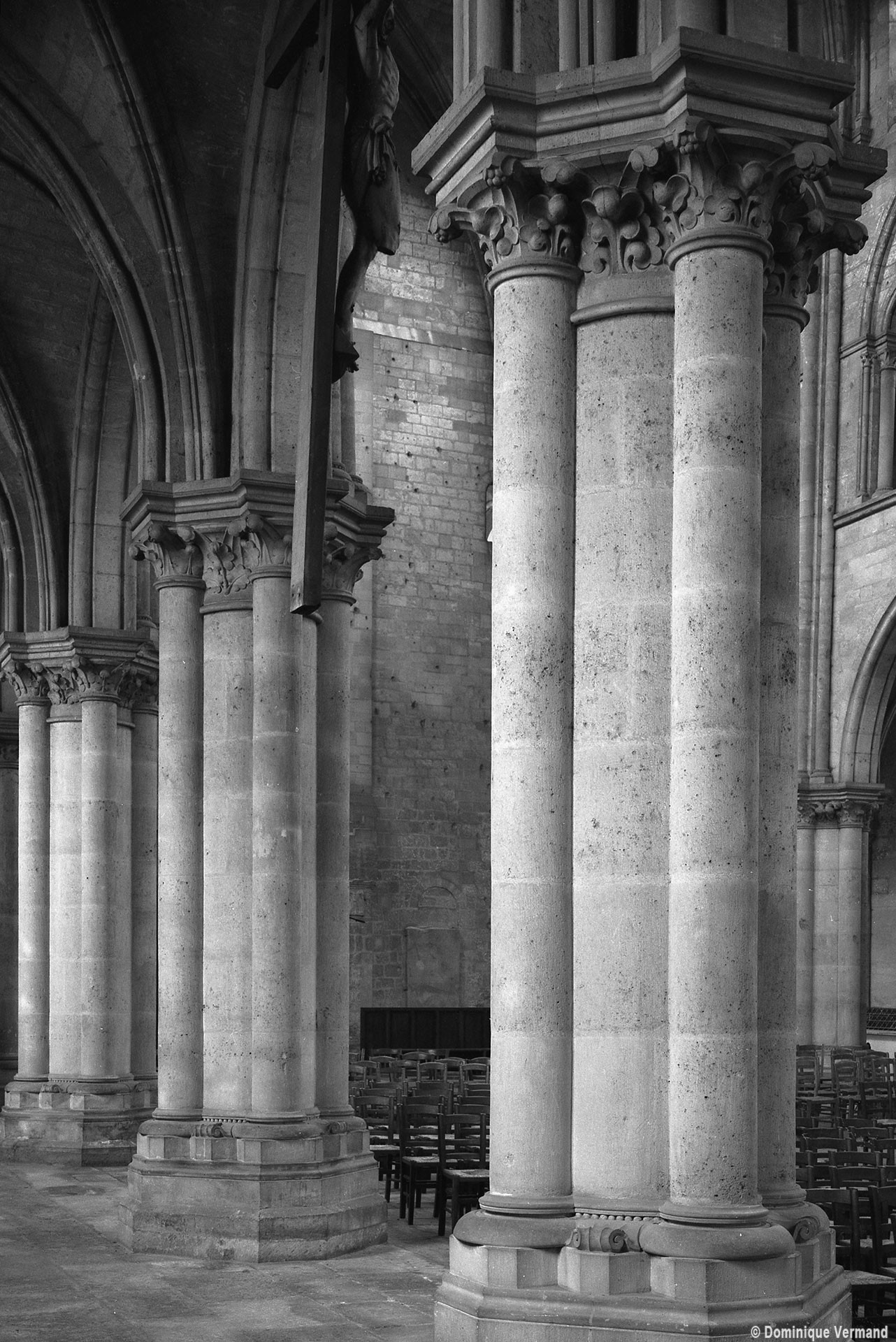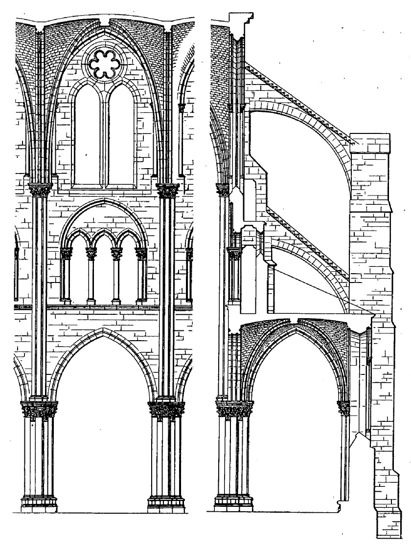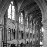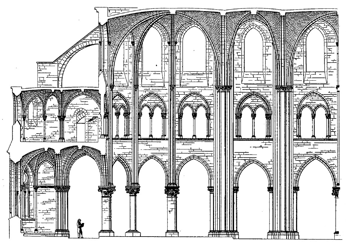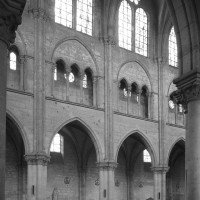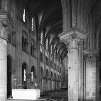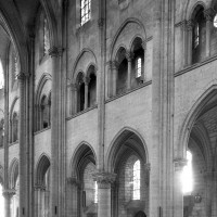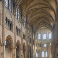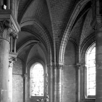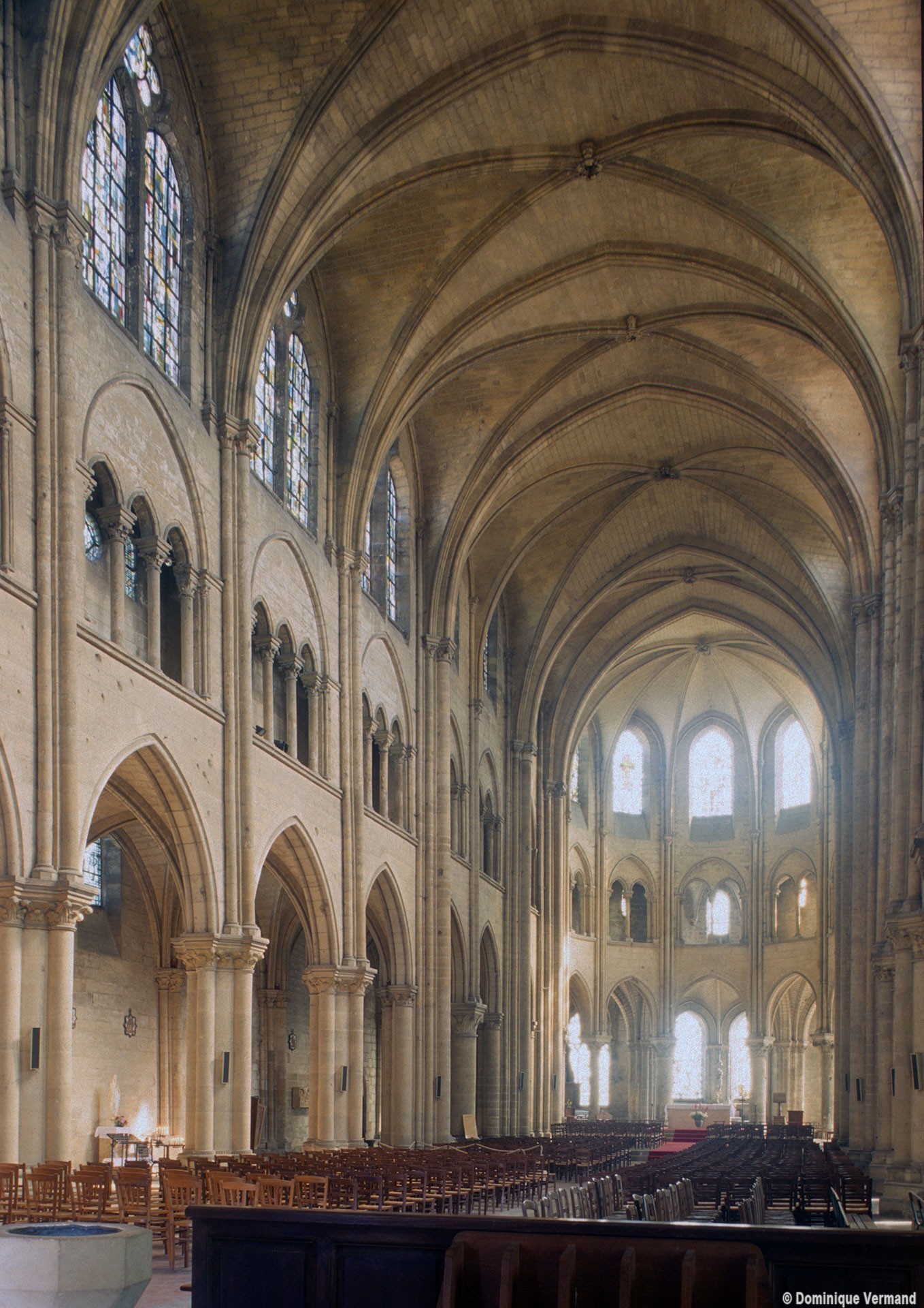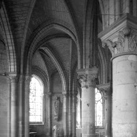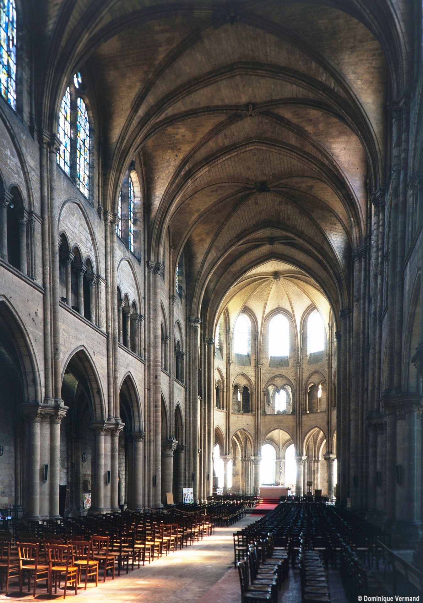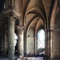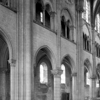 Après une interruption, les travaux reprennent avec la construction de l’hémicycle et des travées droites. Si l’alternance des piles (pile “forte” composée et pile “faible” cylindrique) de la travée droite et l’élévation à trois étages – grandes arcades, tribunes (ici non voûtées) et fenêtres hautes – font directement référence à Senlis, il n’en est pas de même du dessin des arcades des tribunes, du traitement de la retombée des voûtes ou du décor plus naturaliste des chapiteaux, qui sont directement repris du choeur de Saint-Germain-des-Prés et de la cathédrale Notre-Dame de Paris, cette dernière alors en cours de construction. D’une manière qu’on pourrait croire symbolique, le rond-point du chœur associe d’ailleurs la pile cylindrique telle qu’on la trouve dans ces deux édifices et la mince colonne monolithique de Saint-Denis et Senlis.